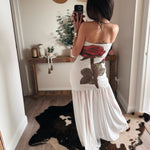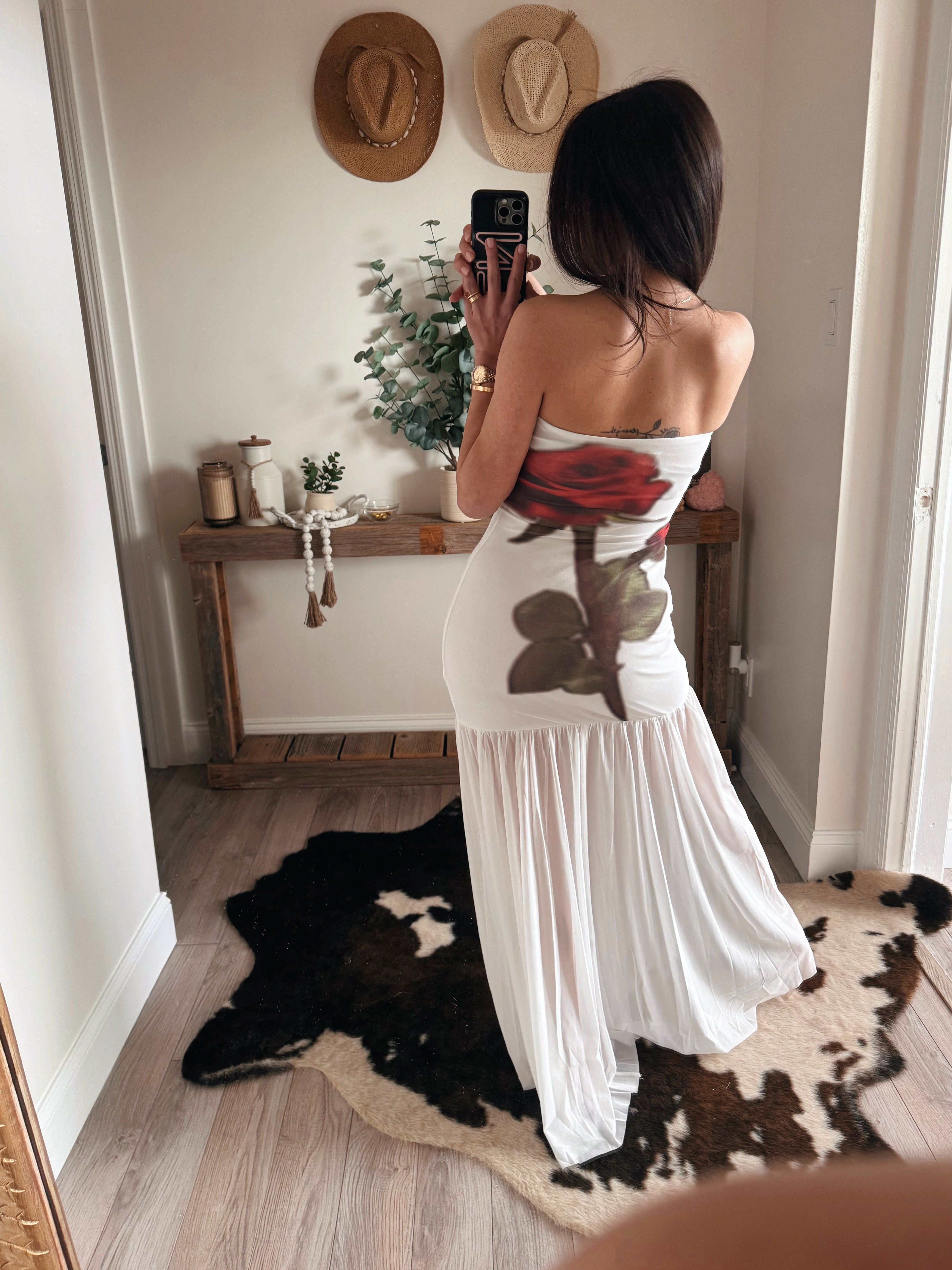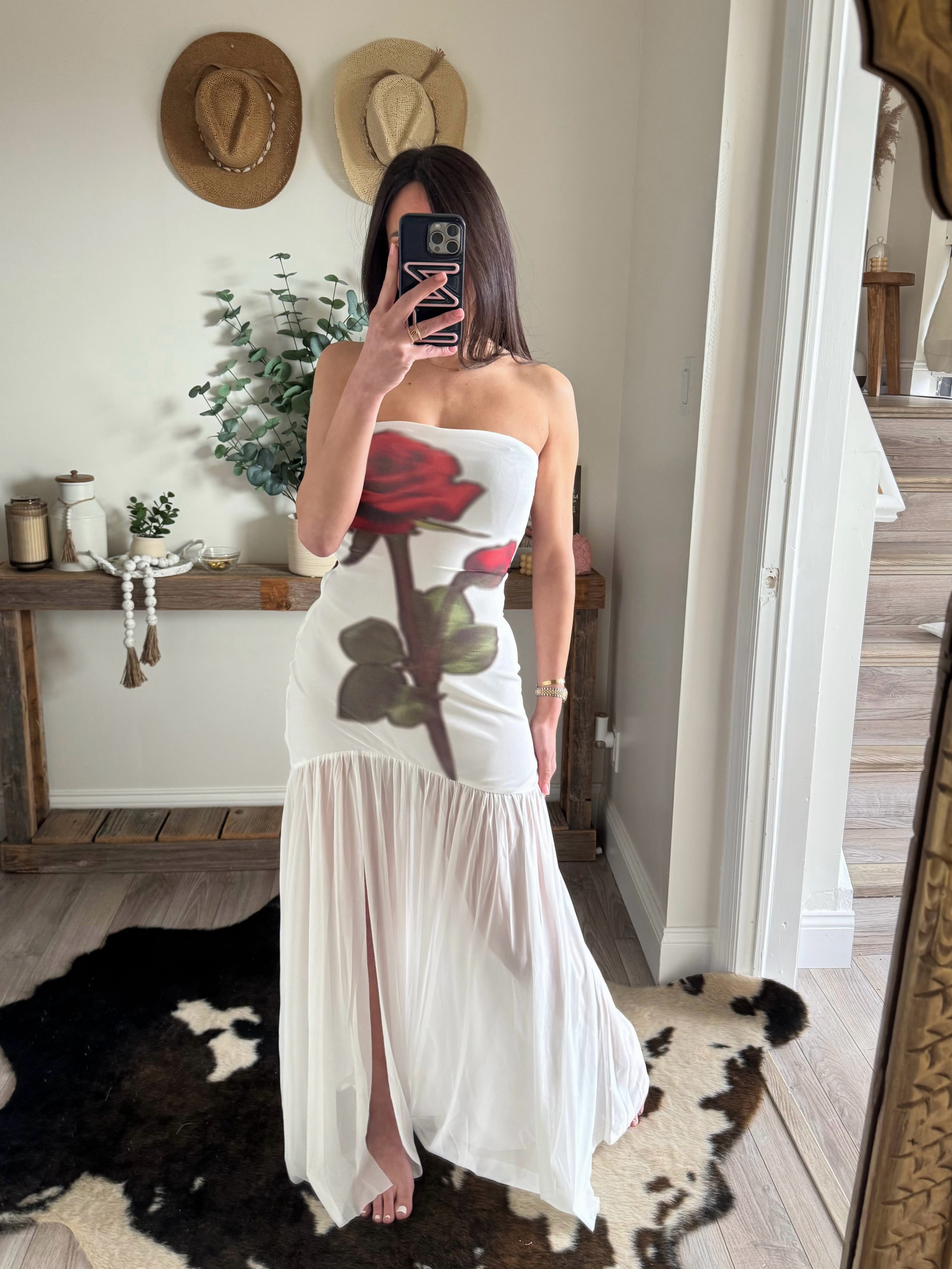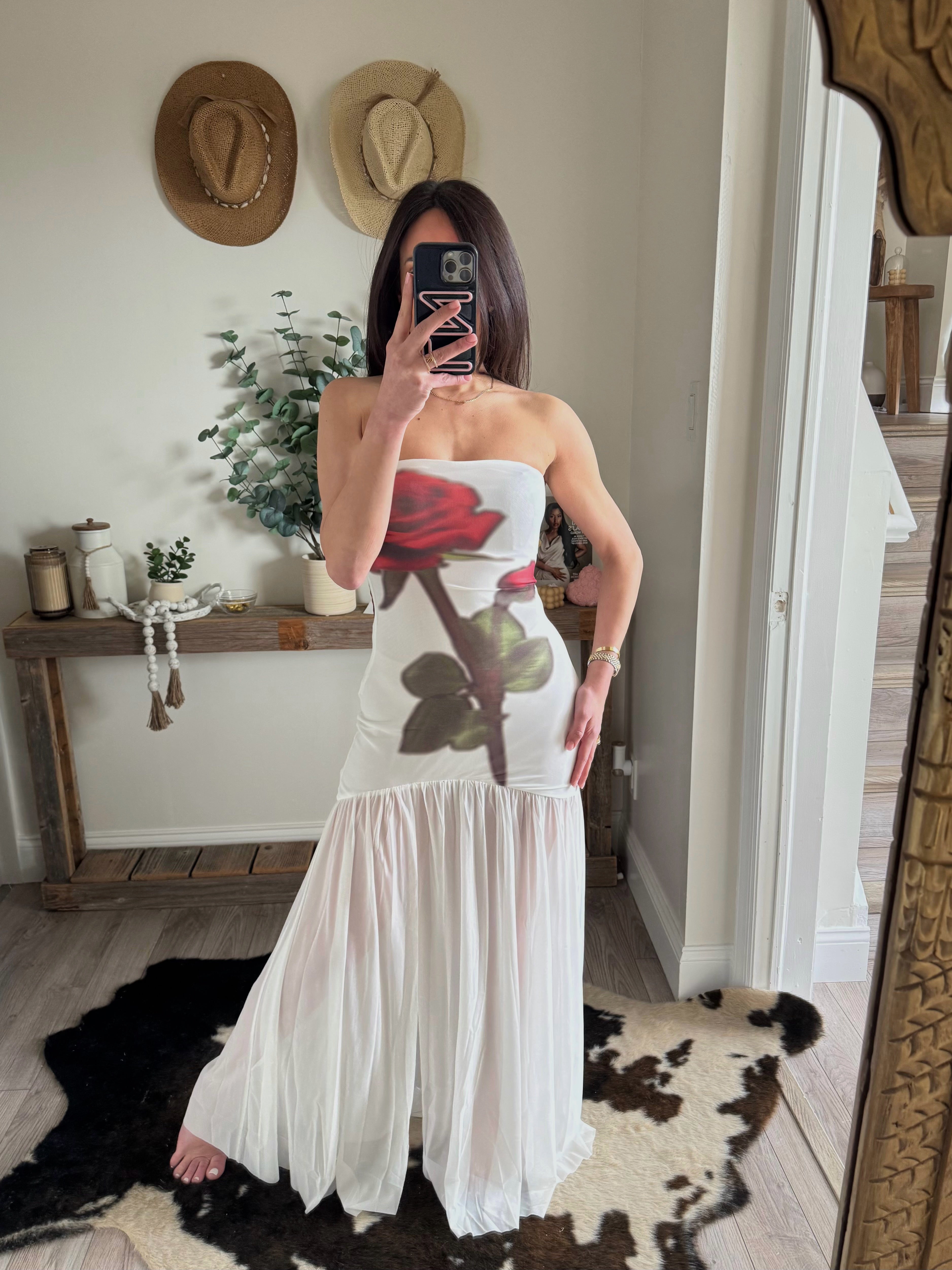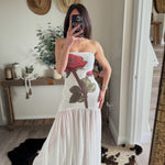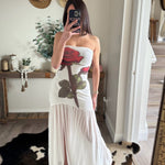 White Rose-Print Mesh Strapless Drop-Waist Maxi Dress
