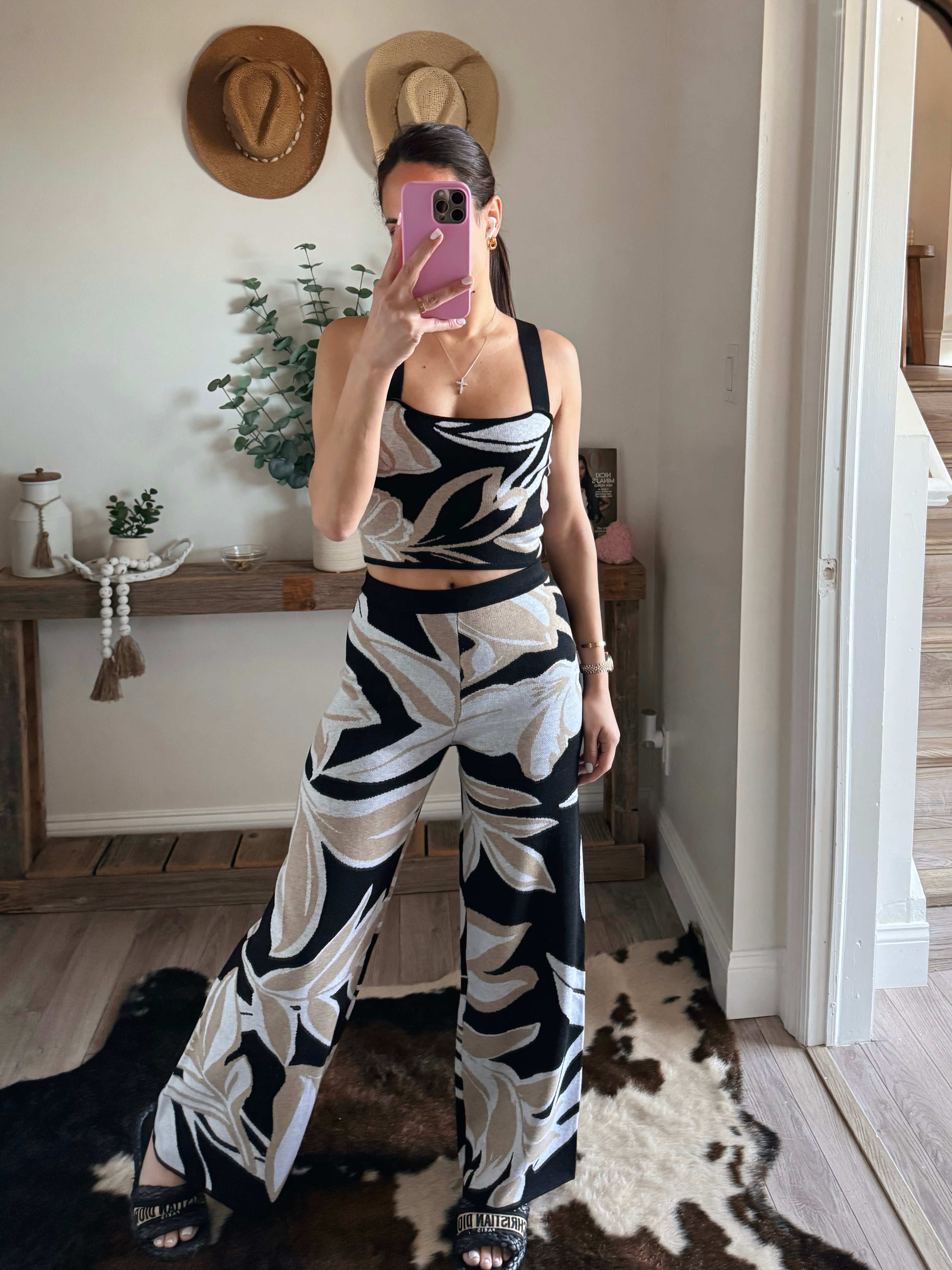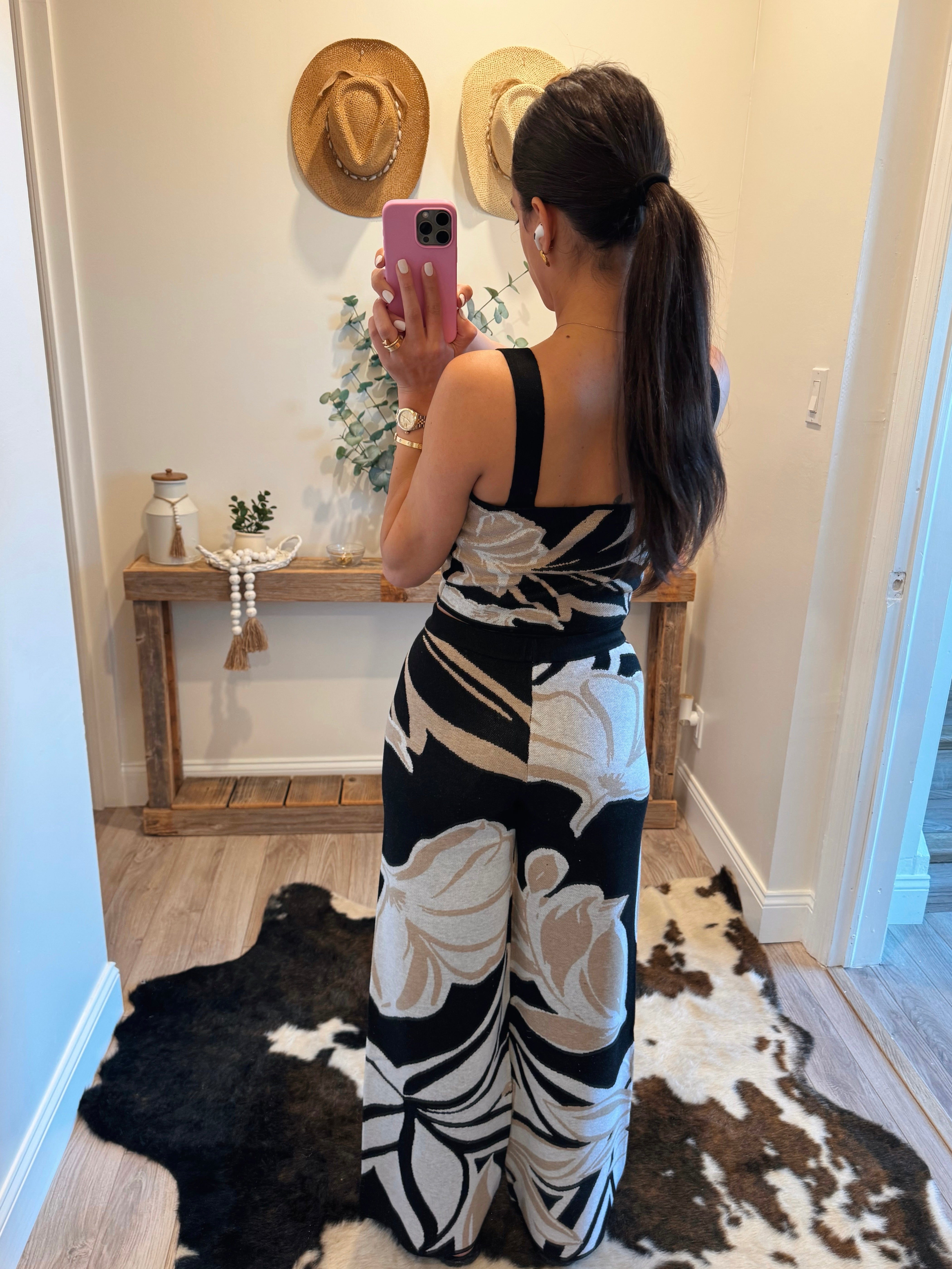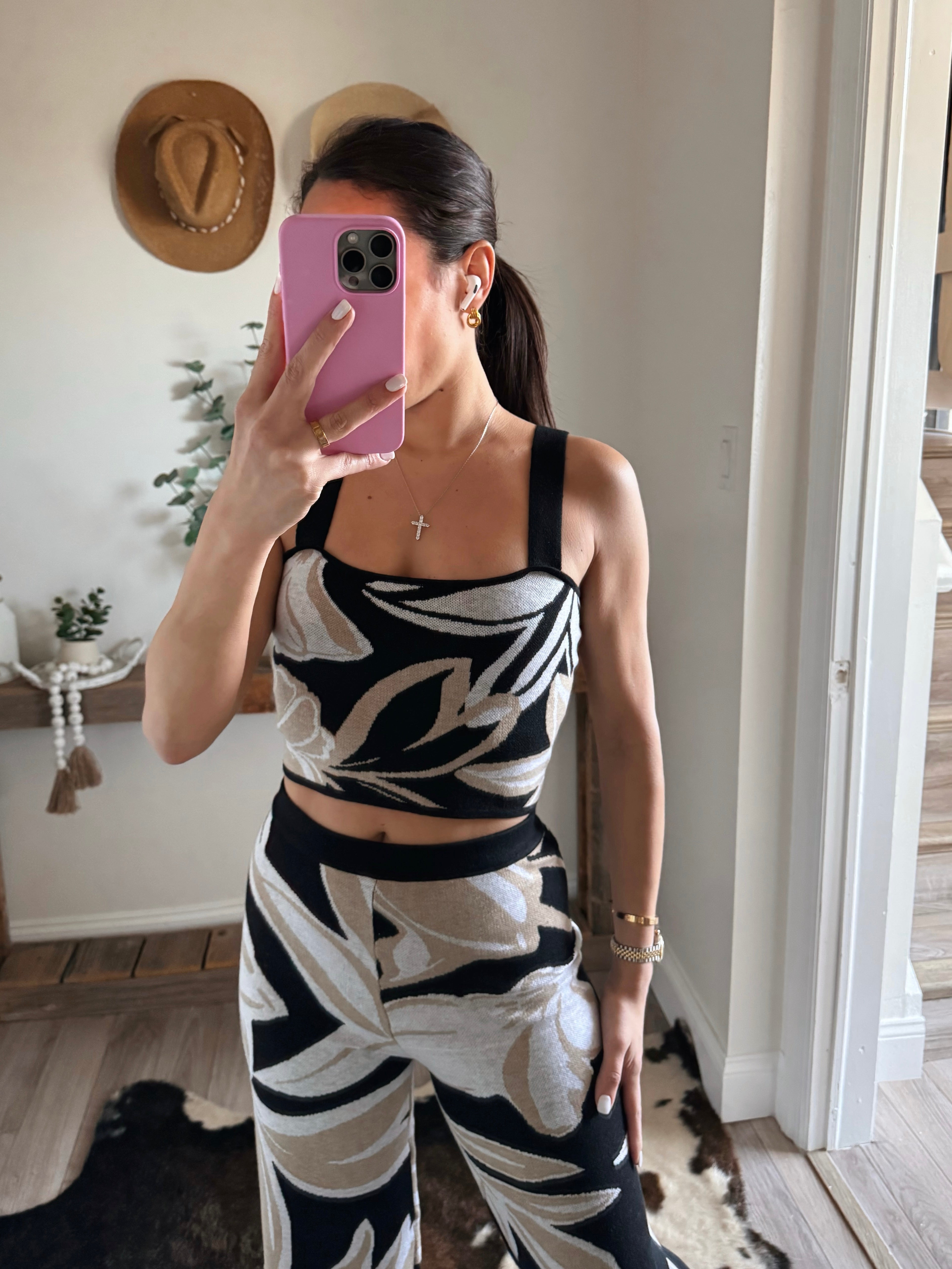 Product Features: Tropical floral knit pattern. Scoop neckline. Sleeveless with wide knit shoulder straps. Low back. Cropped length. Fitted silhouette.