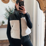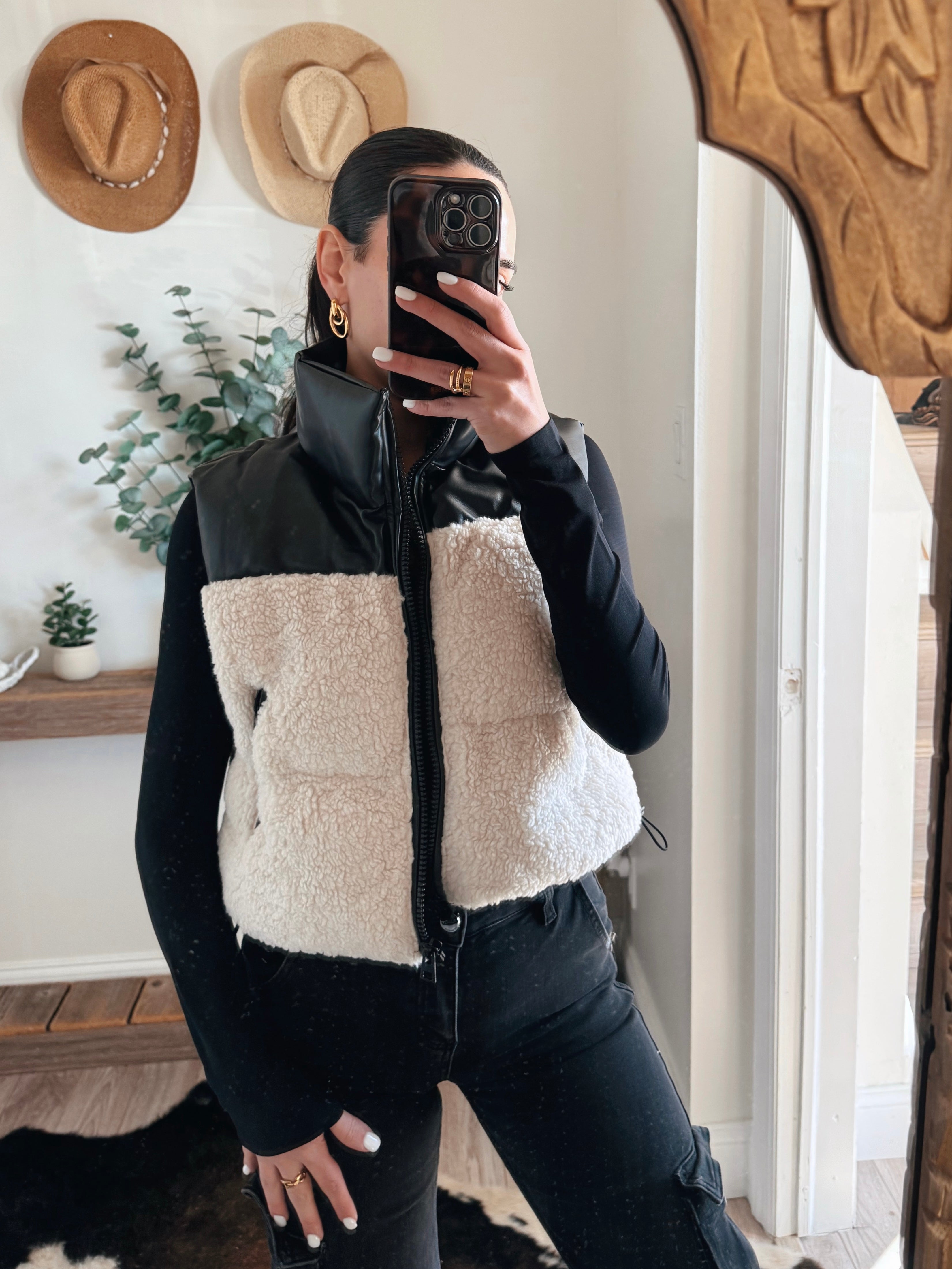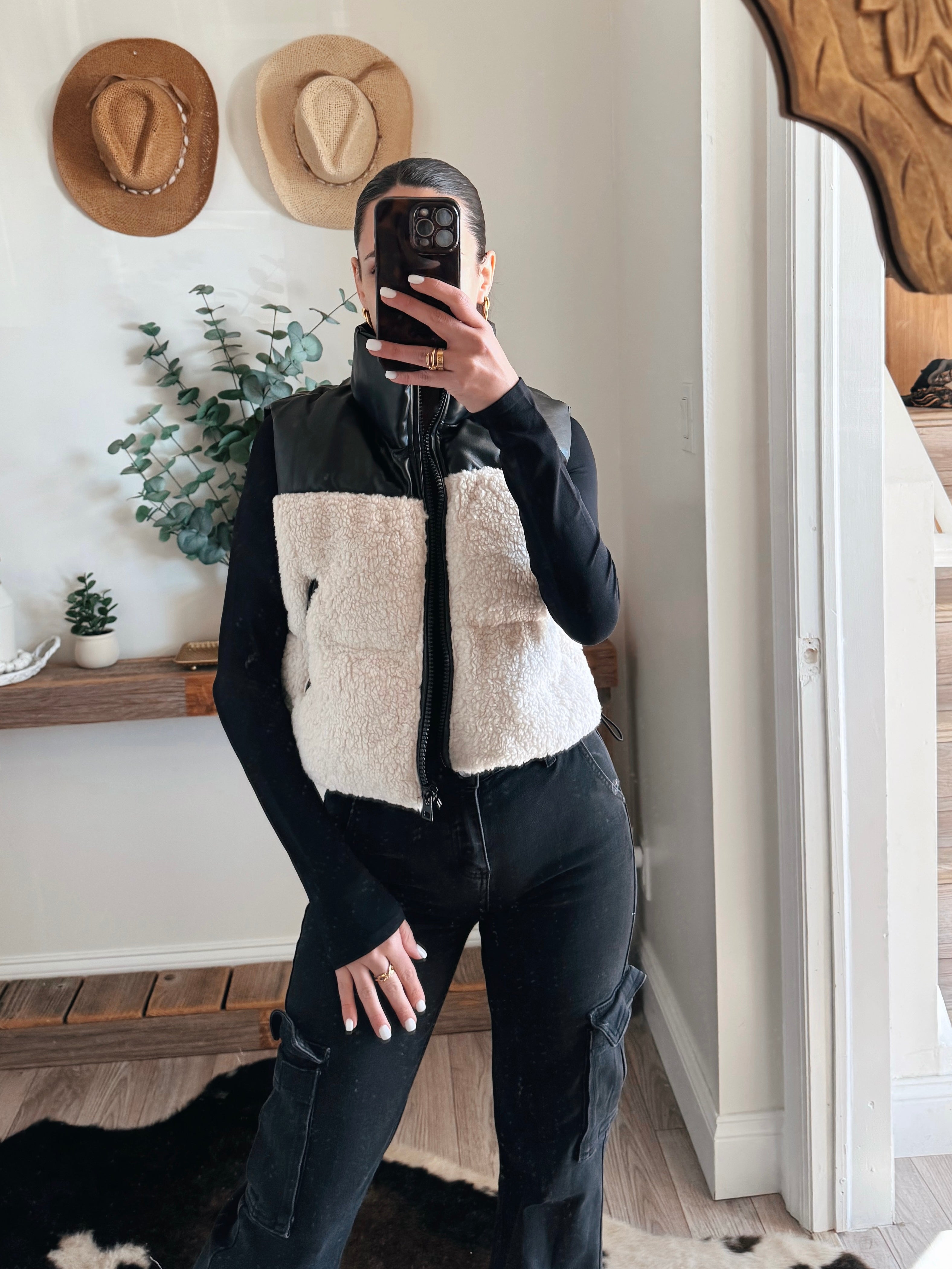 Product Features: This stylish puffer vest combines contrasting PU and sherpa materials in a timeless design that offers both warmth and sophistication. It features an oversized collar, a front zipper closure, and practical side slit pockets, making it a standout piece for colder days.