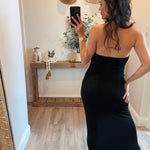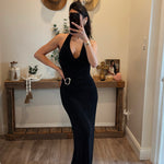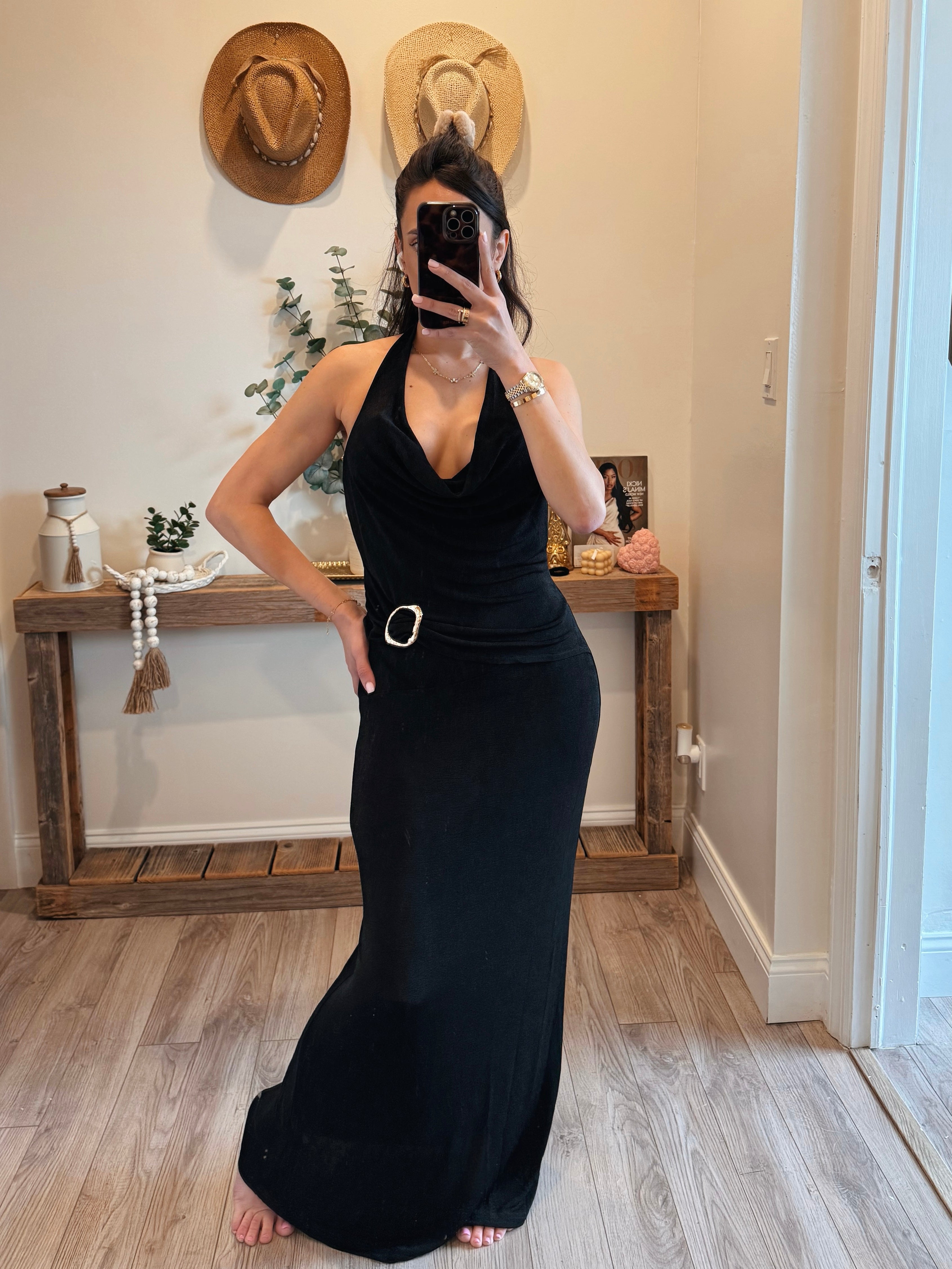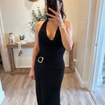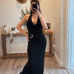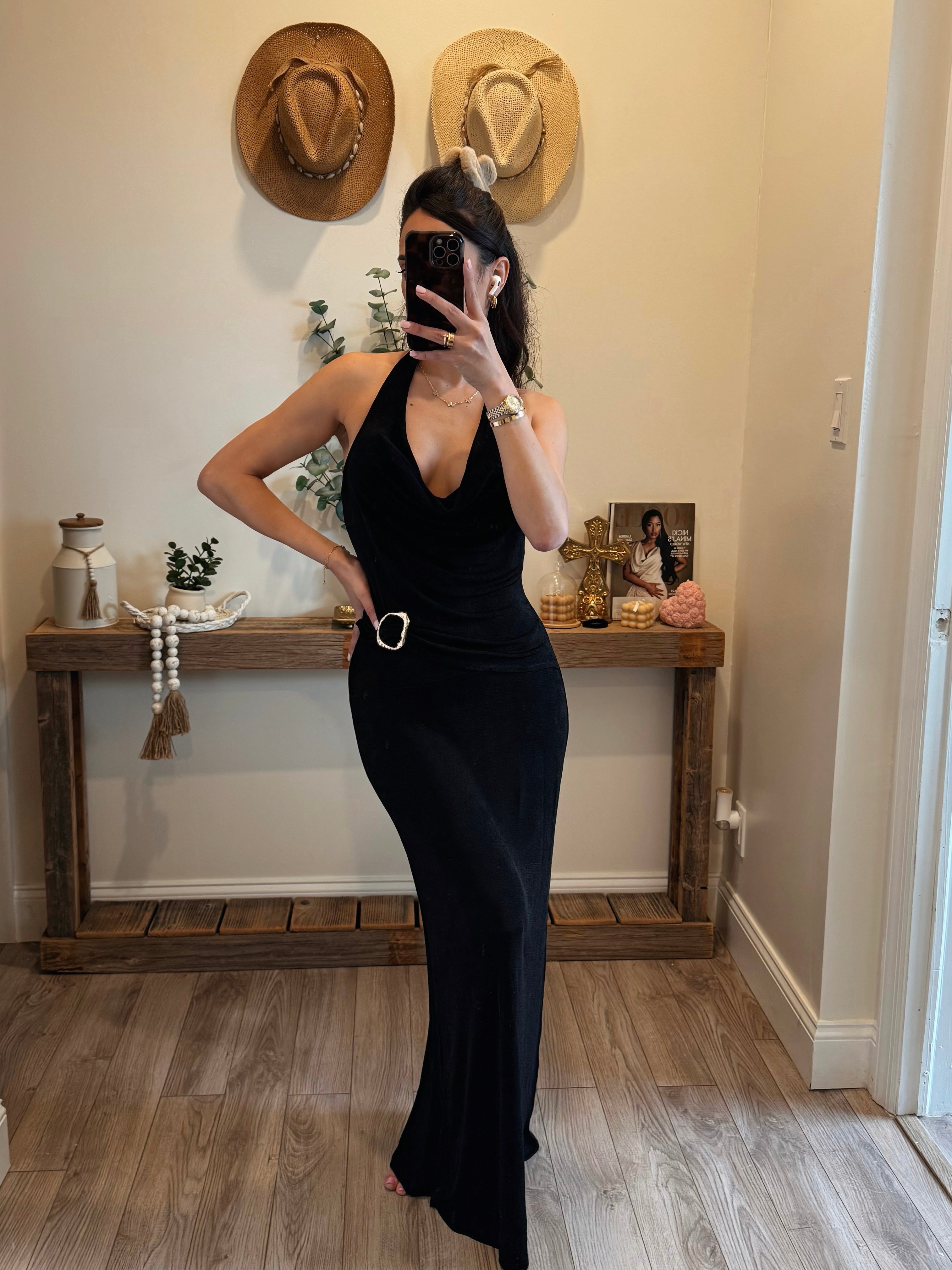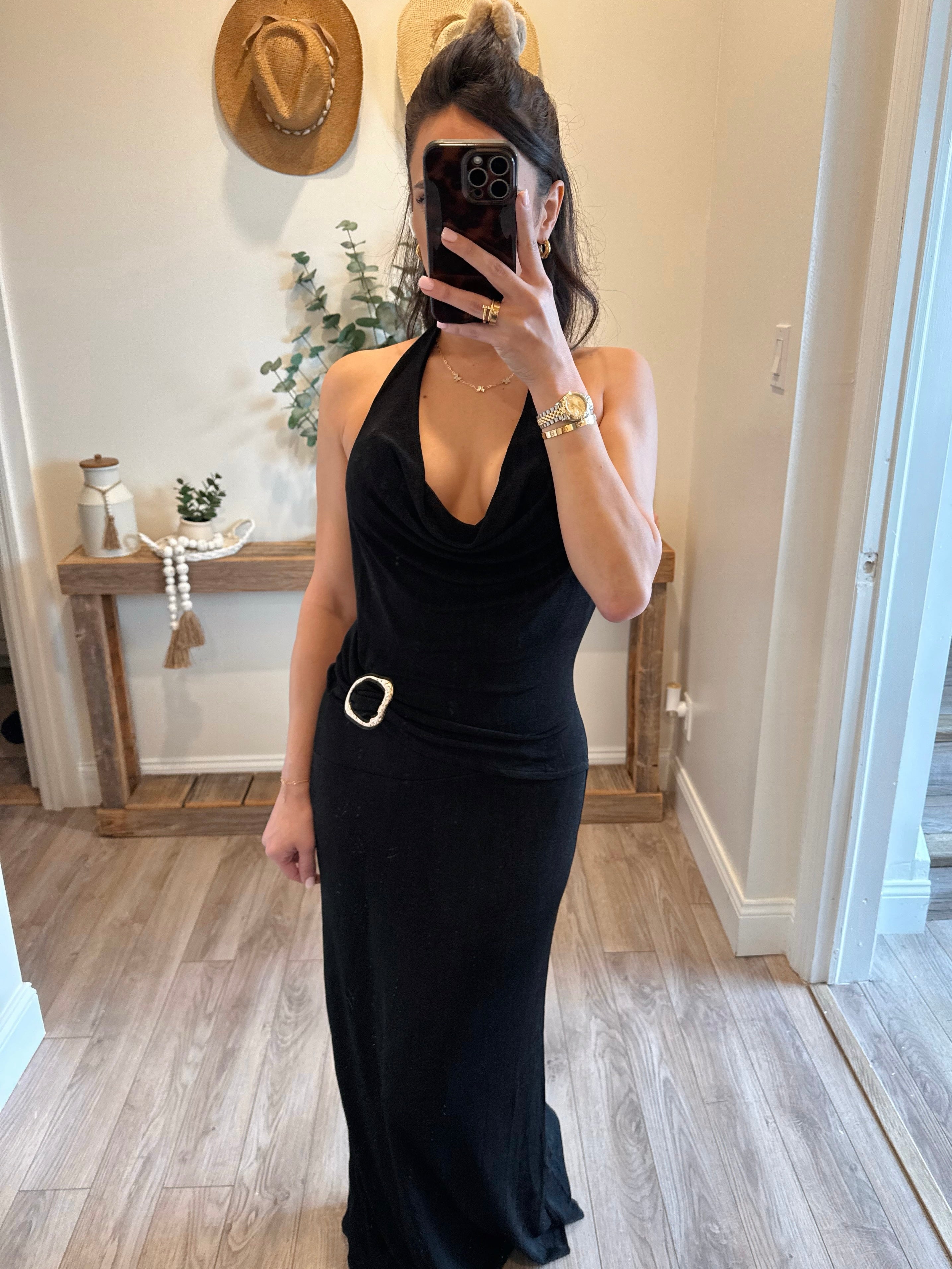 Product Features: - Maxi Dress - Cowl Neckline - Halter - Jewel Accent - Open Back Detail
