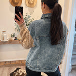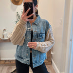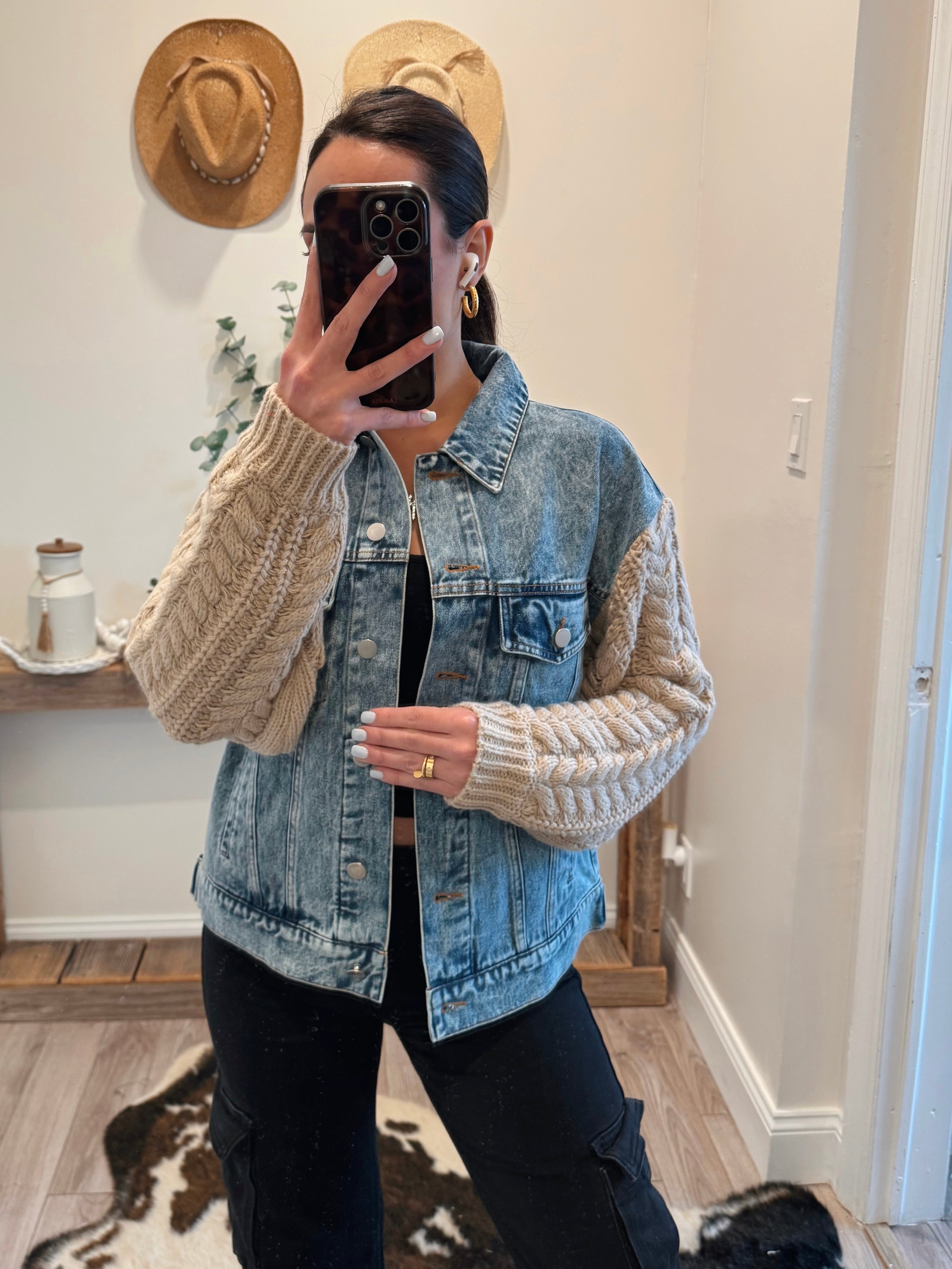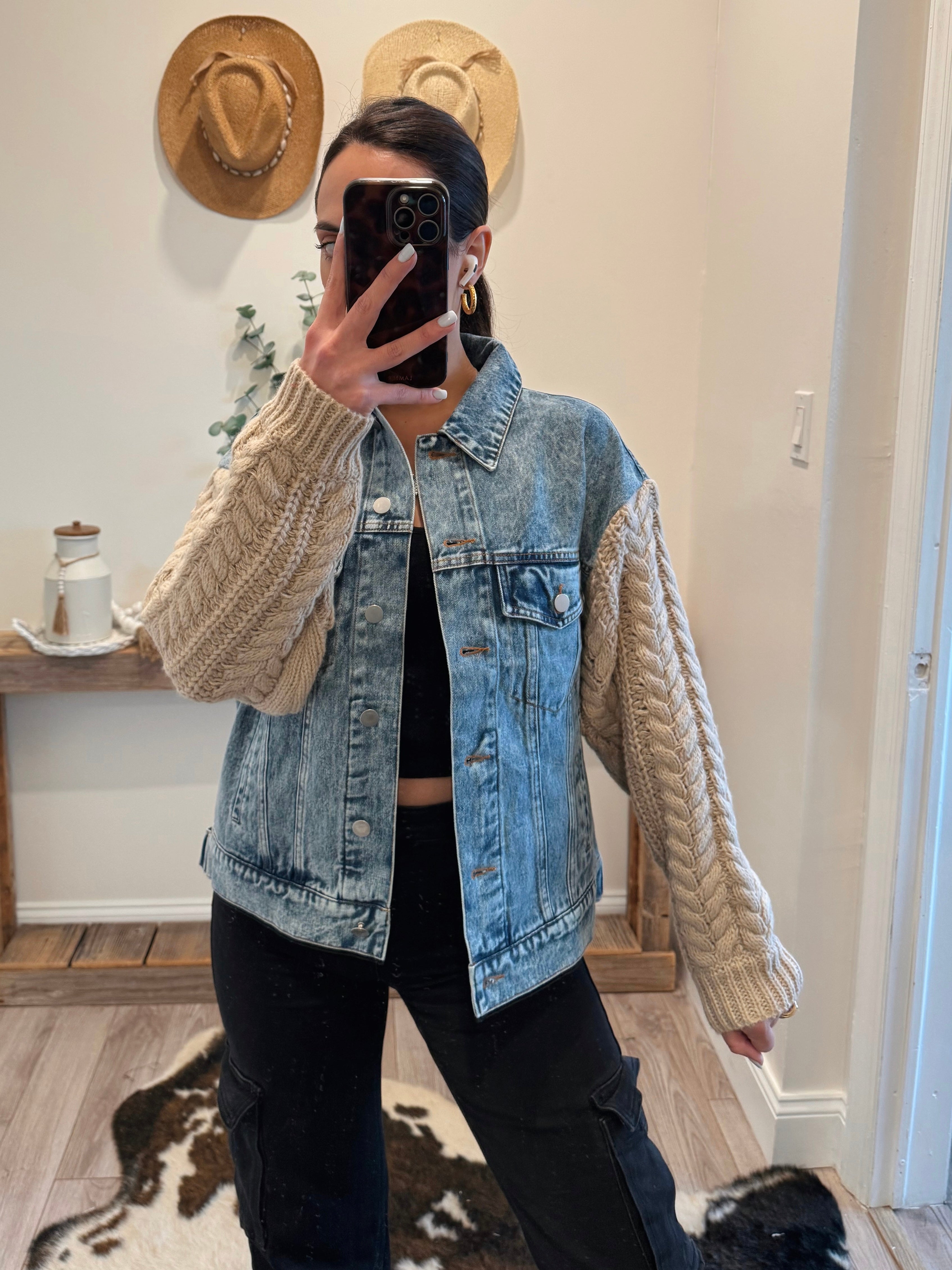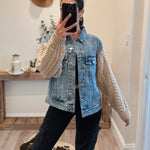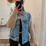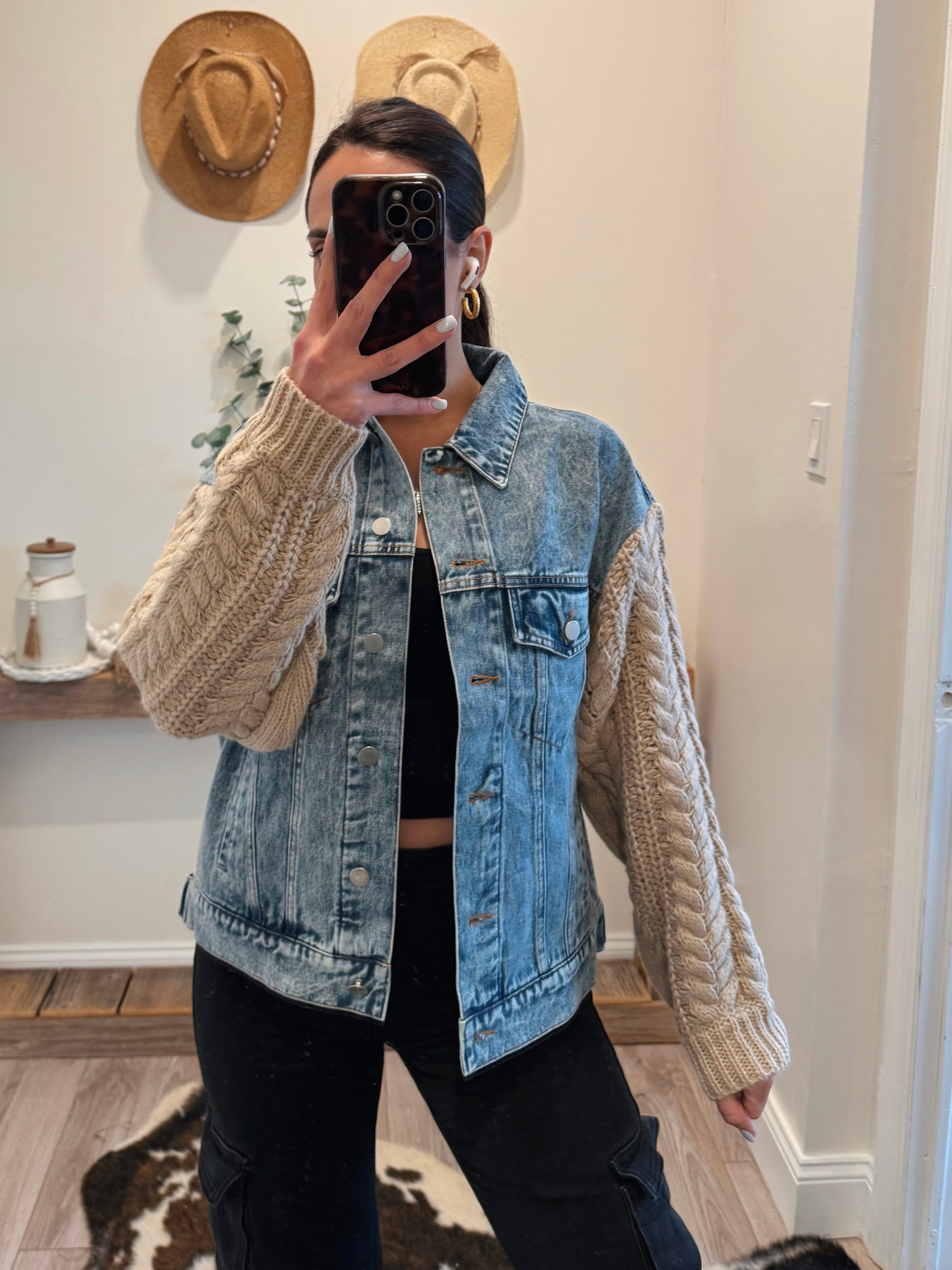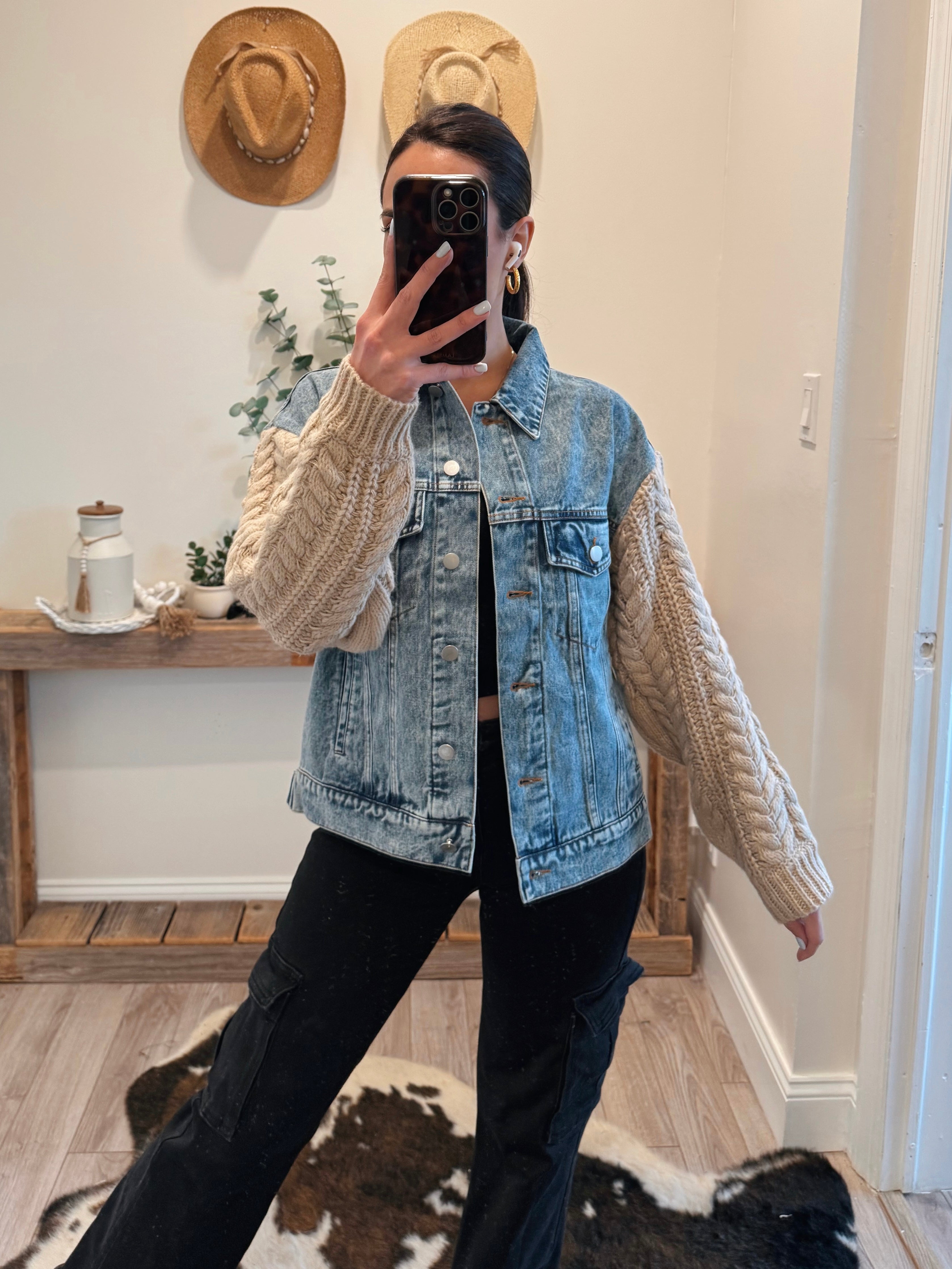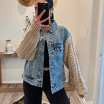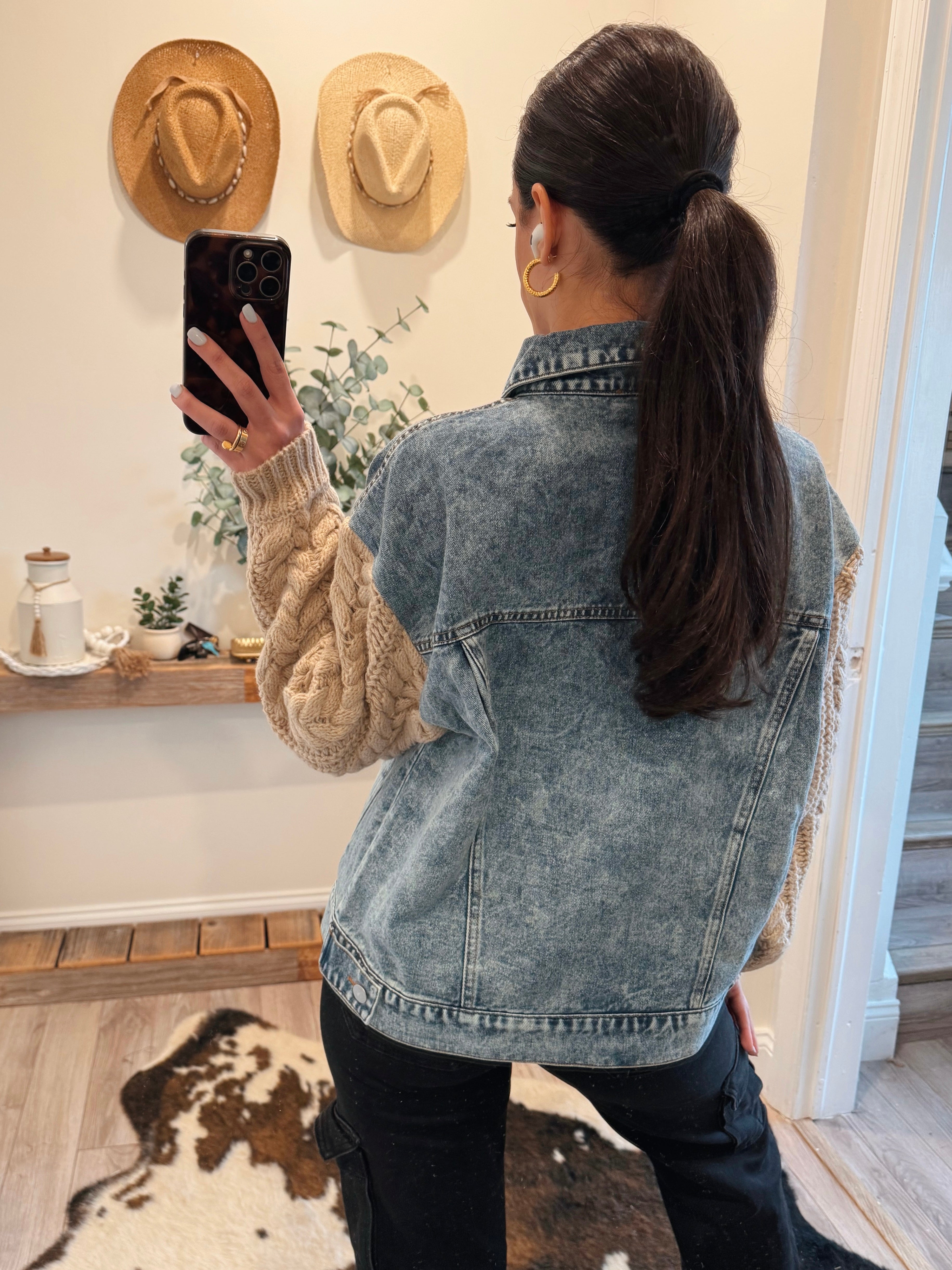 Product Features: This denim jacket features chunky cable knit sleeves in a neutral color, combining warmth with style. It has a collared neckline, chest and side pockets, and a button-front closure. Its oversized, boxy fit makes it perfect for layering over casual outfits.