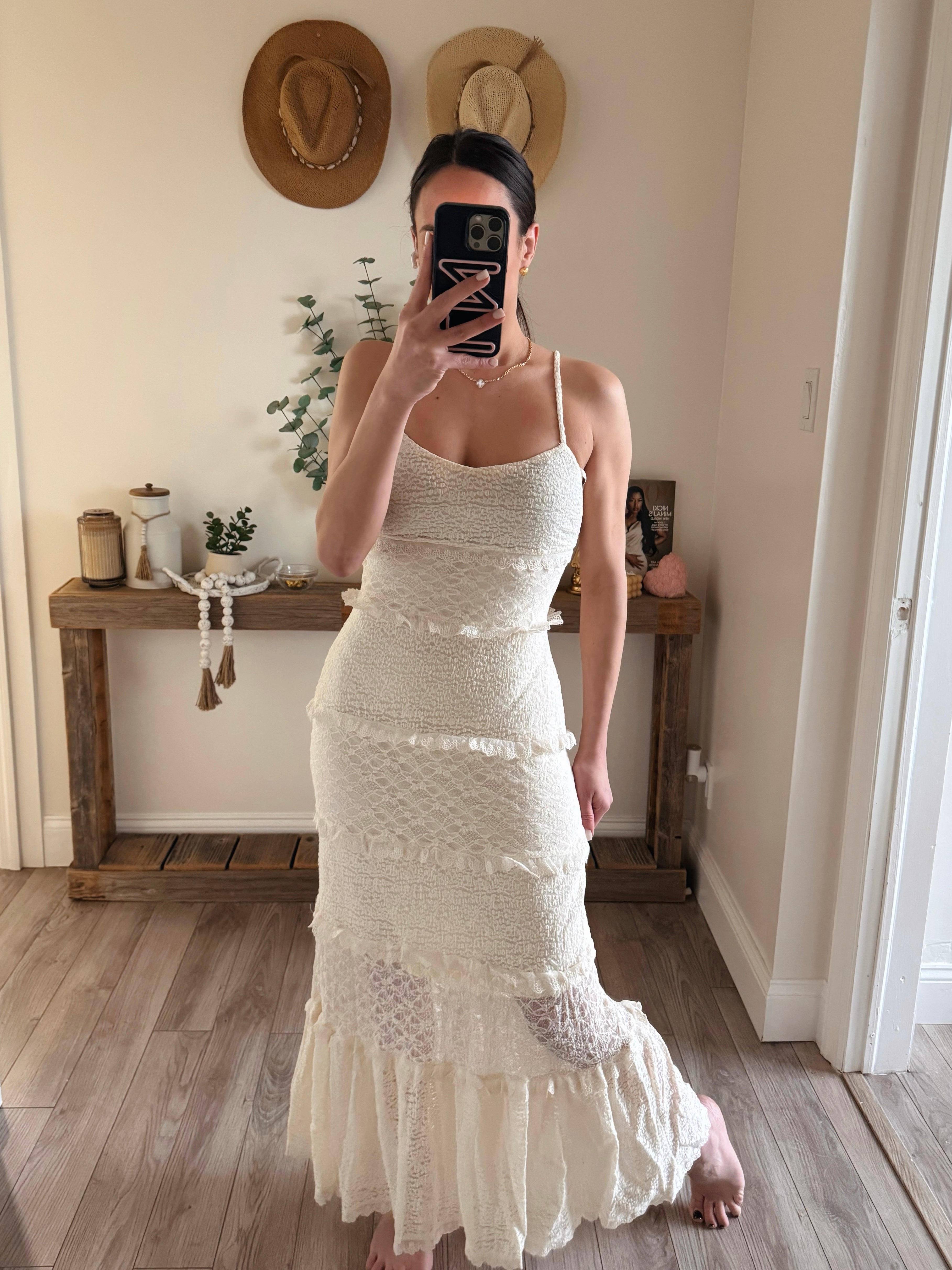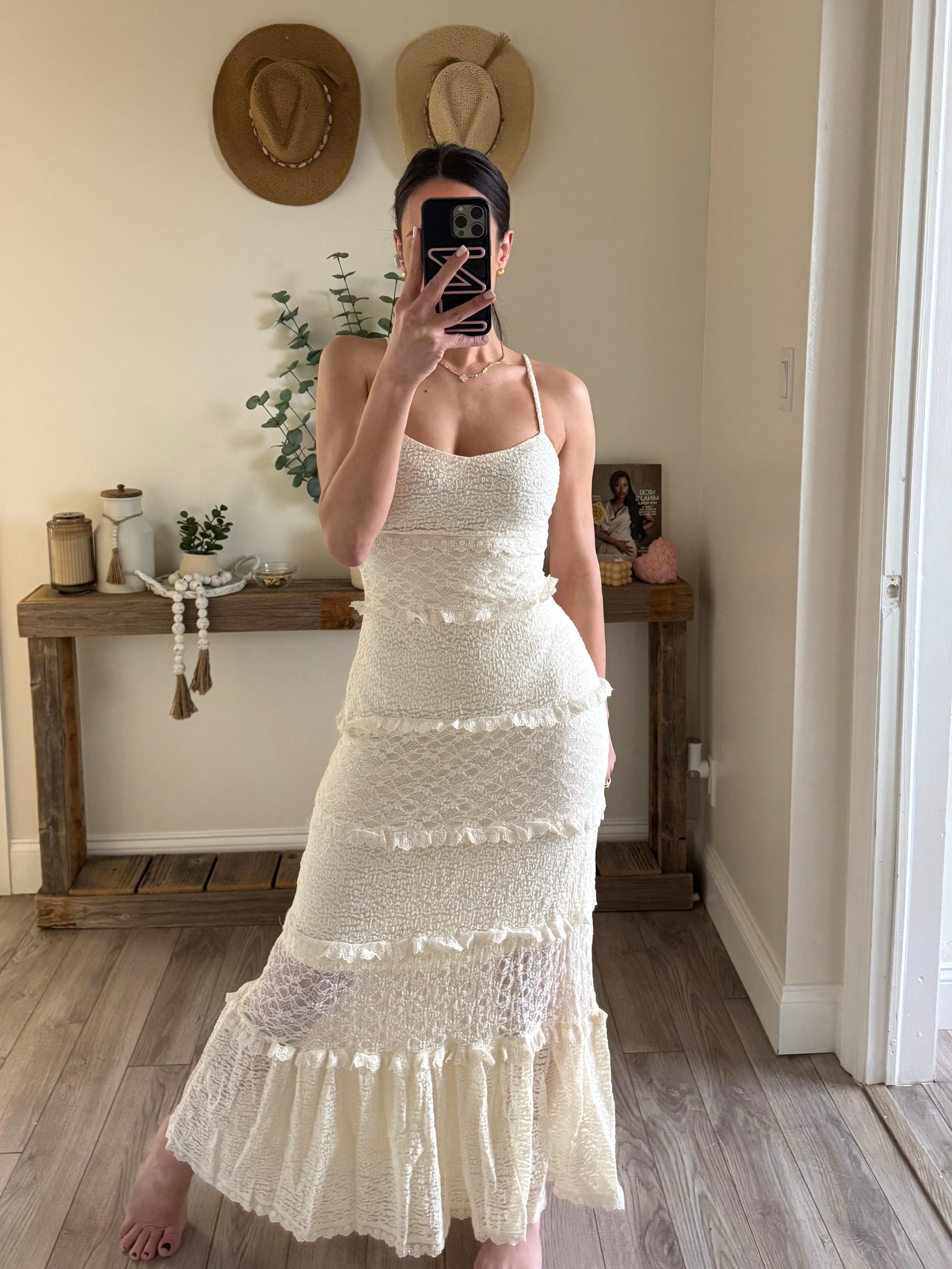 Cream Tiered Ruffled Lace Maxi Dress with Partial Lining