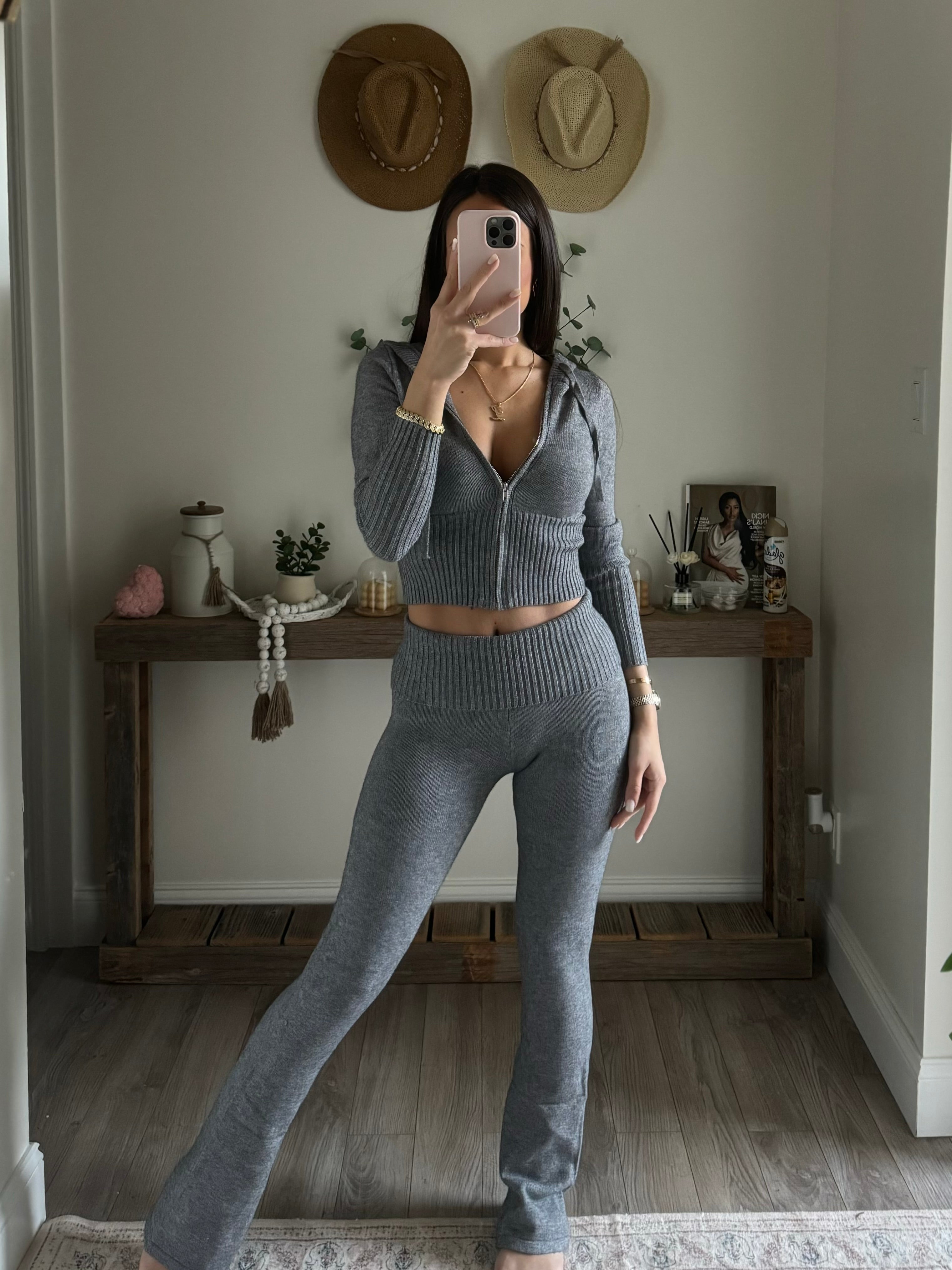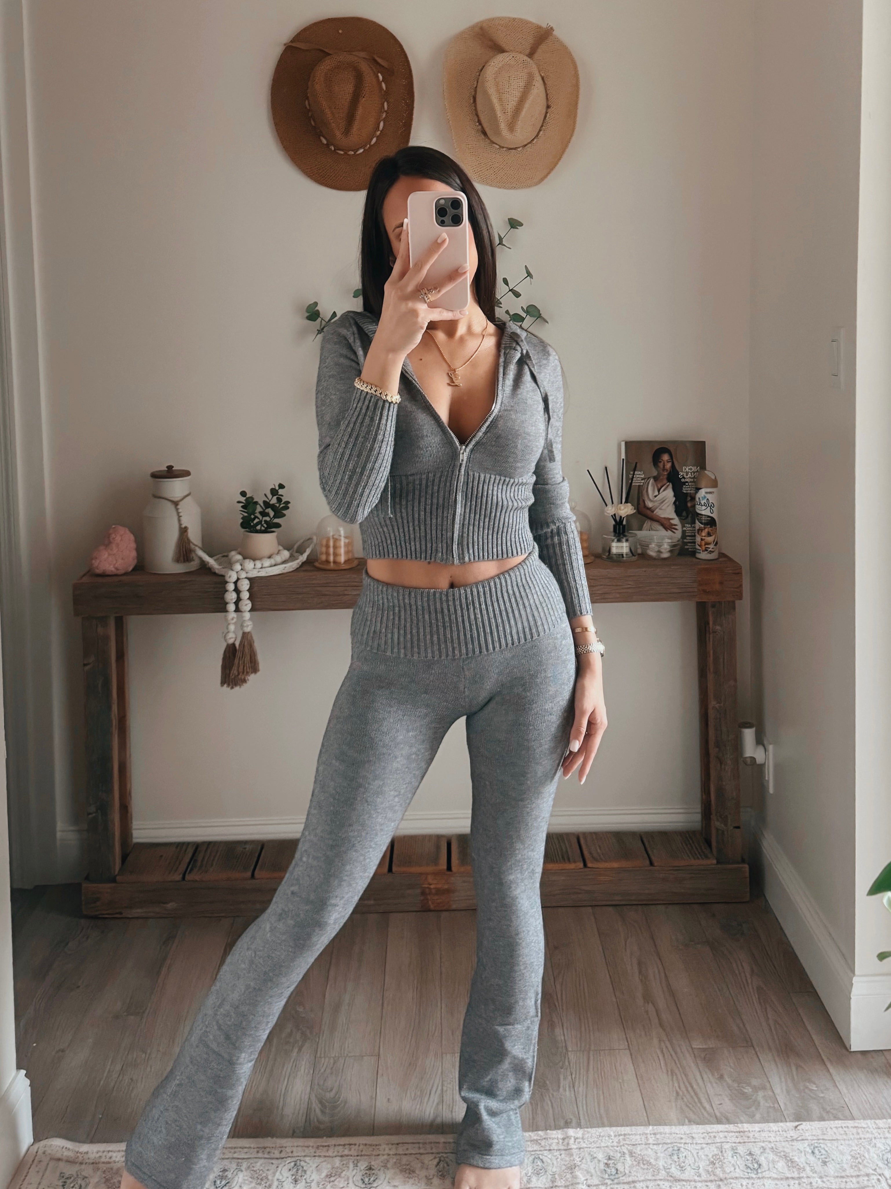 KINT SWEATER HOODIE CROP TOP & LONG PANTS SET - HEATHER GRAY