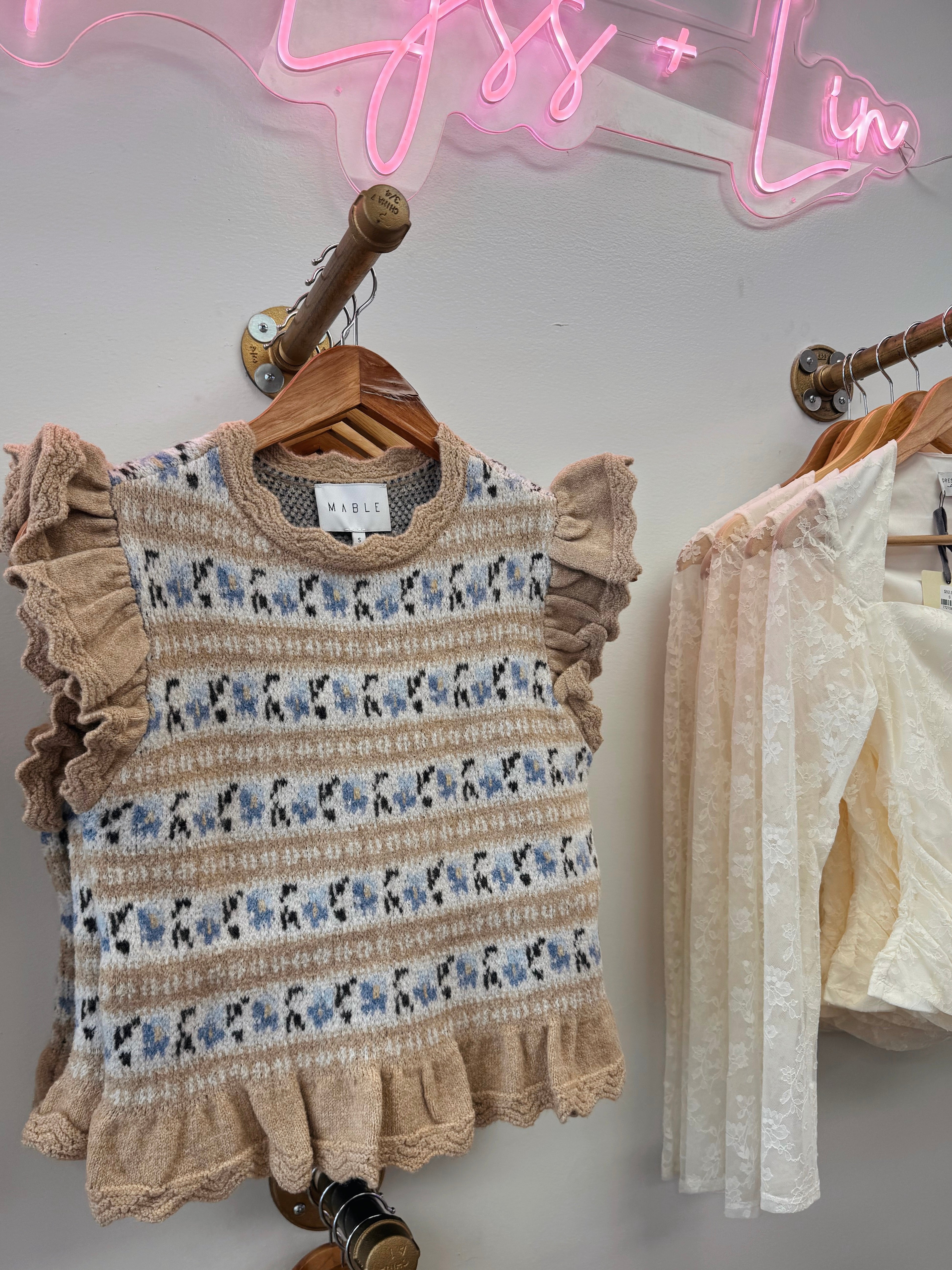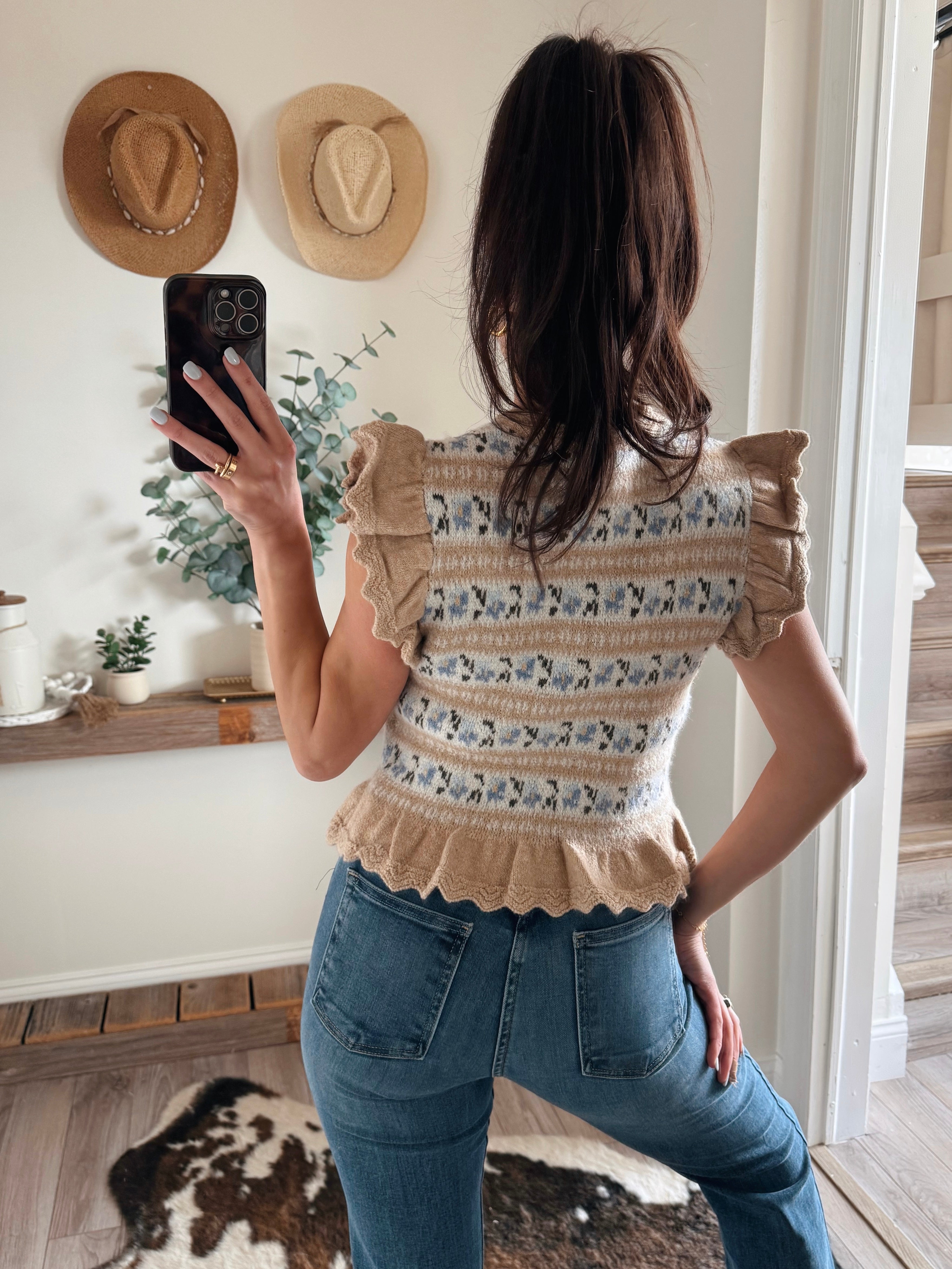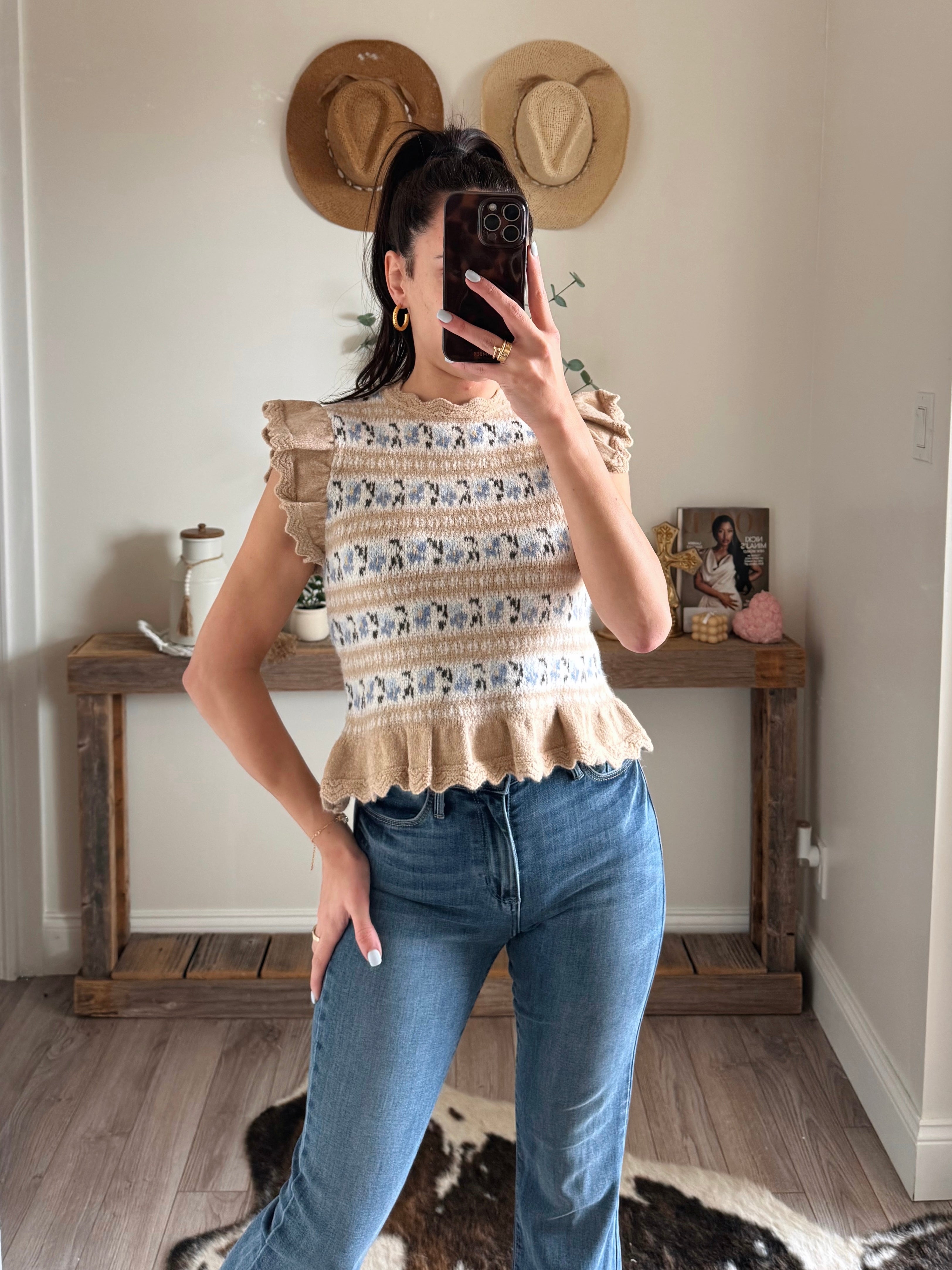Knit Multi Color Jacquard Ruffle Cap Sleeve Top
