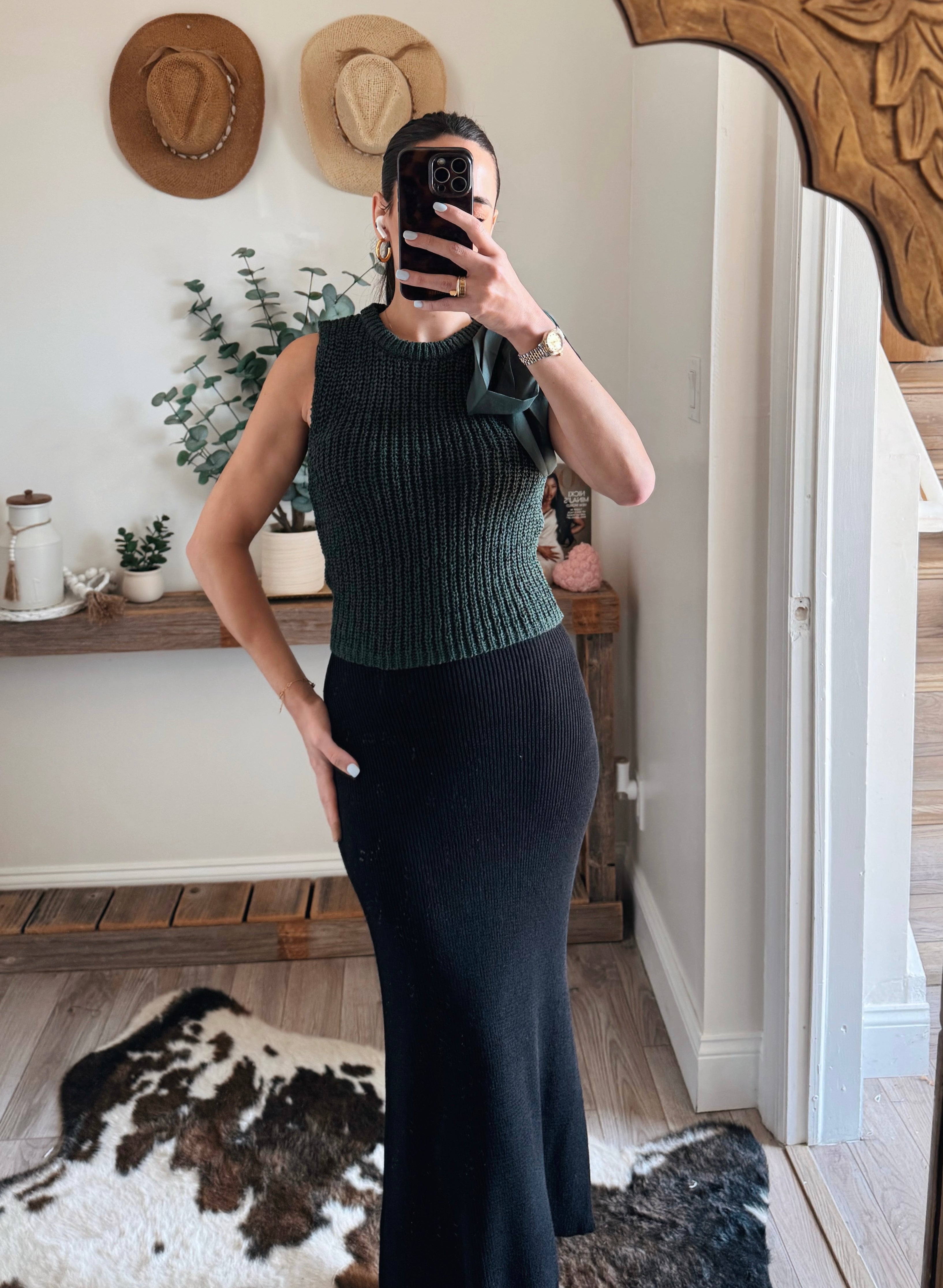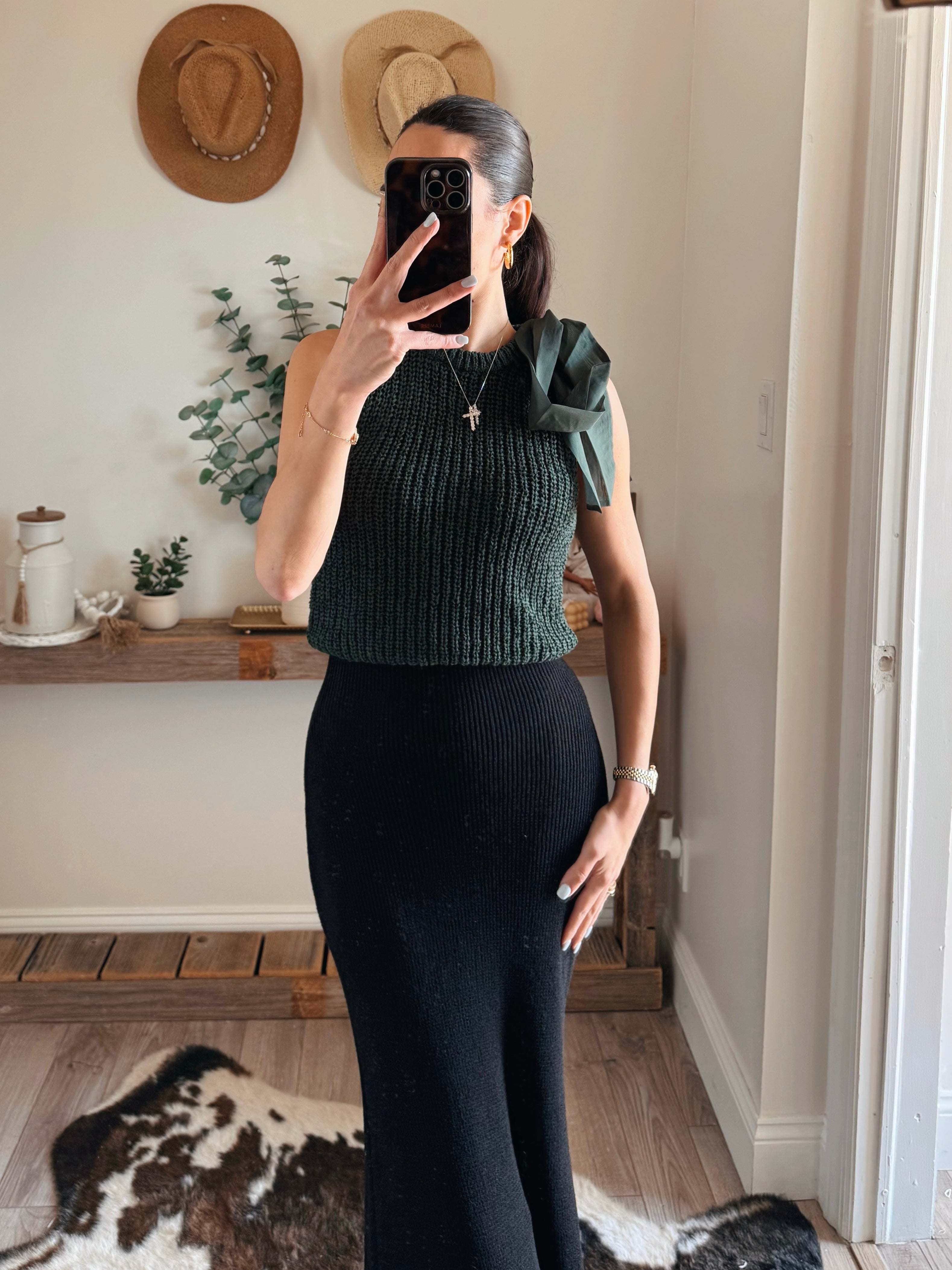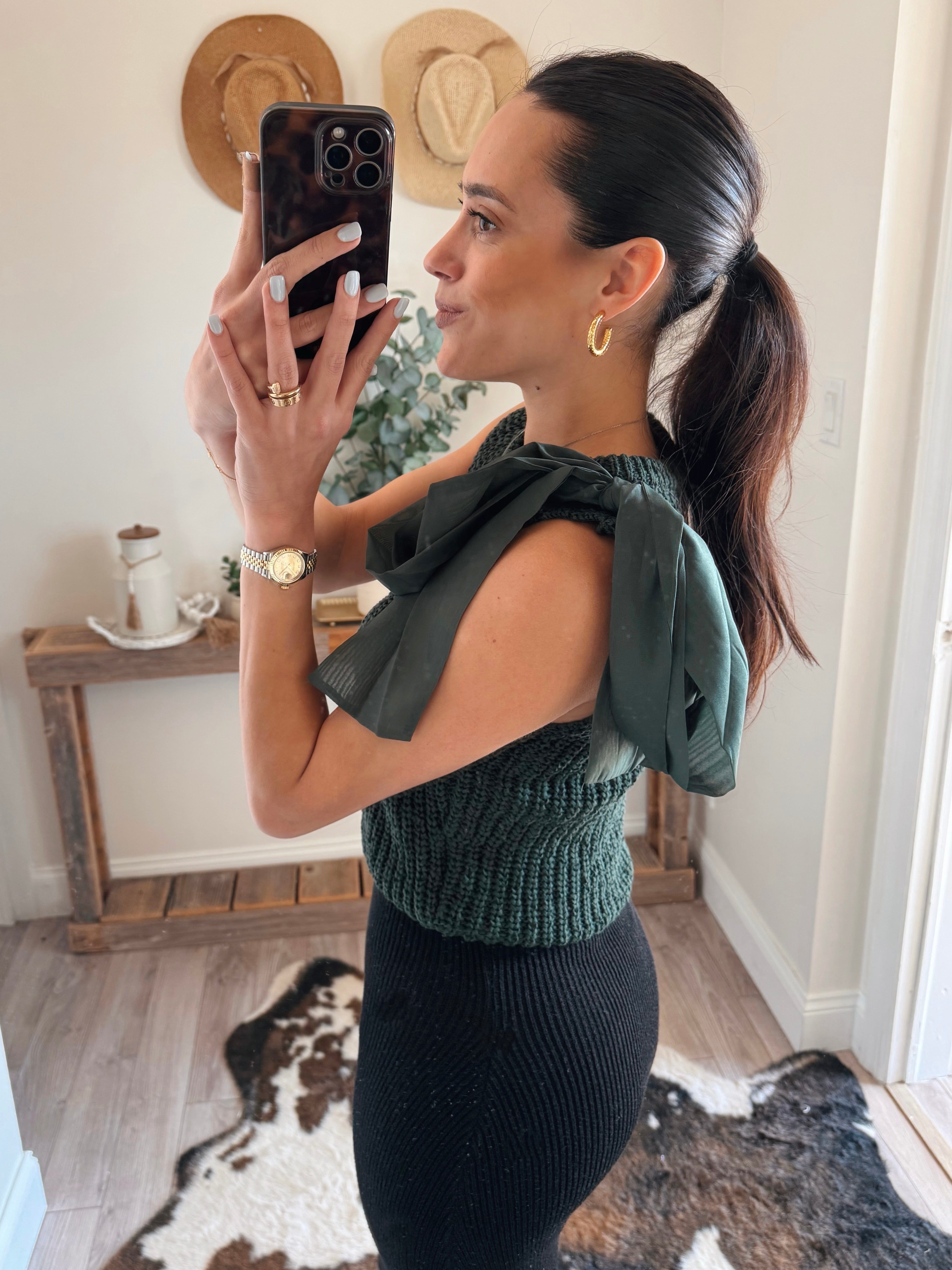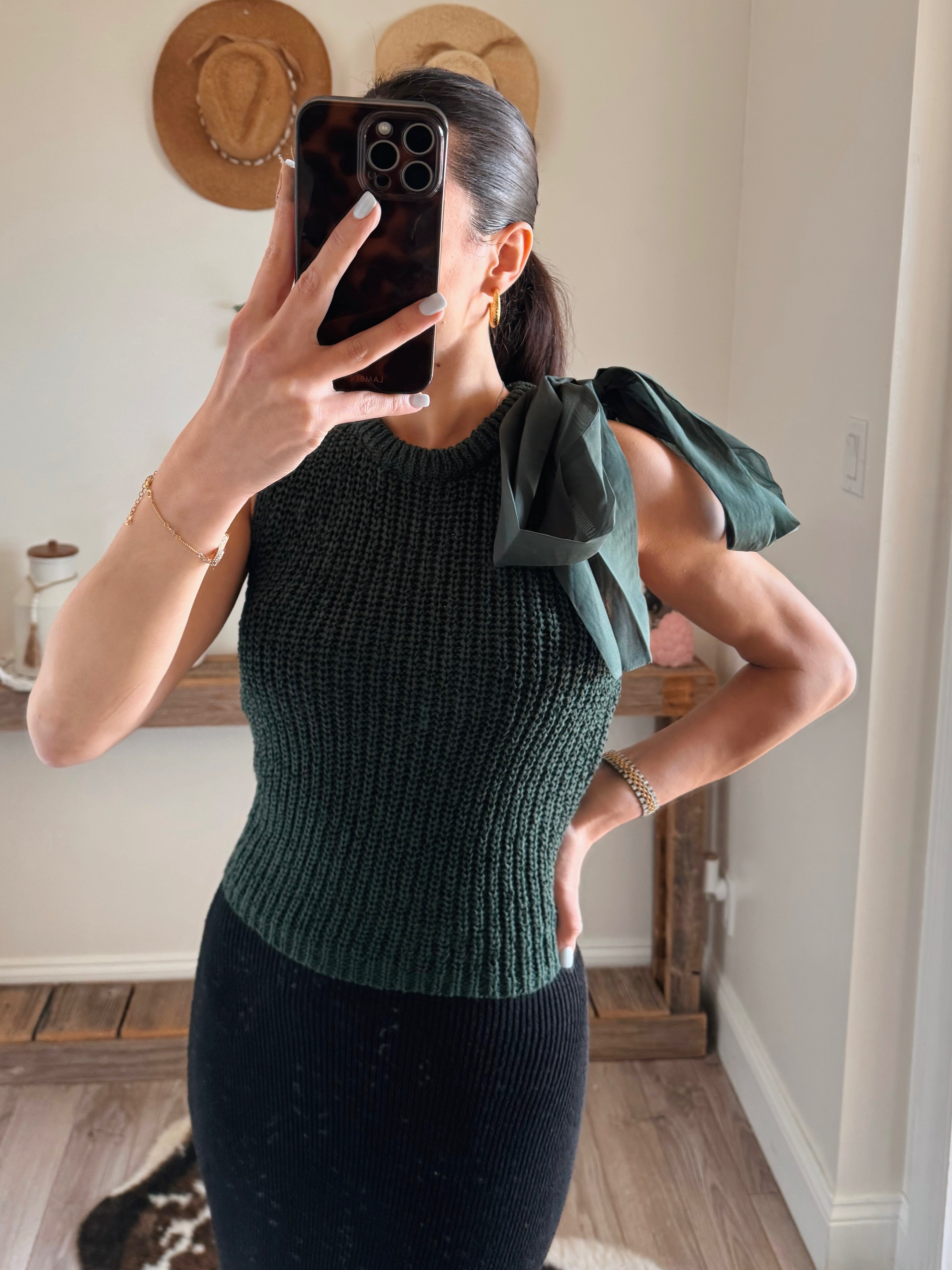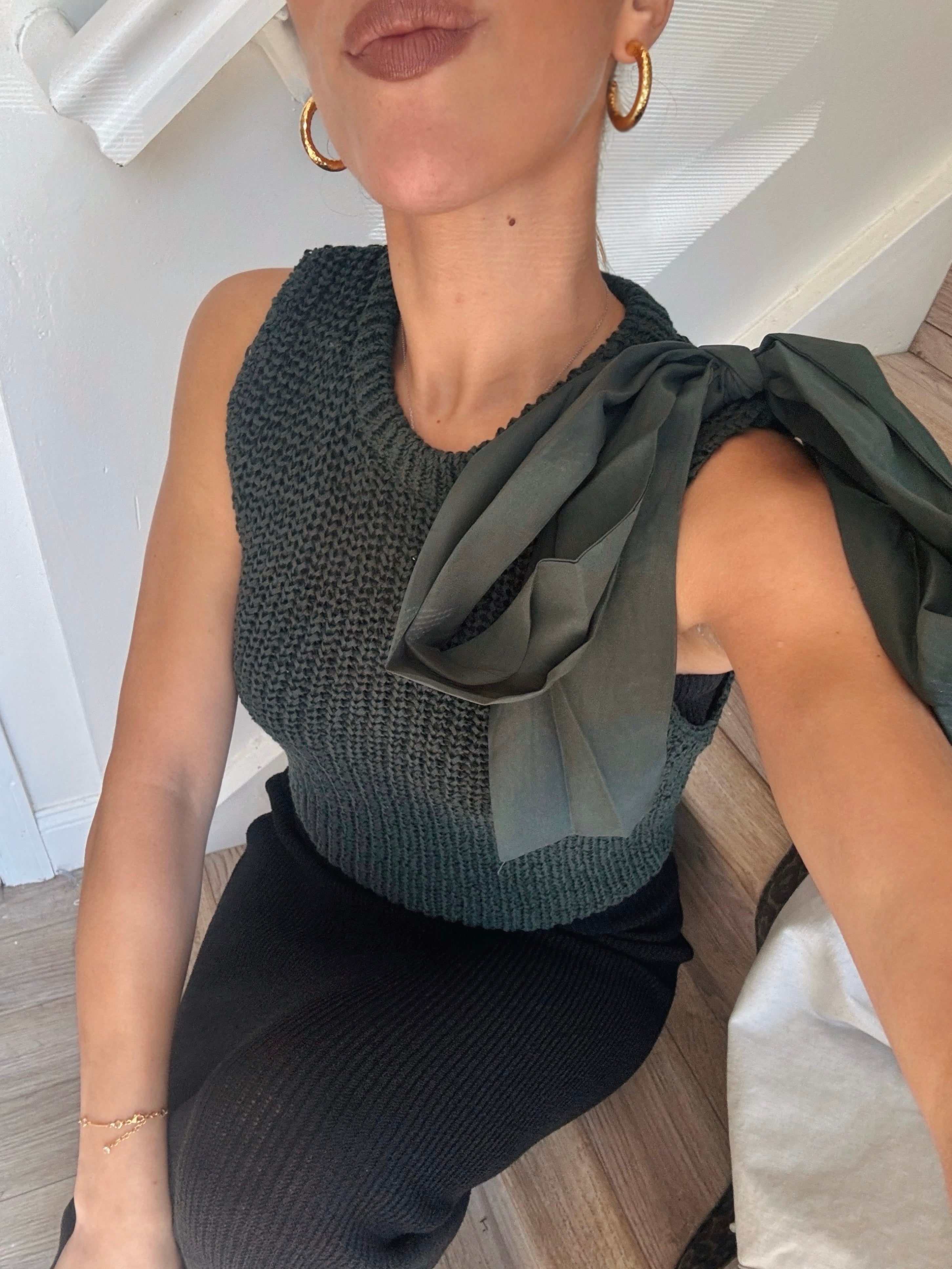 Product Features: This sleeveless knit top has a soft texture and a fitted, cropped shape. An oversized organza bow on the shoulder adds a stylish, romantic detail.