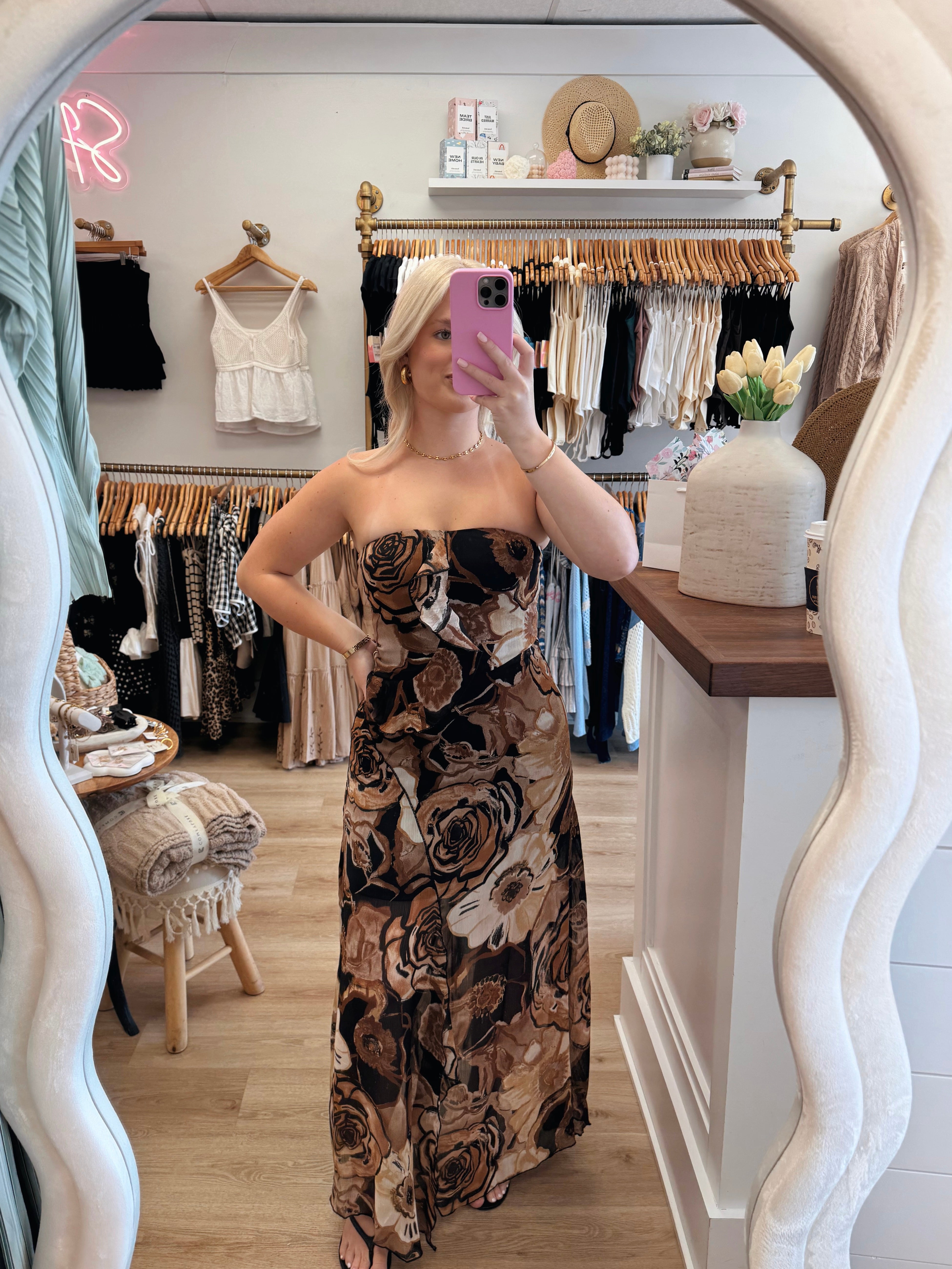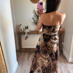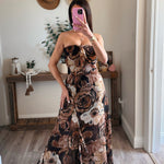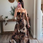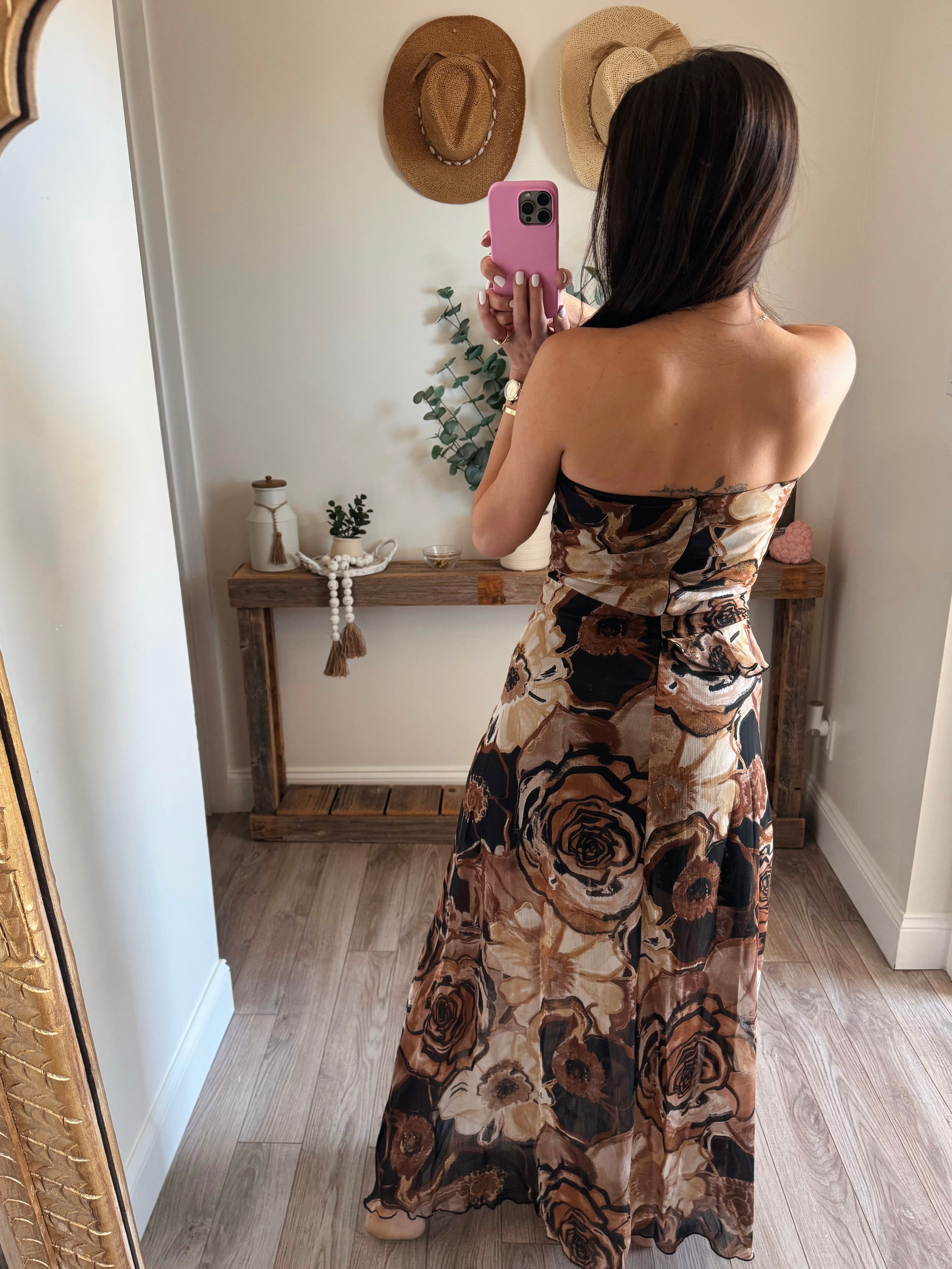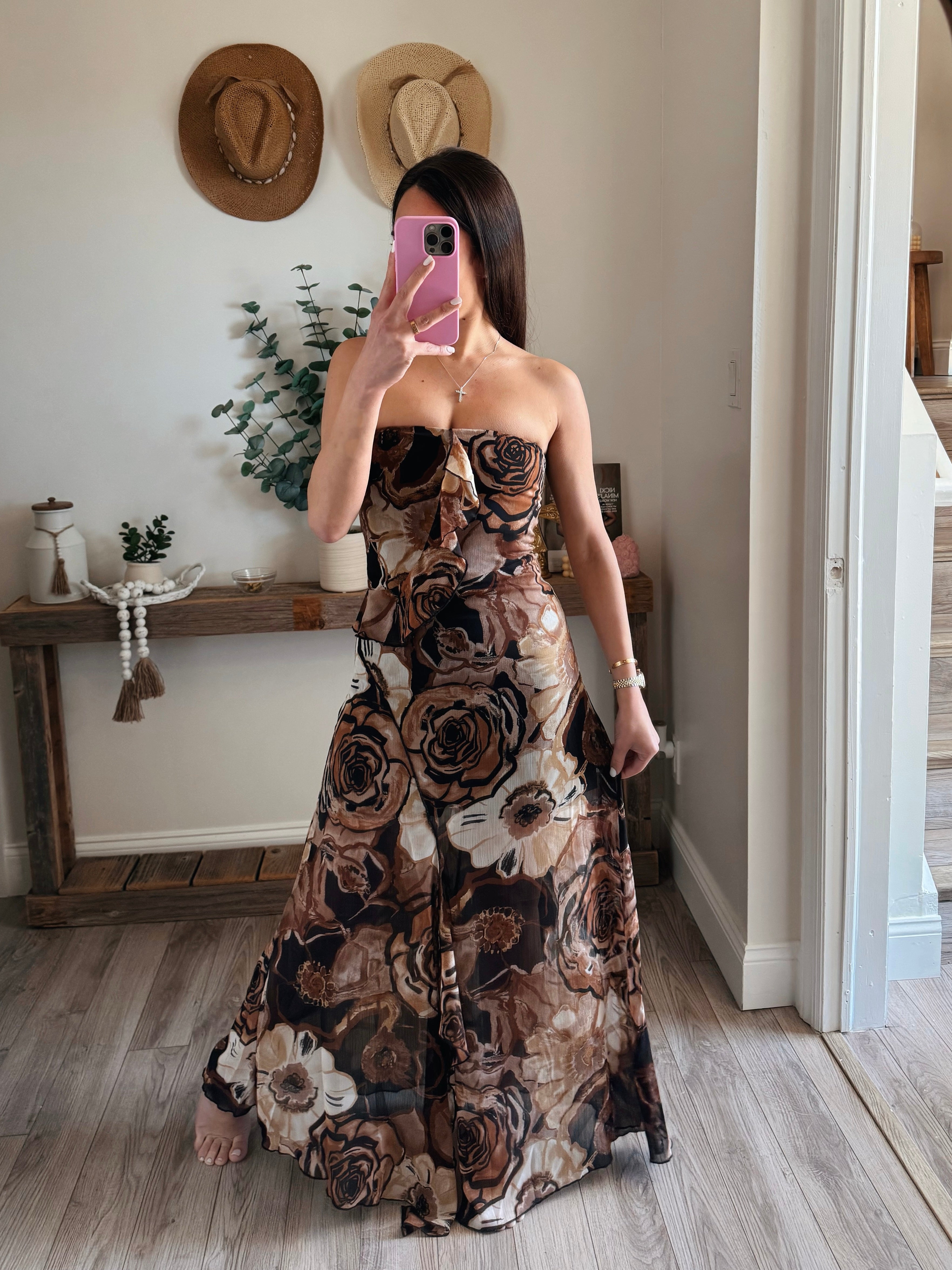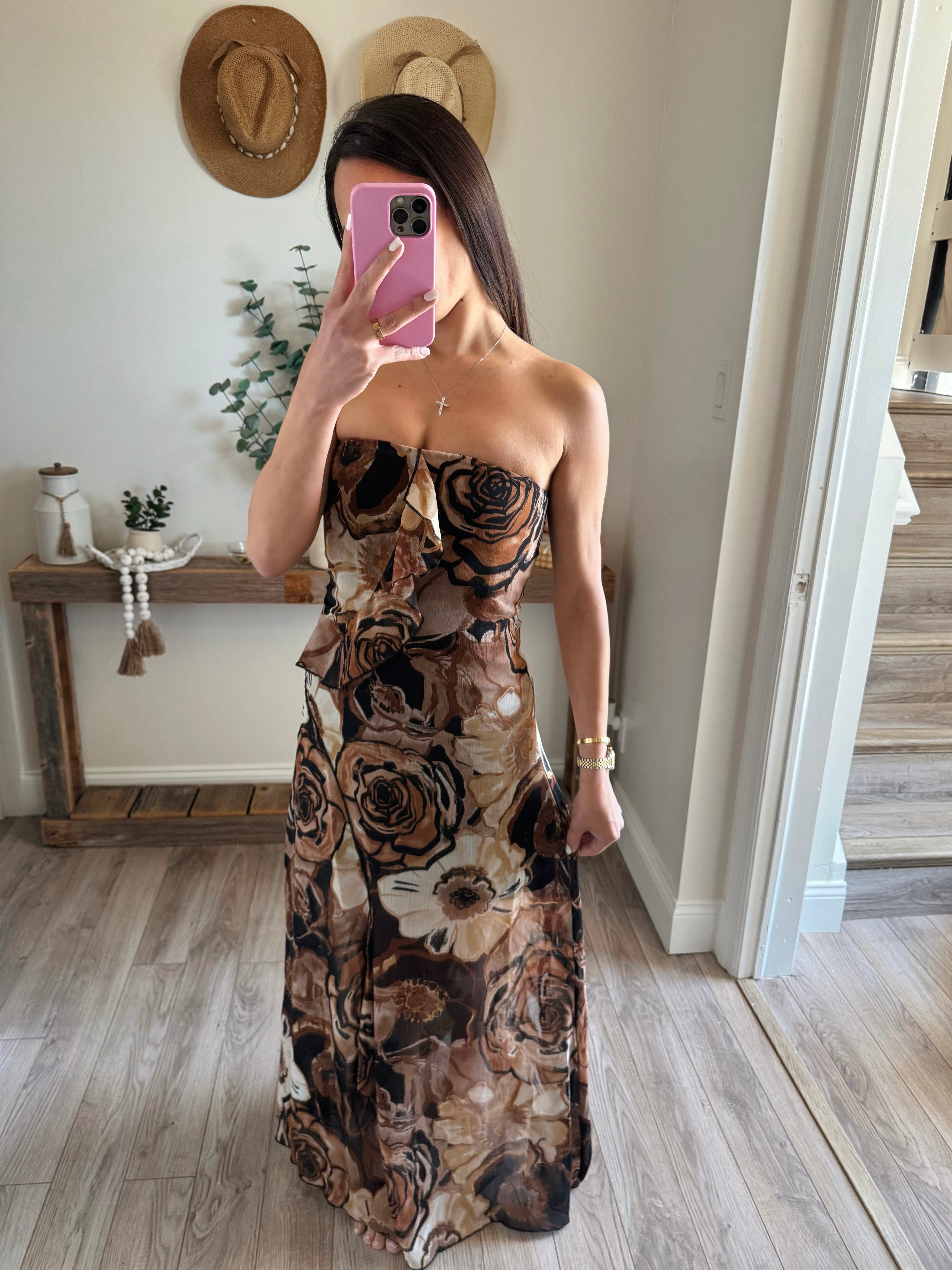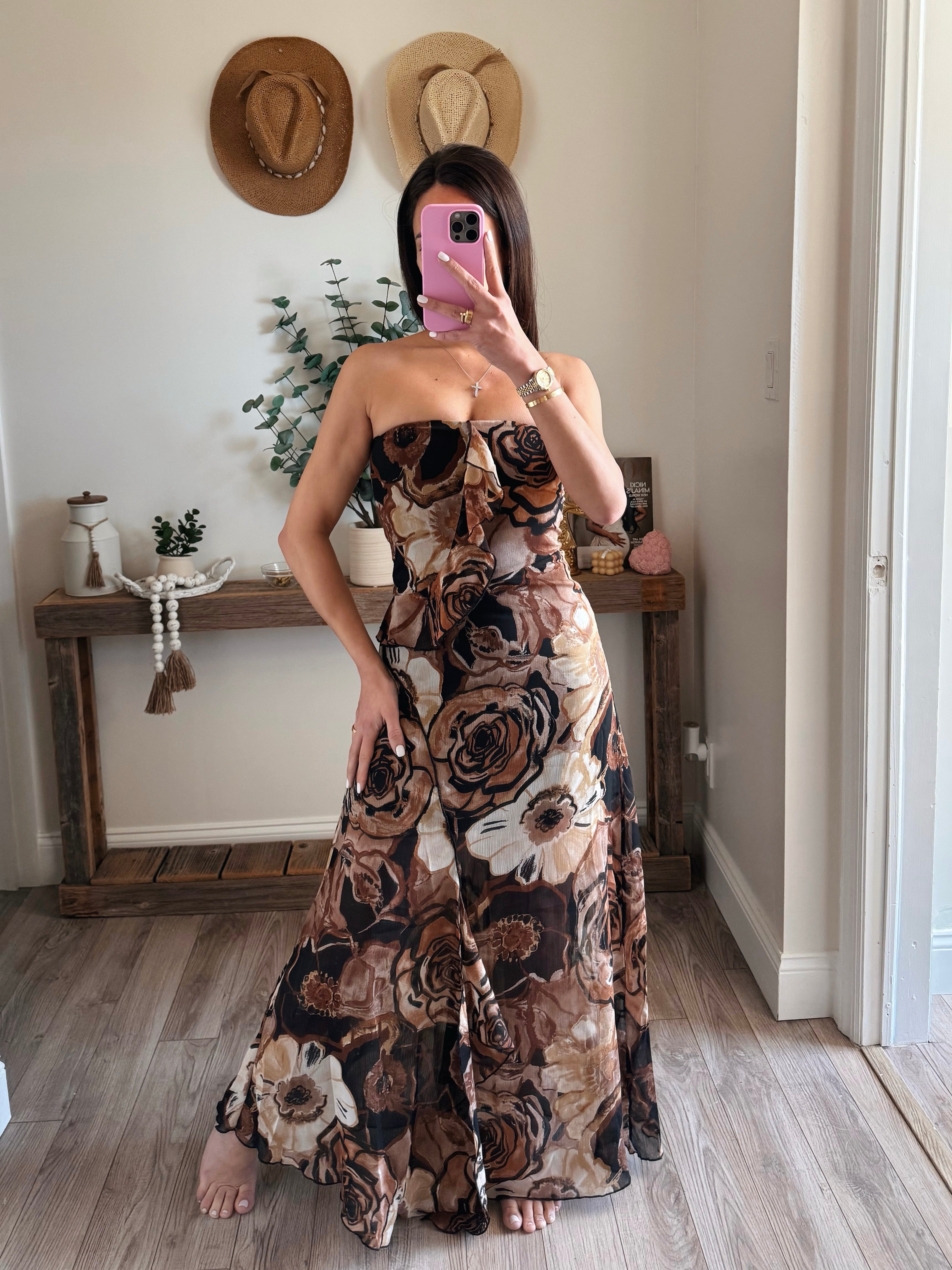 Black/Brown Floral Chiffon Ruffled Maxi Dress