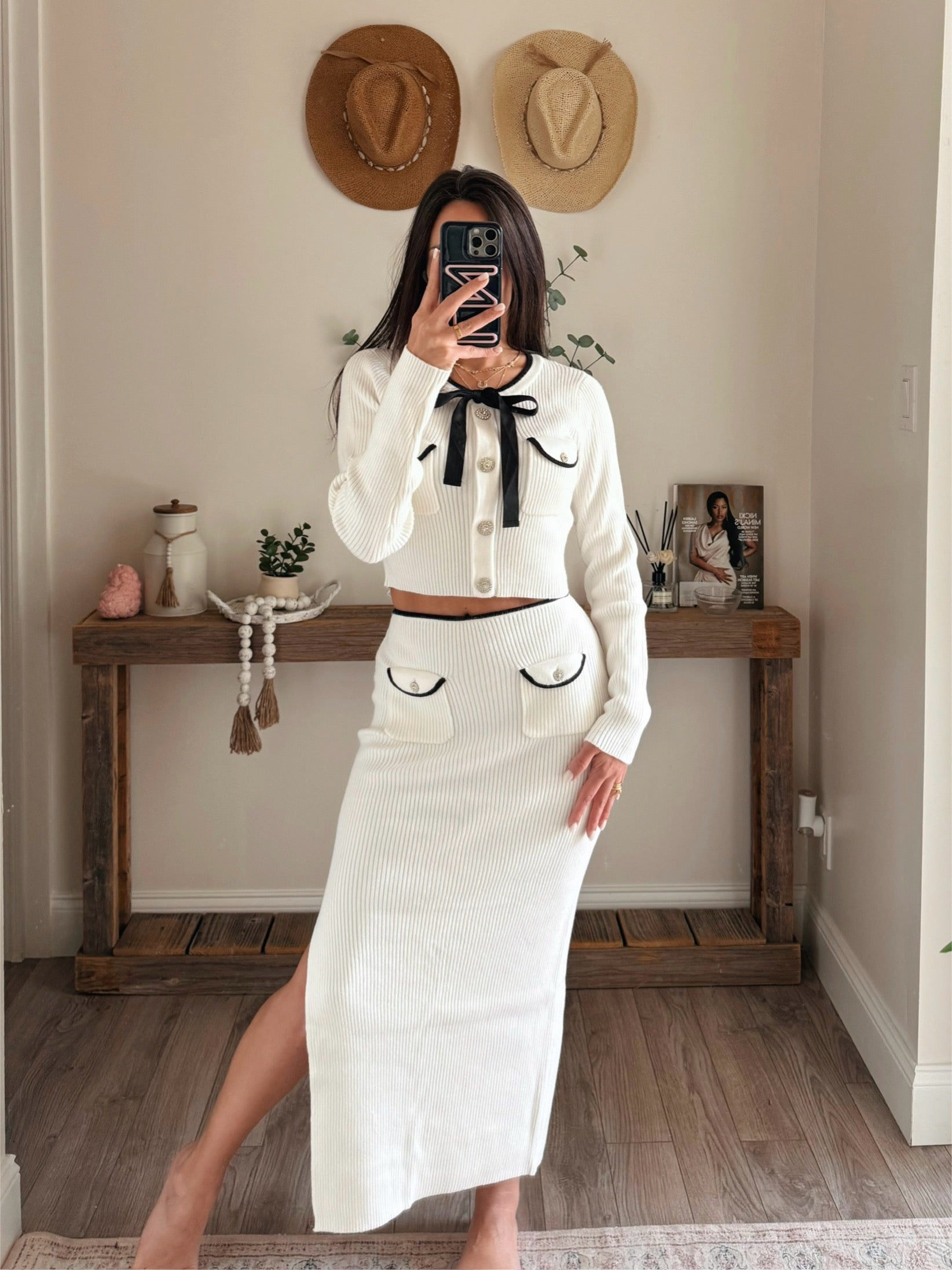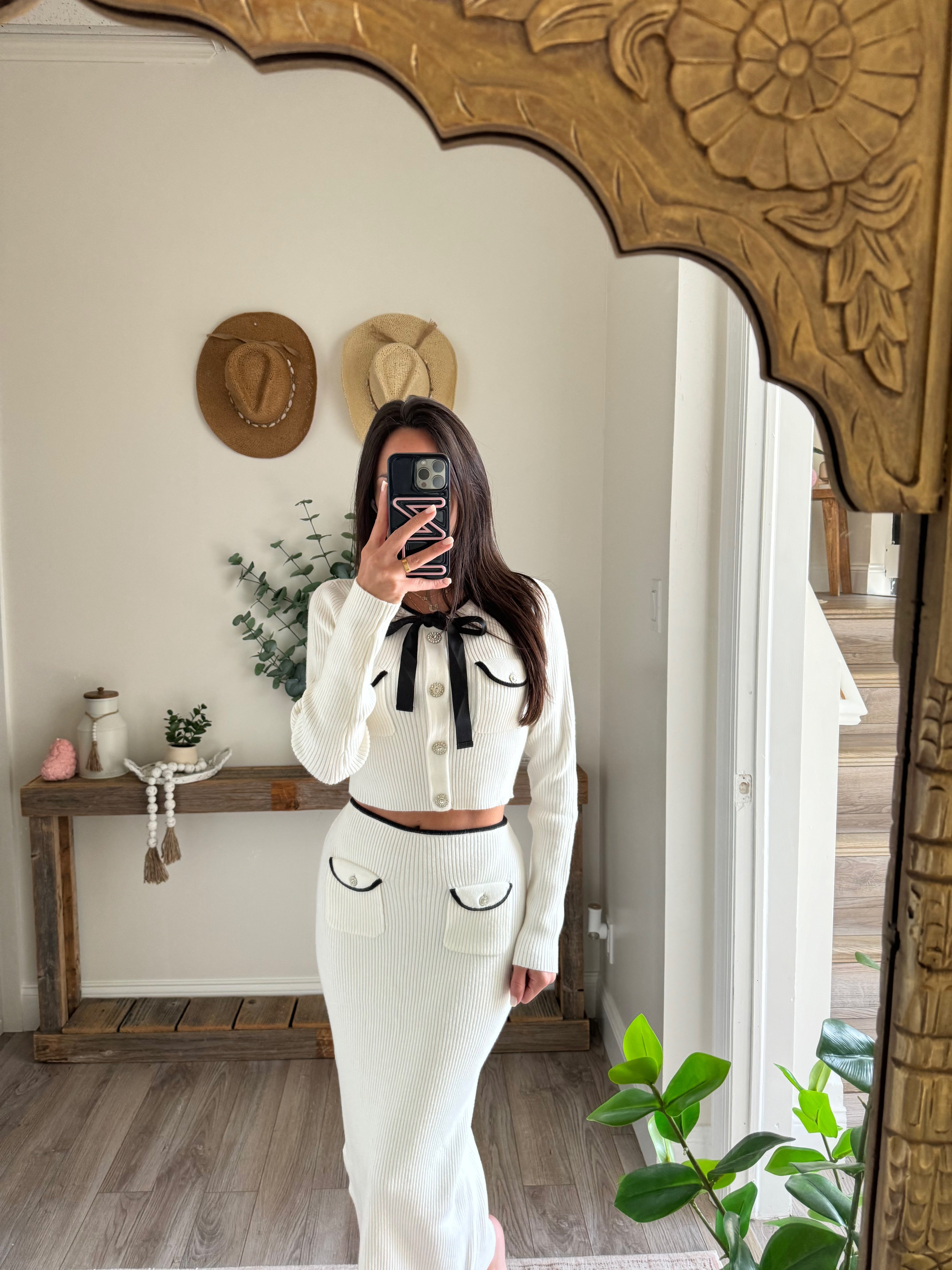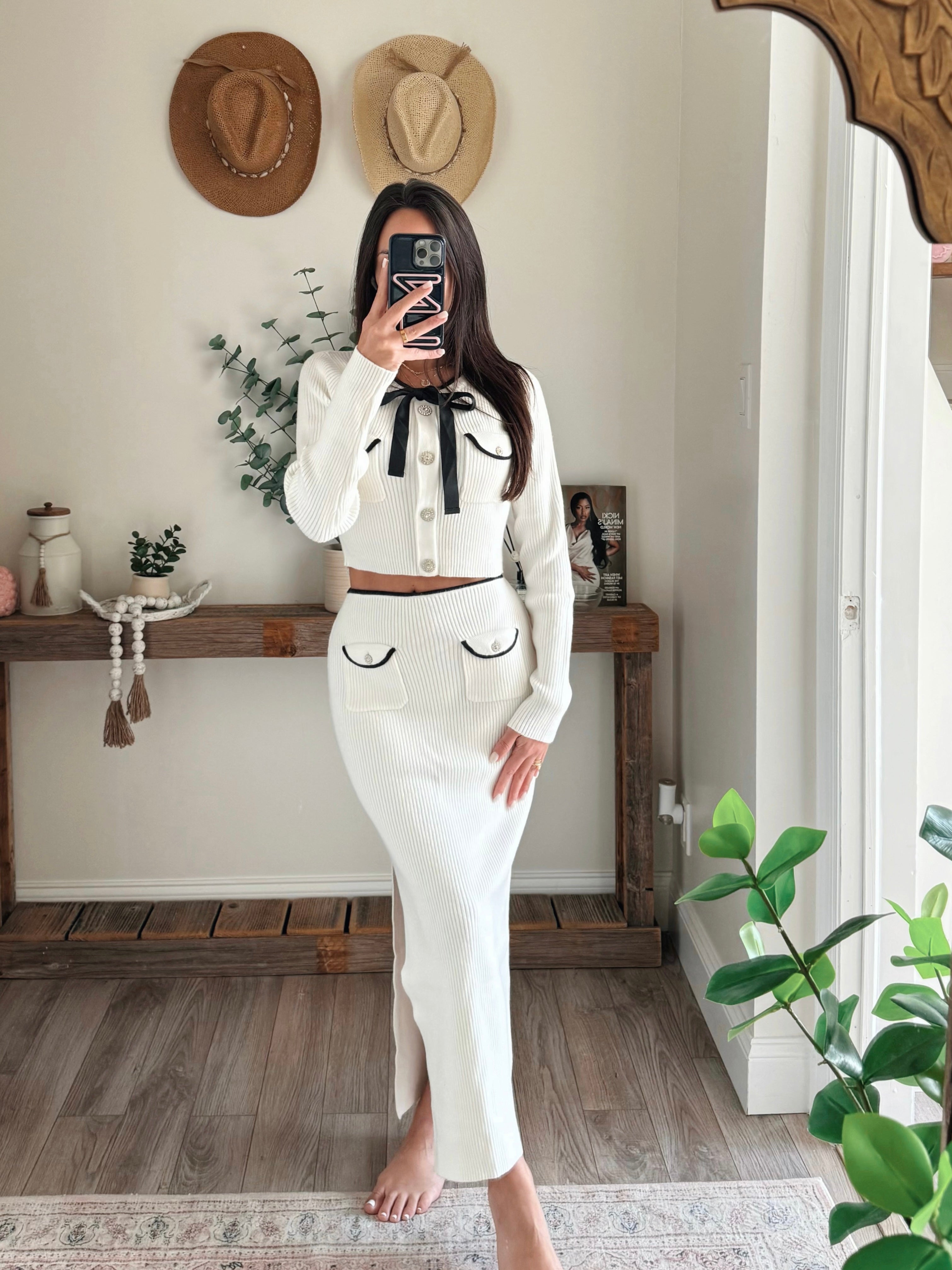 Long sleeve ribbed sweater knit crop top with rhinestone button and contrast color trim detail and matching bodycon midi side slit skirt set.