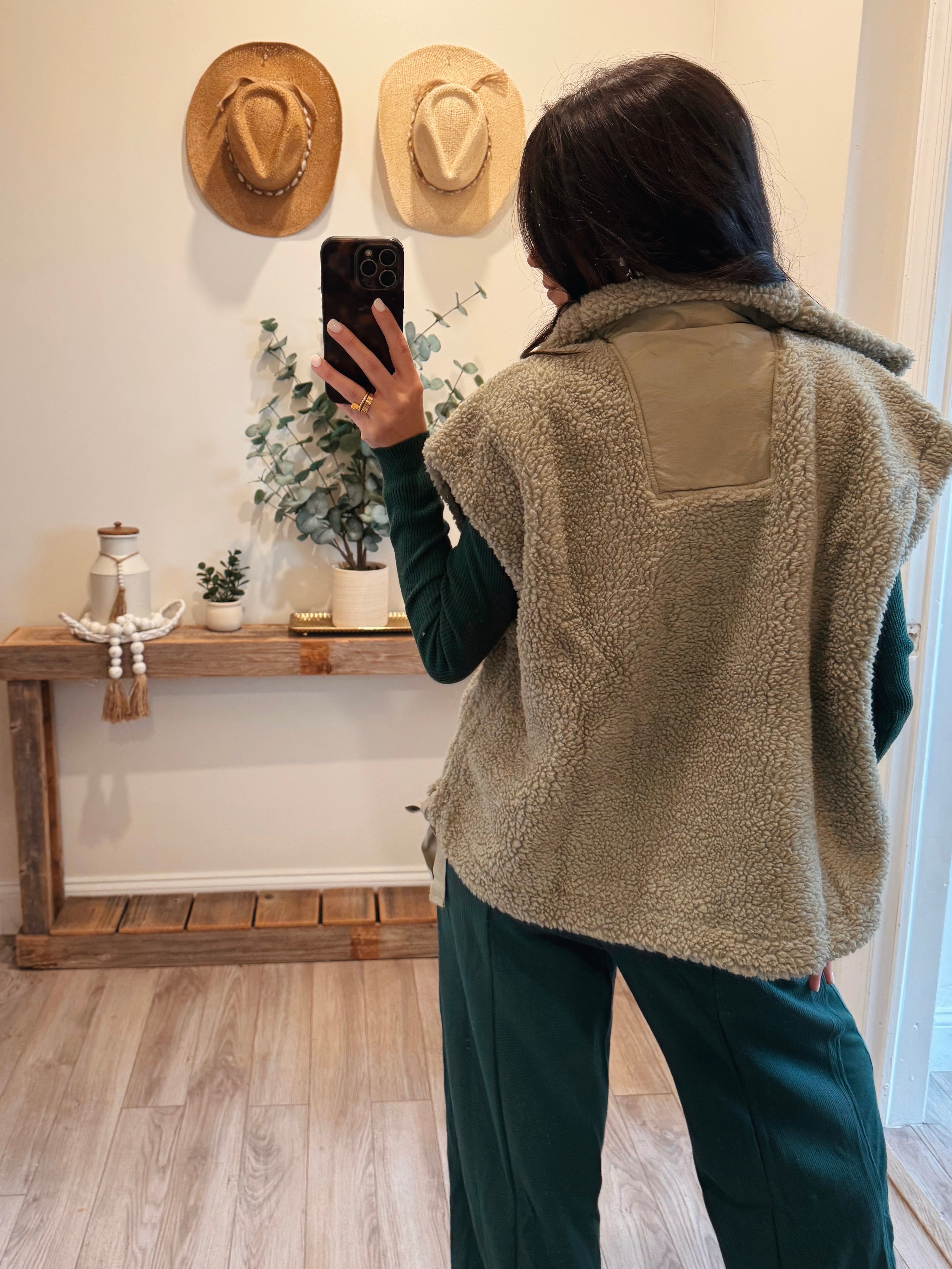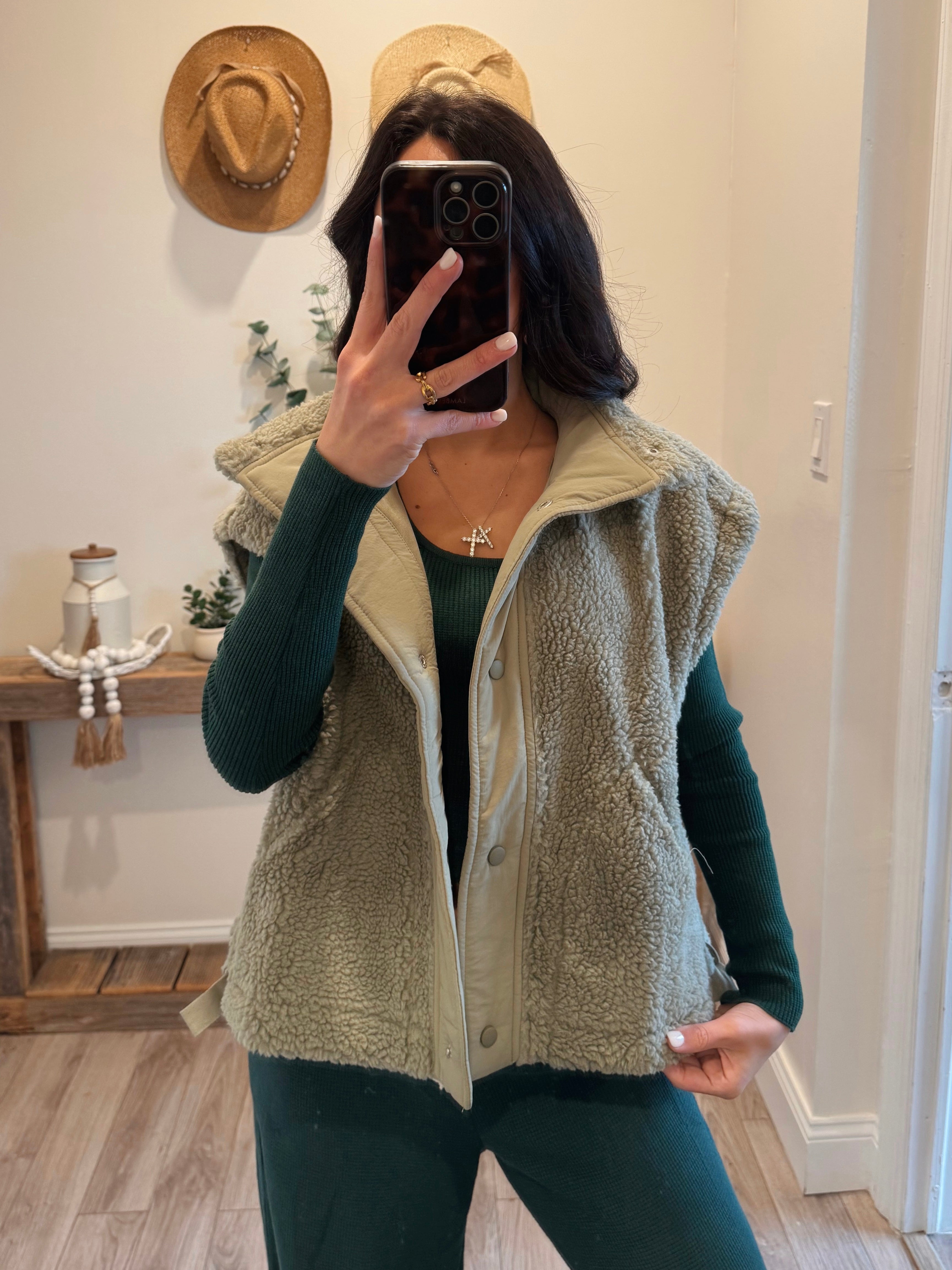 Product Features:Experience warmth and versatility with this sherpa vest, ideal for layering. It includes distinctive side tie-ups for a customizable, secure fit. Designed with a cozy mock neck and button-front closure for effortless wear.