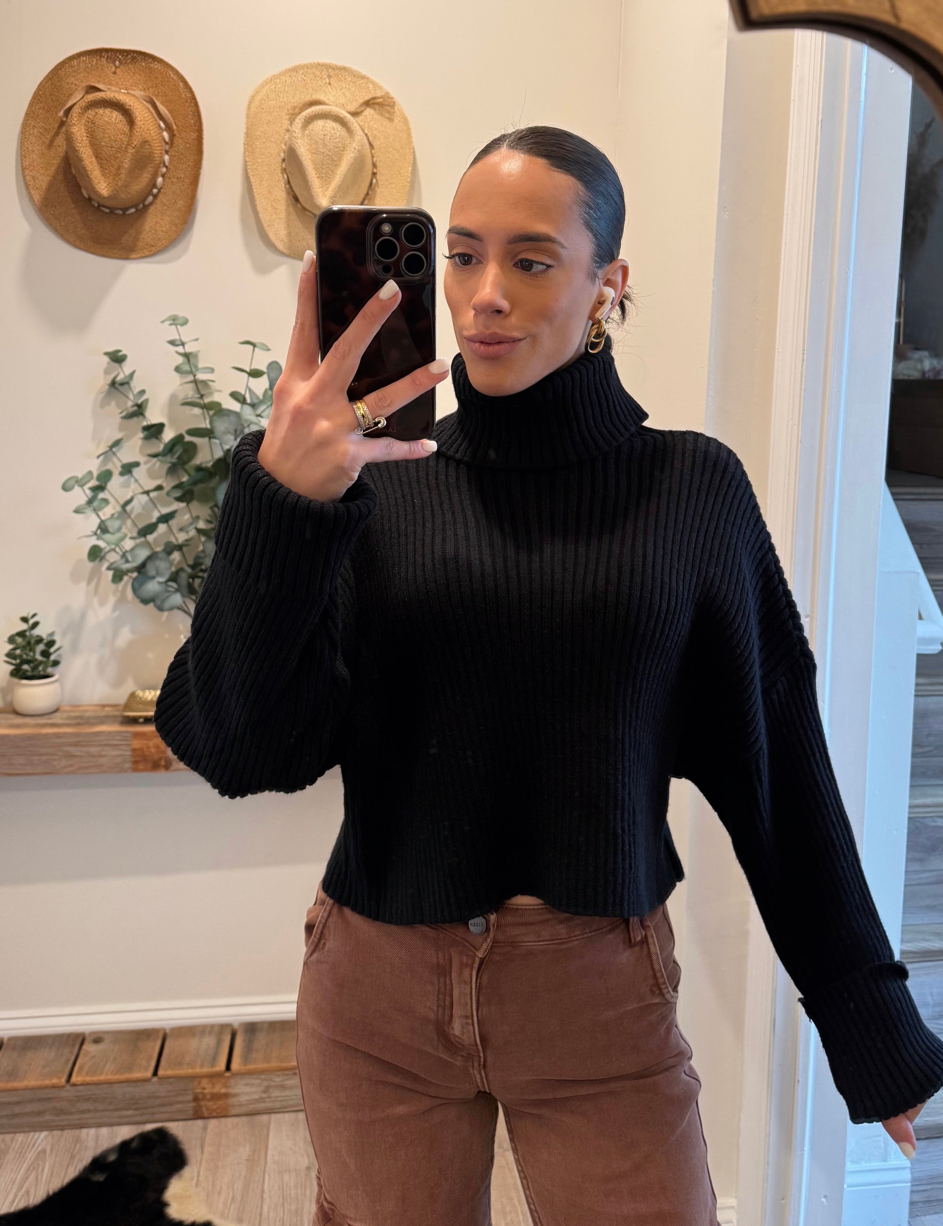 Black Fringe Hem Ribbed Turtleneck Sweater