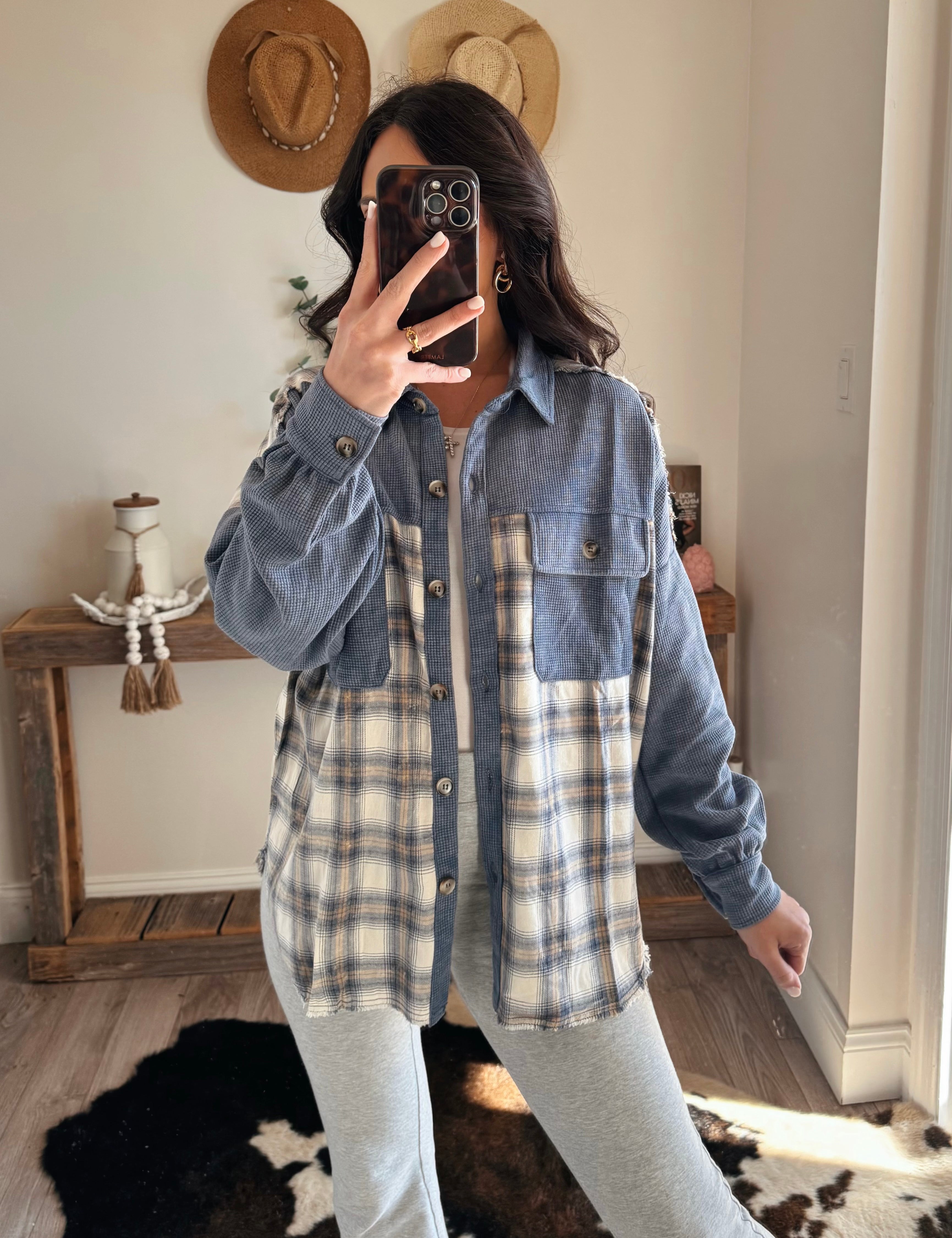 Garment Wash Plaid Waffled Mix Shirt Jacket