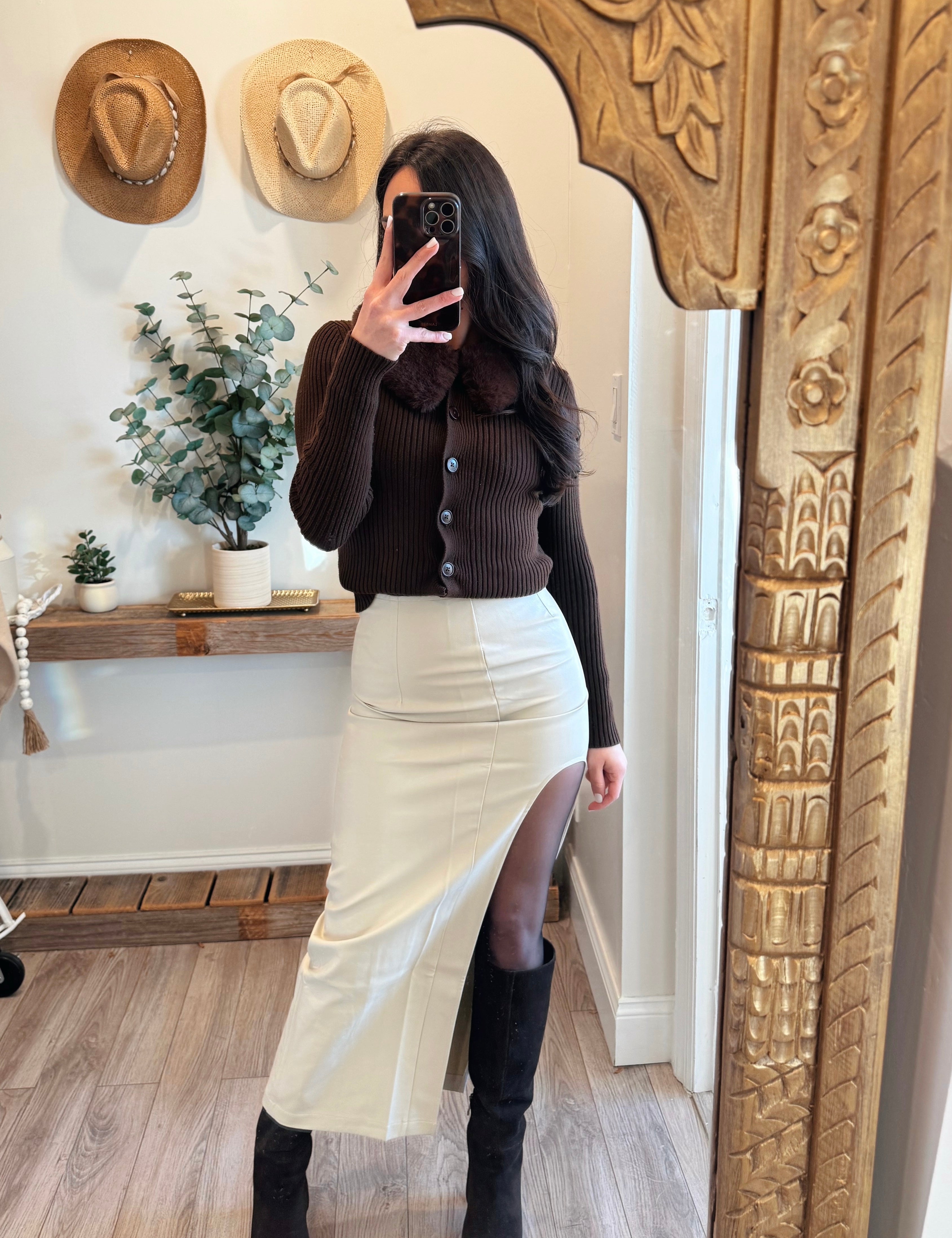 Ecru Pu Slit Skirt