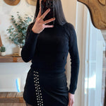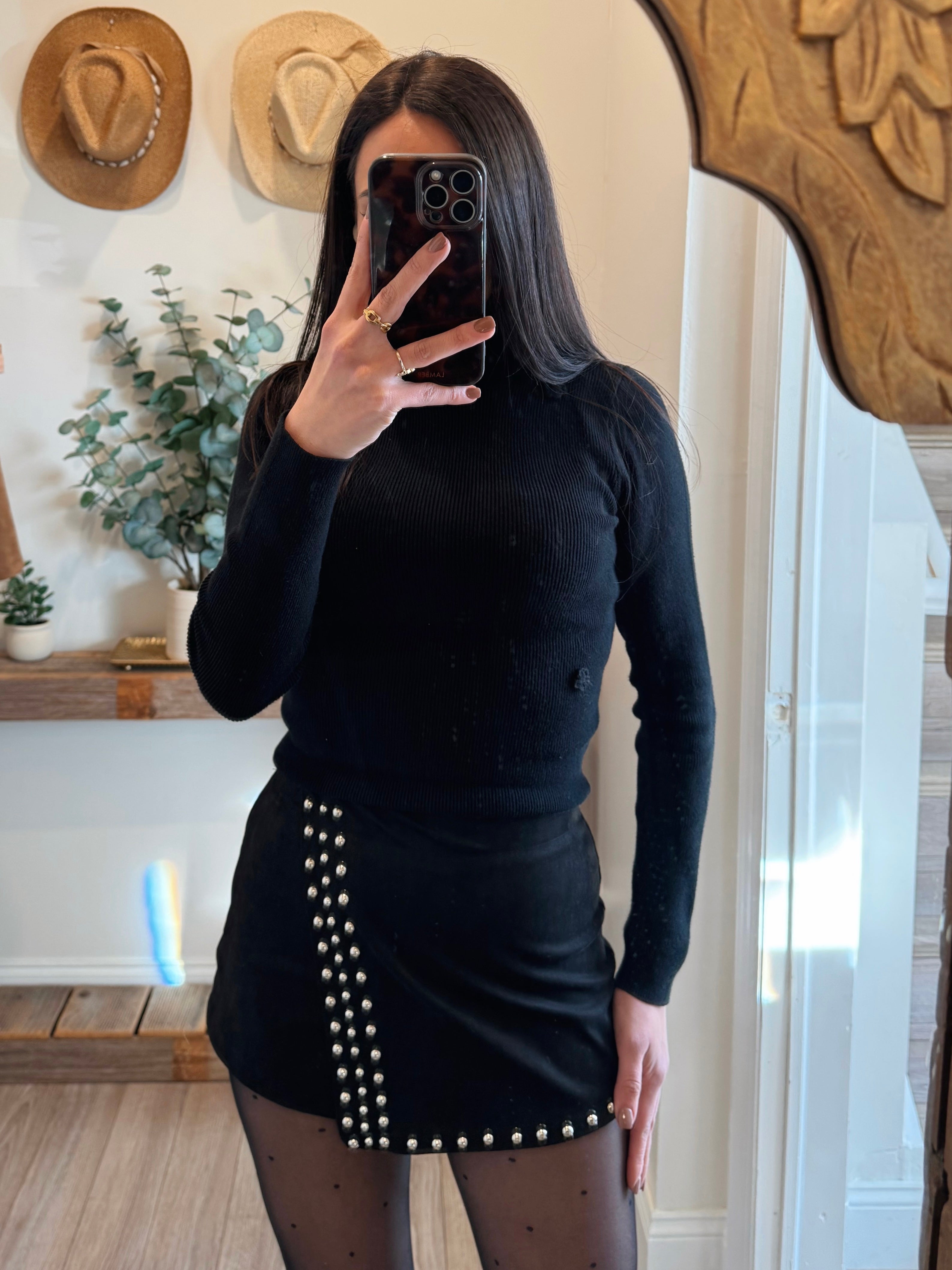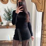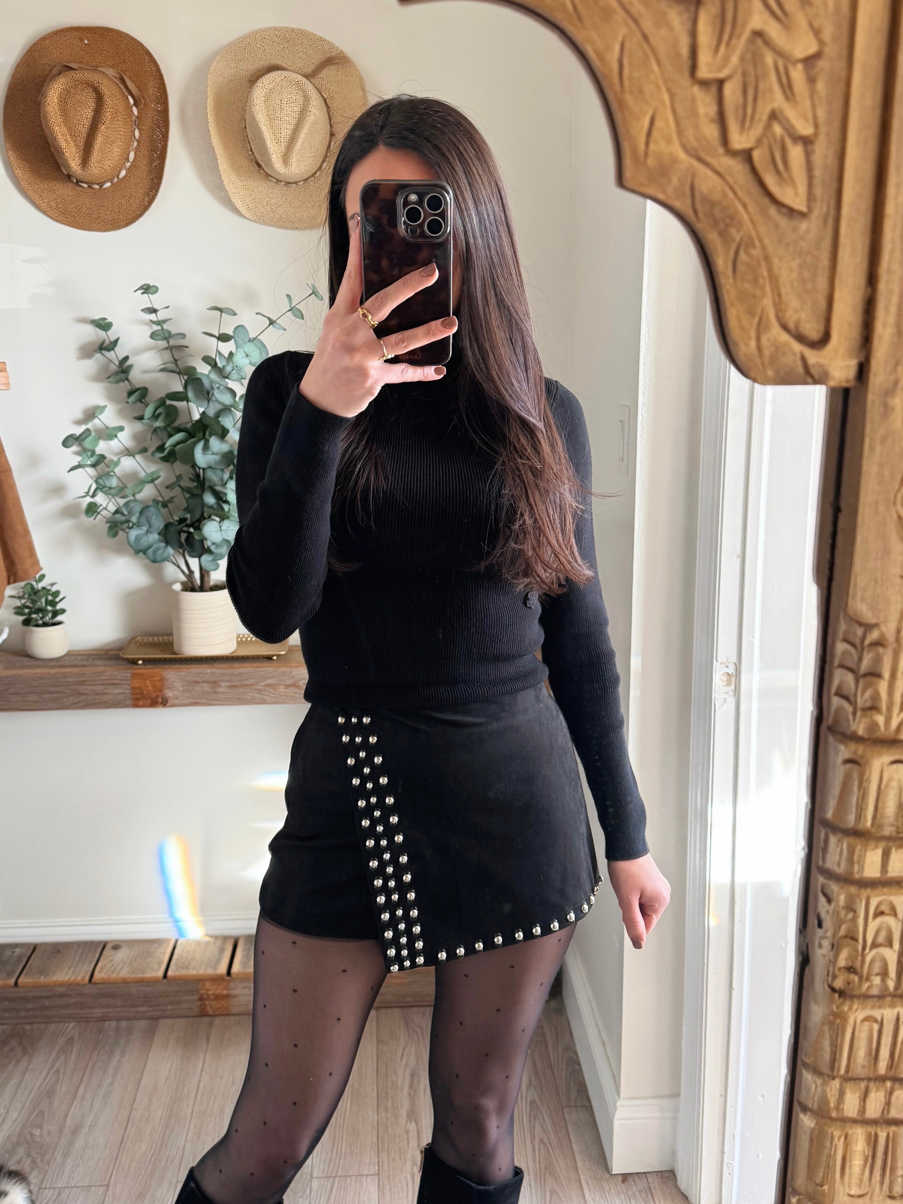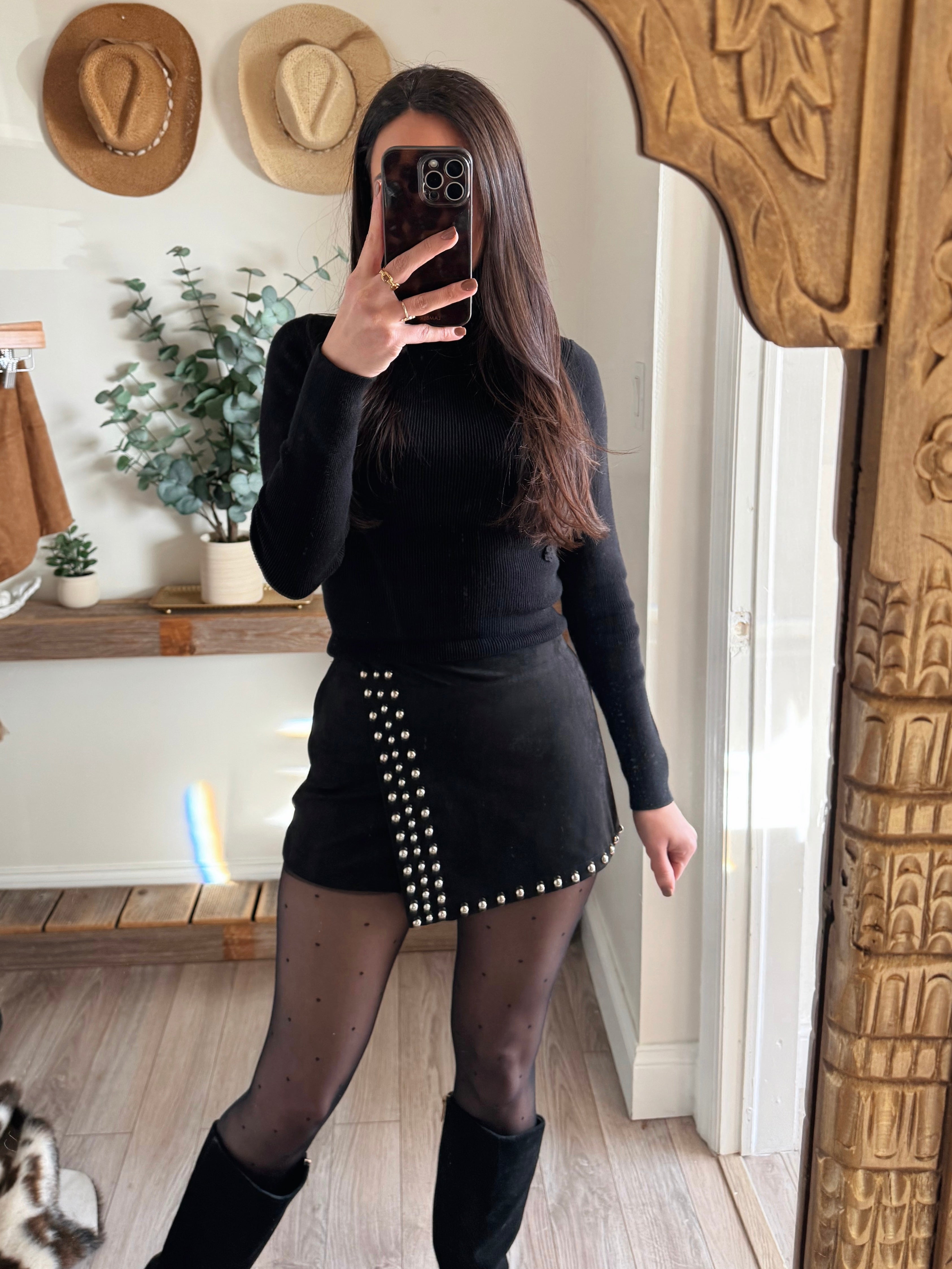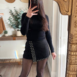 Product Features: Suede Solid Color Side Zipper Down Studded Details Inside Shorts Asymmetric Wrapped Mini Skirt