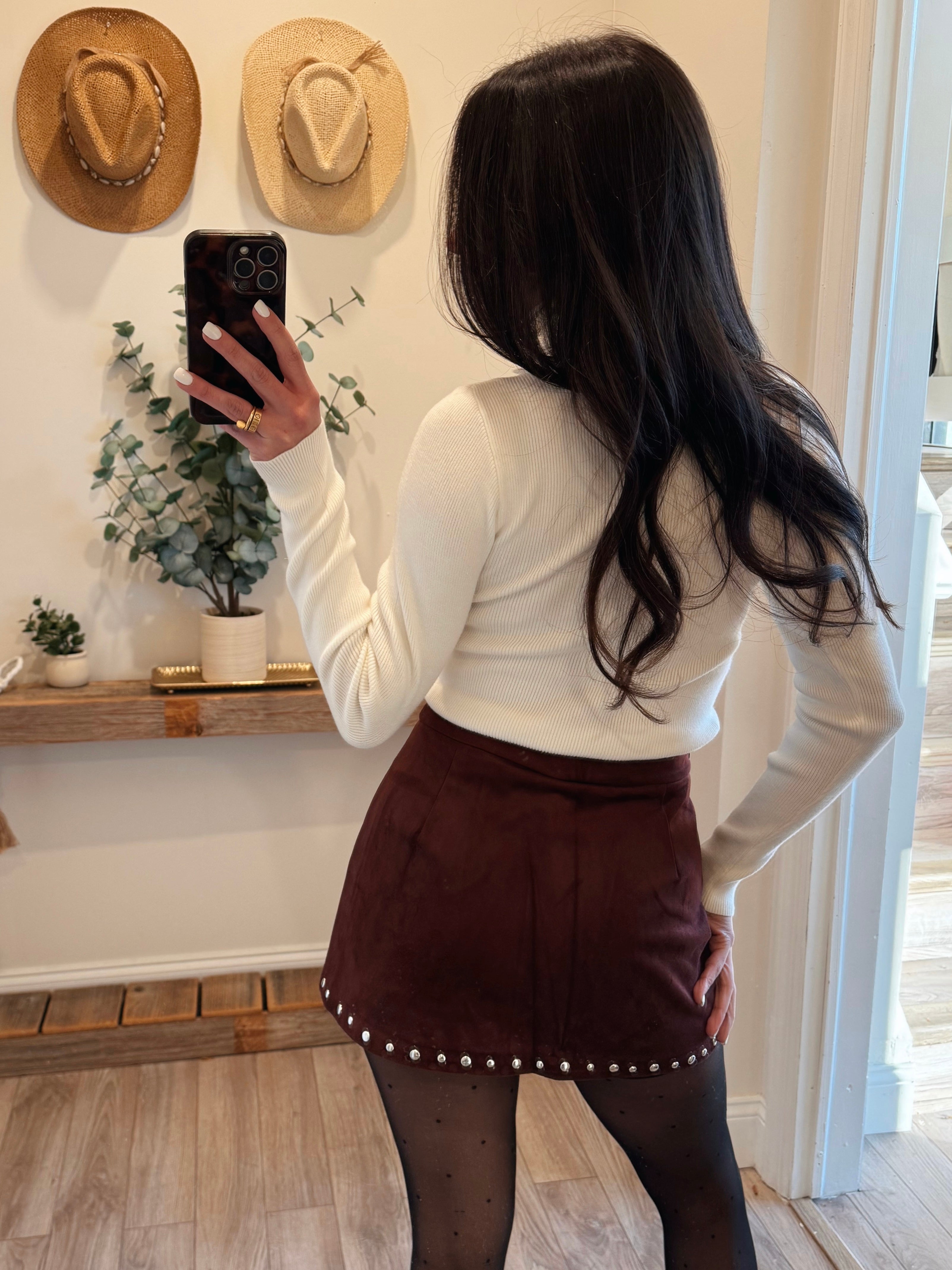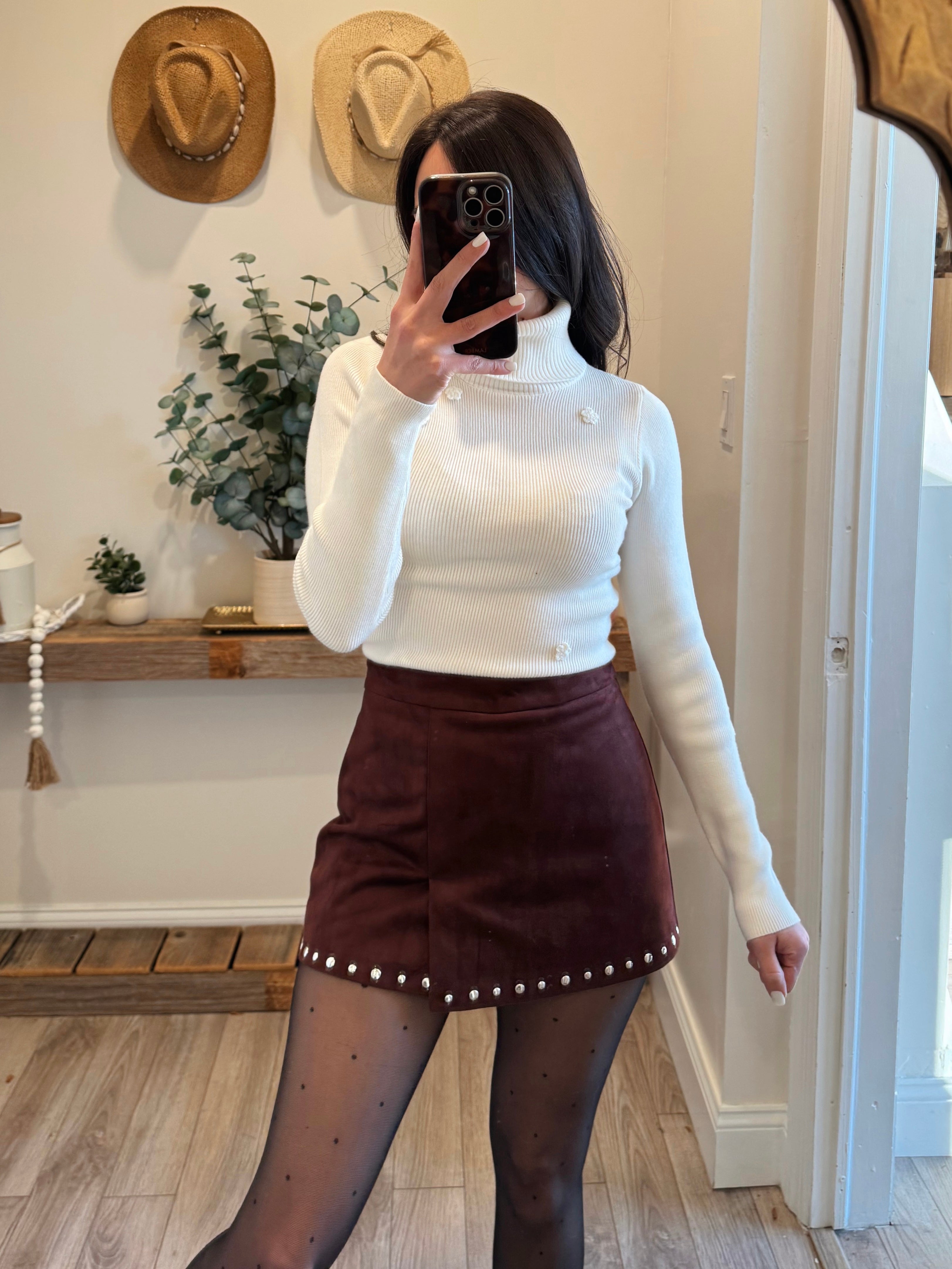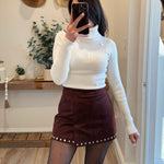Product Features: Suede Solid Color One-Side Slit Side Zipper Down Stud Detail Inside Shorts Plain Mini Skirt