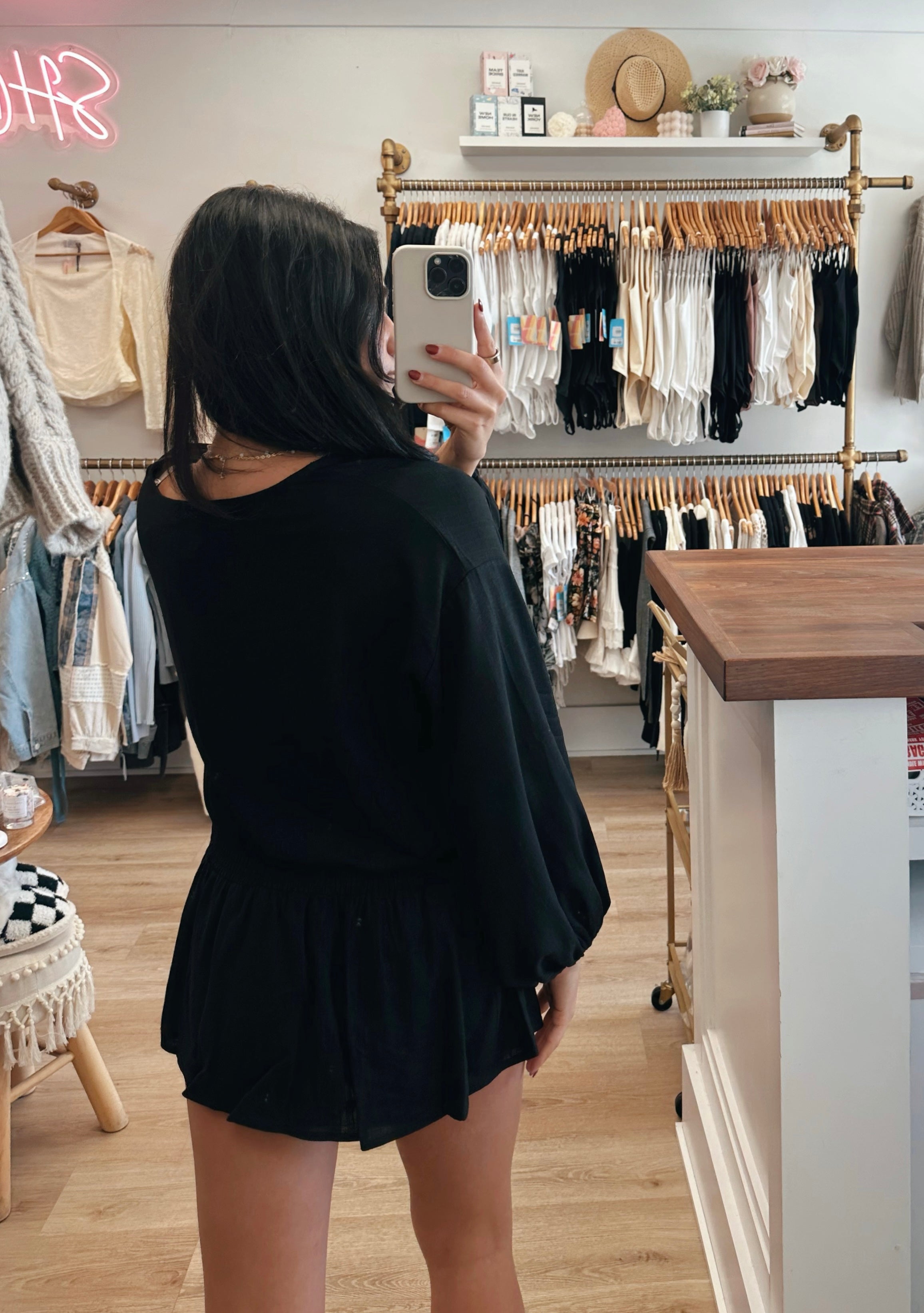 Black Linen Longsleeve Button and Smocked Waist Dress