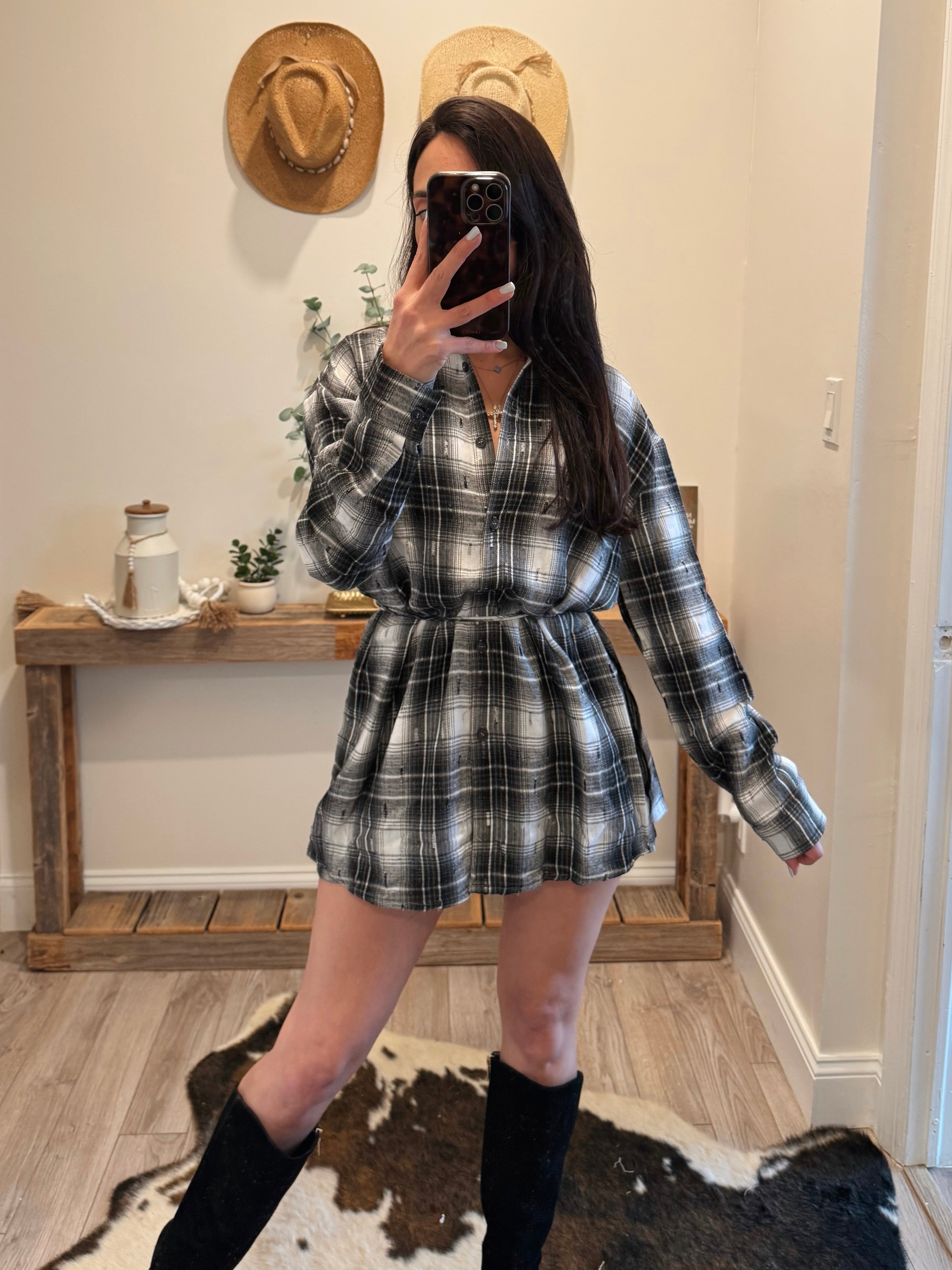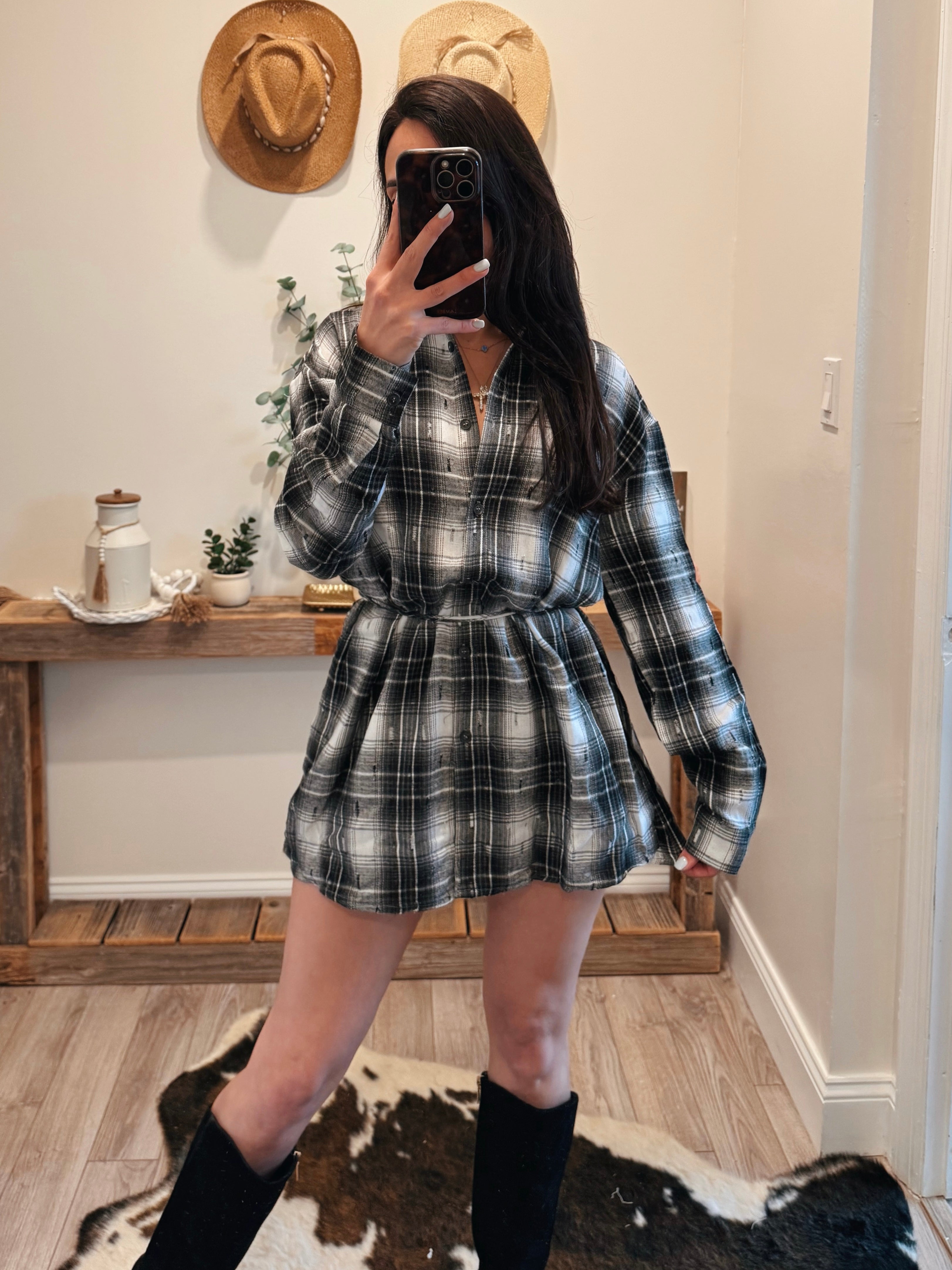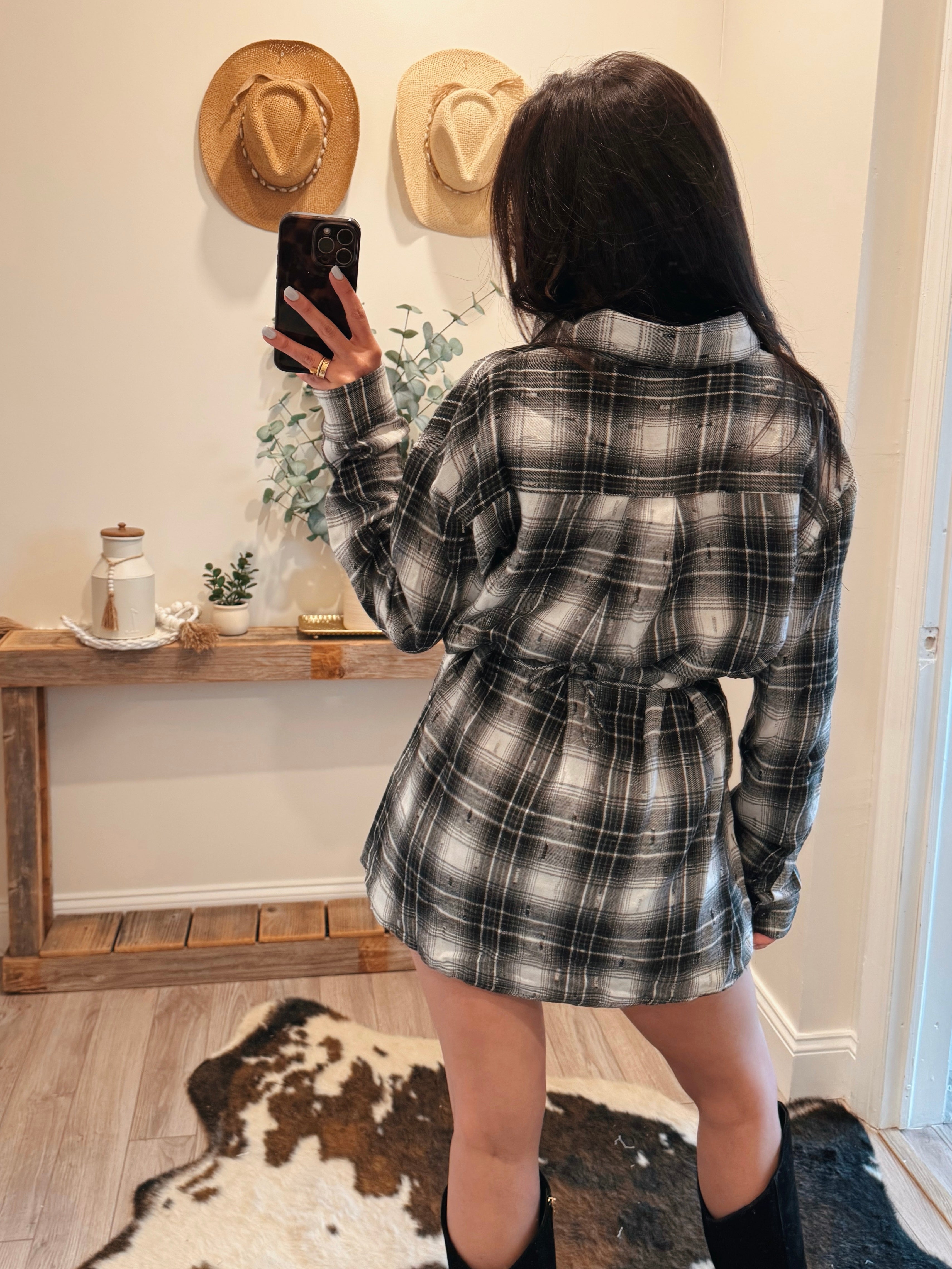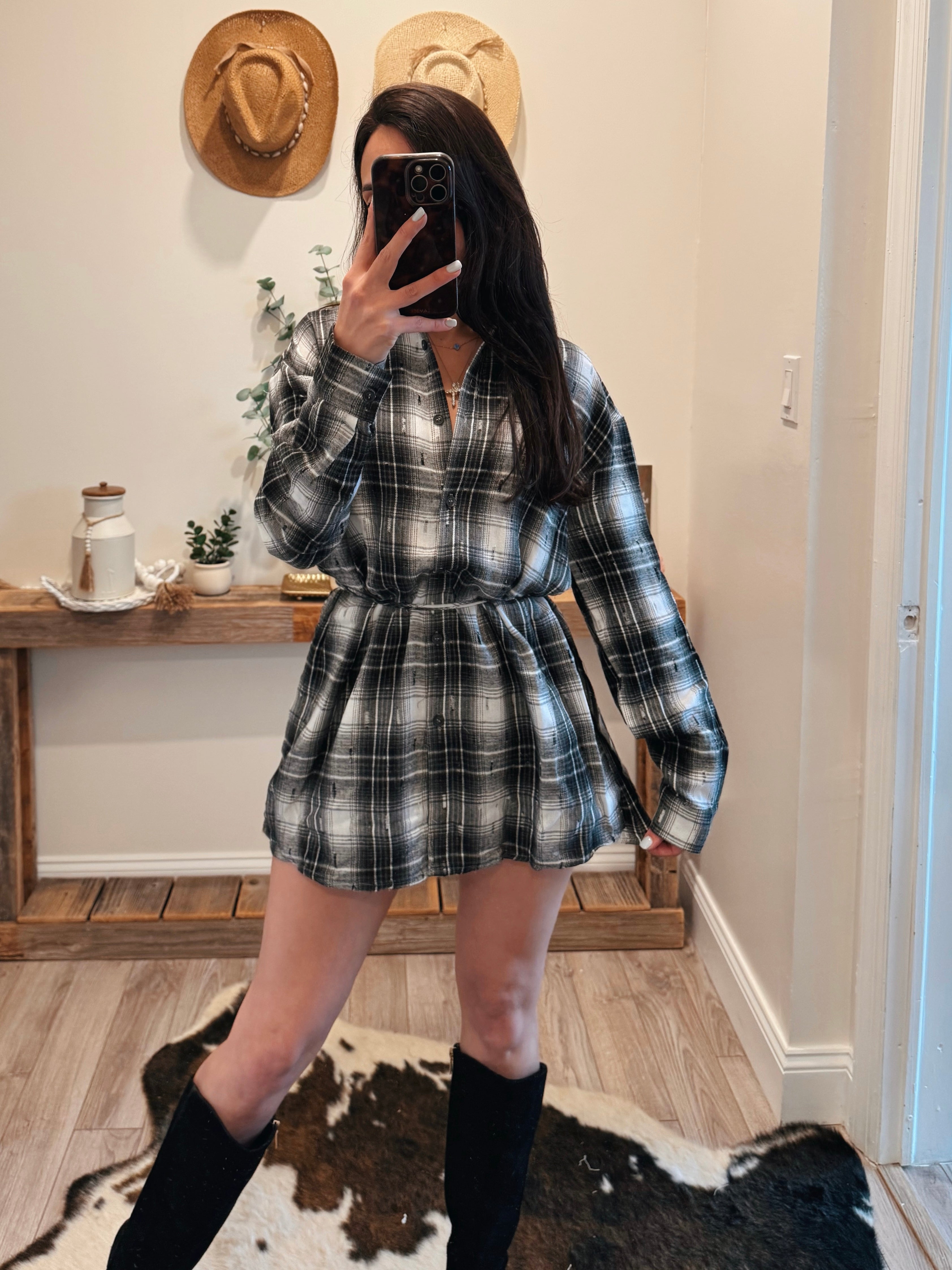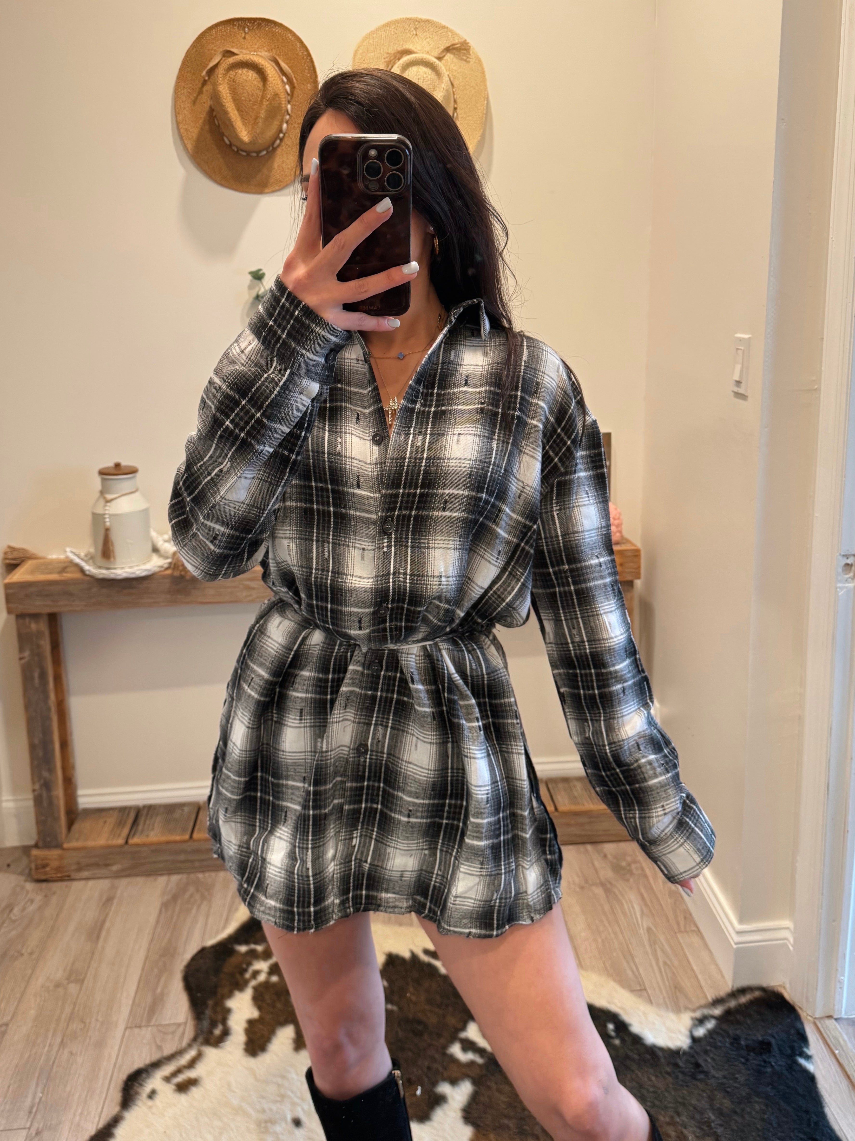 White/Black Plaid Flannel Belted Shirt Dress