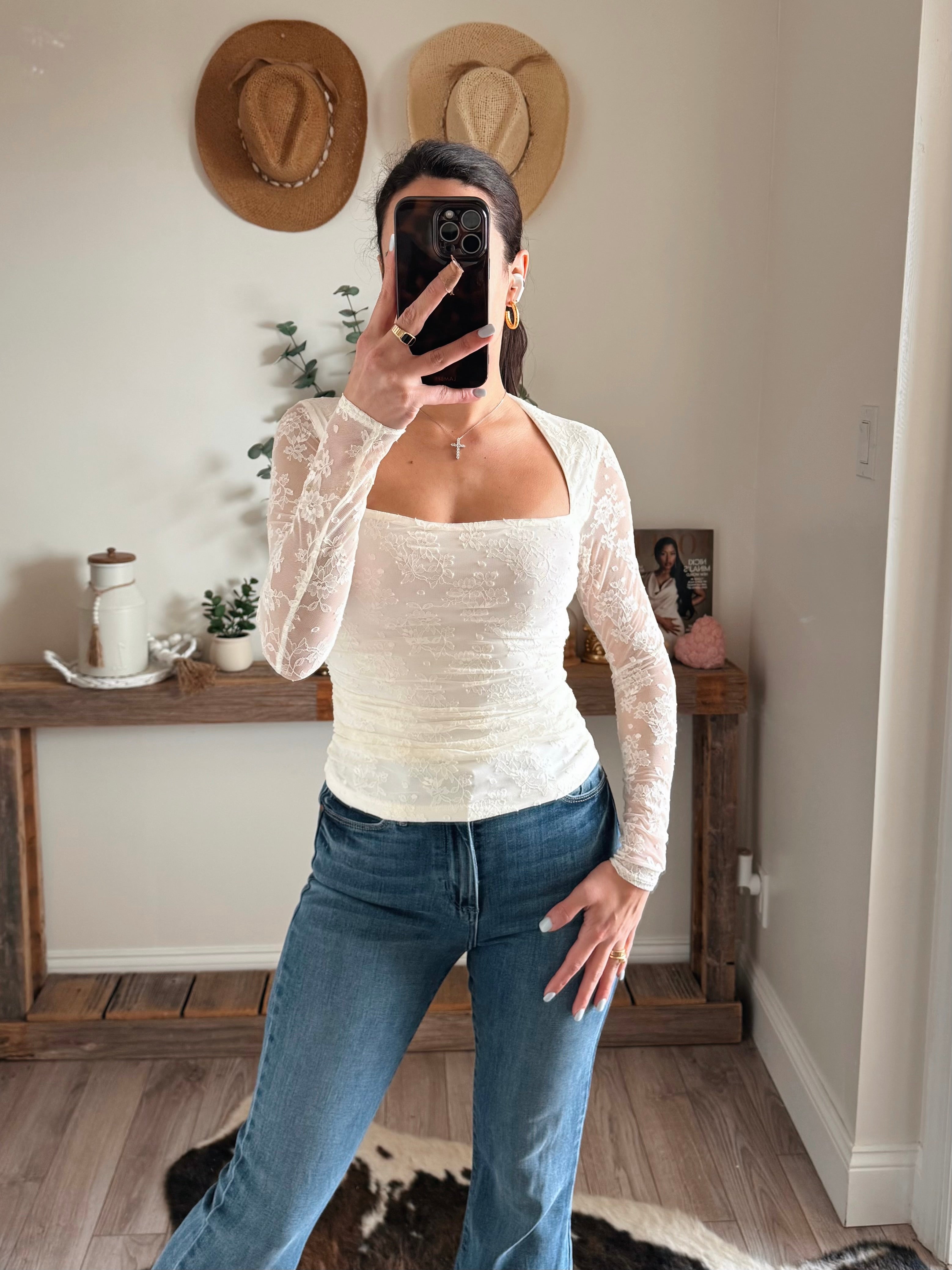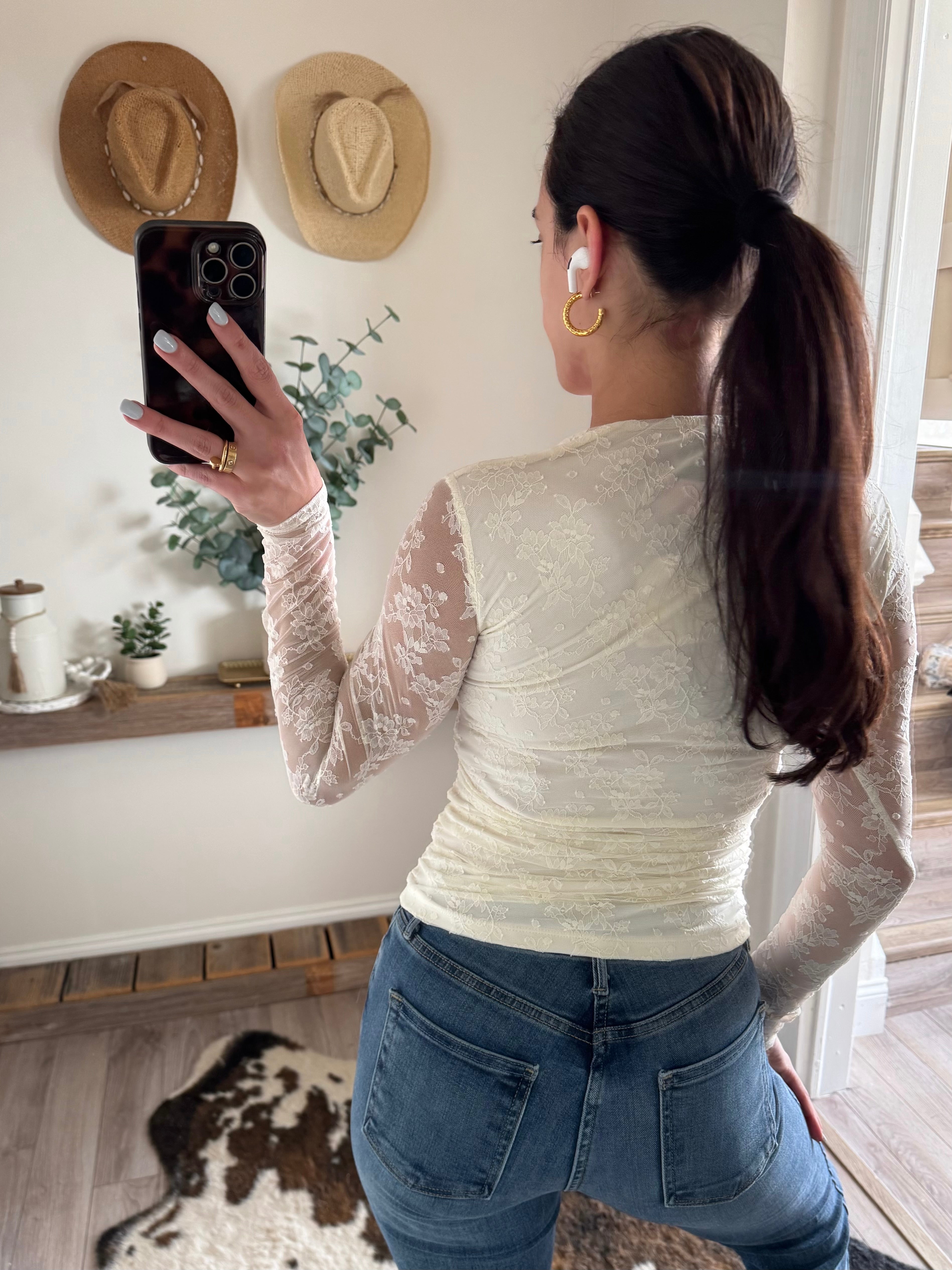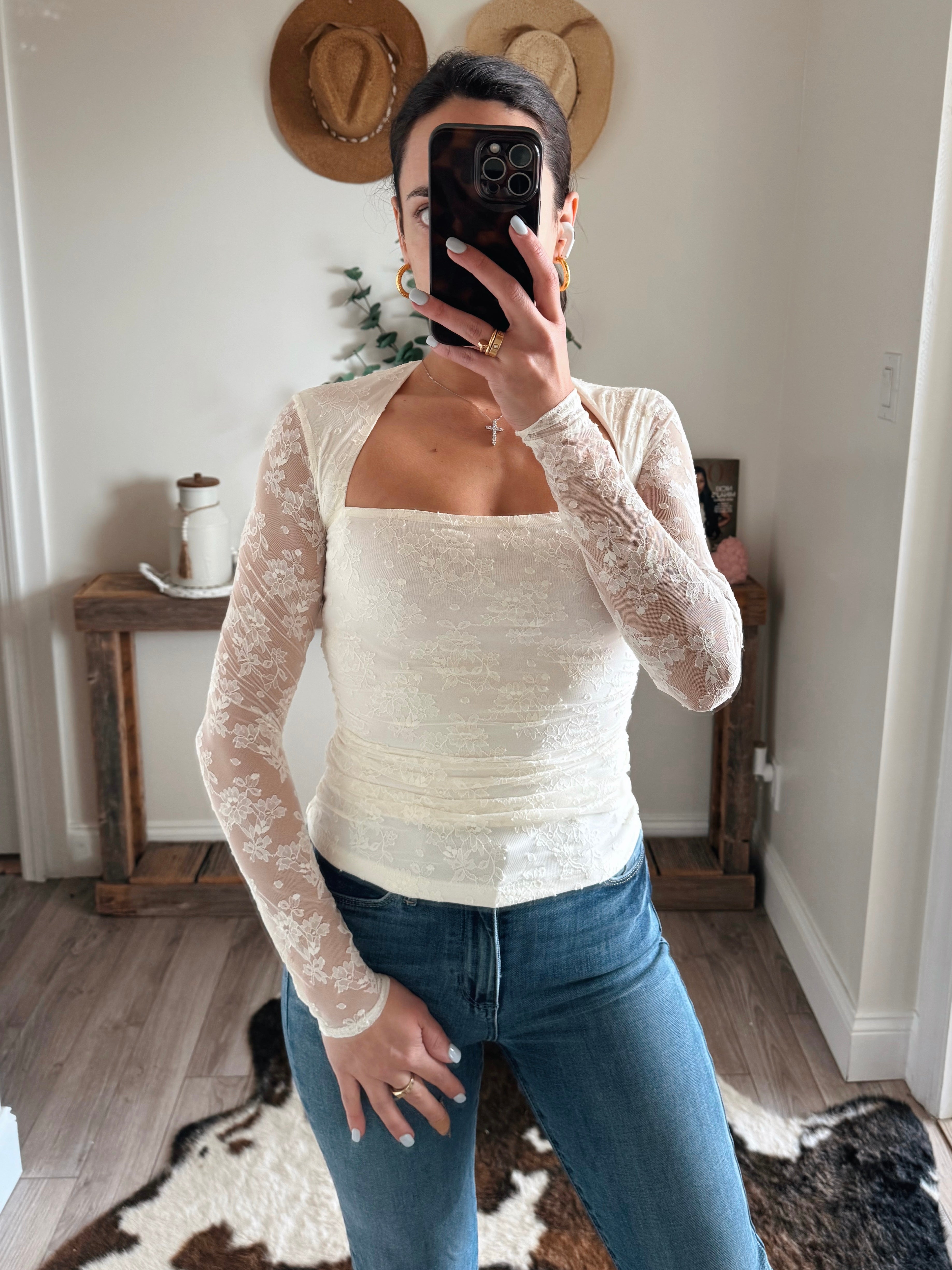 Ivory Annie Lace Ruched Long Sleeve Top