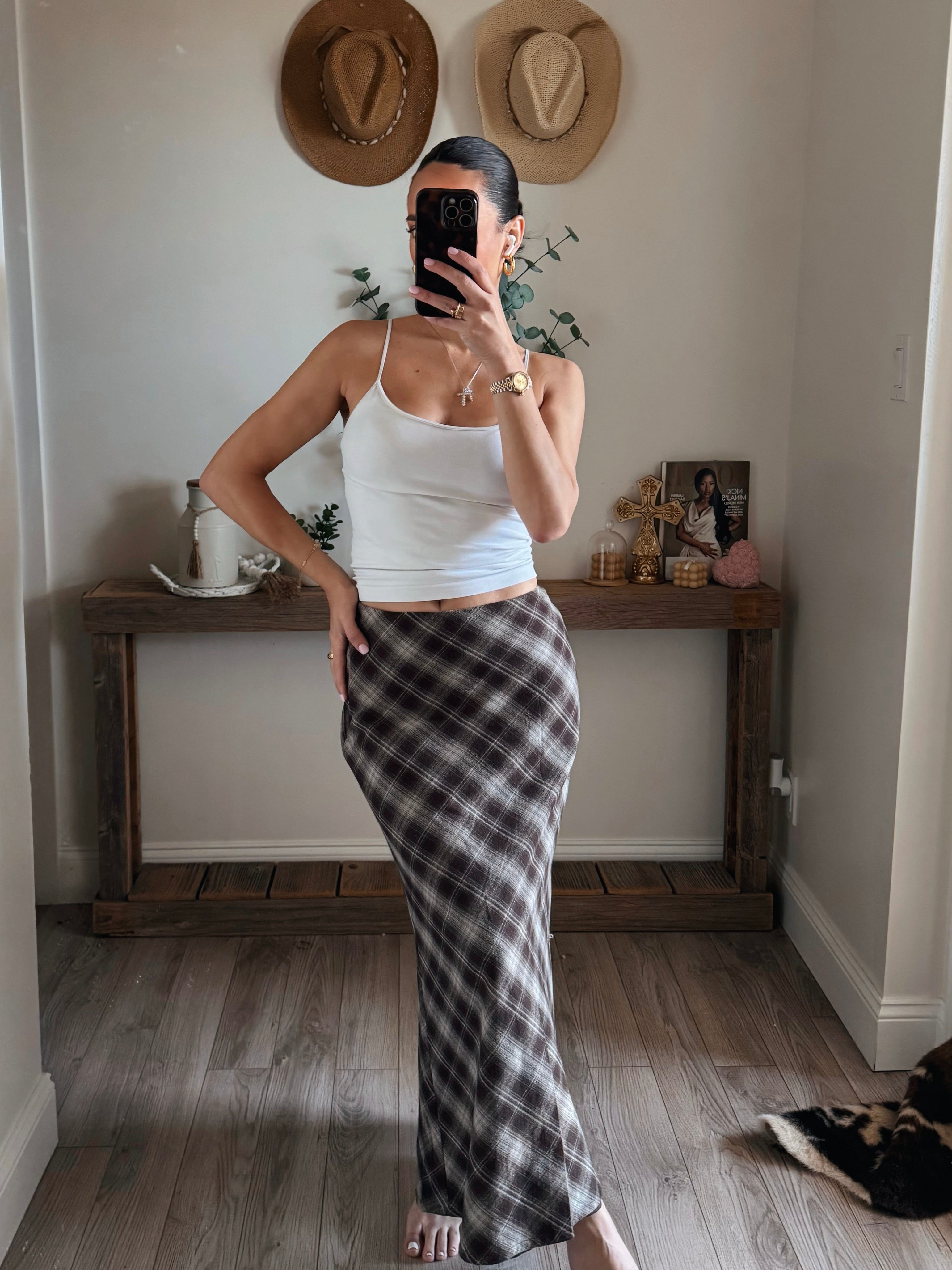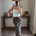 Product Features: Plaid Pattern - A-Line Silhouette - High Waist - Side Zipper Closure - Back Slit for Comfortable Movement