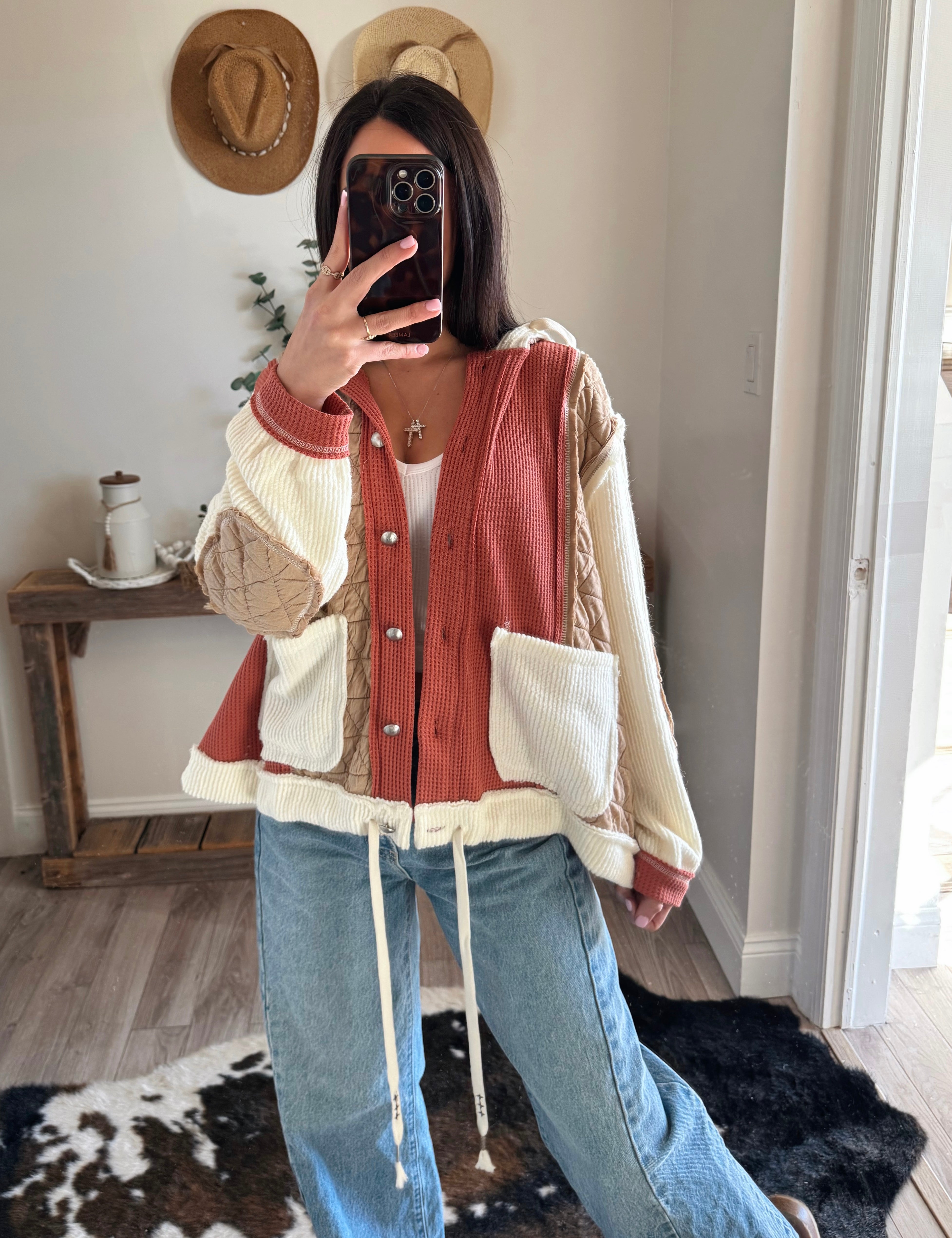 Latte/Brick Multi Fabric Hooded Bu Shacket