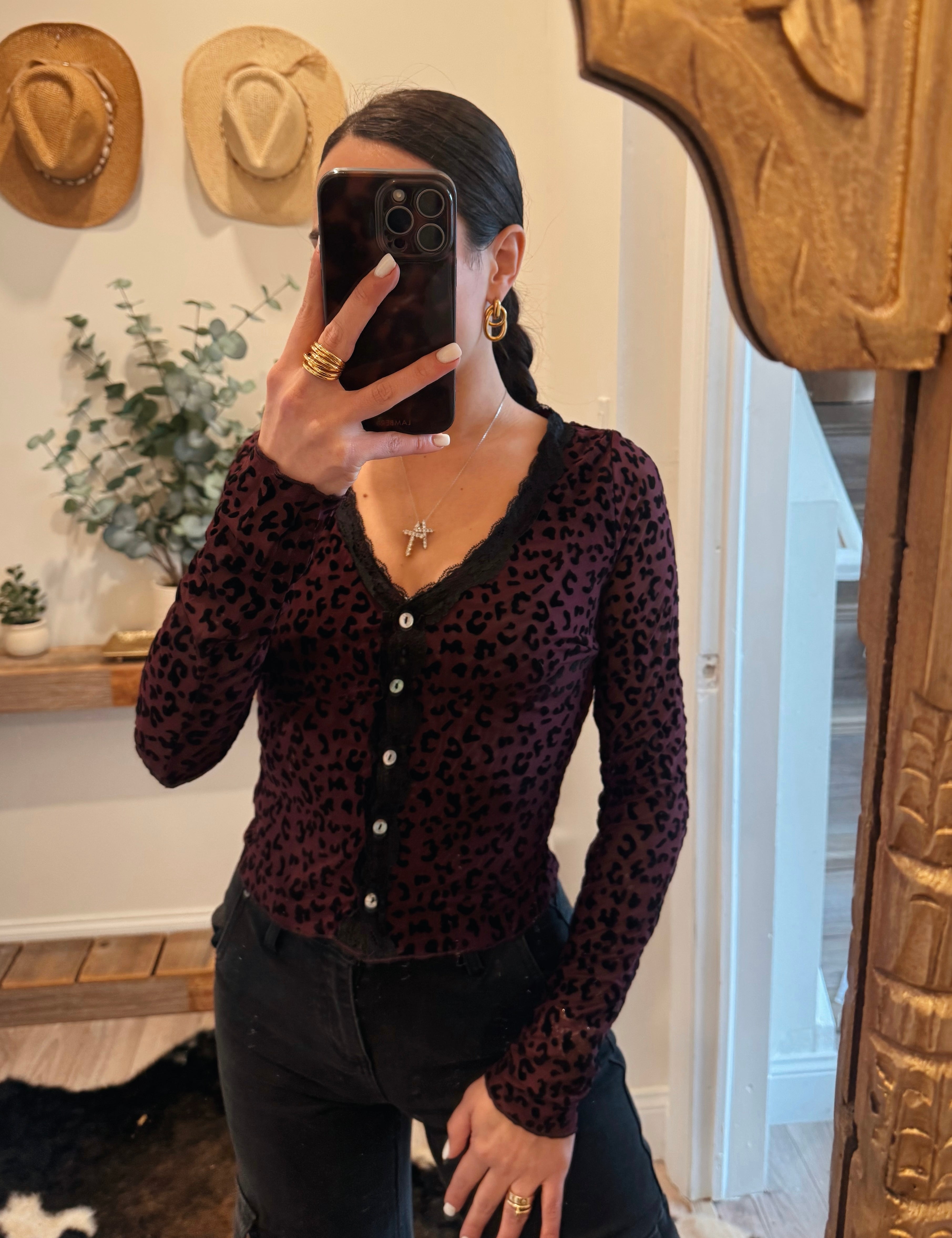 Burgundy Flocked Leopard Mesh Lace-Trim Button-Front Top