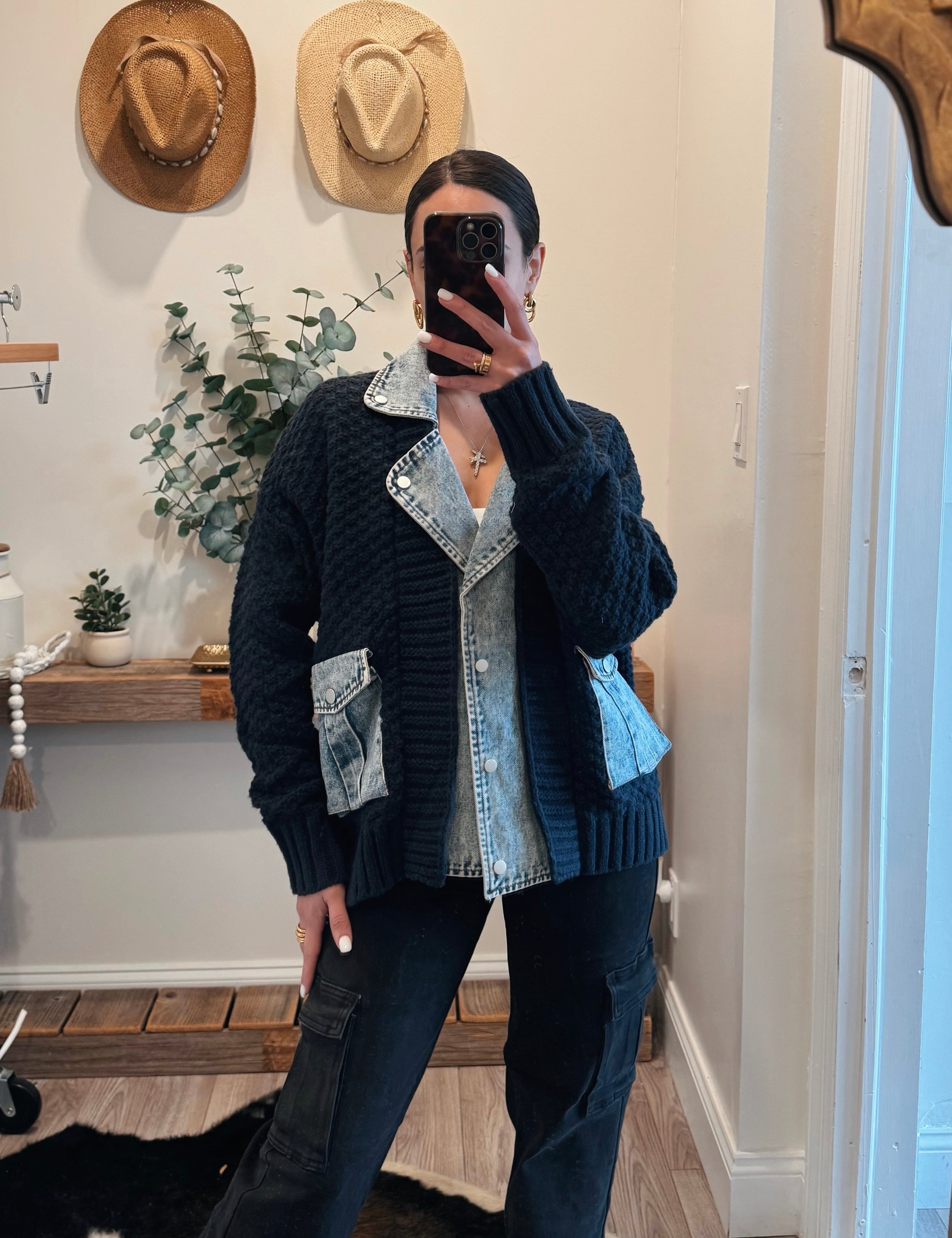Navy Denim Contrast Sweater Jacket with Front Pockets
