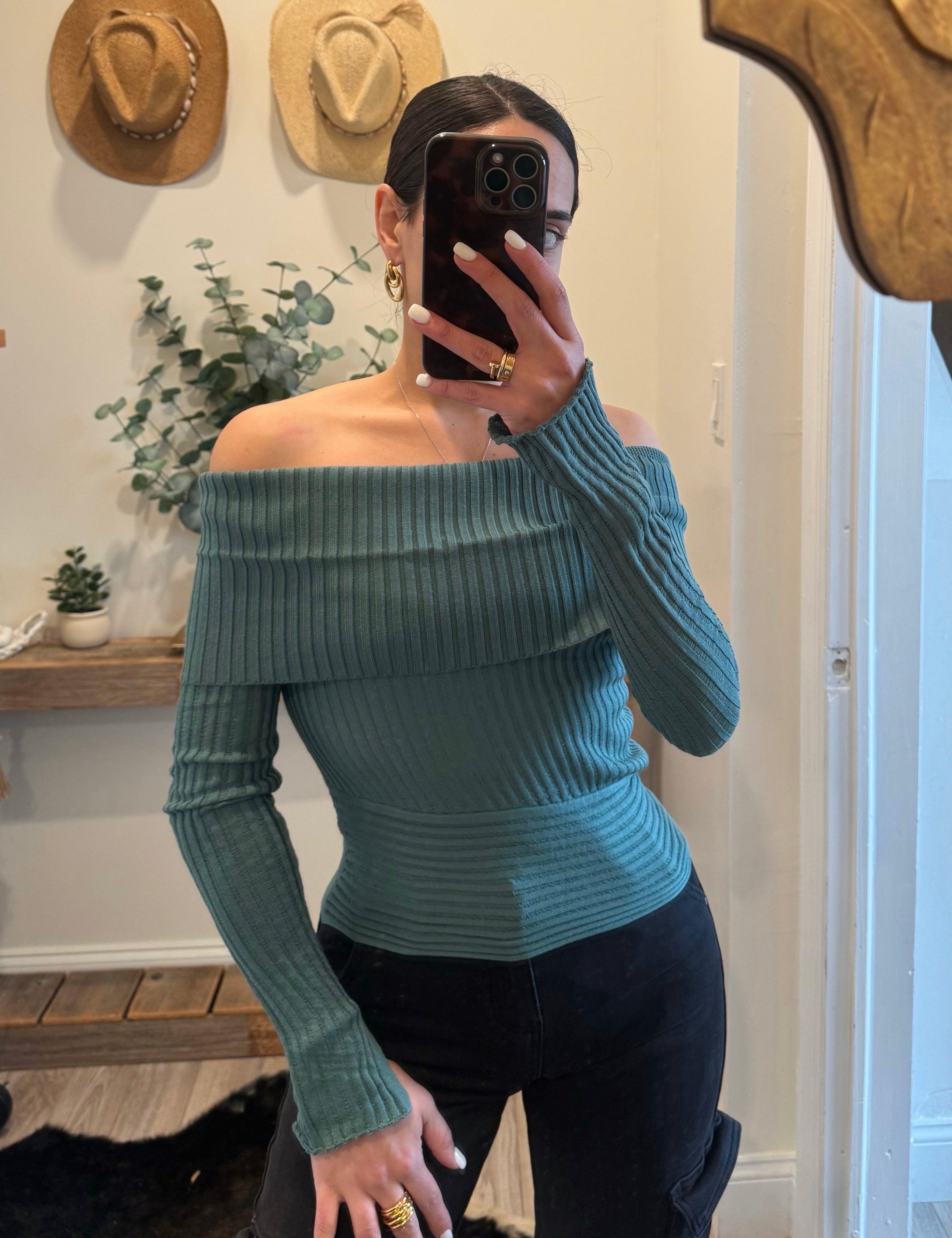 Pine Green Rib-Knit Off Shoulder Fold Top