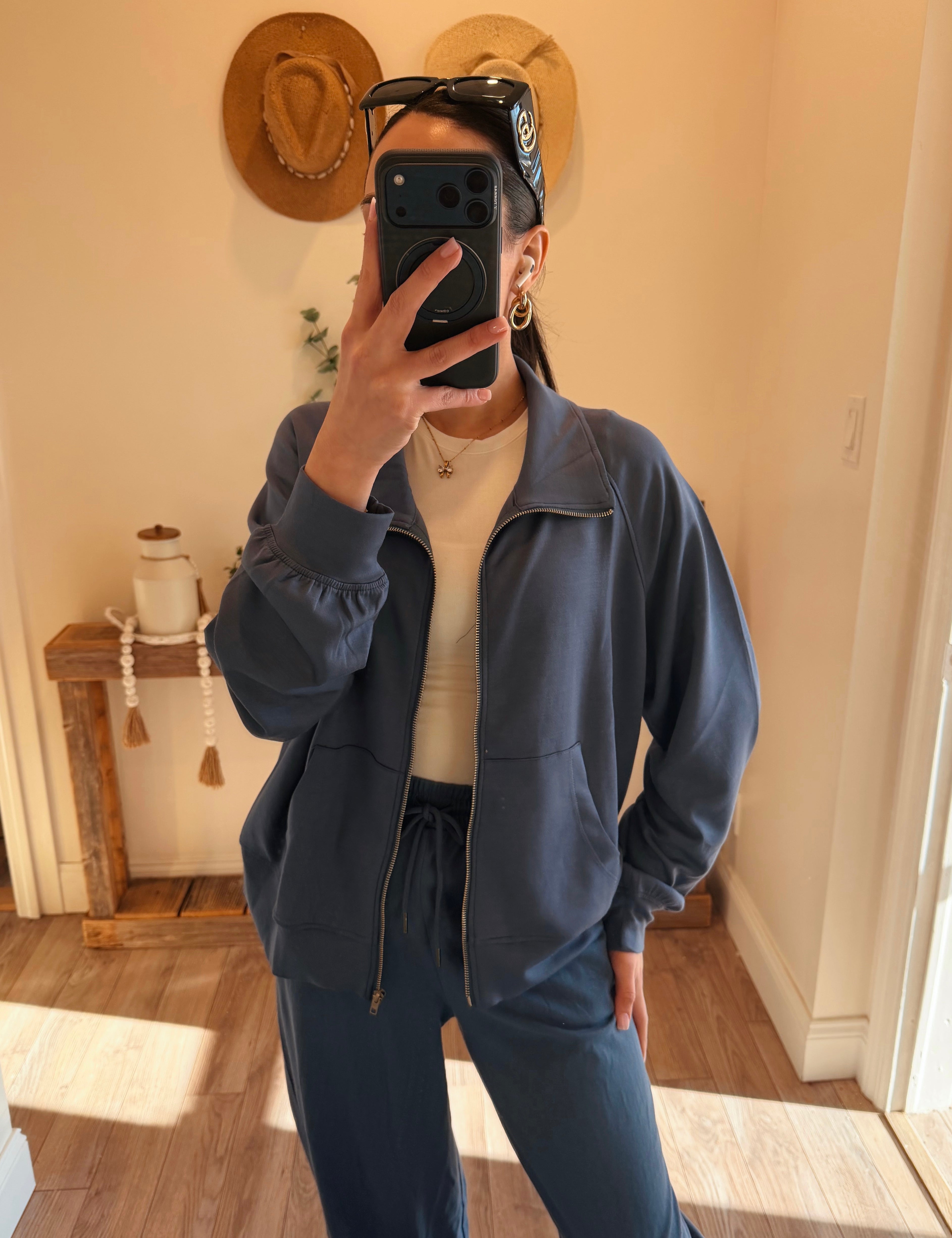 Dusty Navy Double Knit High Neck Long Sleeve Zippered Jacket