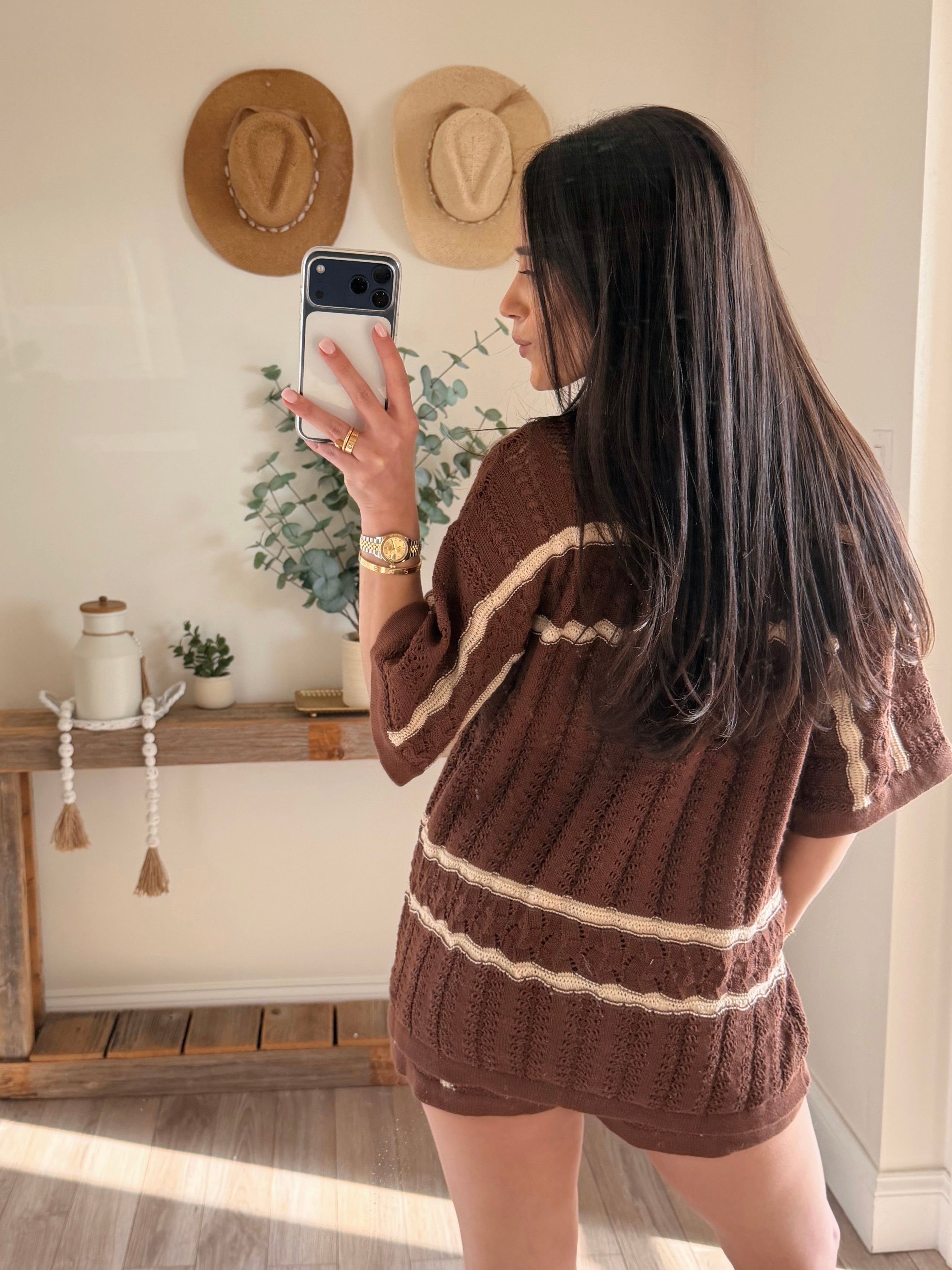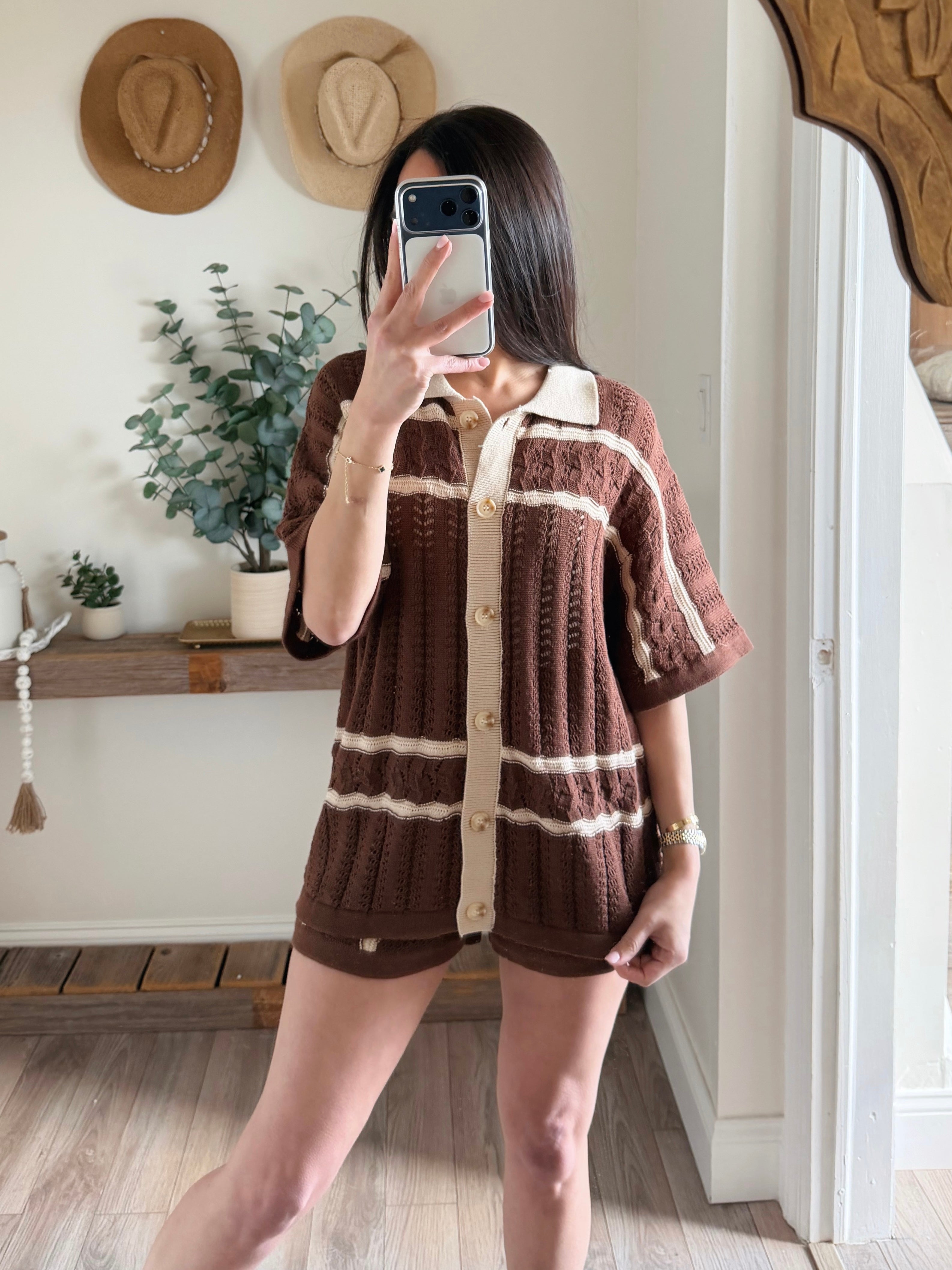 Product Features: Contrasting pointelle patterns with alternating stripes. Collared neckline. Button-front closure. Short kimono sleeves. Unlined. Relaxed fit.