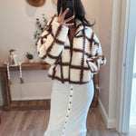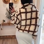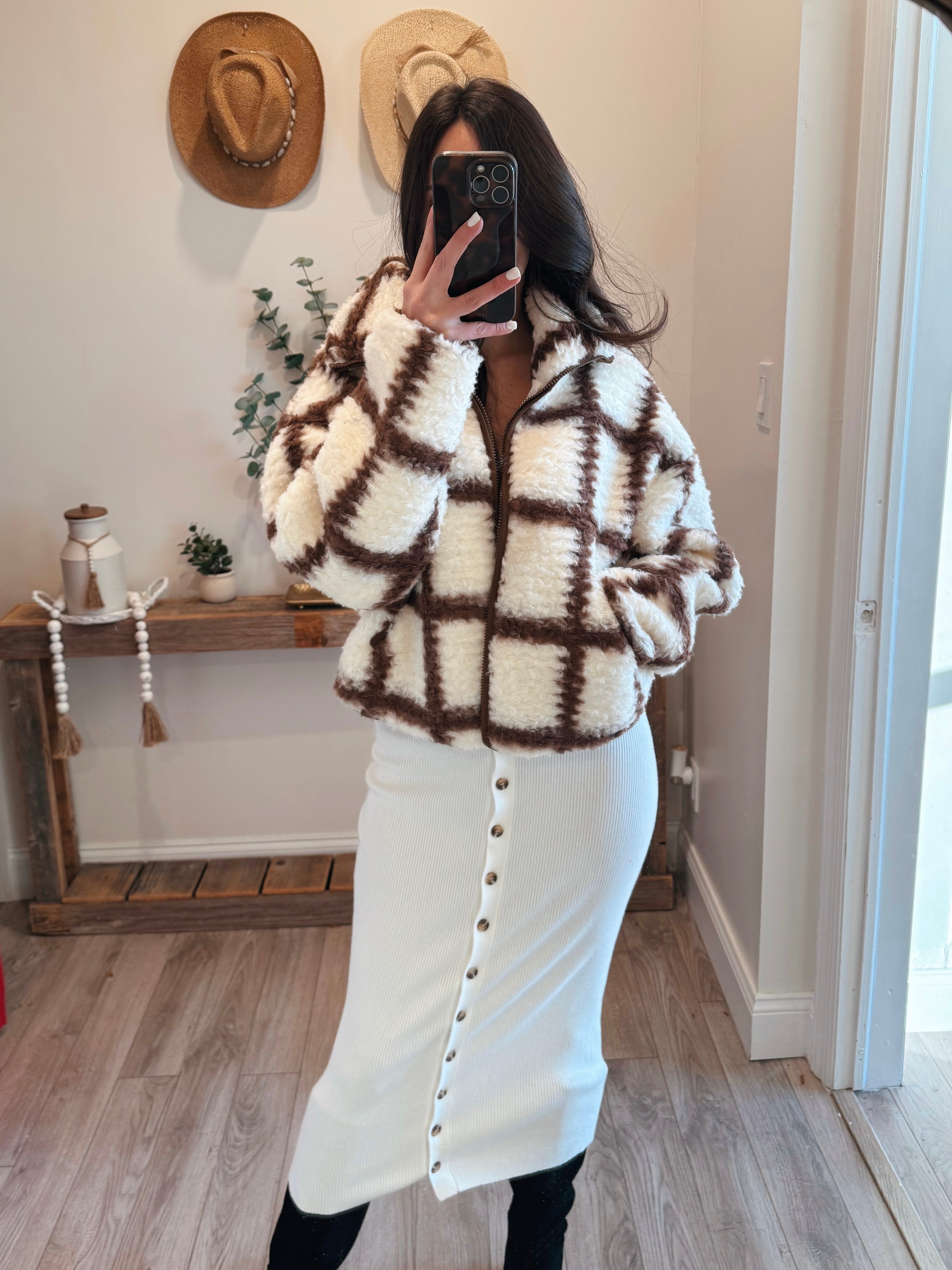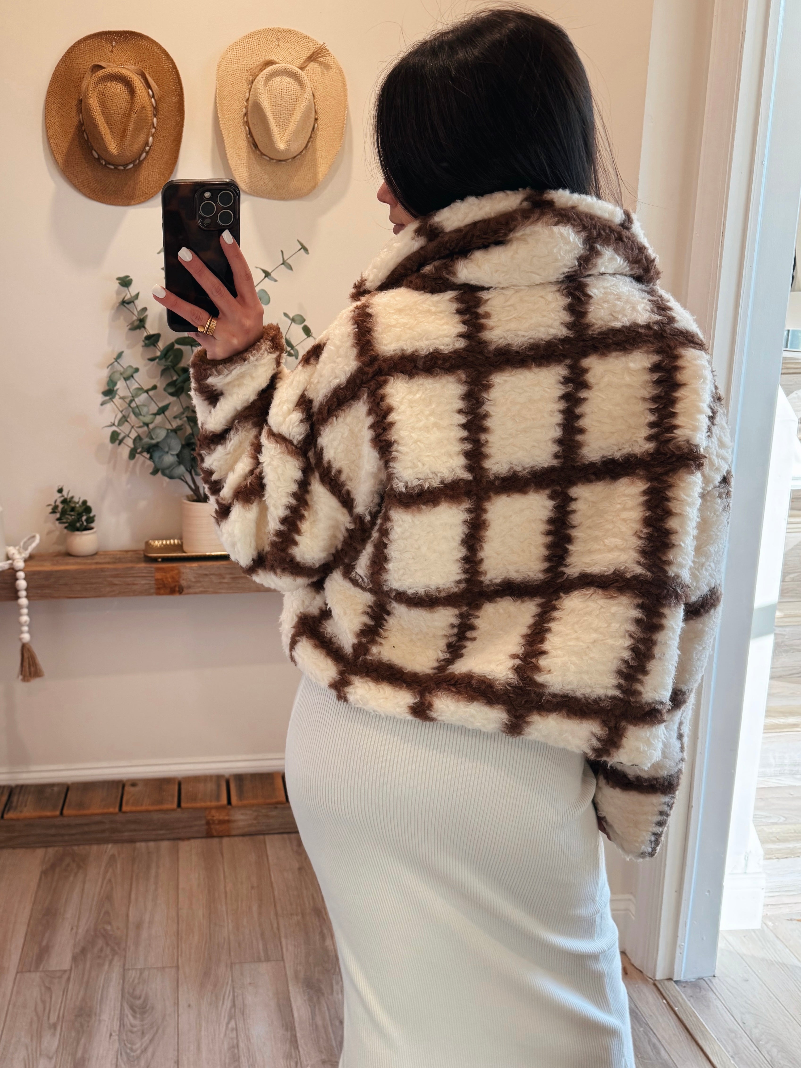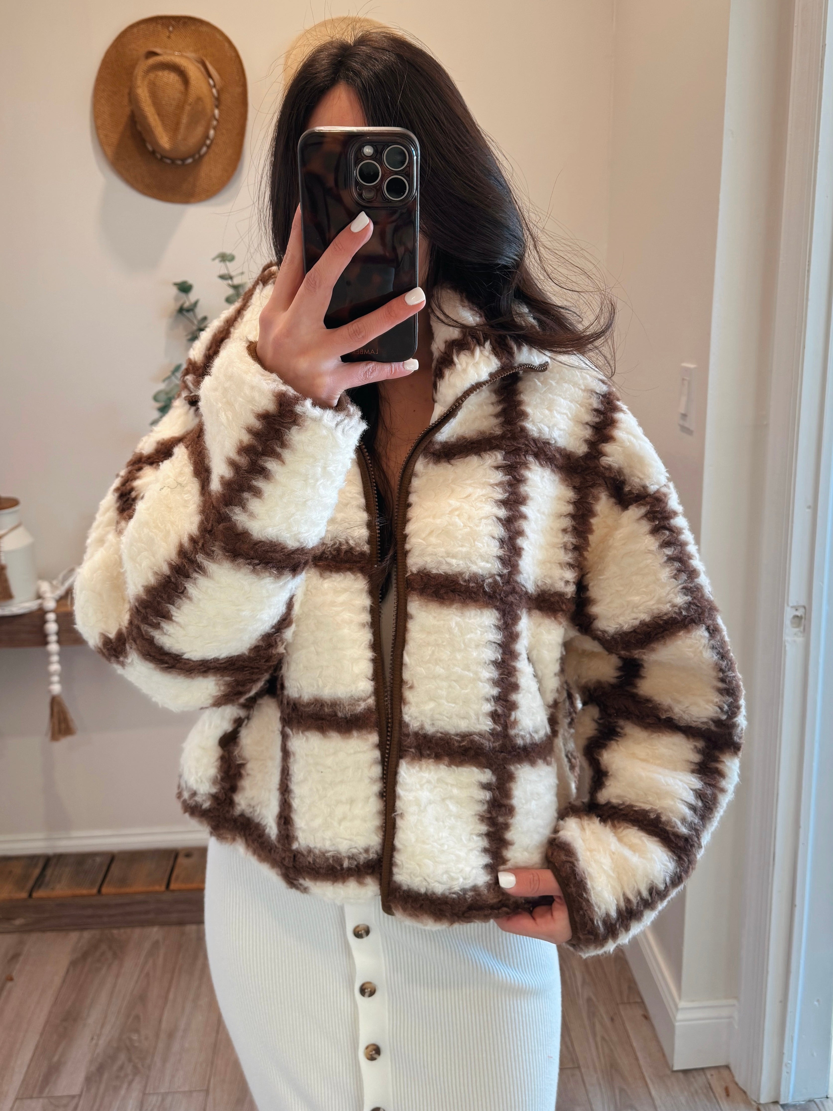 A check-print fleece jacket with the following features: High collar. Zip-up front closure. Chest pocket. Side pockets. Long sleeves. Drop shoulder. Full lining. Relaxed fit.