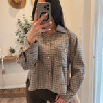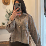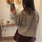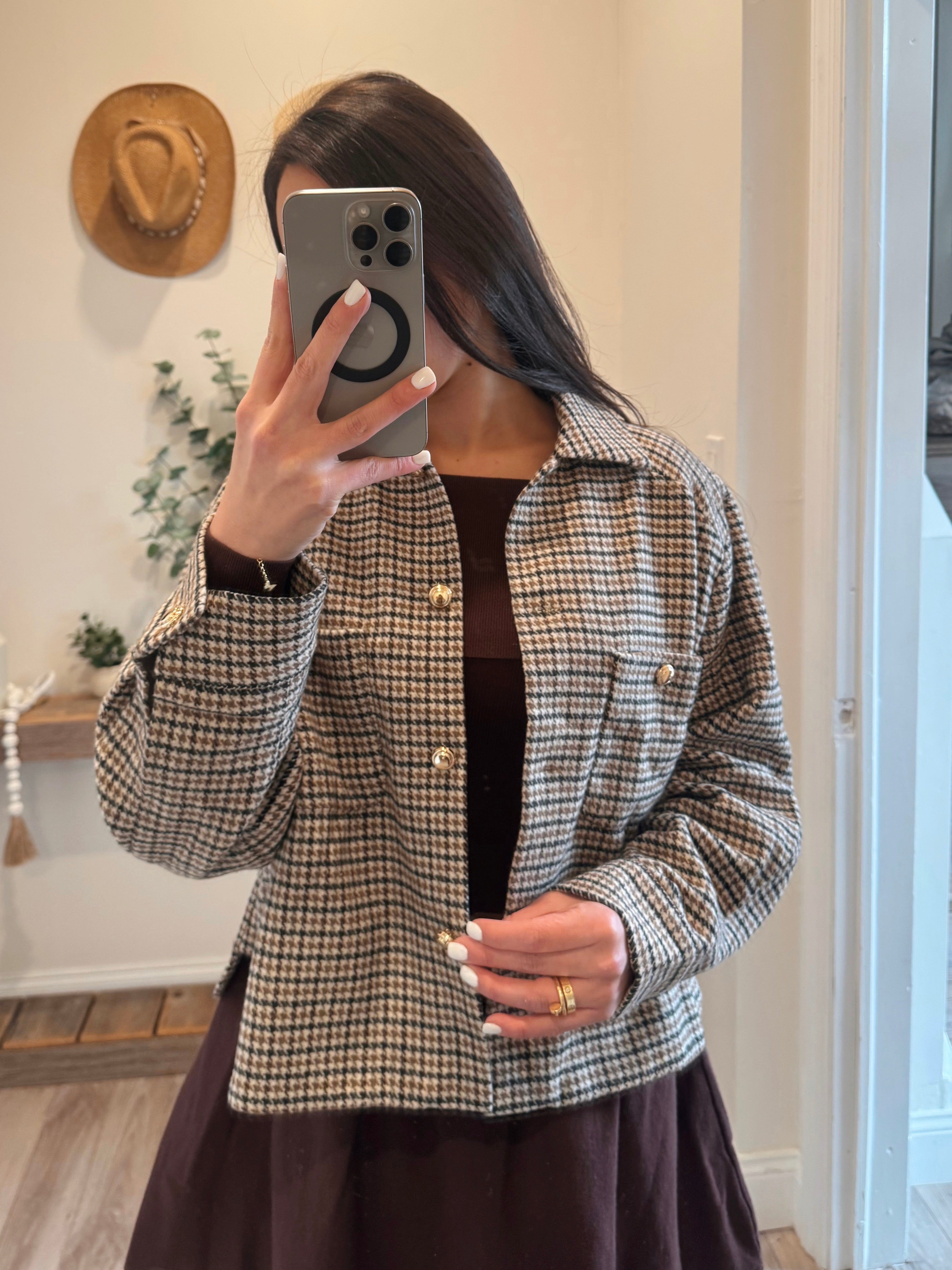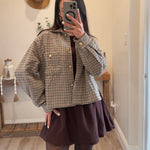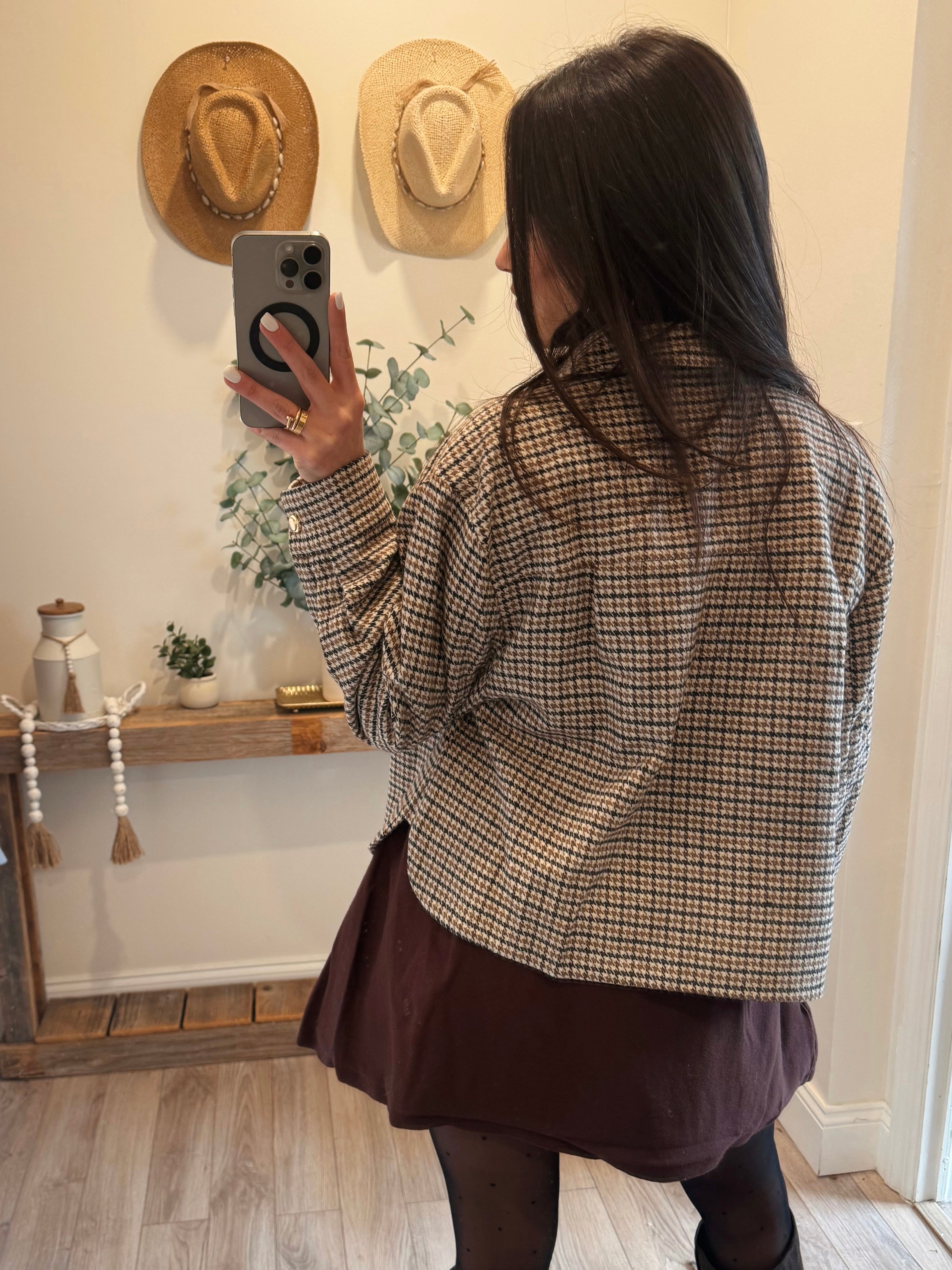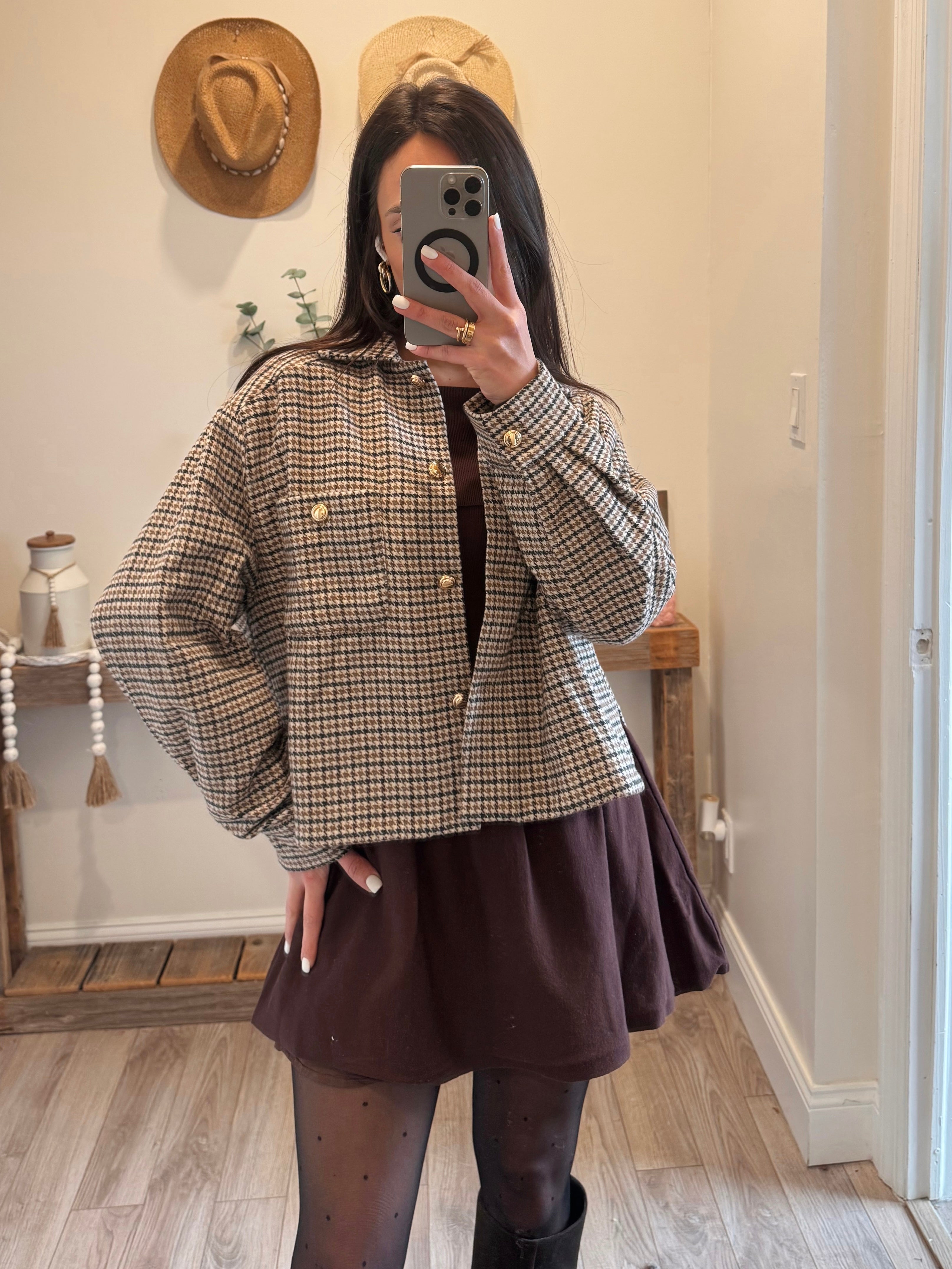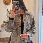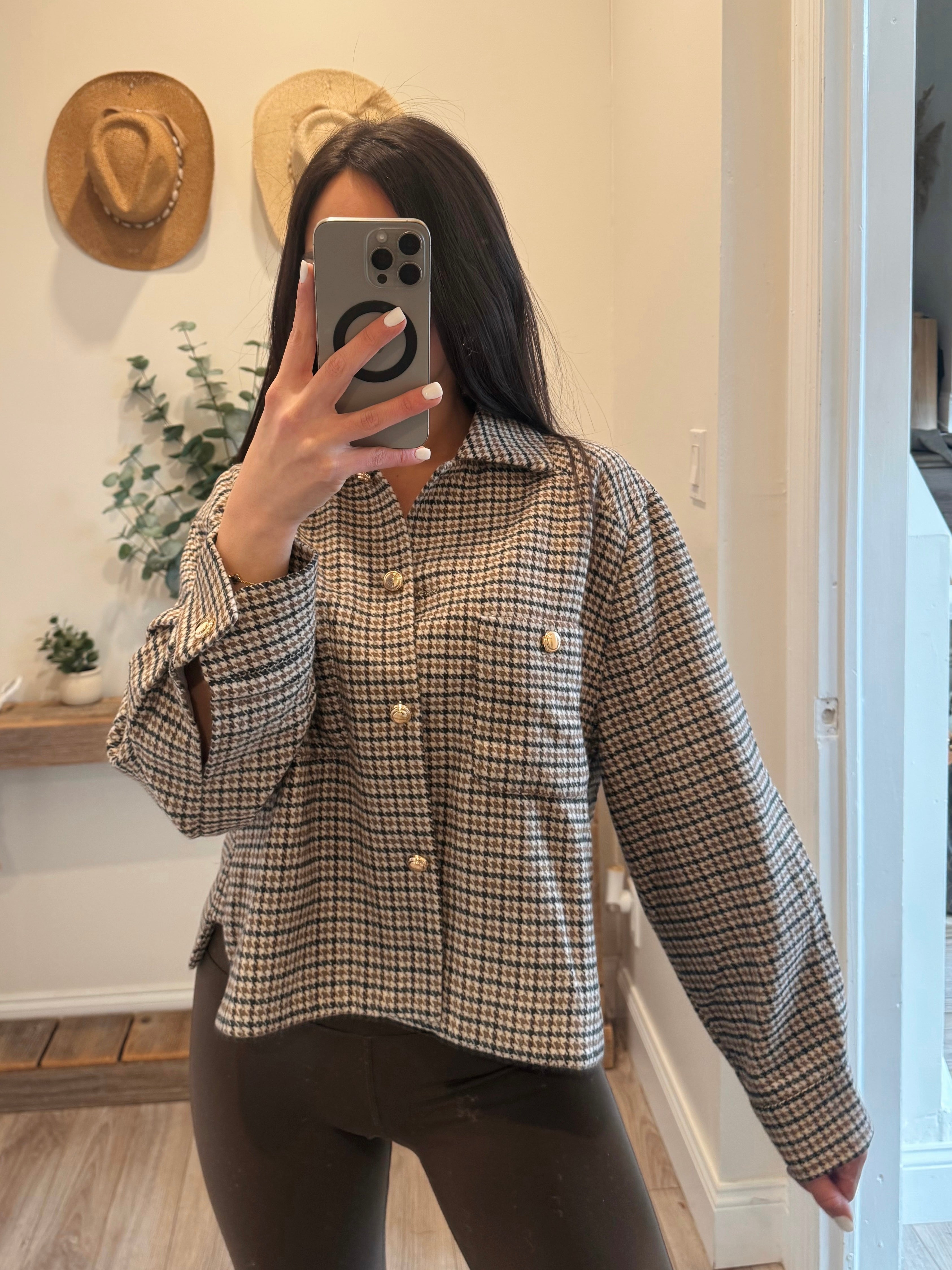 Cropped overshirt jacket crafted from soft textured houndstooth fabric. Features front flap pockets, button down closure, and relaxed dropped shoulders.
