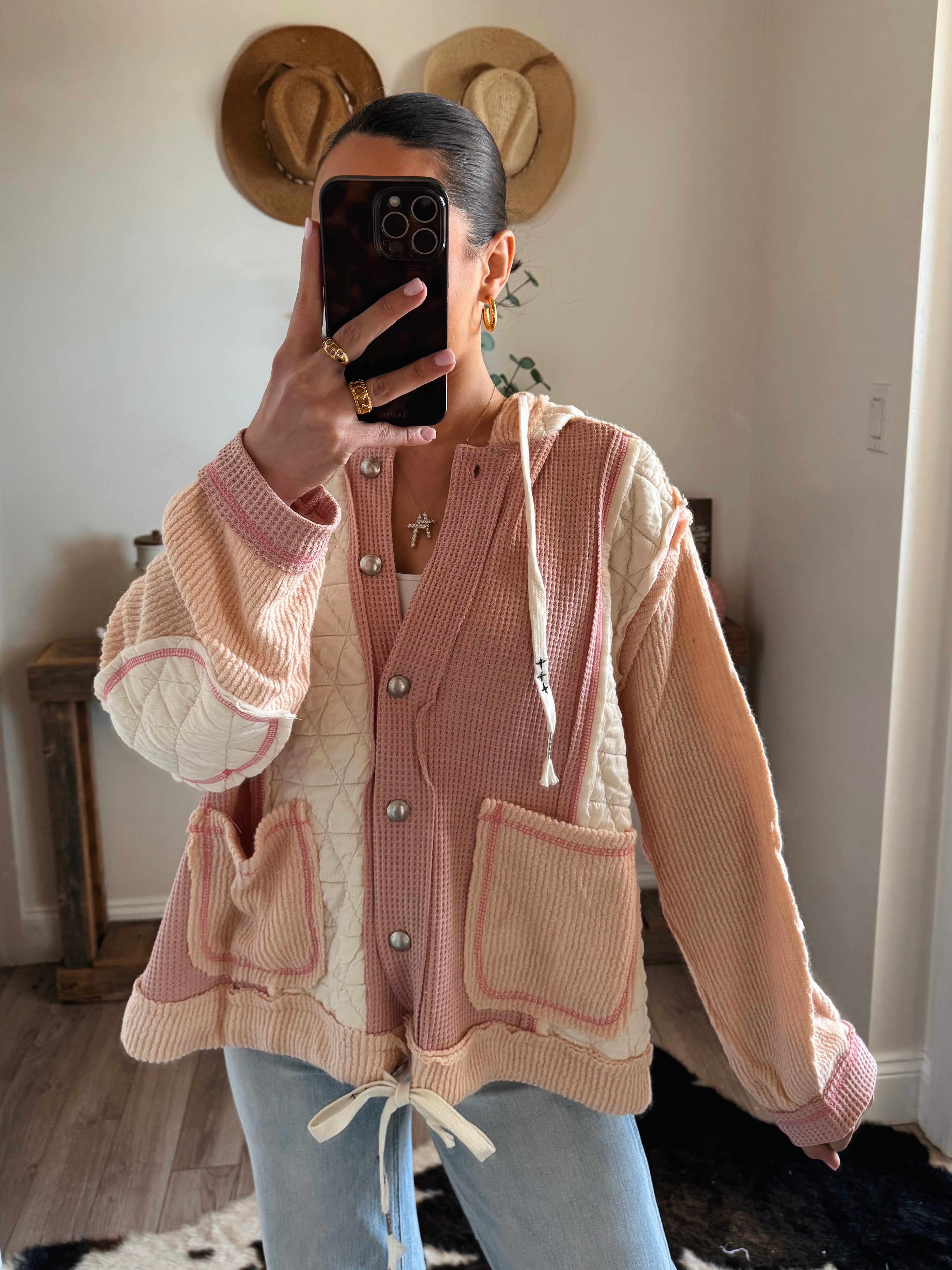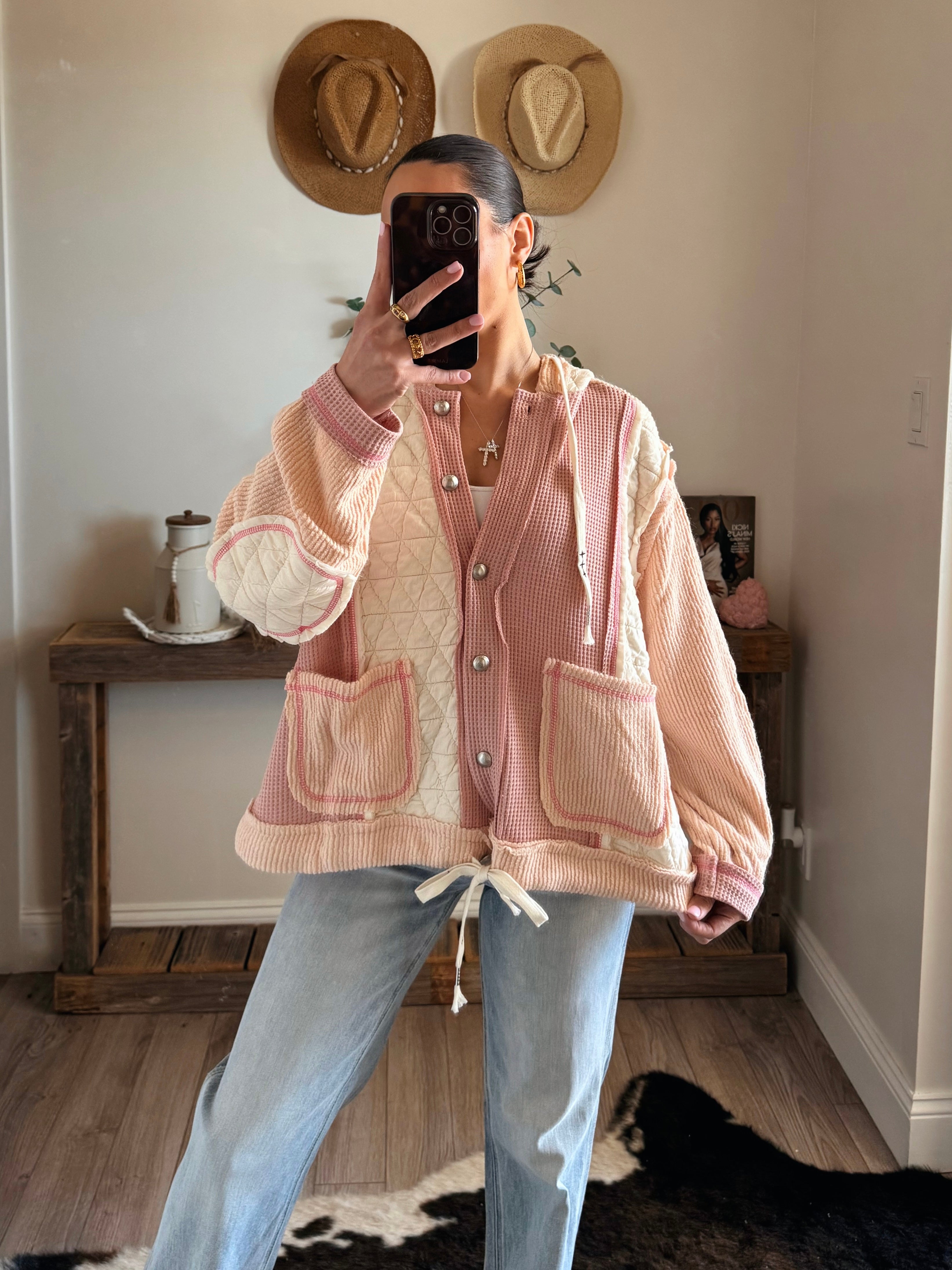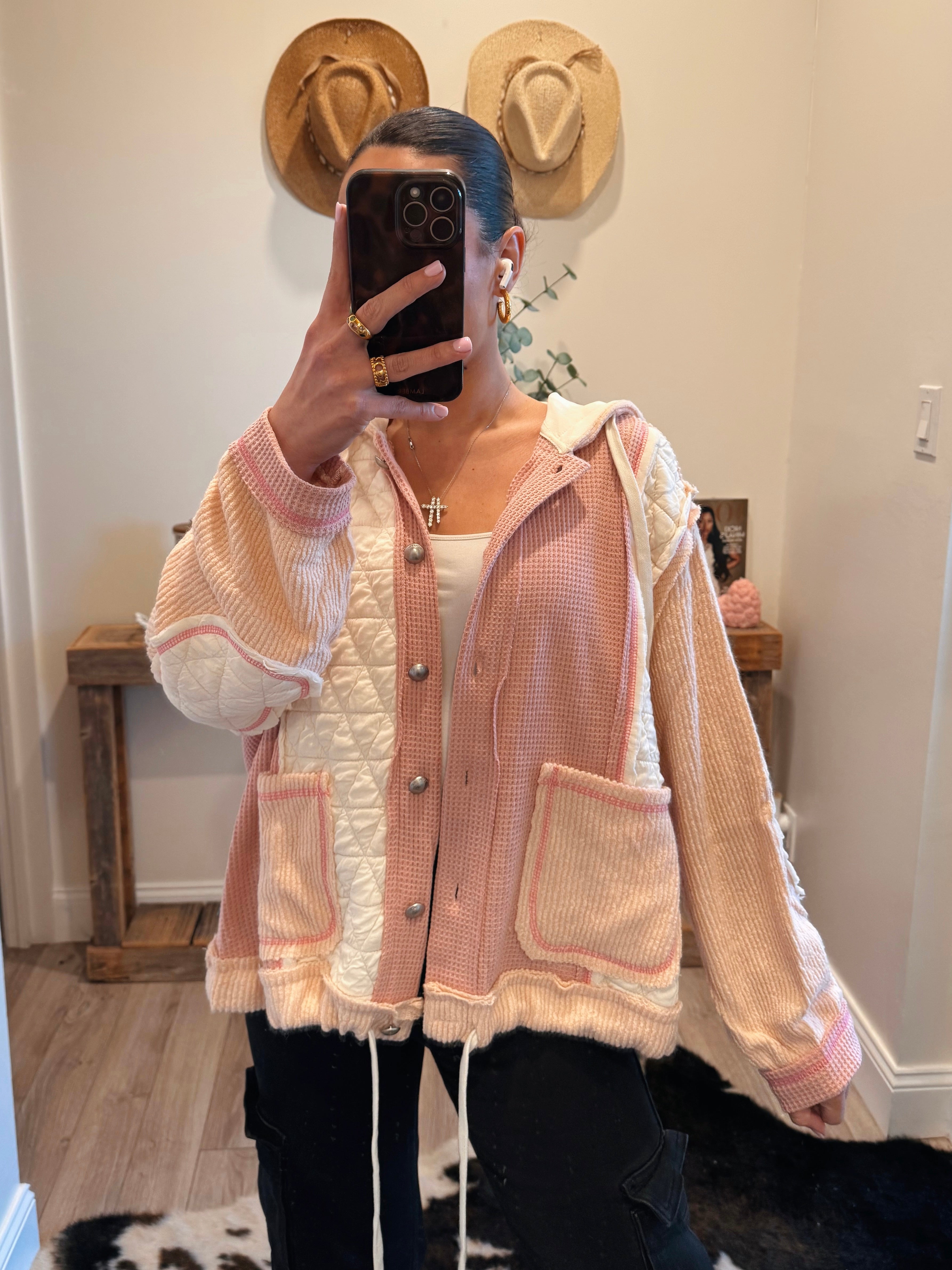 Rose/Pink Multi Fabric Hooded Bu Shacket