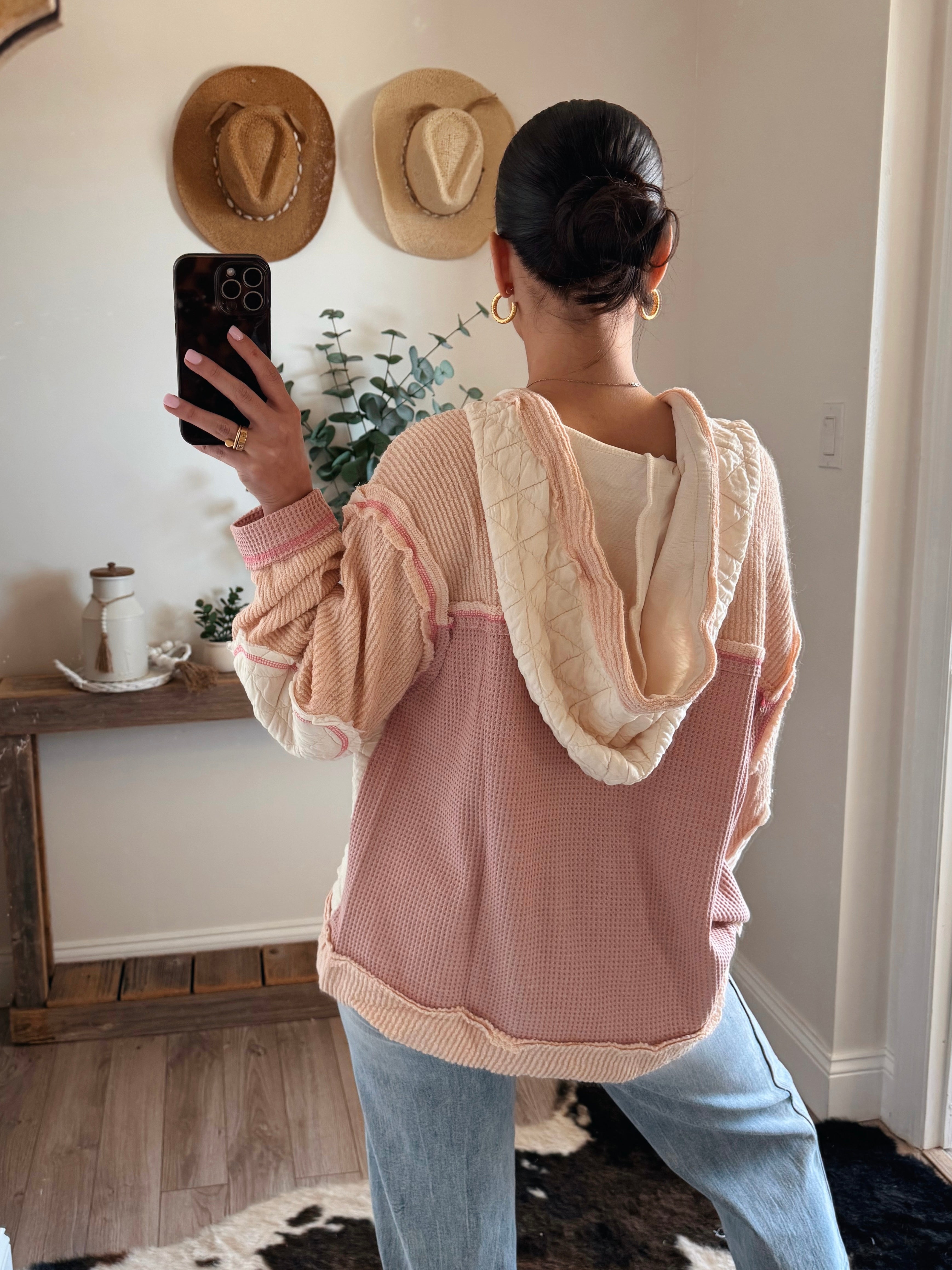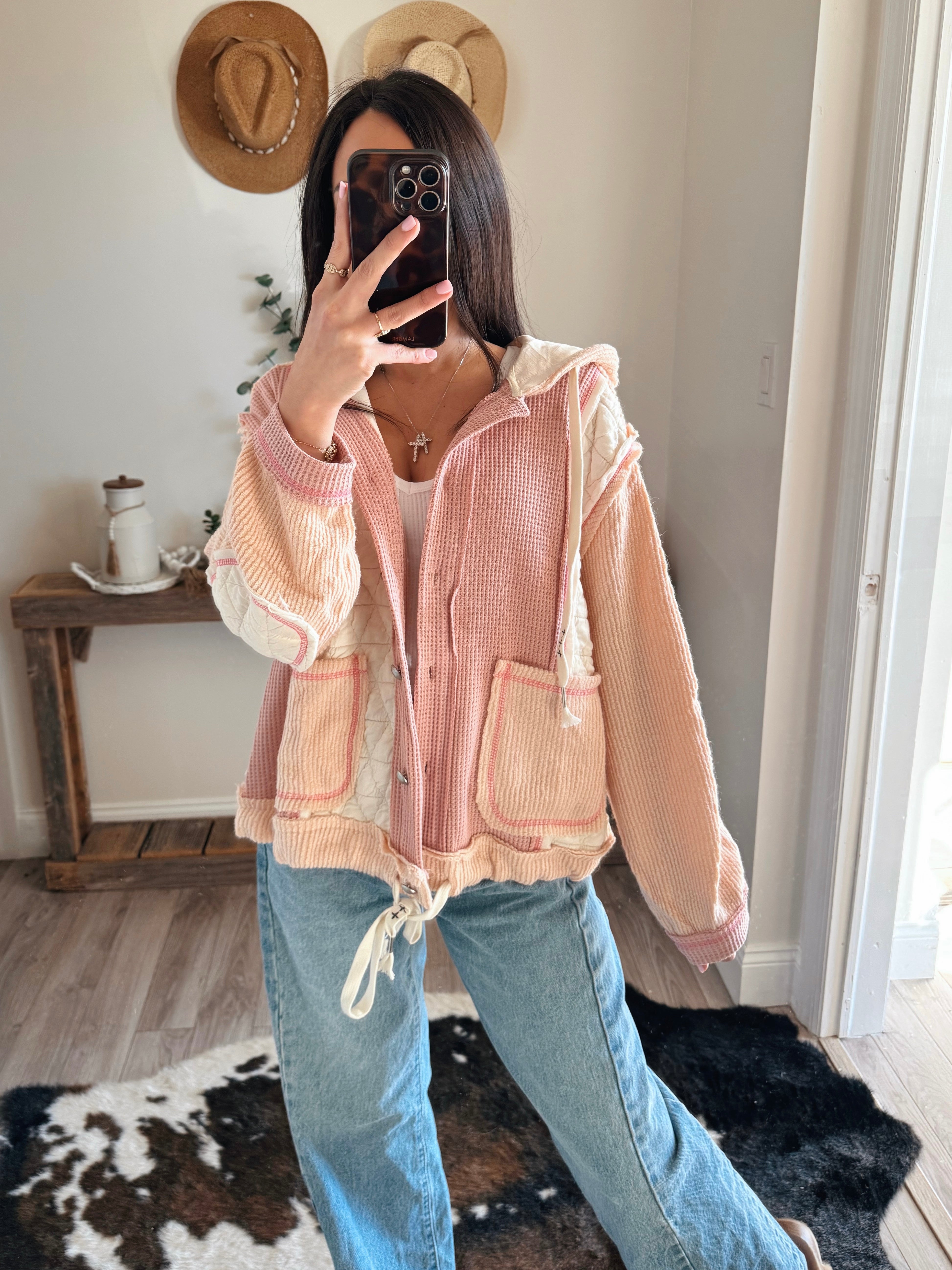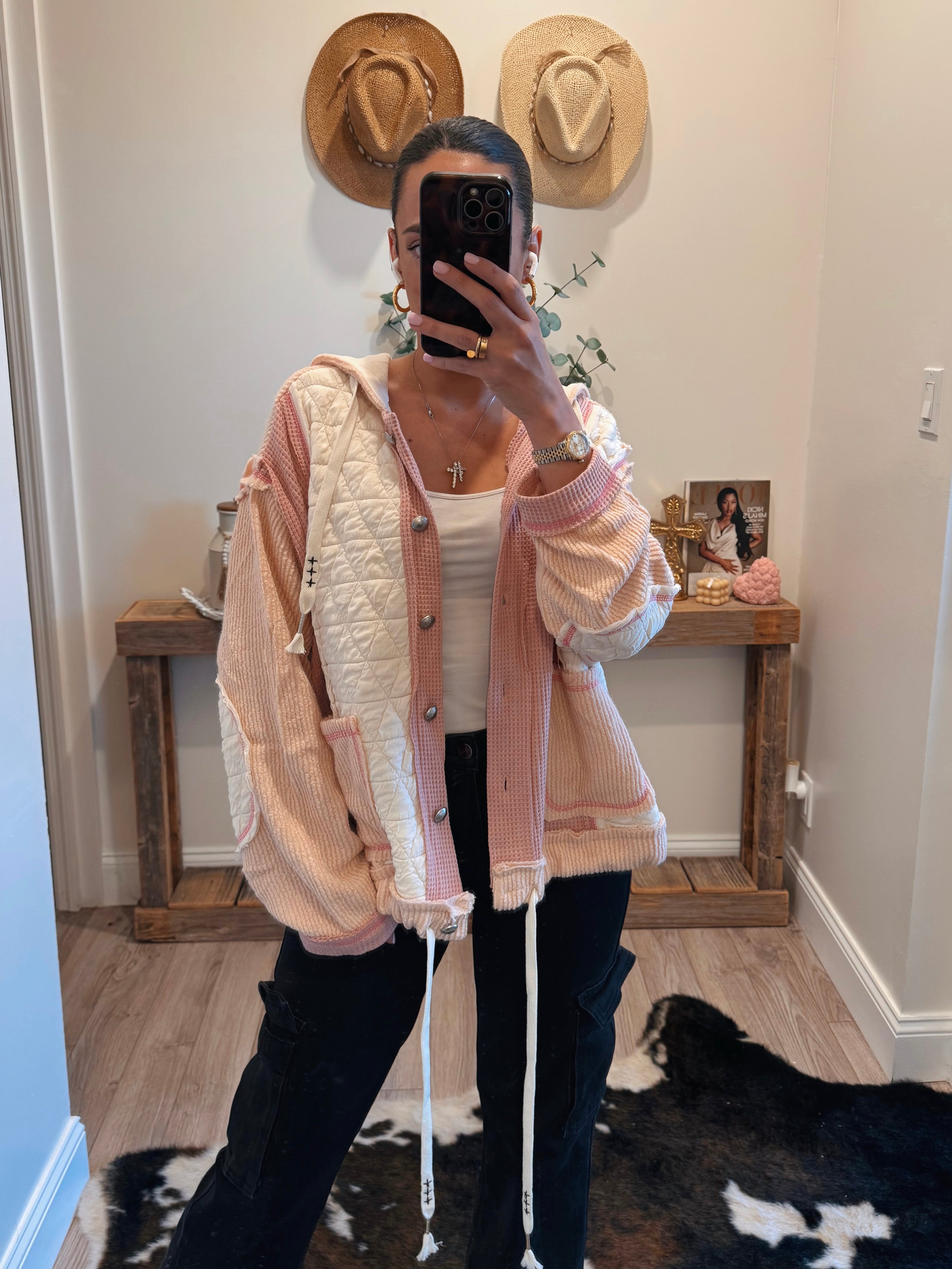 Rose/Pink Multi Fabric Hooded Bu Shacket