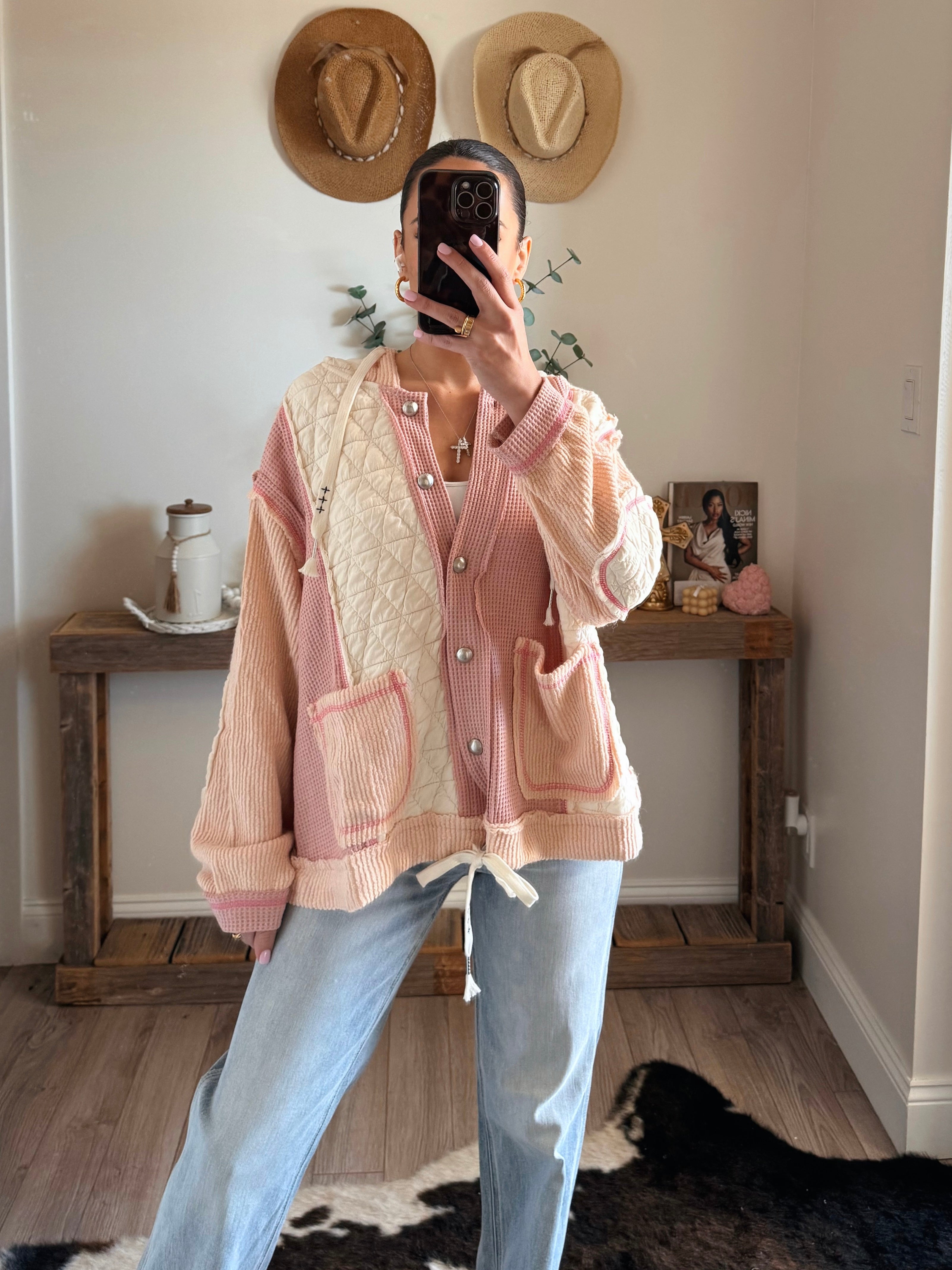 Product Features: This jacket features an oversized button-down design with a hood, combining thermal, quilted knit, and cut-and-sew sweater knit fabrics for a versatile and layered look.