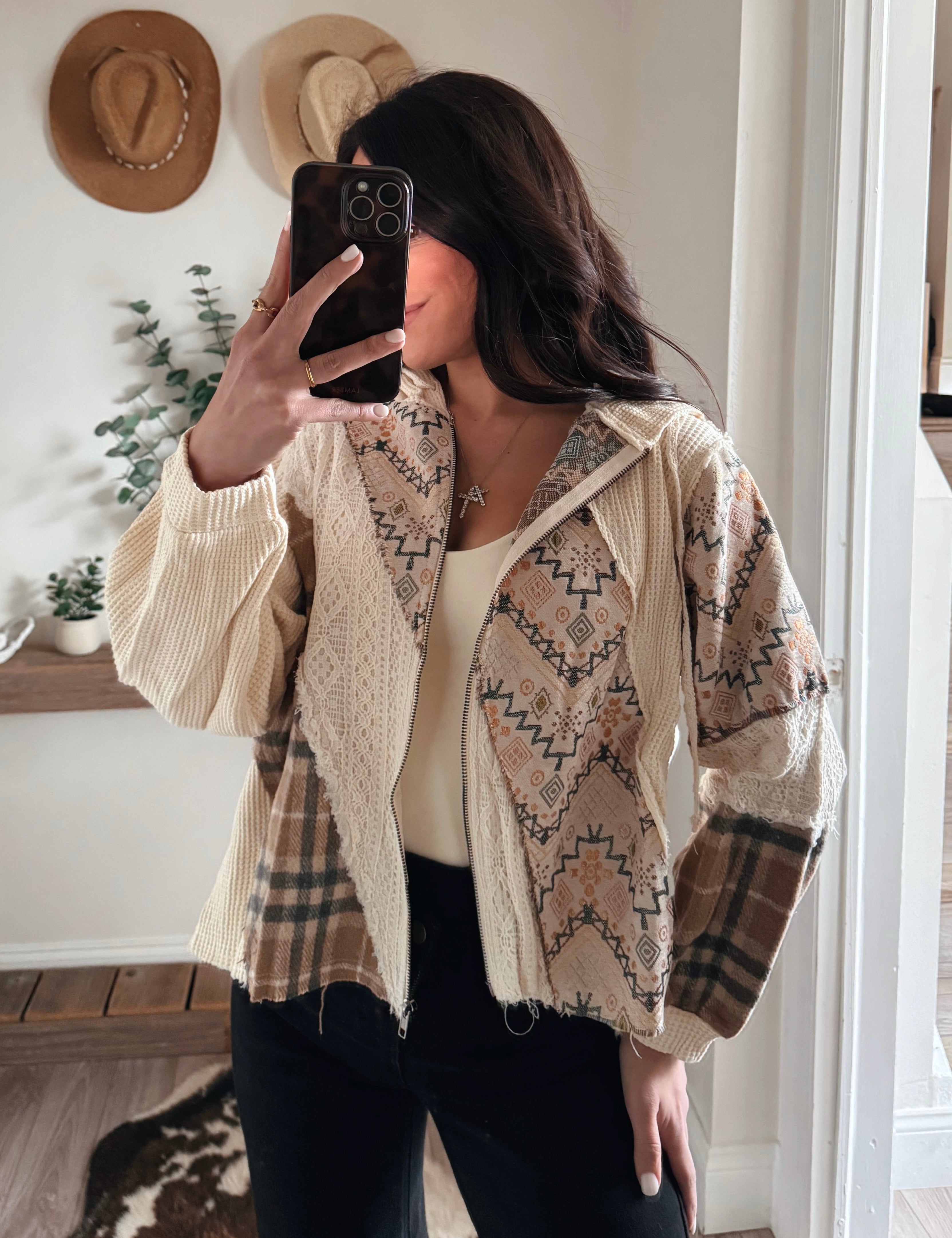 Long Sleeve Plaid Mix Frayed Edge Twill Jacket