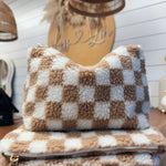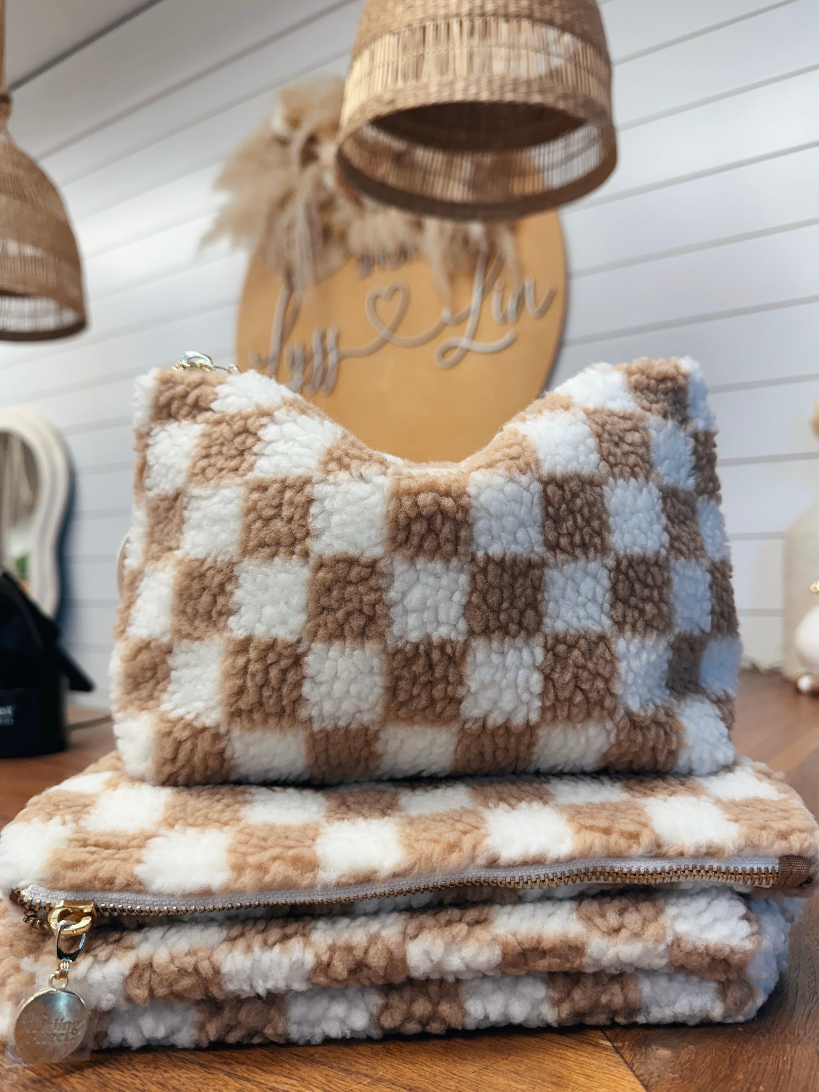 Features: Cozy sherpa fabric, Wipeable lining, Gold zipper and hardware, Interior printed lining