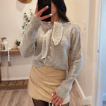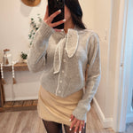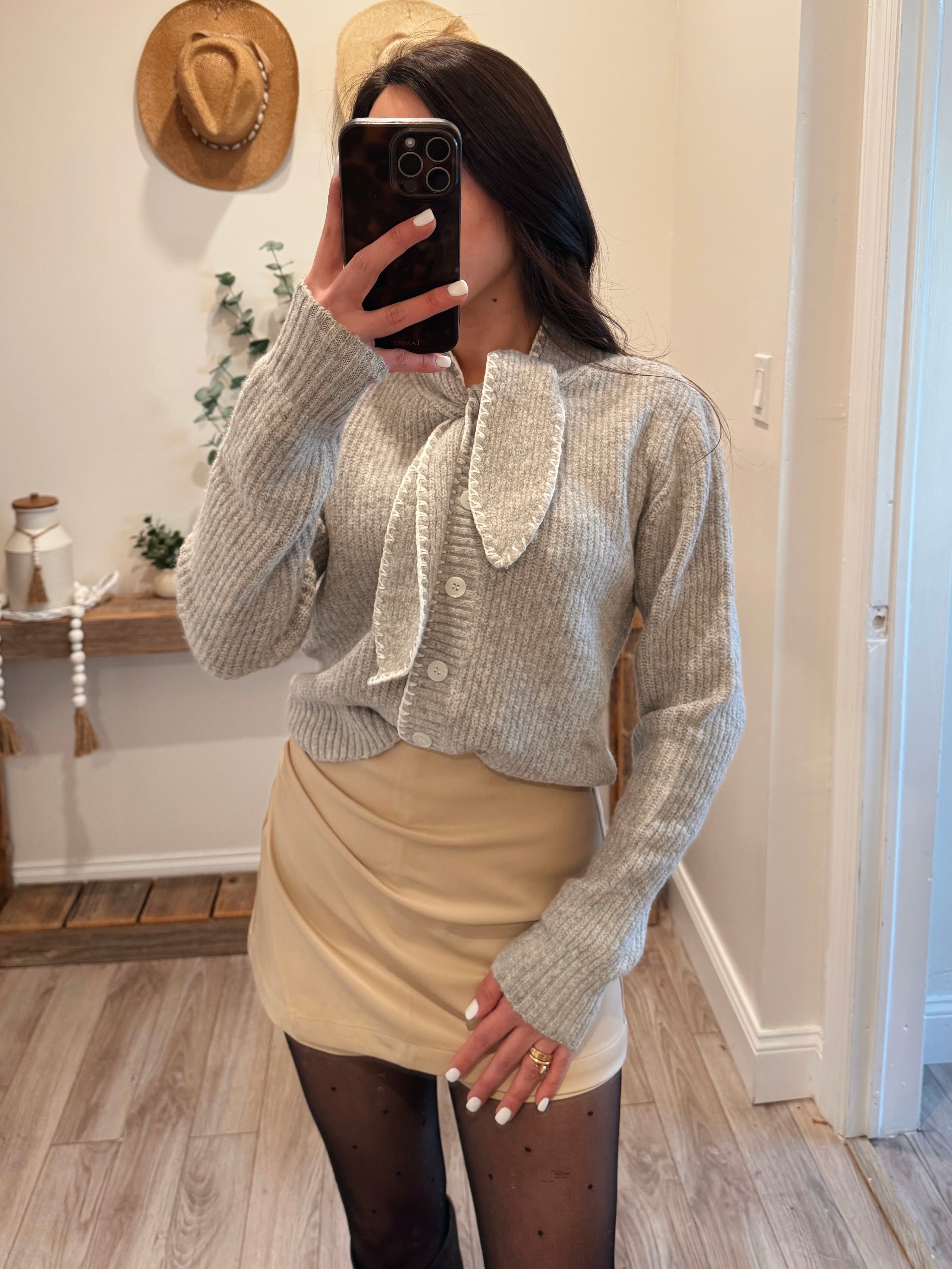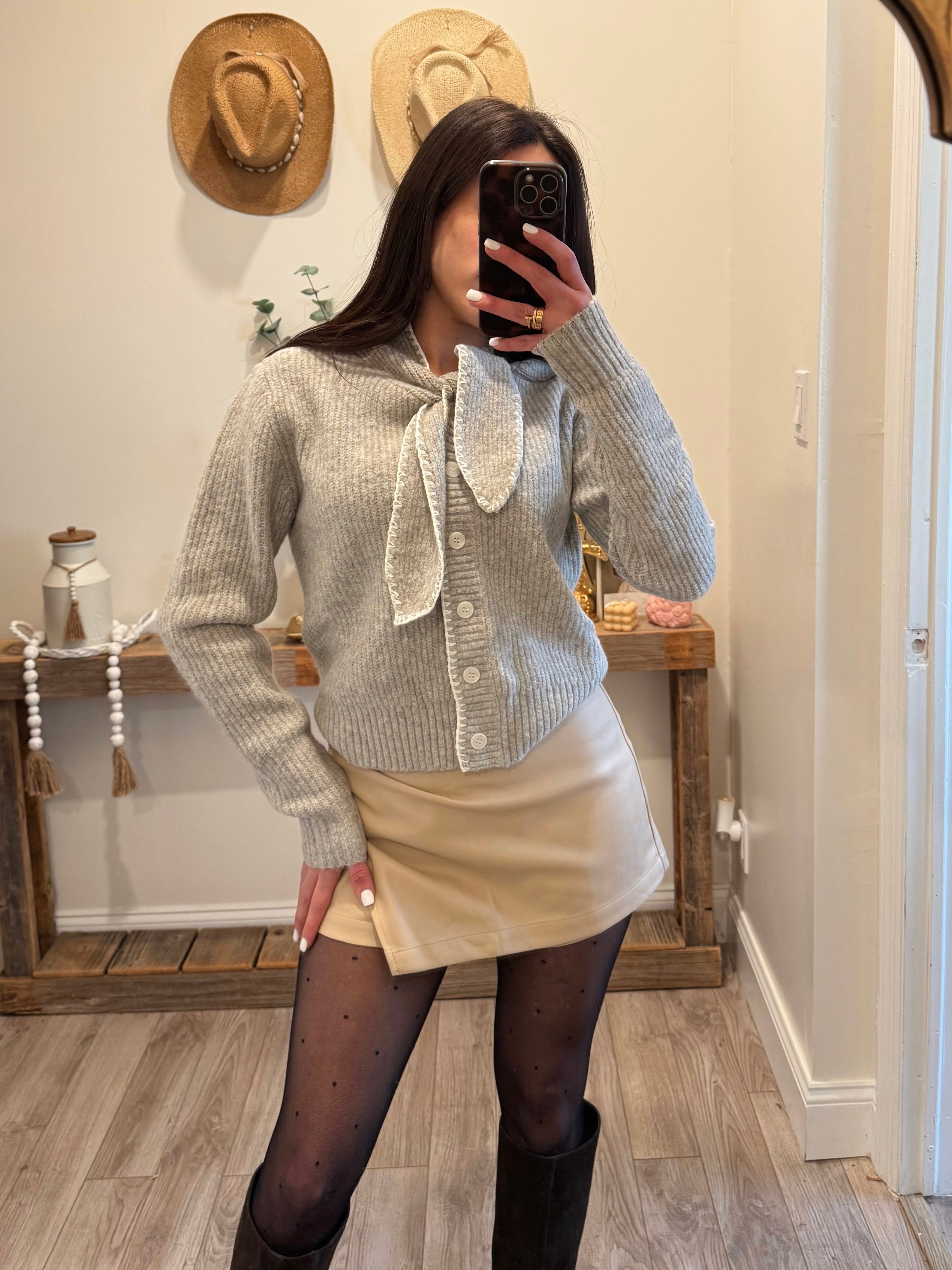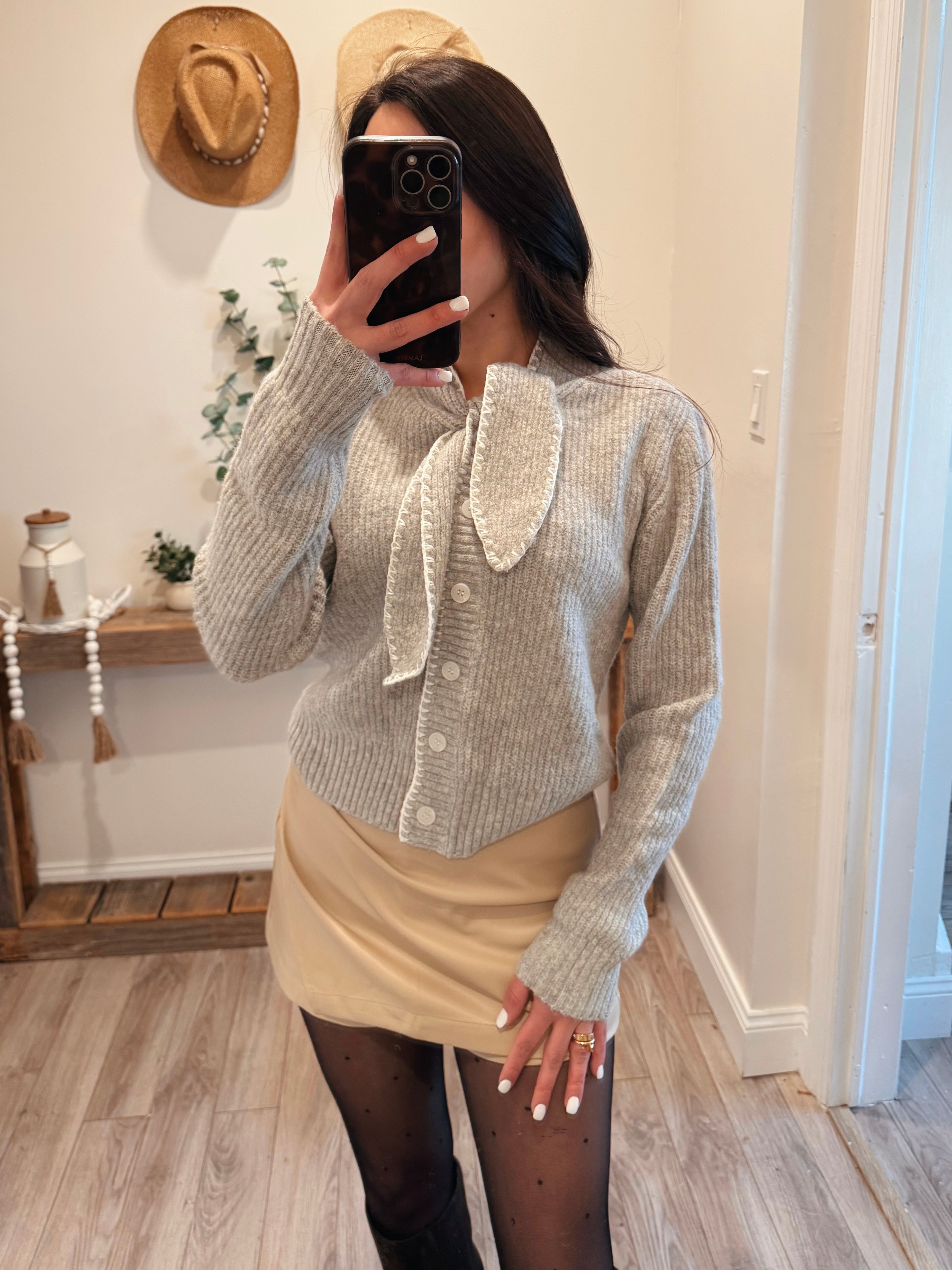 Product Description: A refined cardigan with soft ribbed knit, scarf-tie neckline, and contrast stitching details. The fitted cut offers a flattering, elegant silhouette.