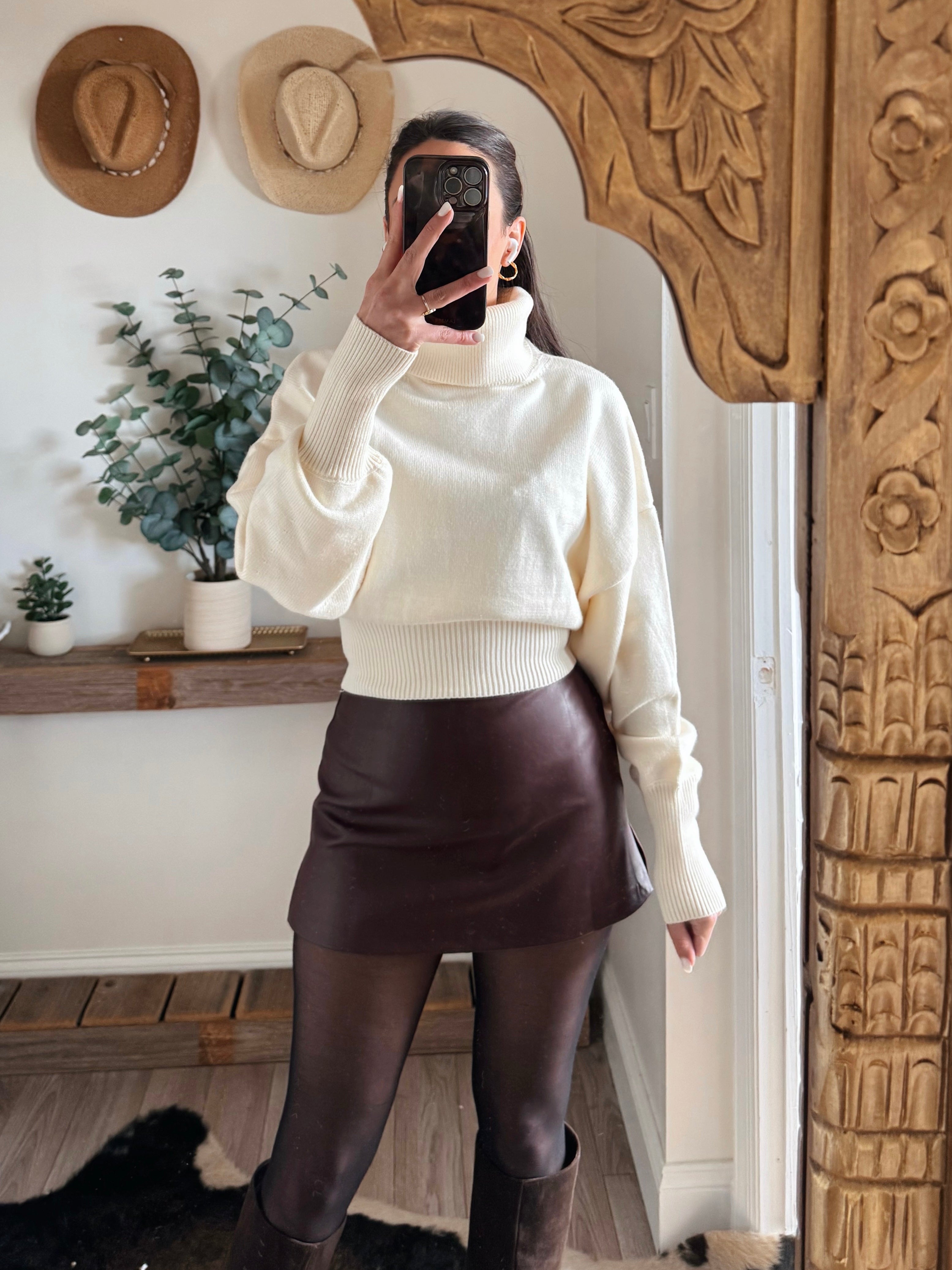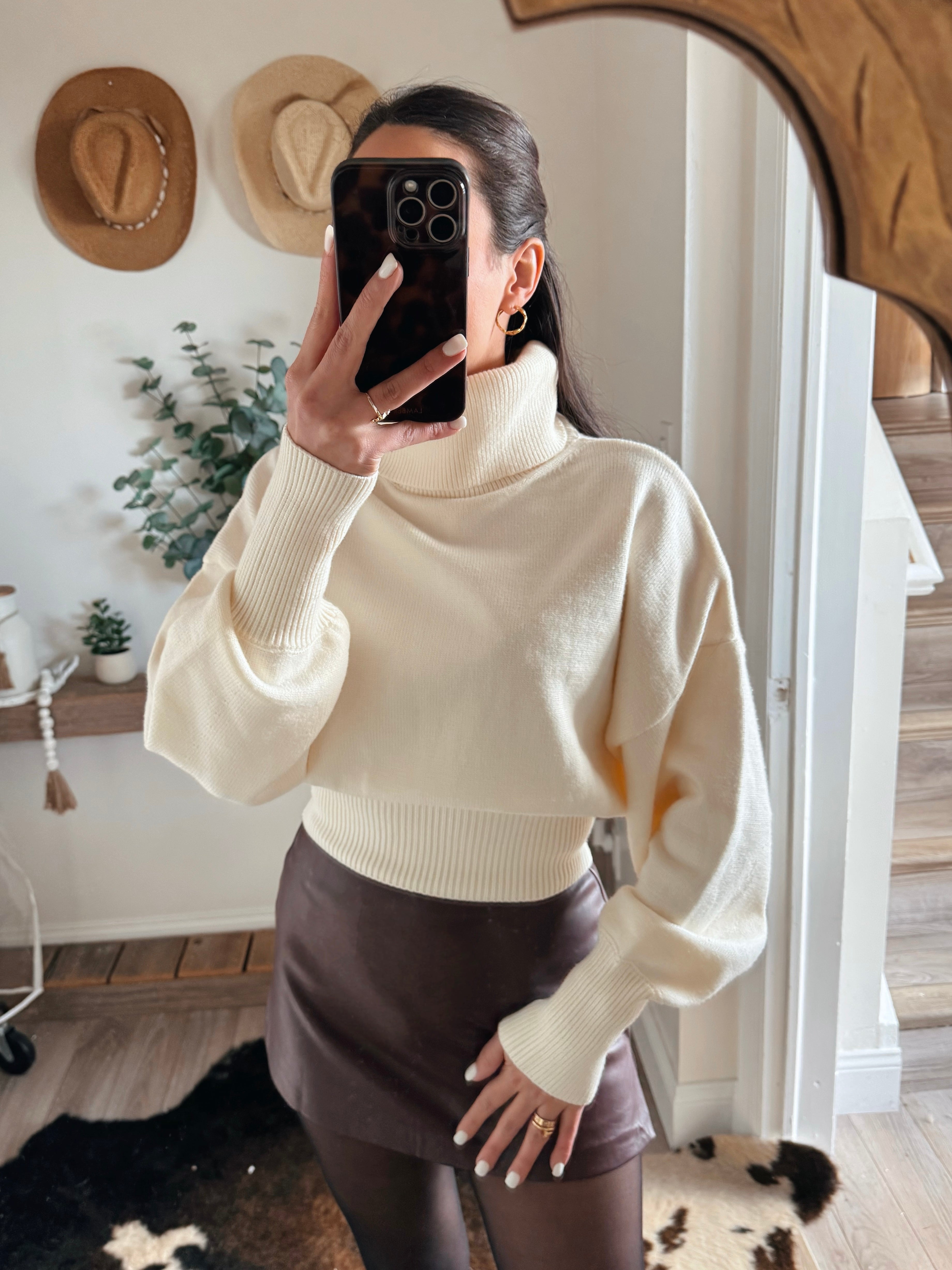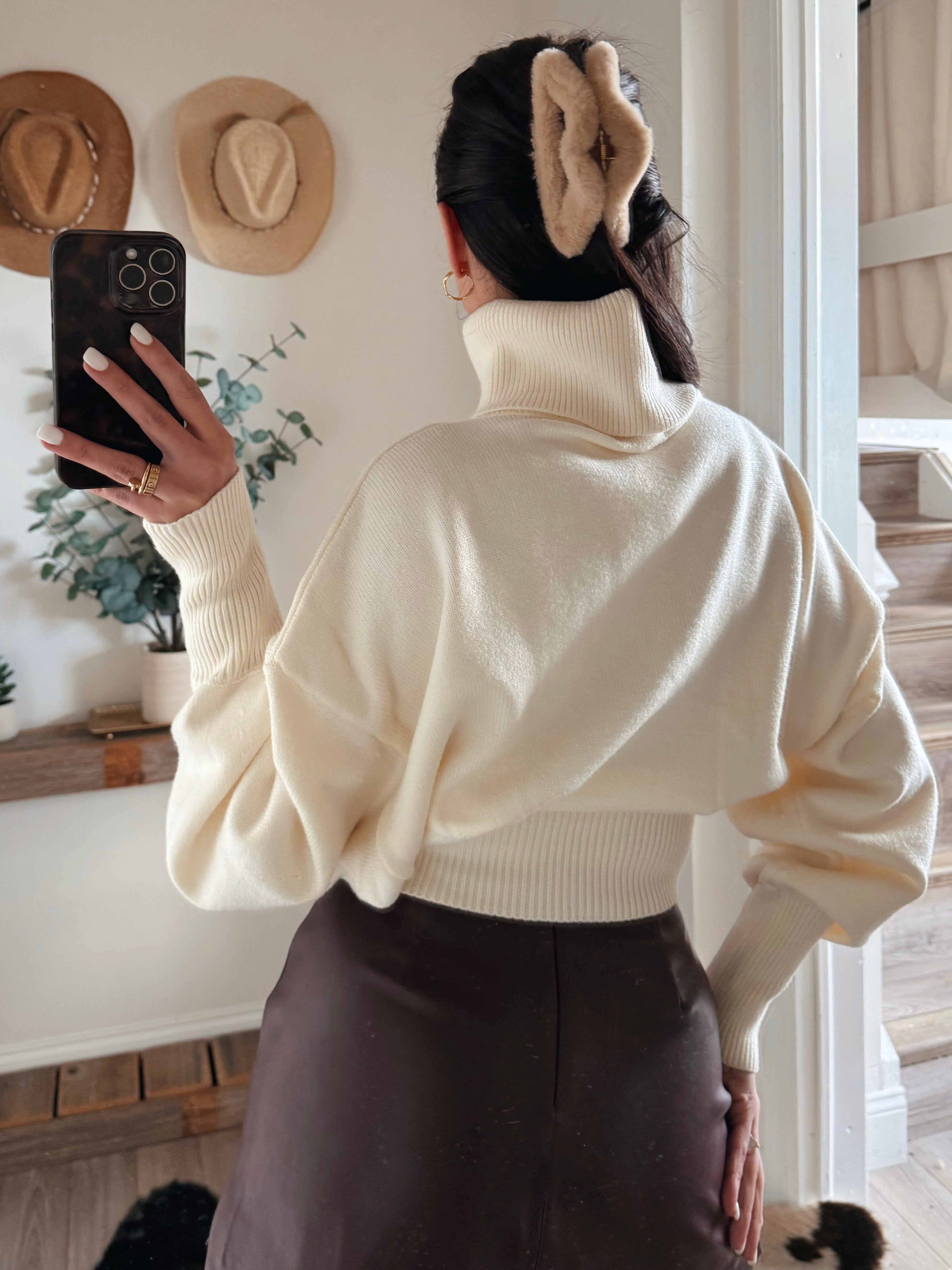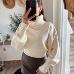 Cream Solid Knit Banded-Hem Cropped Turtleneck Sweater