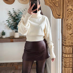 Product Features: High neckline. Folded turtleneck collar. Long bishop sleeves with wide cuffs. Dropped shoulder. Banded hem. Ribbed knit collar, cuffs, and hem. Cropped length. Relaxed fit.