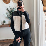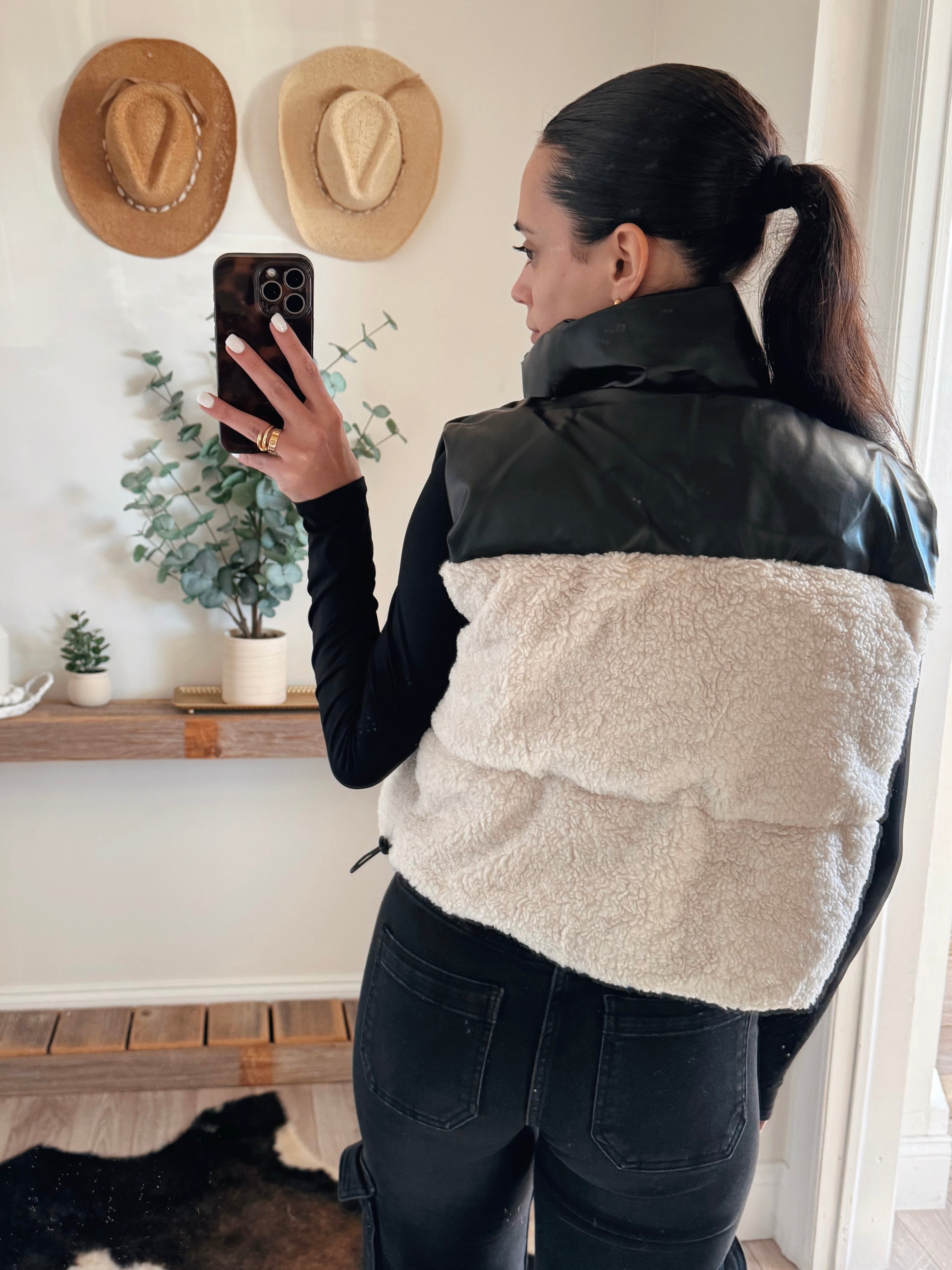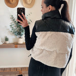 Product Features: This stylish puffer vest combines contrasting PU and sherpa materials in a timeless design that offers both warmth and sophistication. It features an oversized collar, a front zipper closure, and practical side slit pockets, making it a standout piece for colder days.