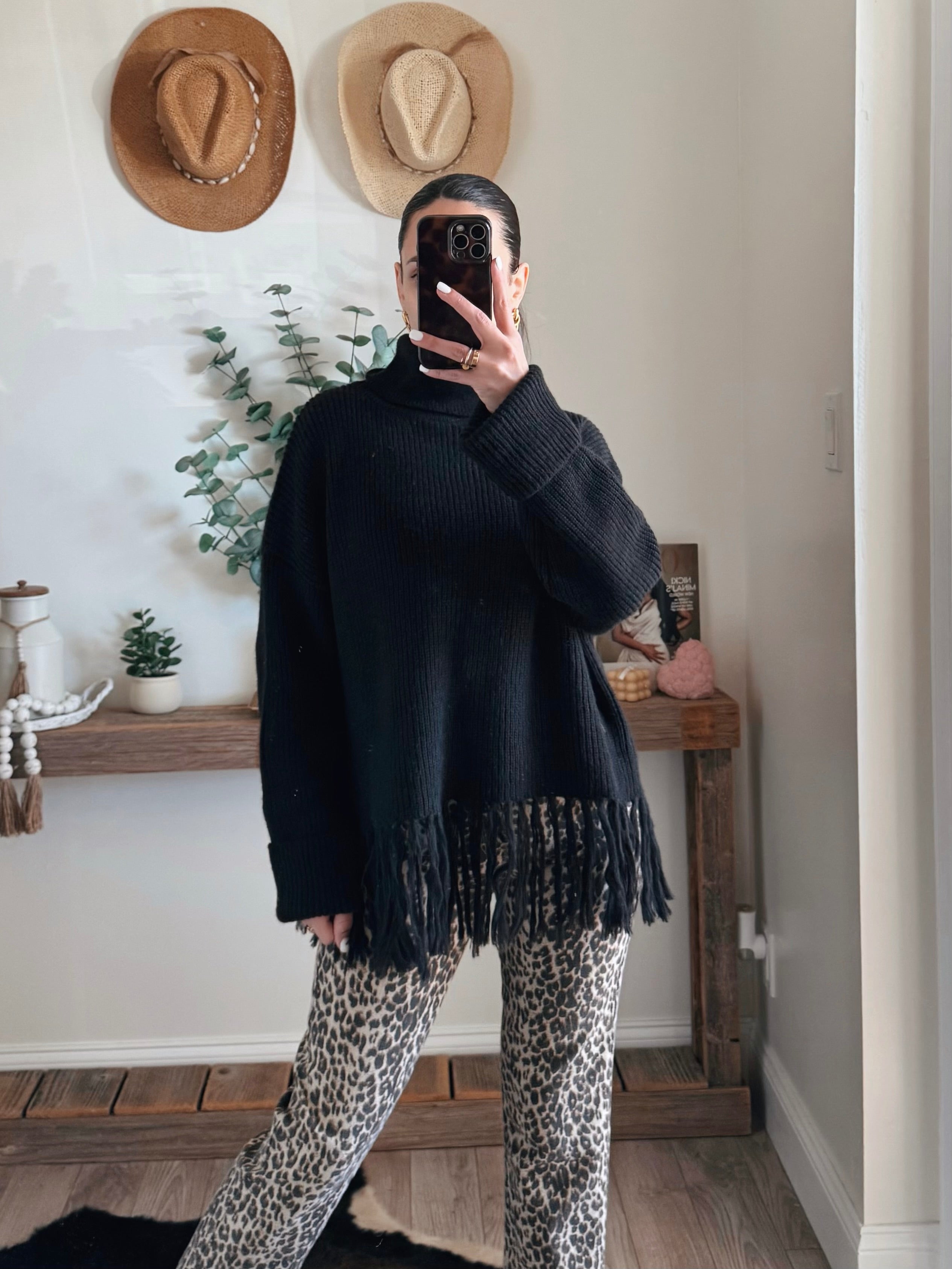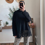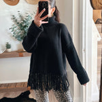 Black Fringe Hem Ribbed Turtleneck Sweater