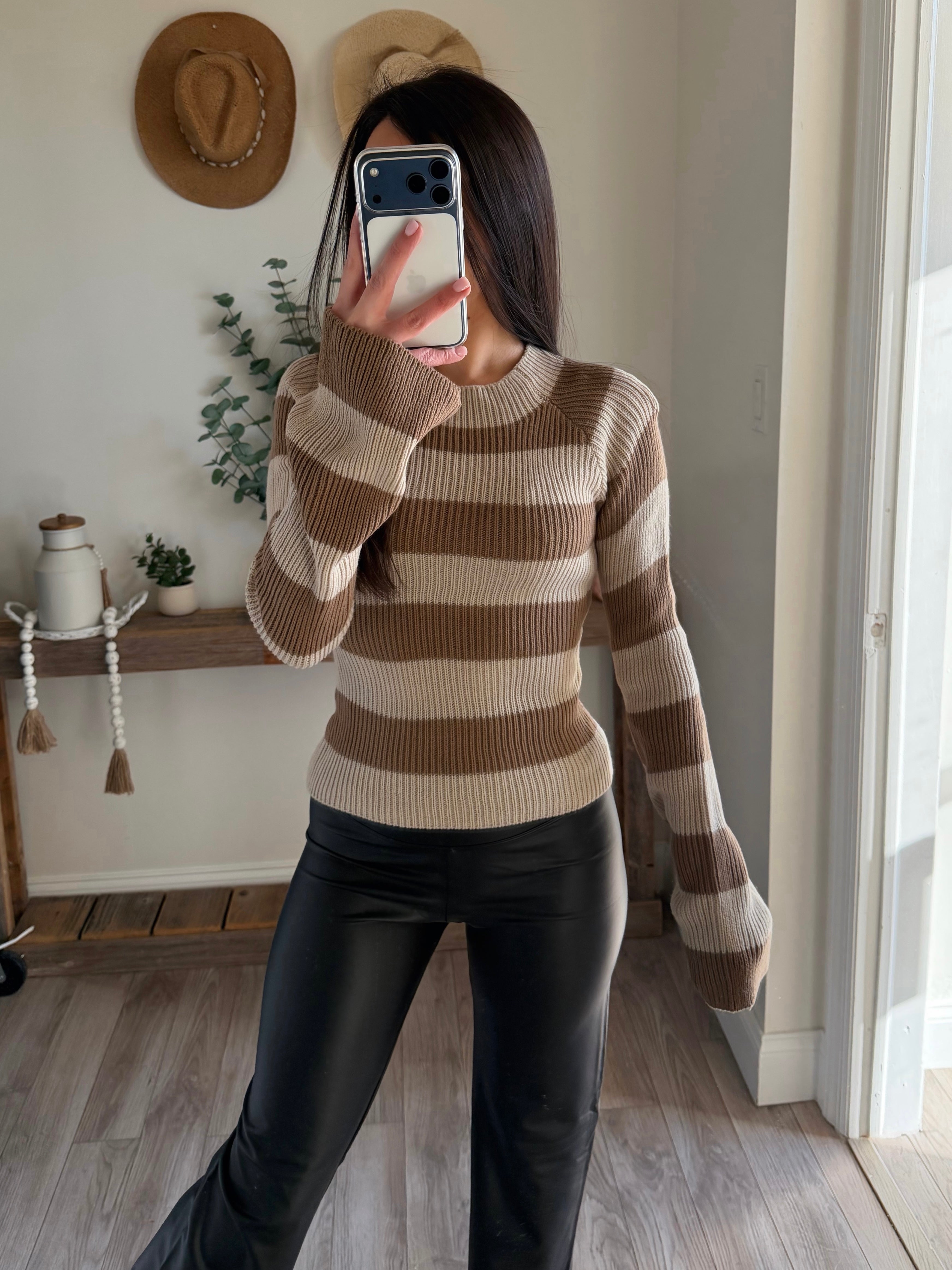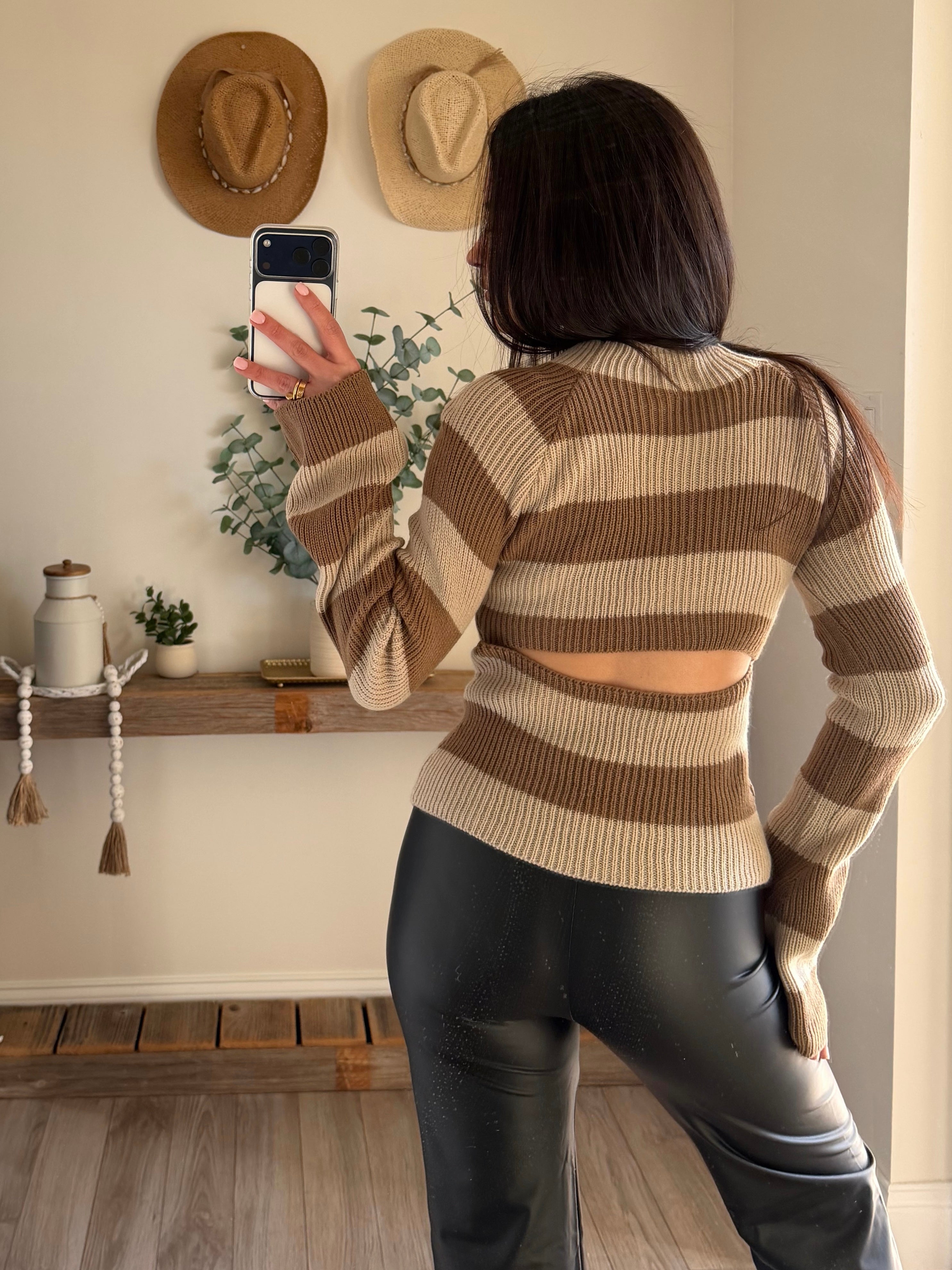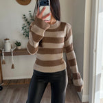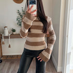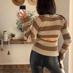 Cream-Sand Back Cutout Stripe Sweater Knit Top