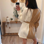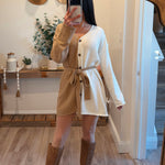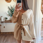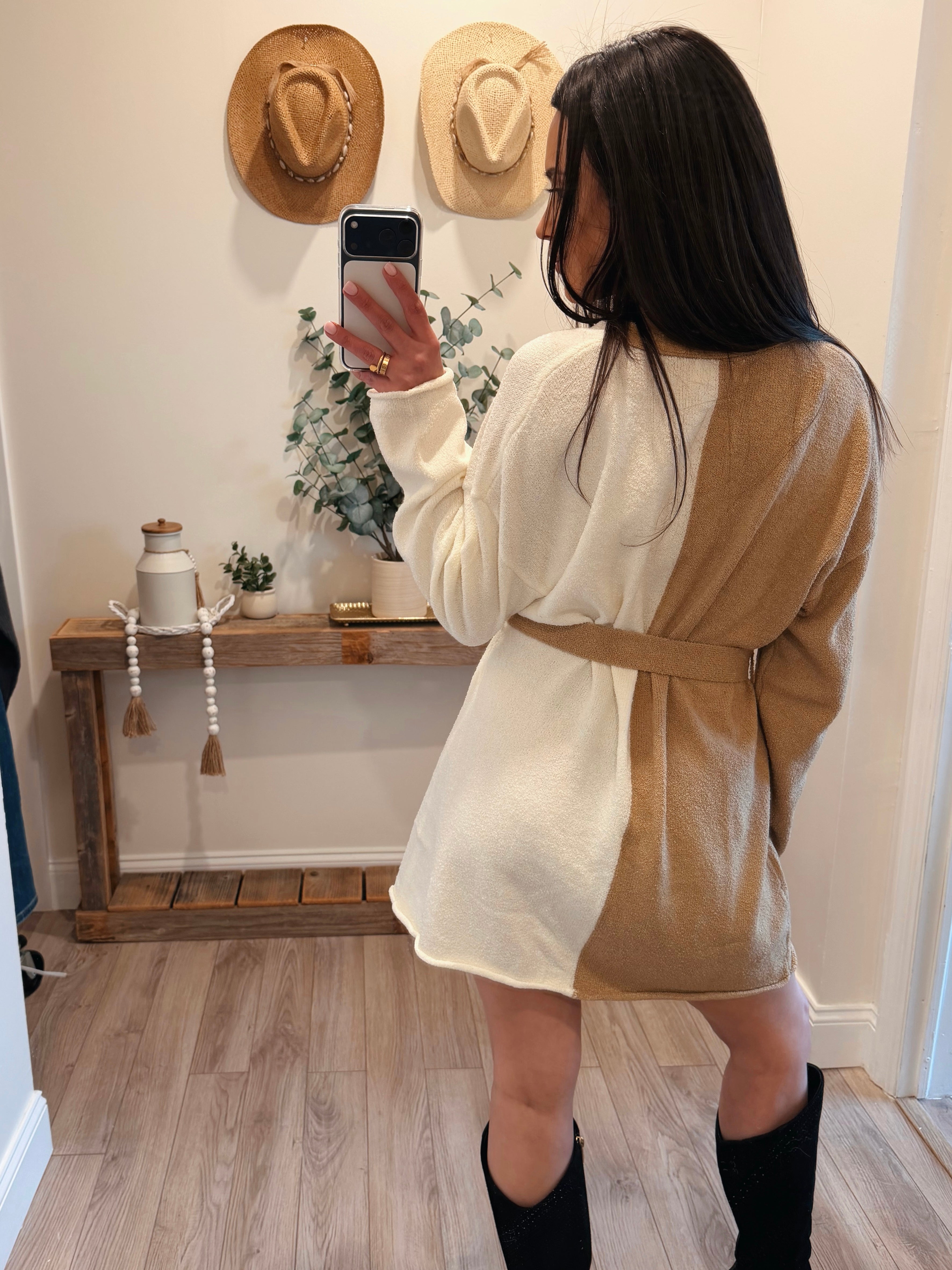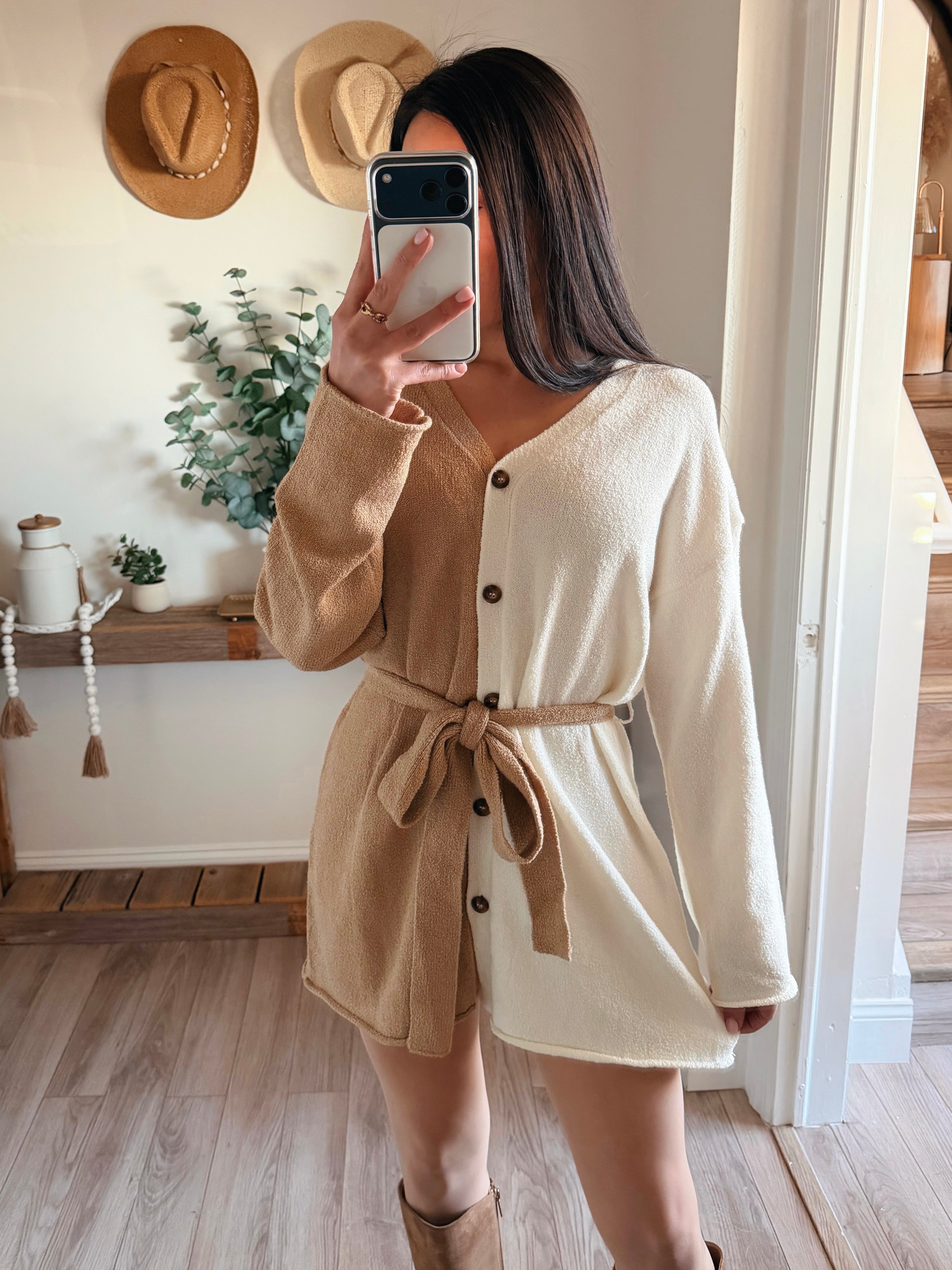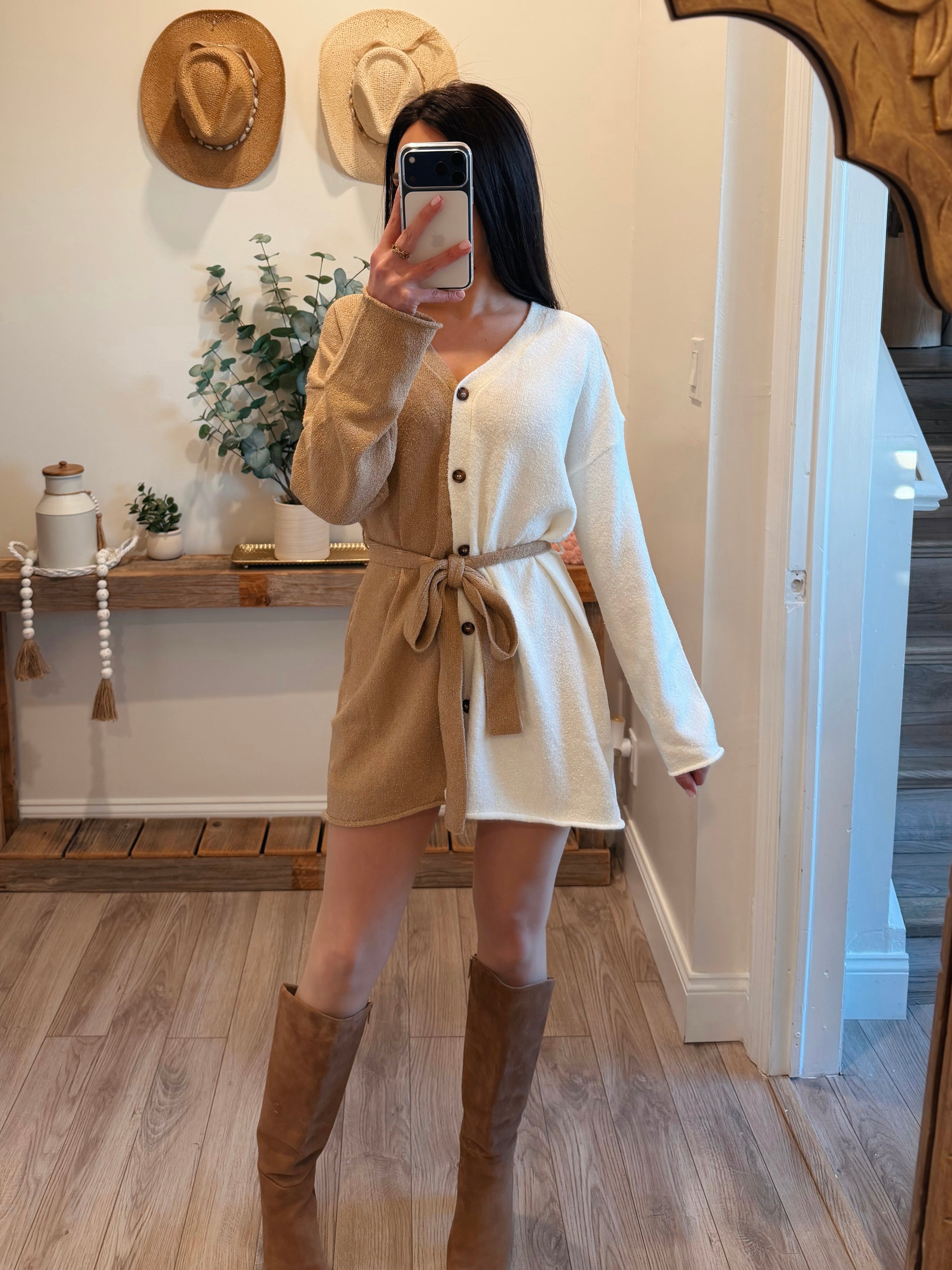 Cream-Sand Knit Colorblock Belted Cardigan/Dress