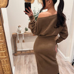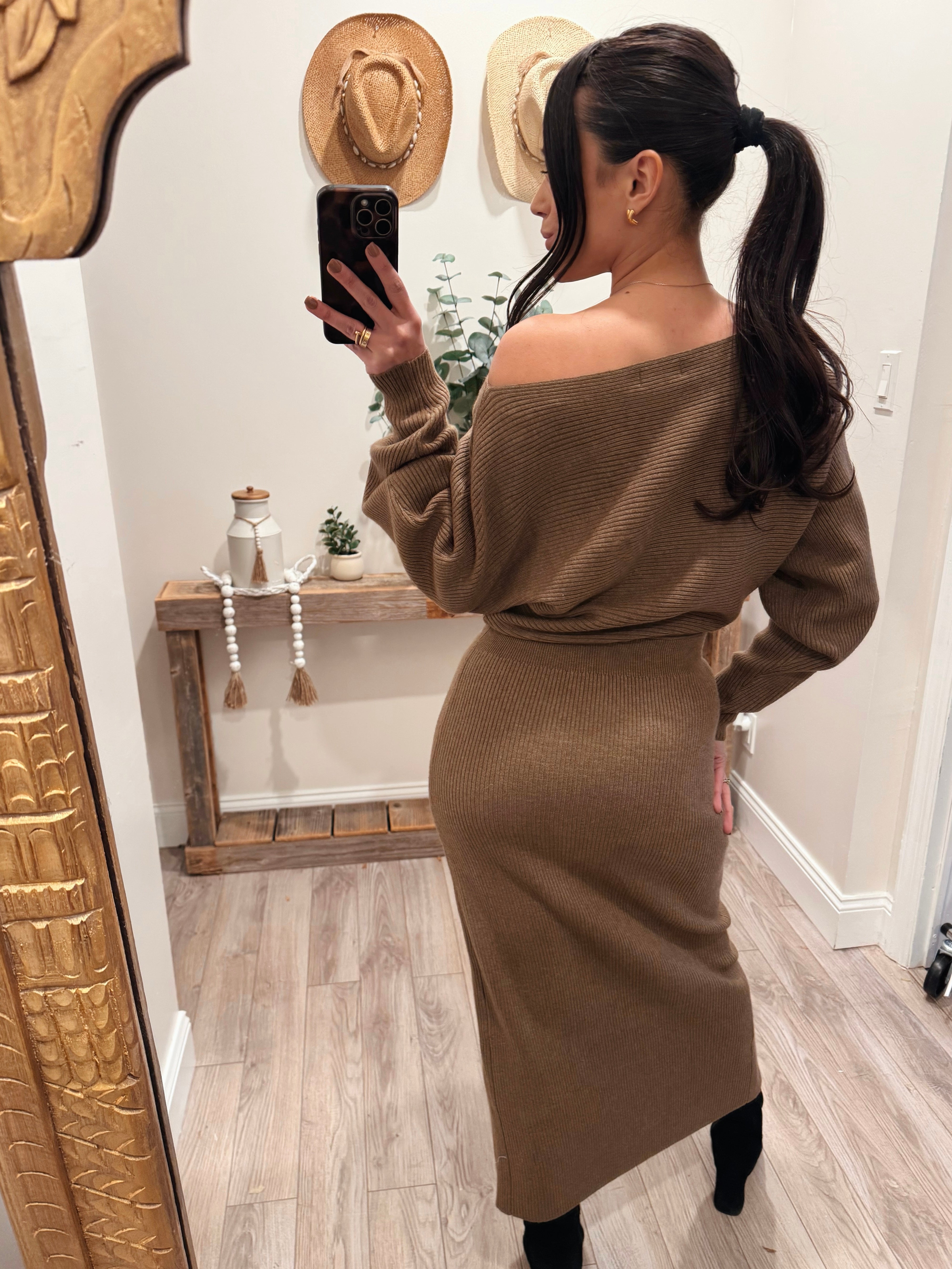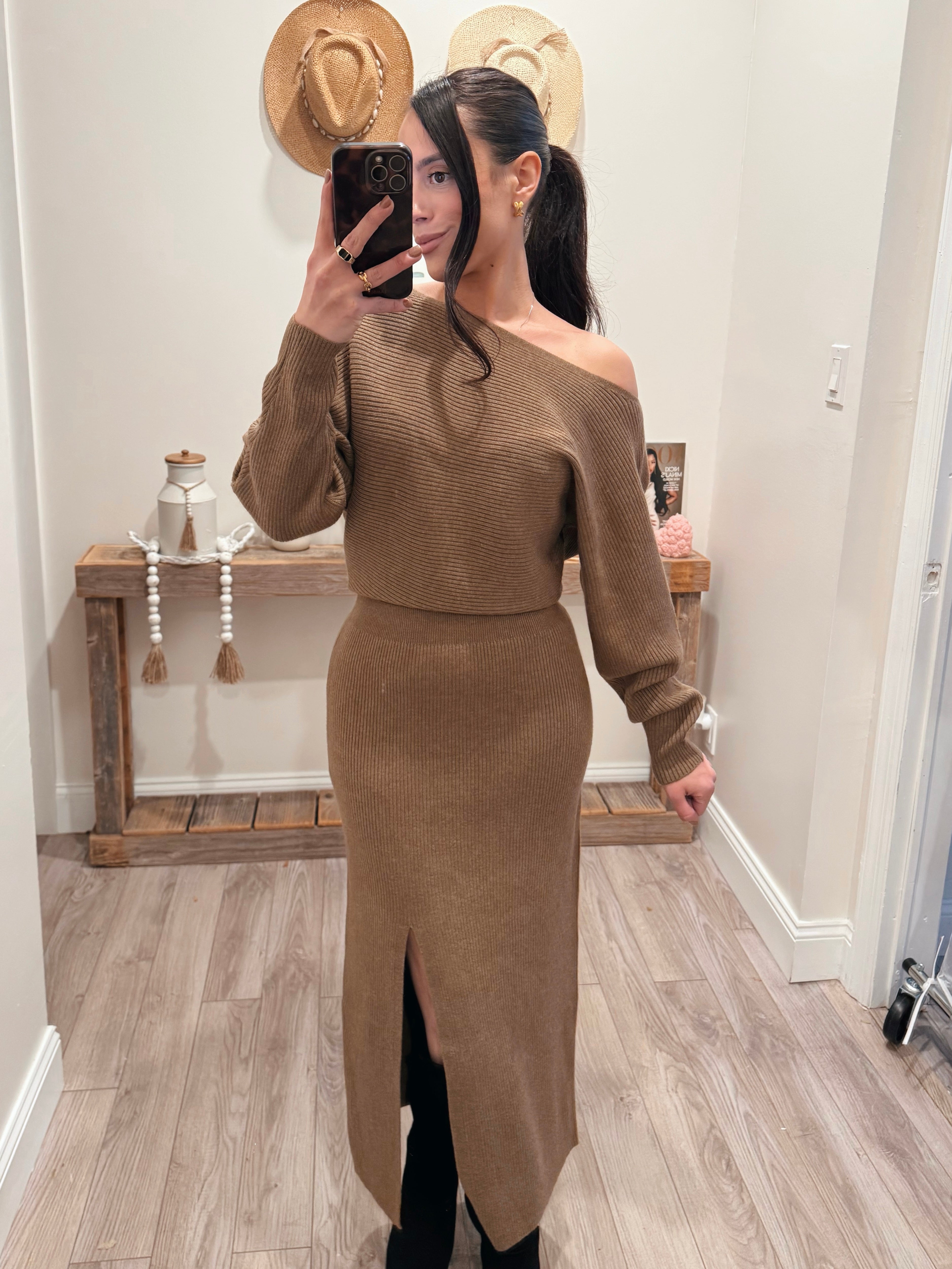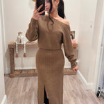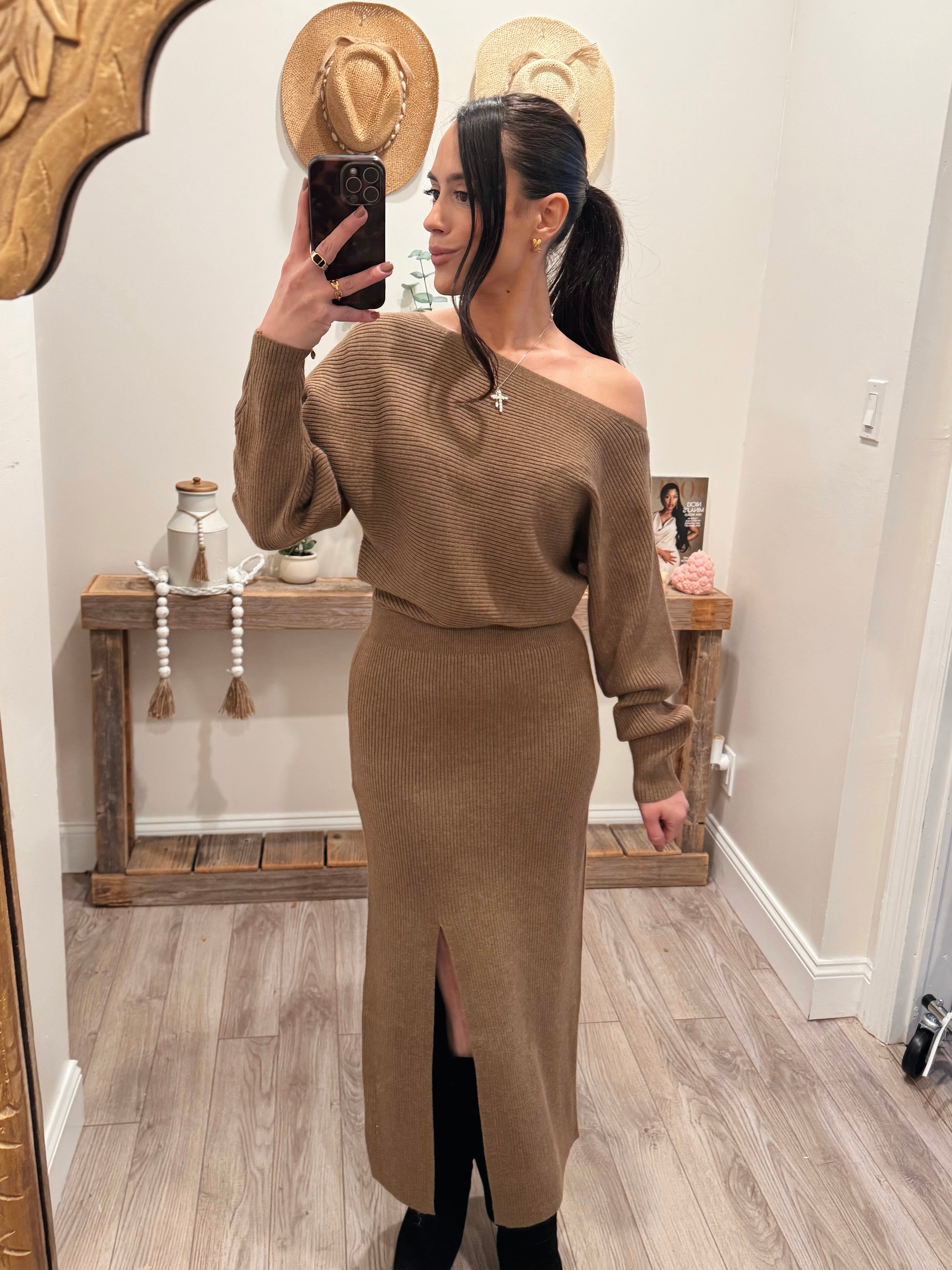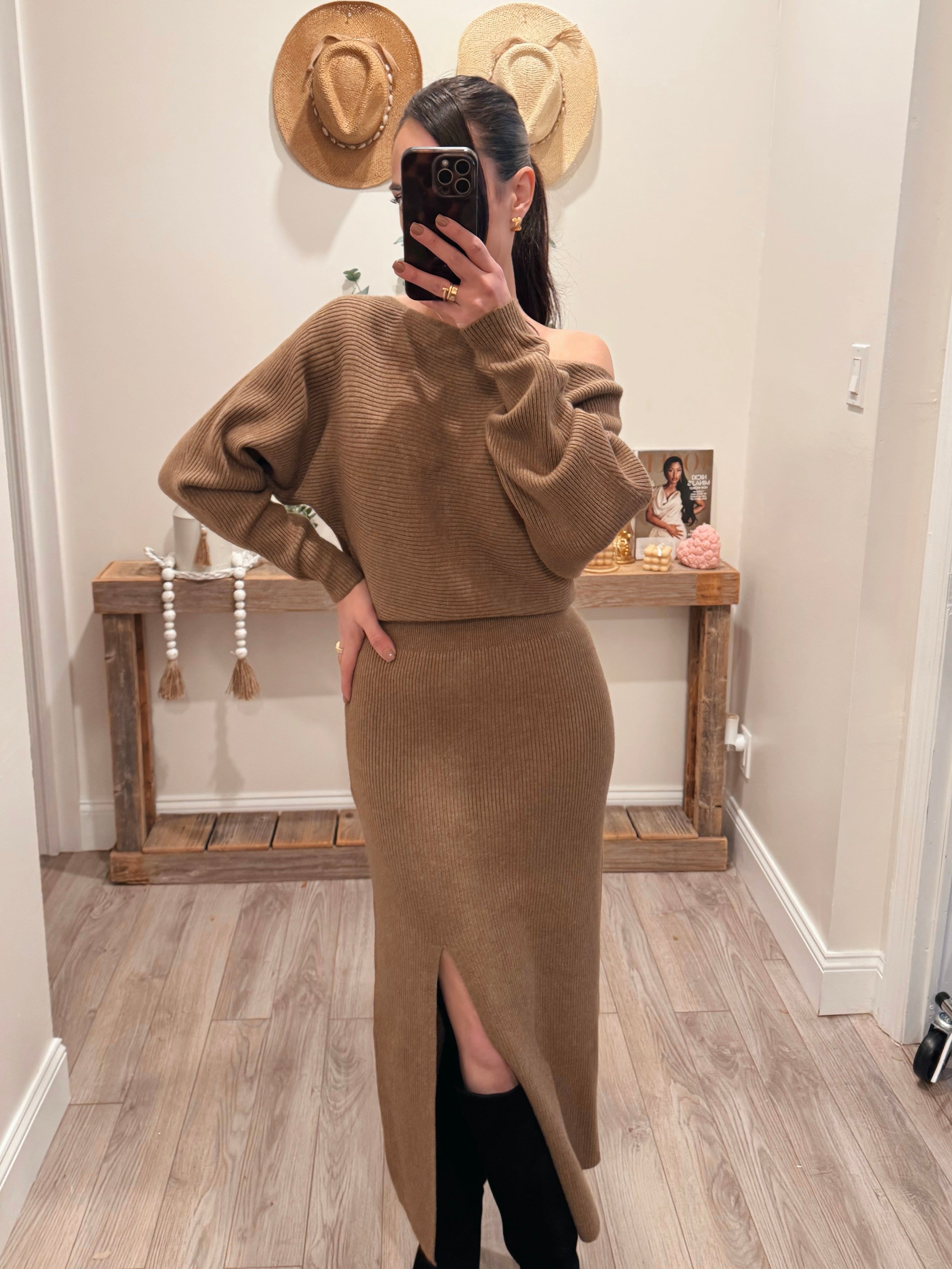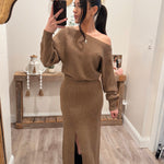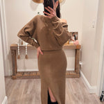 Product Features: One-shoulder boat neckline. Long dolman sleeves with wide cuffs. Side slit. Calf length. Relaxed fit.