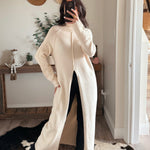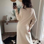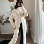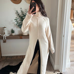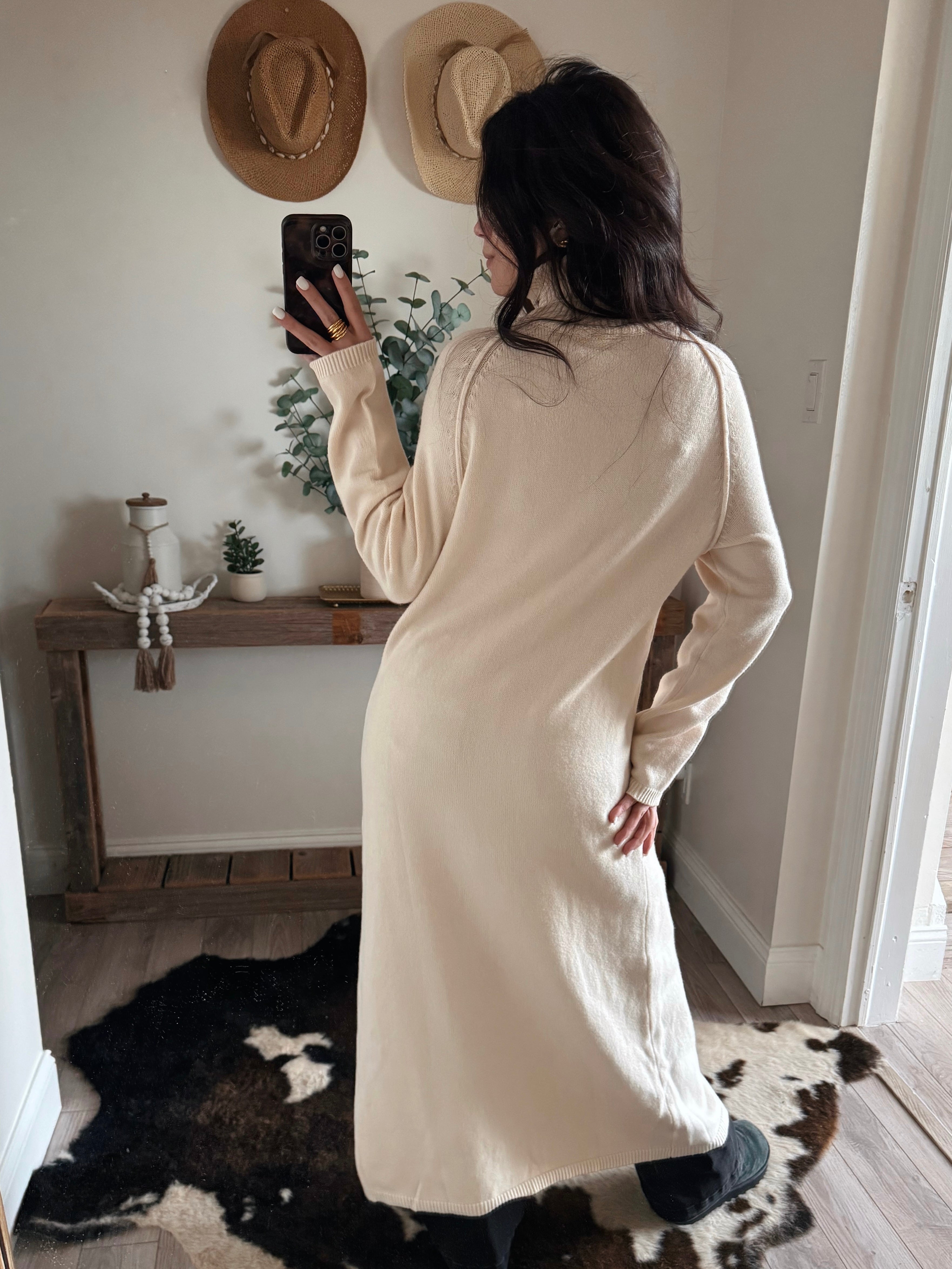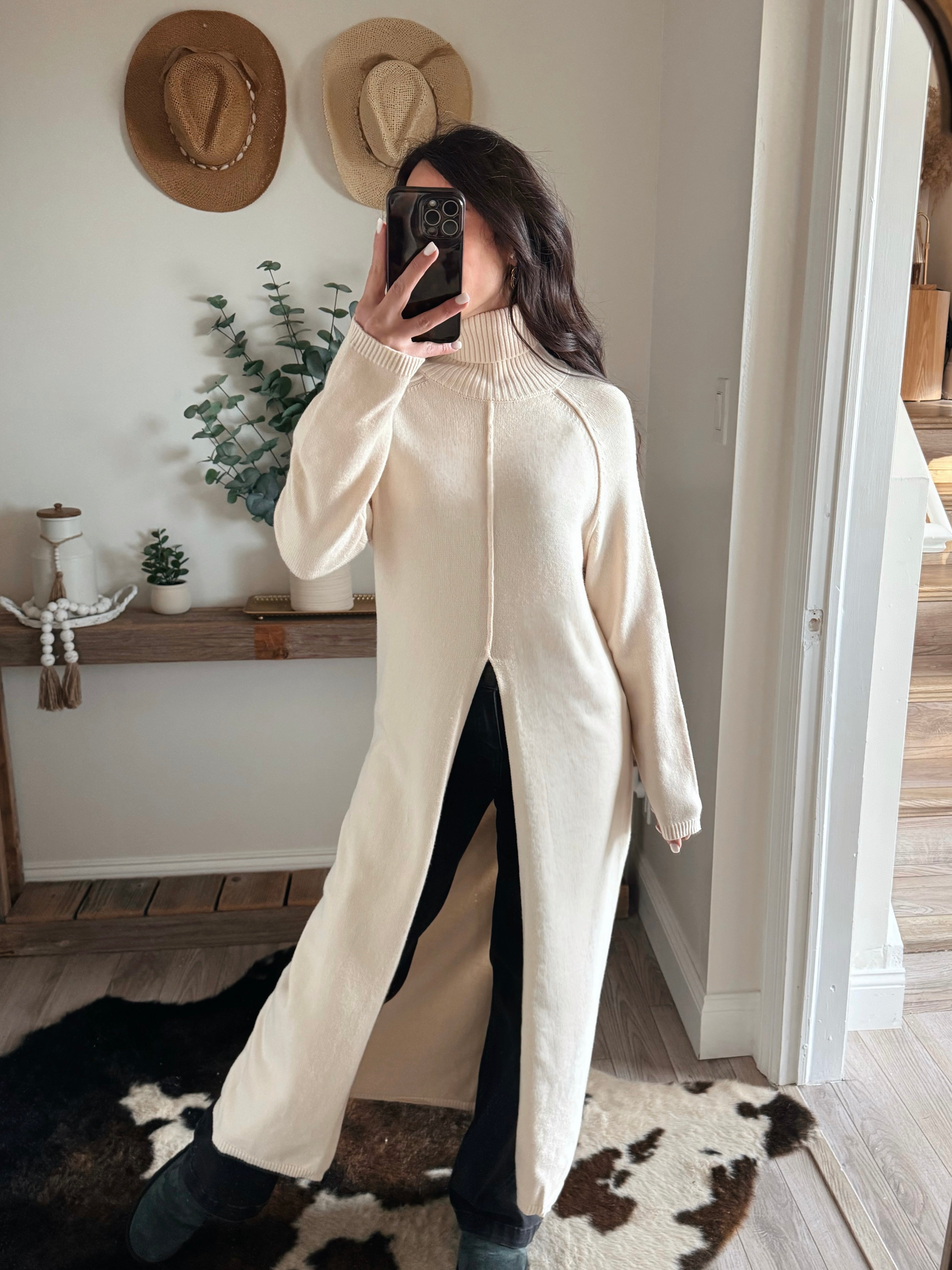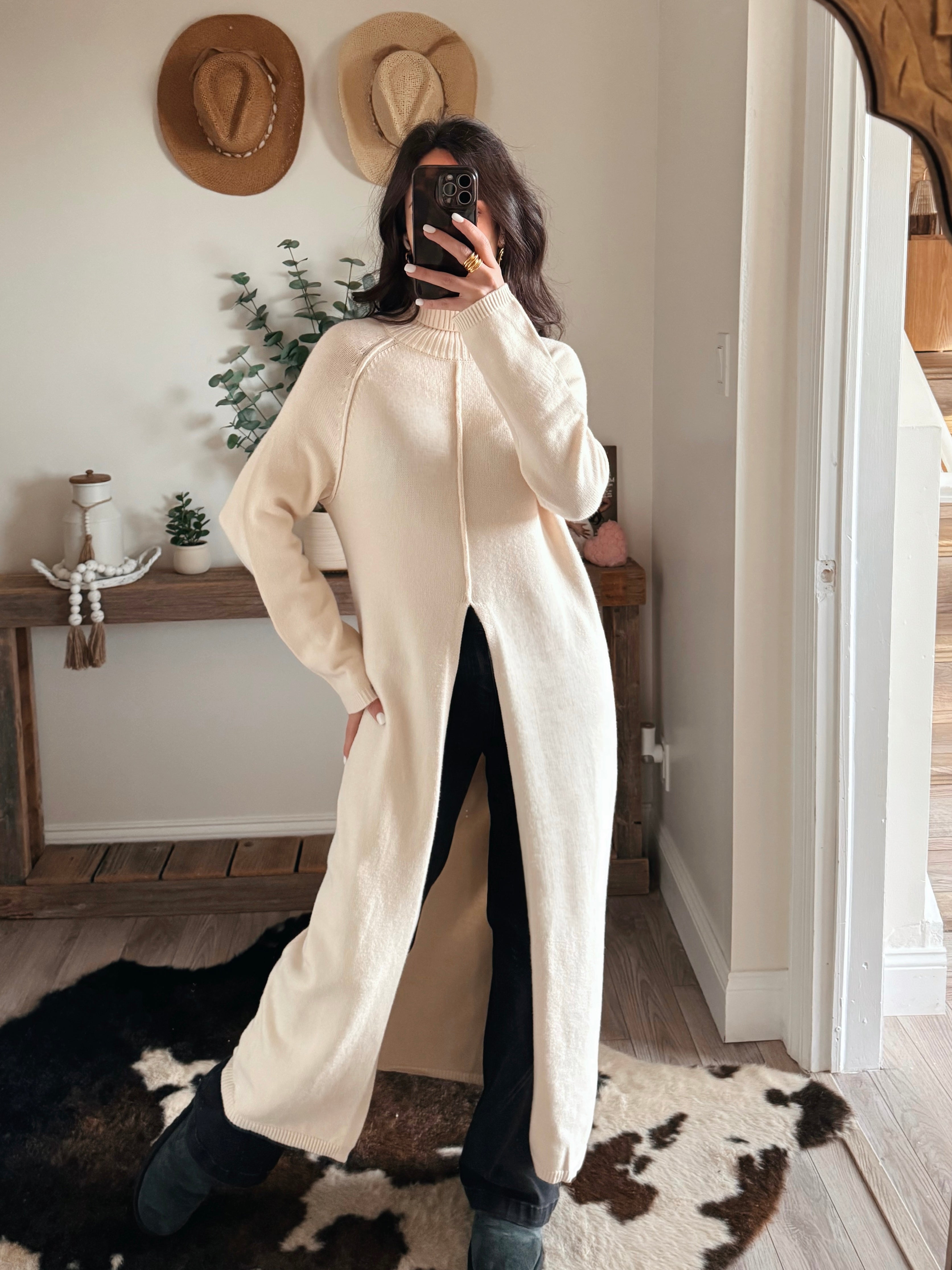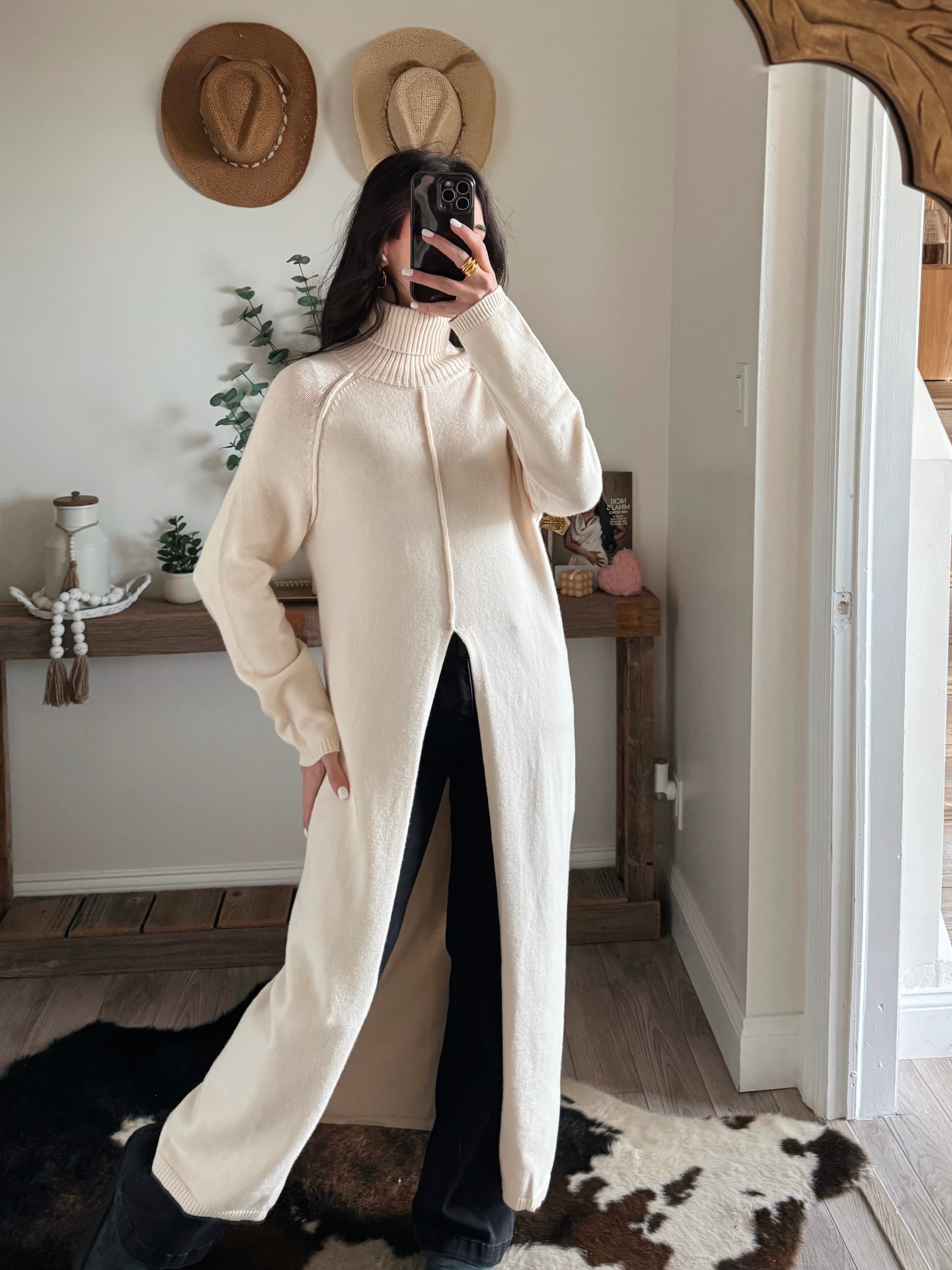 Ecru Turtleneck Tunic Sweater Dress with Slit