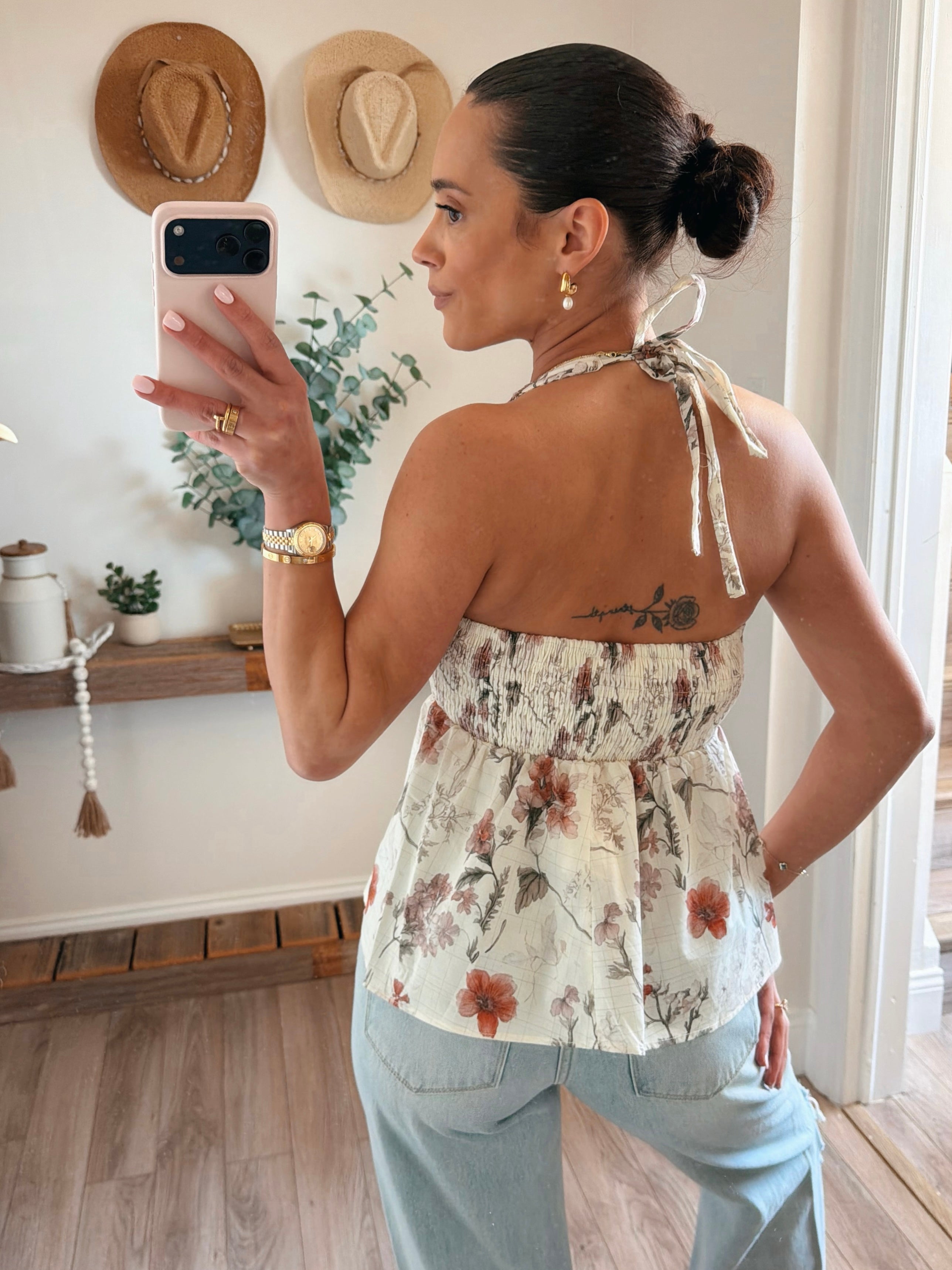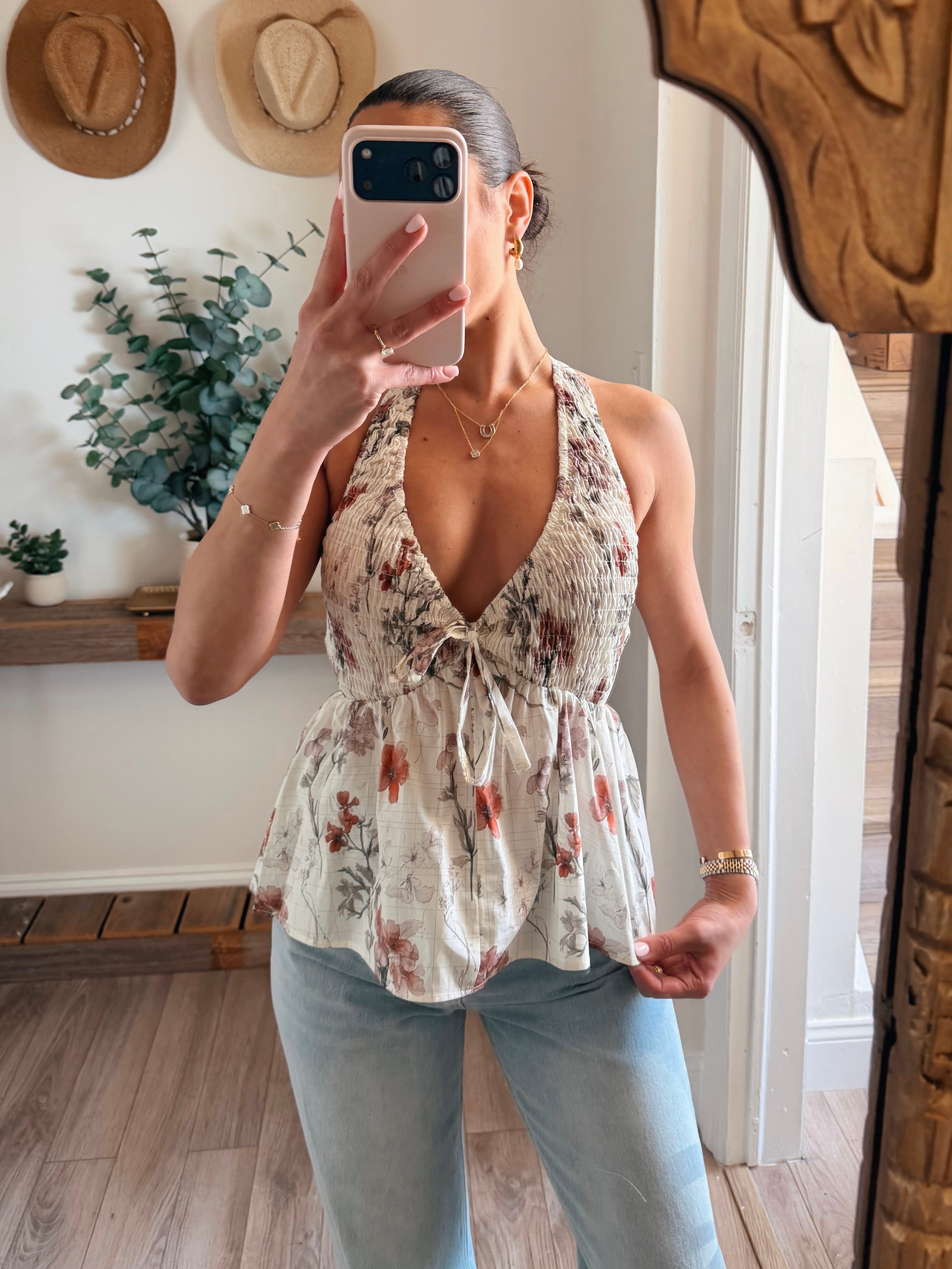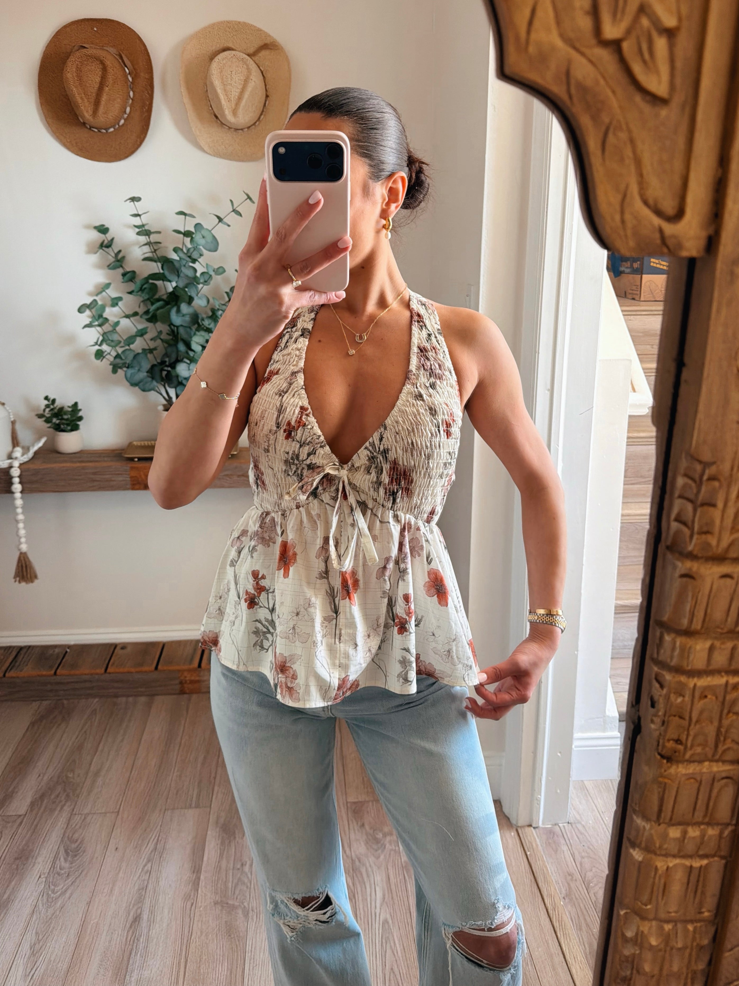 Product Features: Plunging scoop neckline. • Smocked bodice with tie detail. • Sleeveless with tied halter straps. • Low back with elastic smocking. • High waist. • Flared ruffle hem. • Relaxed fit.