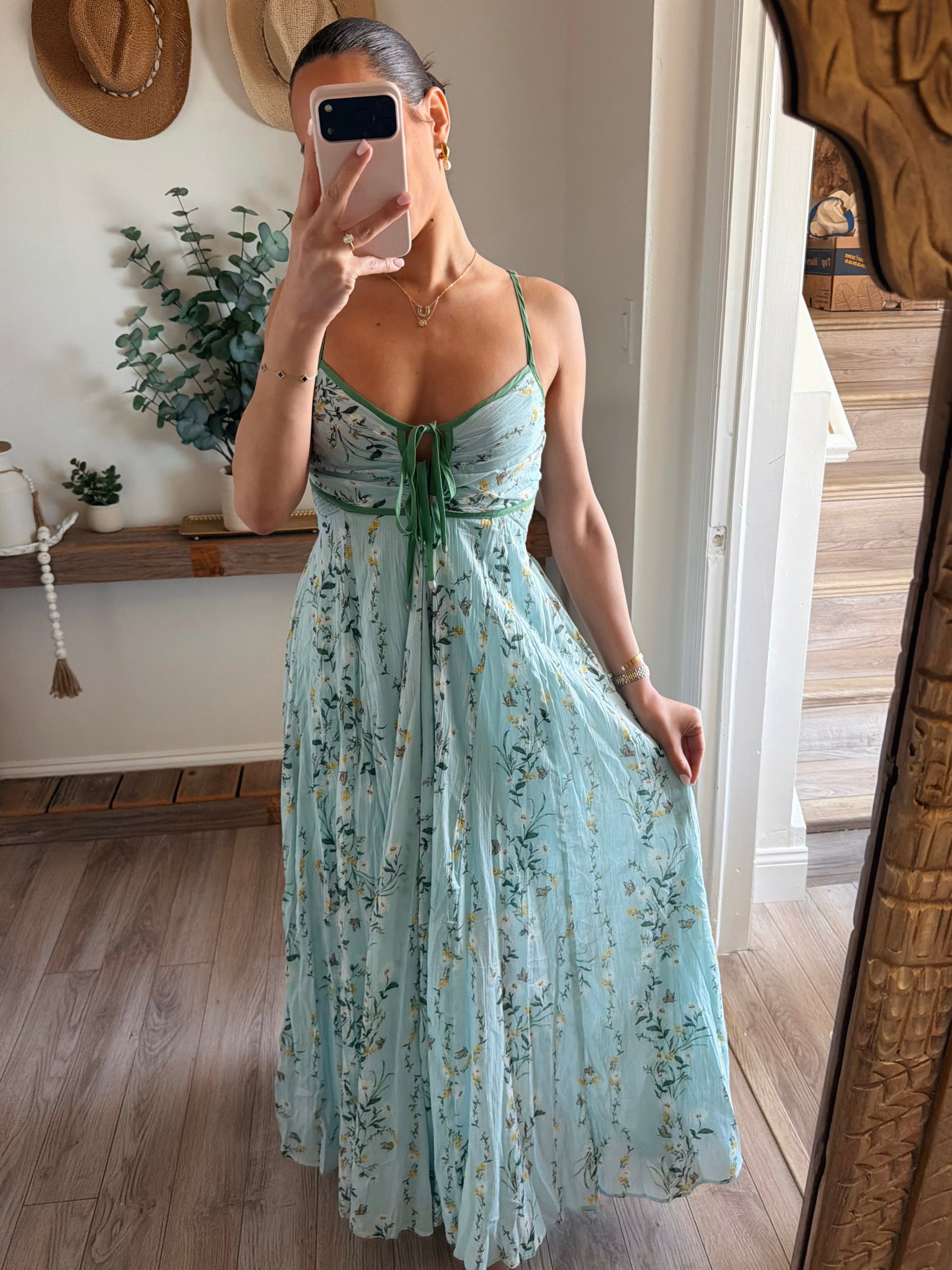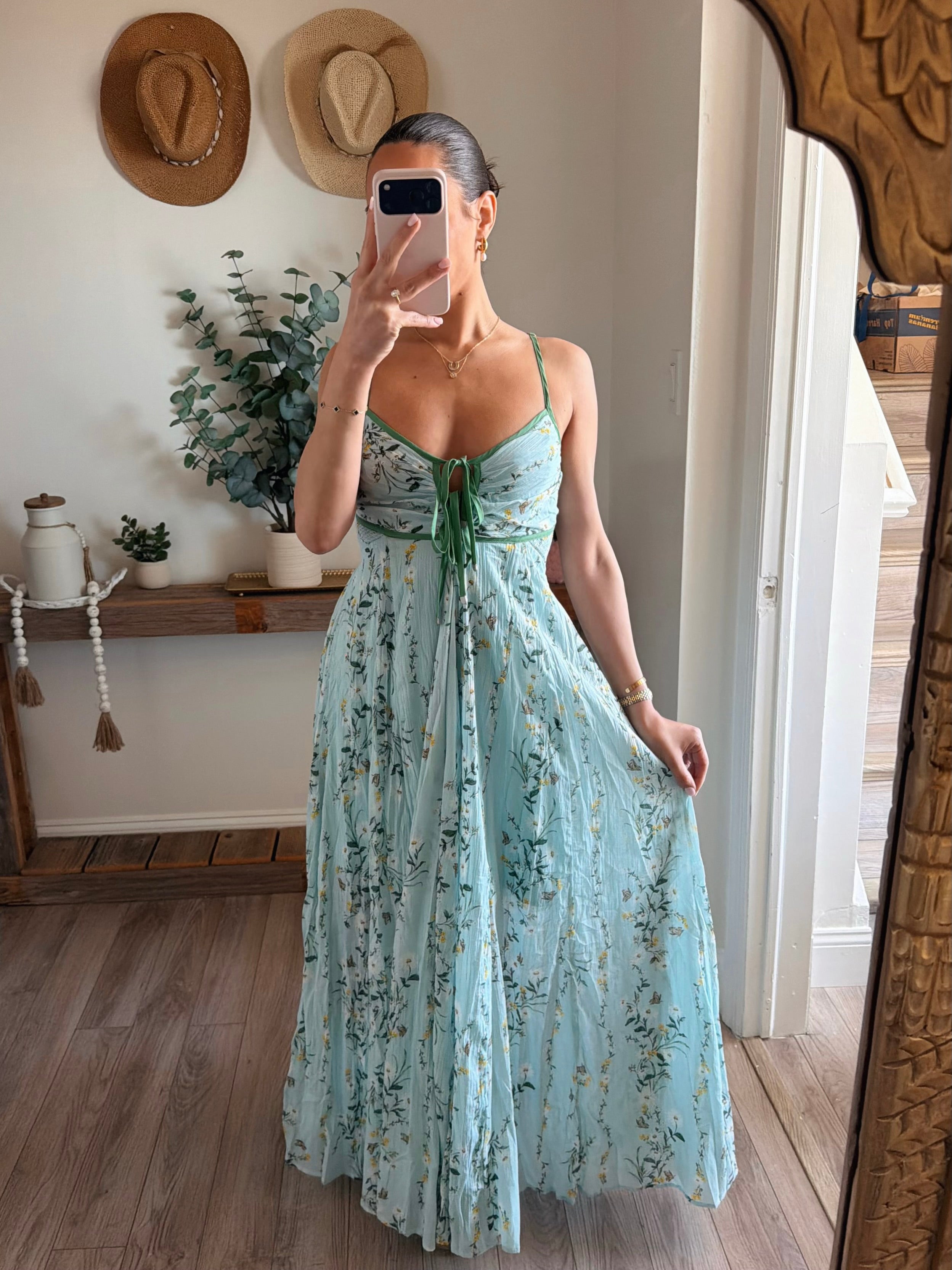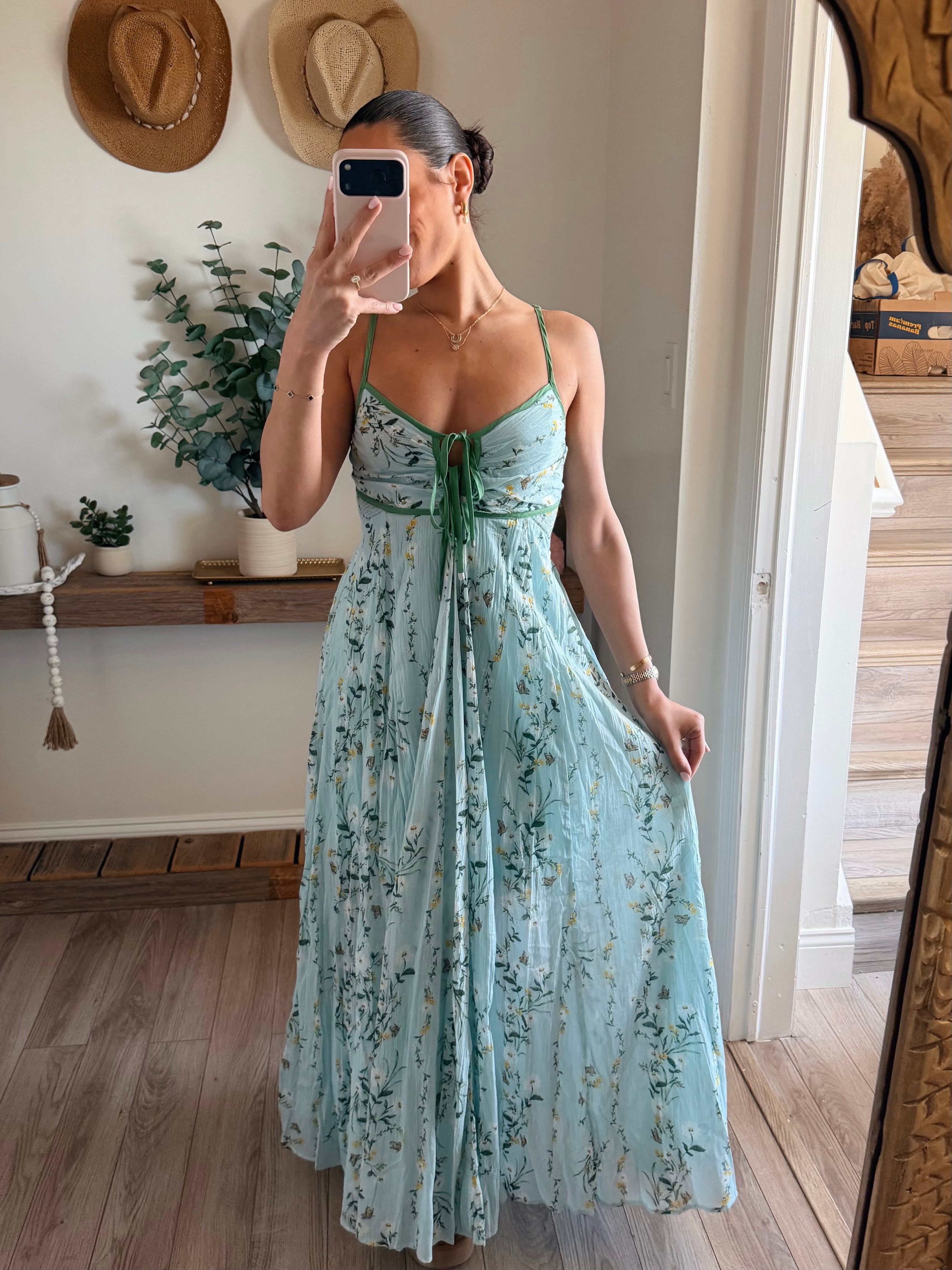 Features: adjustable spaghetti straps with contrasting colored trim and front tie accent. A flowing full length silhouette with a lightweight allover floral fabric offers some breathable, effortless feel.
