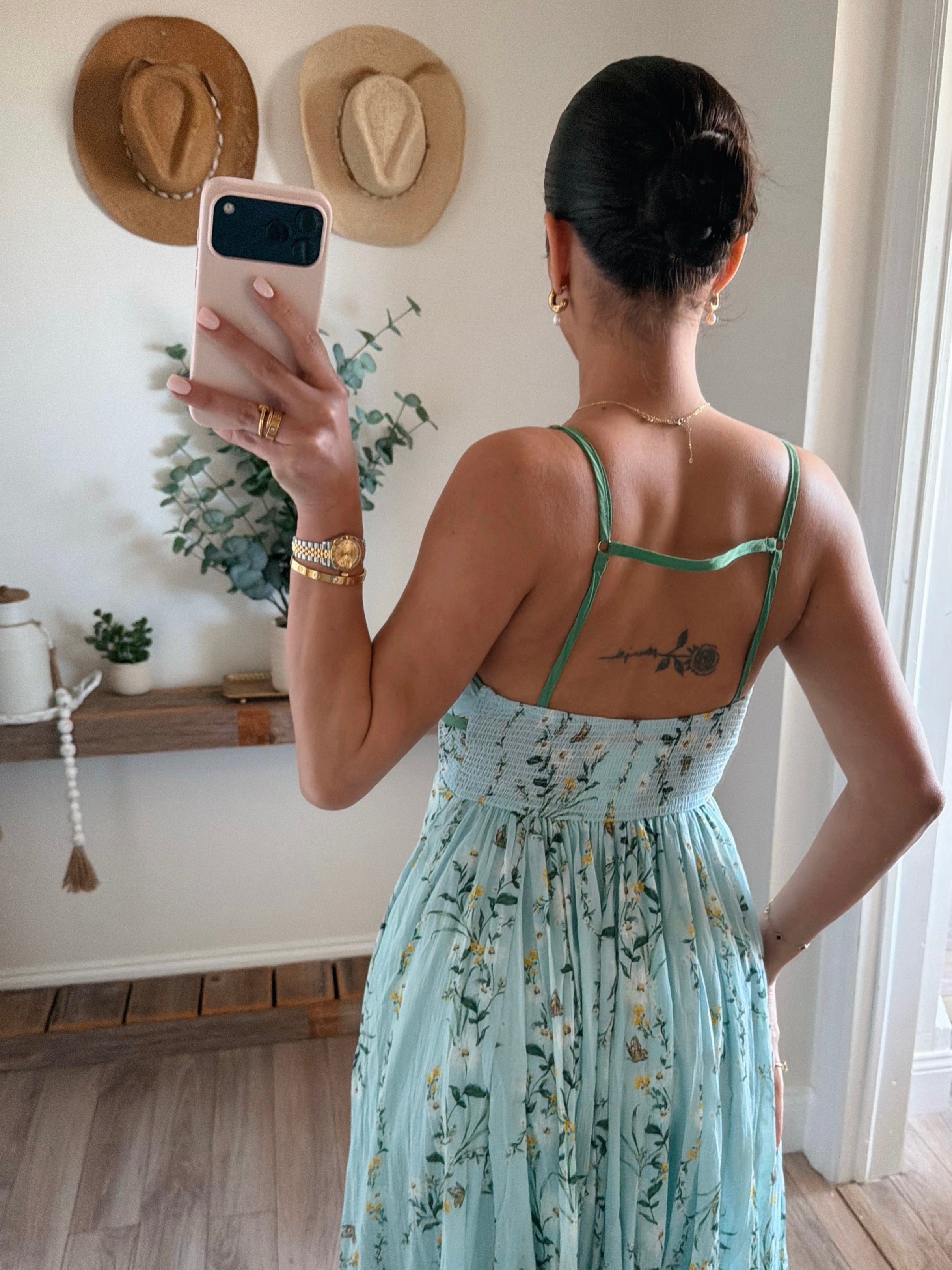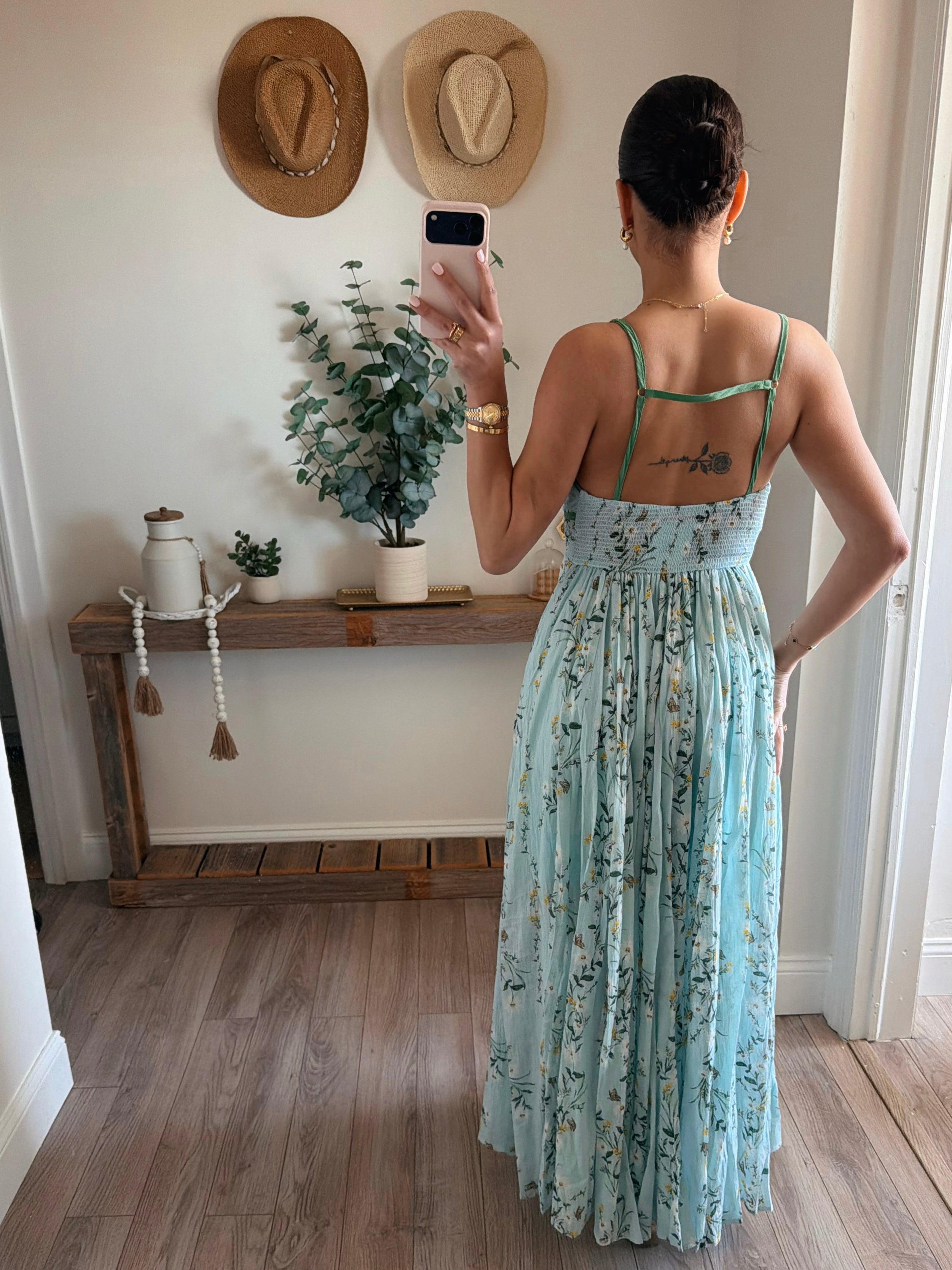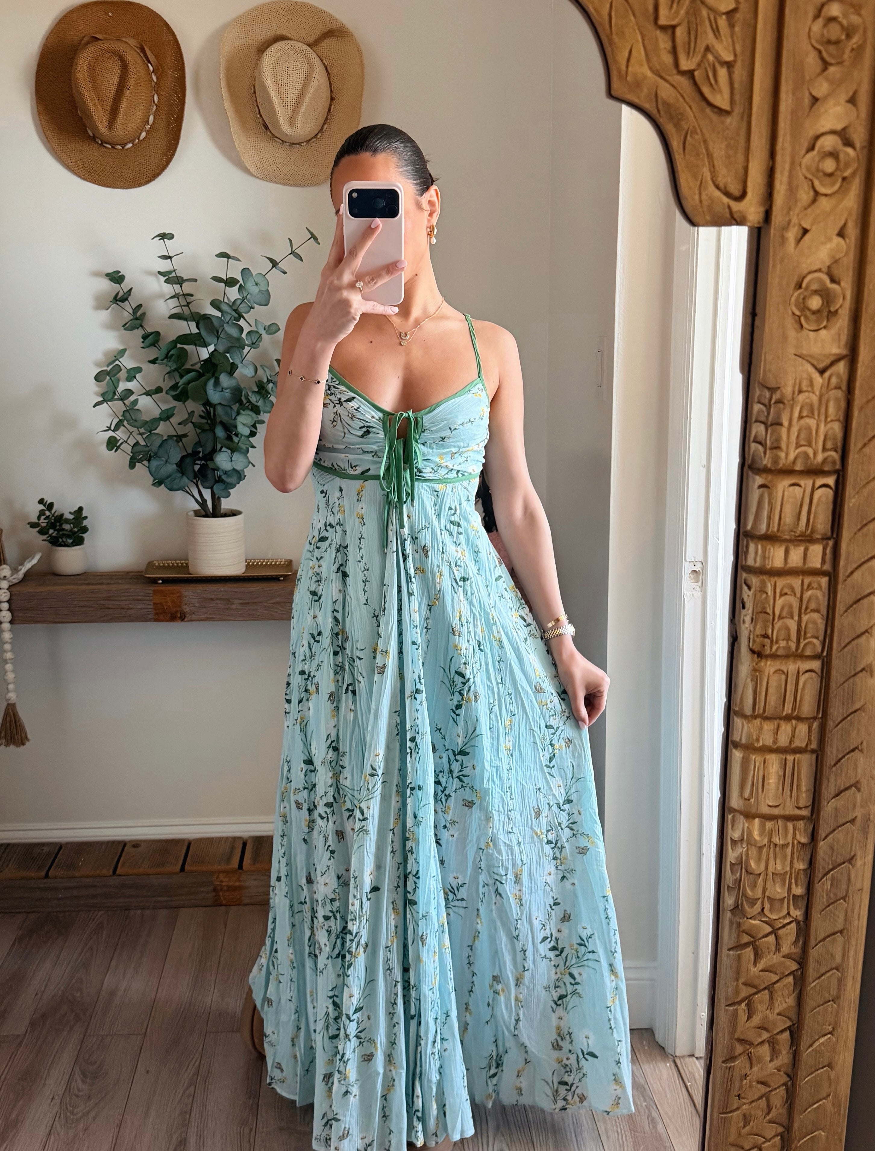 Features: adjustable spaghetti straps with contrasting colored trim and front tie accent. A flowing full length silhouette with a lightweight allover floral fabric offers some breathable, effortless feel.