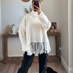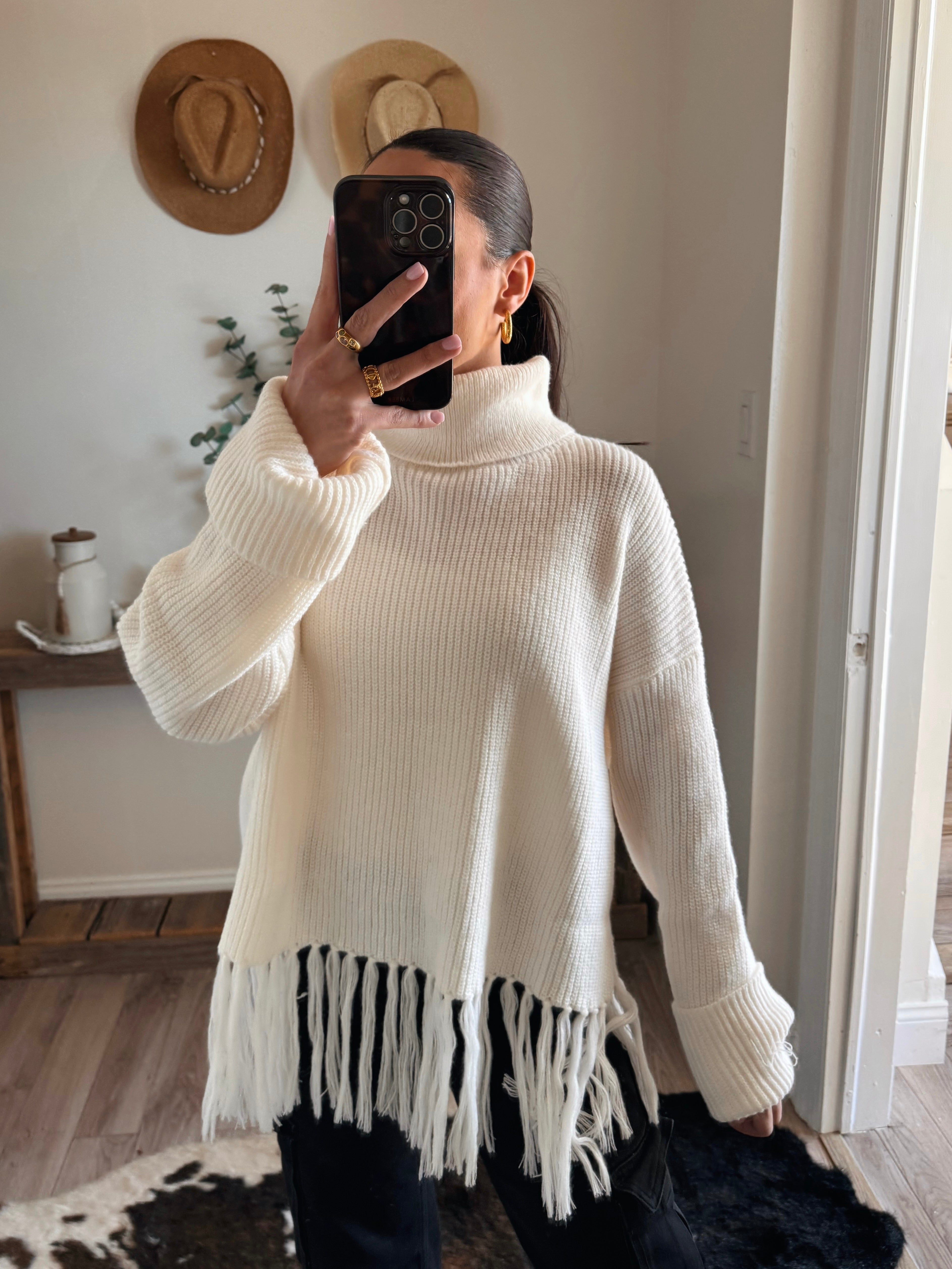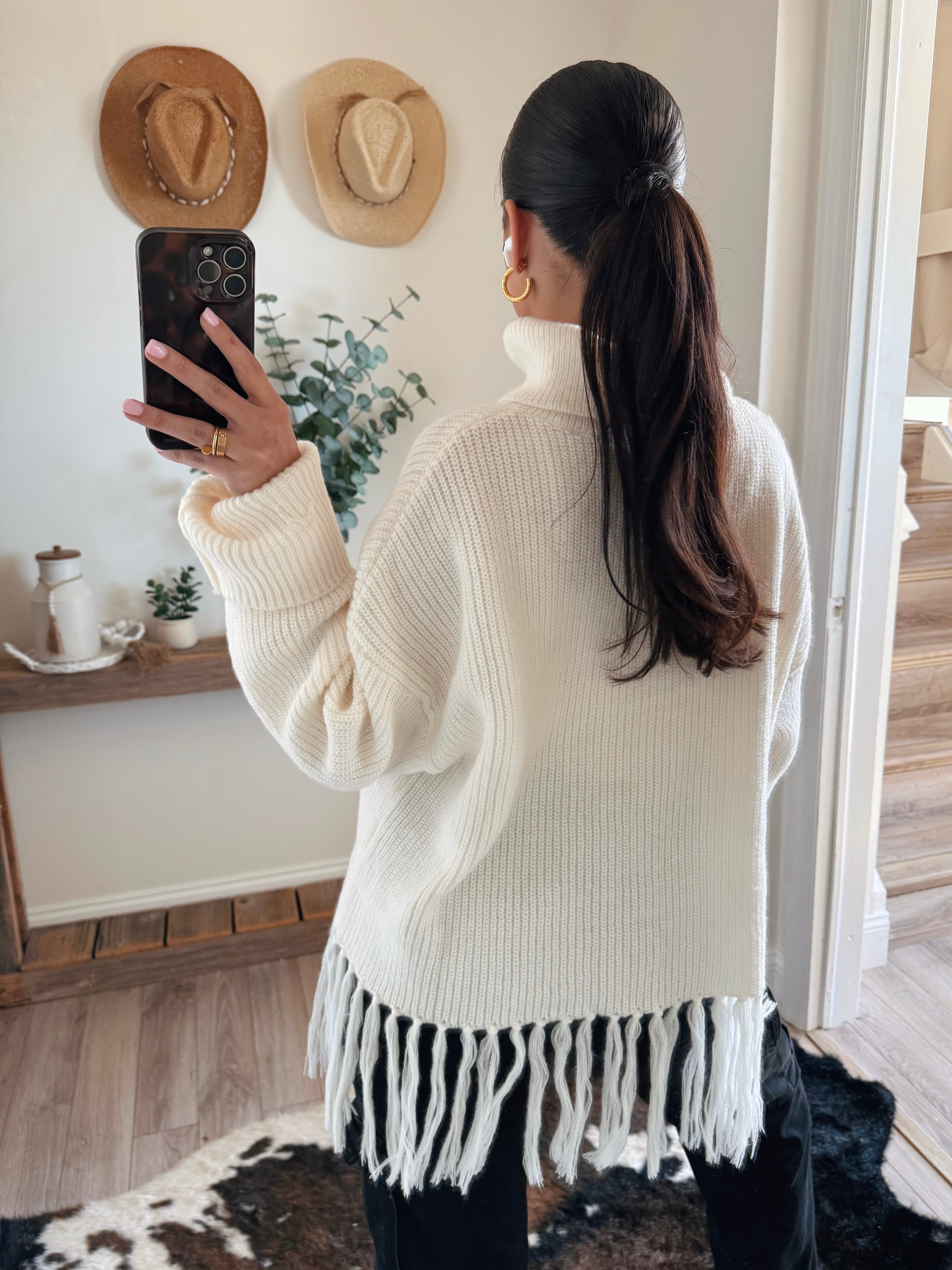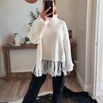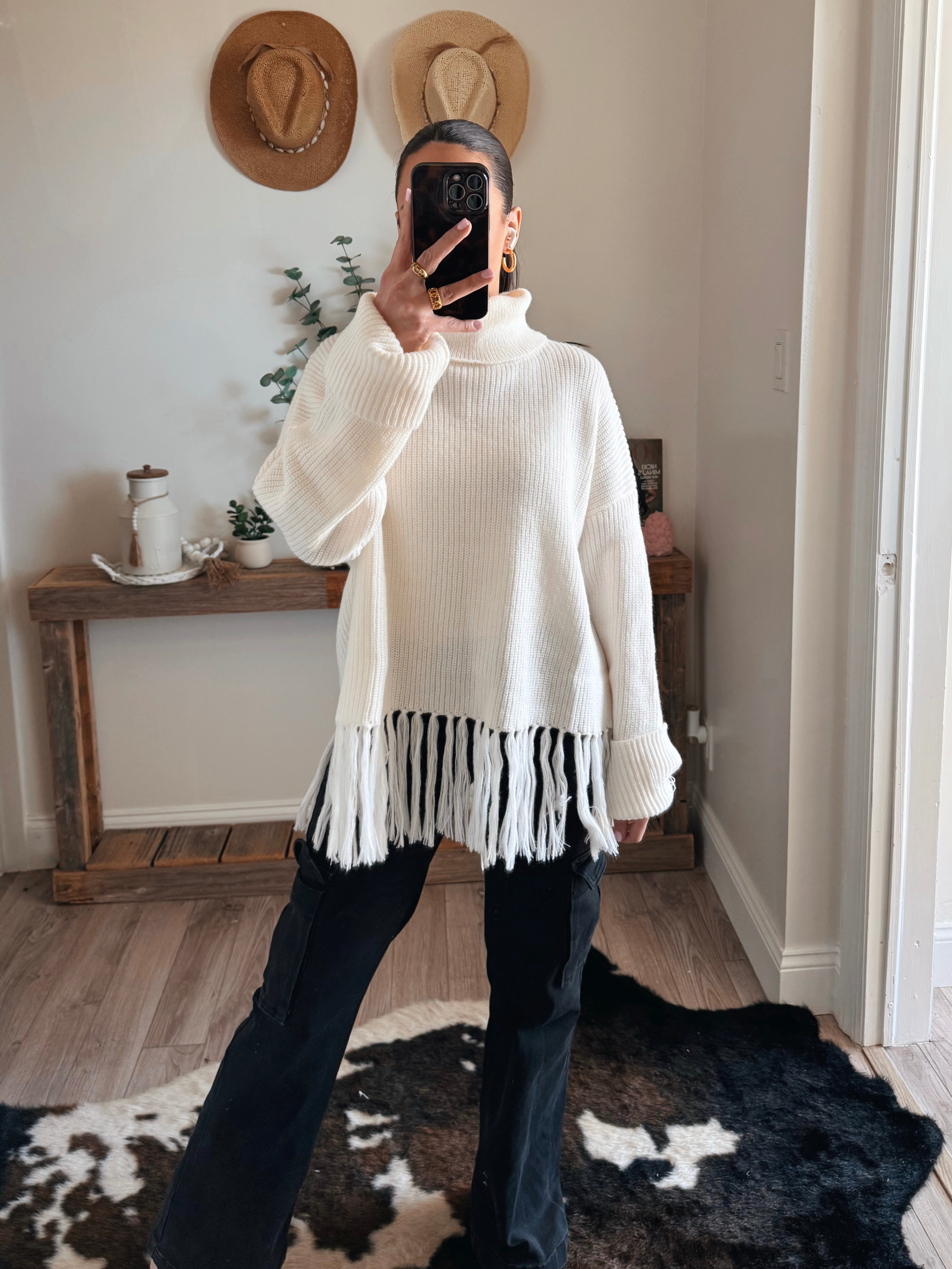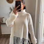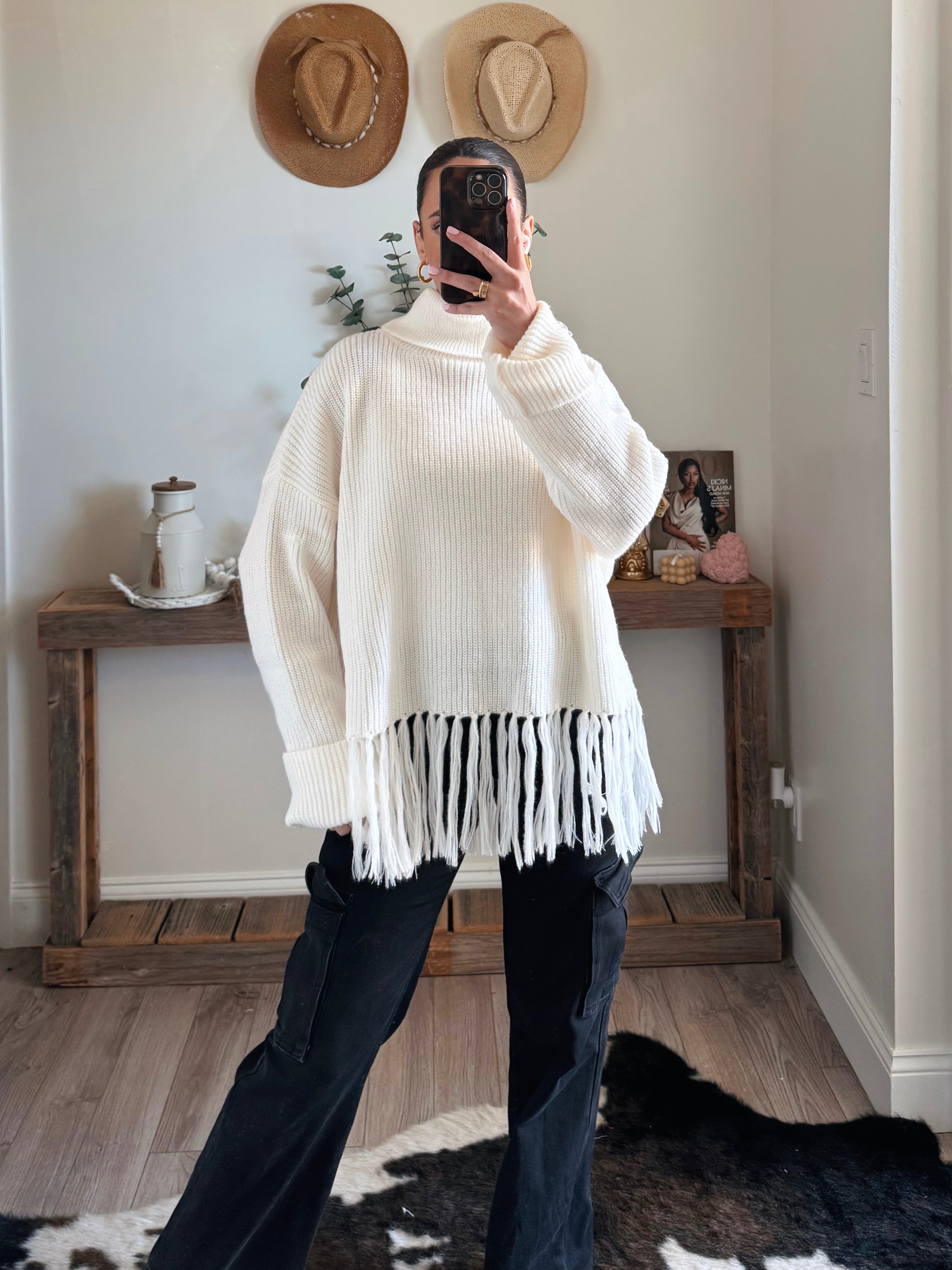 Product Features: This turtleneck sweater is made from a thick ribbed knit, offering a relaxed oversized silhouette with dropped shoulders and extended sleeves. It is distinguished by a striking fringe detail along the hem, lending a bohemian-western flair to its cozy design.
