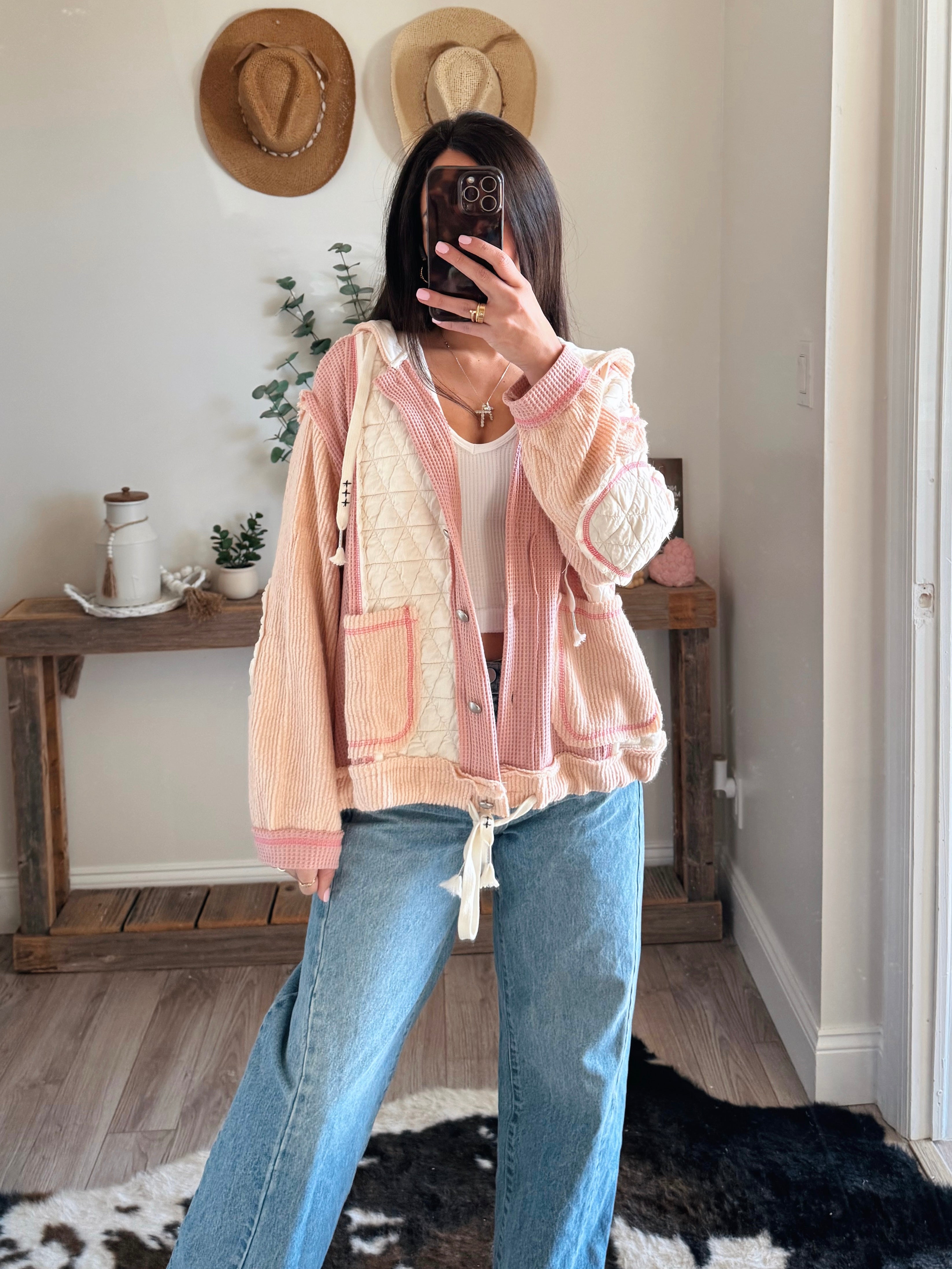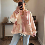 Product Features: This jacket features an oversized button-down design with a hood, combining thermal, quilted knit, and cut-and-sew sweater knit fabrics for a versatile and layered look.