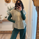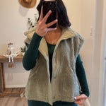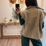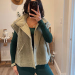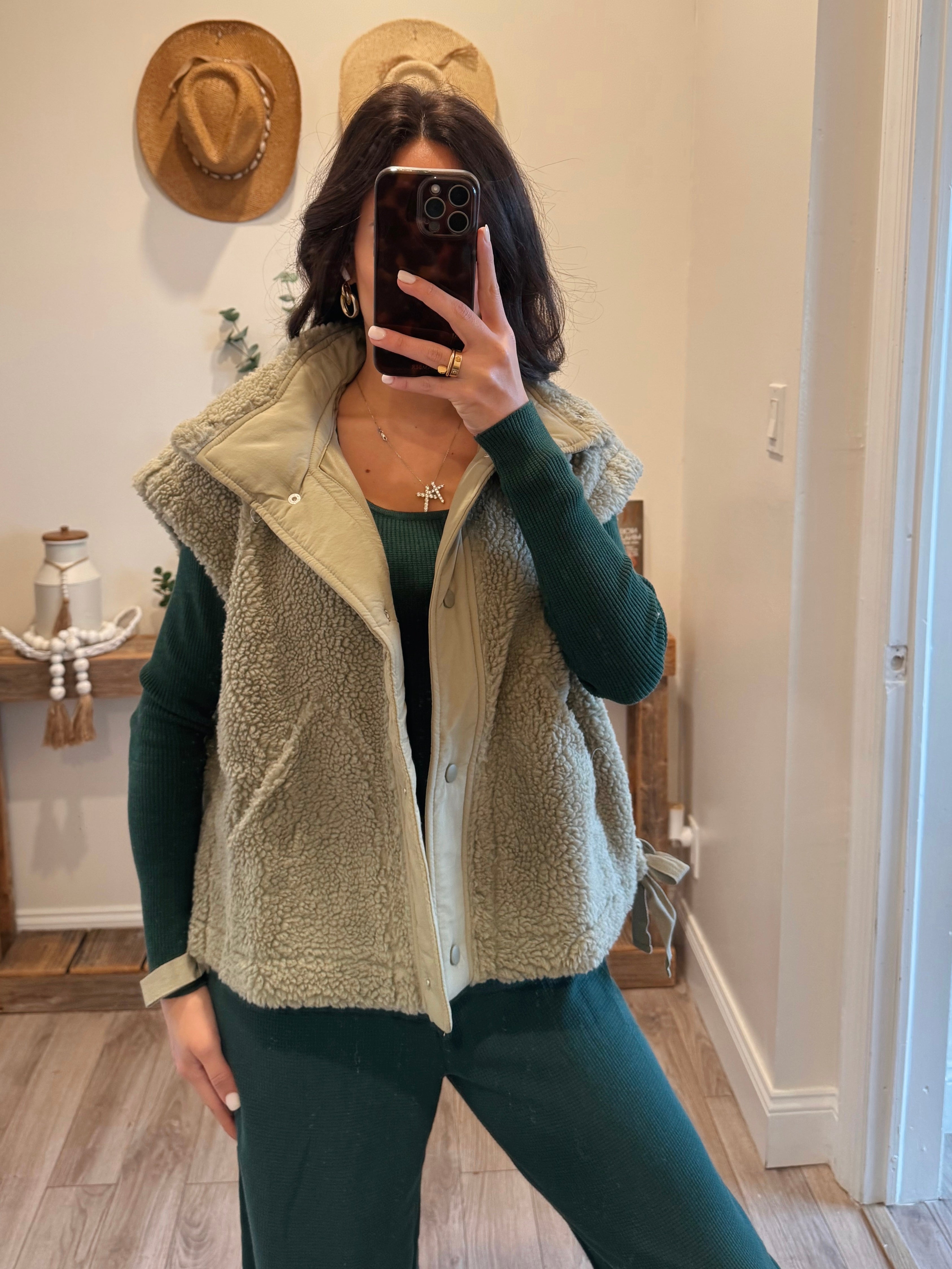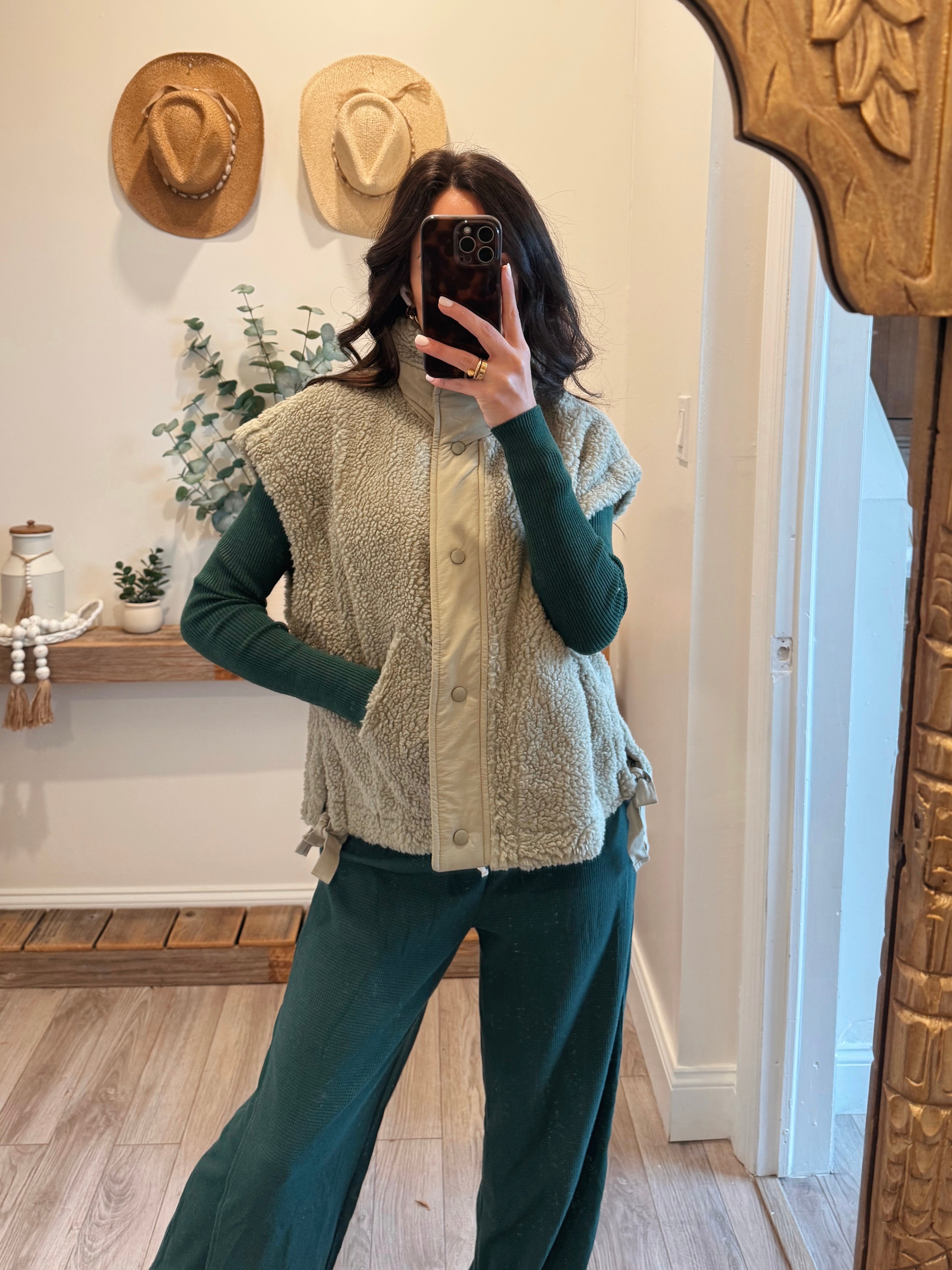 Product Features:Experience warmth and versatility with this sherpa vest, ideal for layering. It includes distinctive side tie-ups for a customizable, secure fit. Designed with a cozy mock neck and button-front closure for effortless wear.