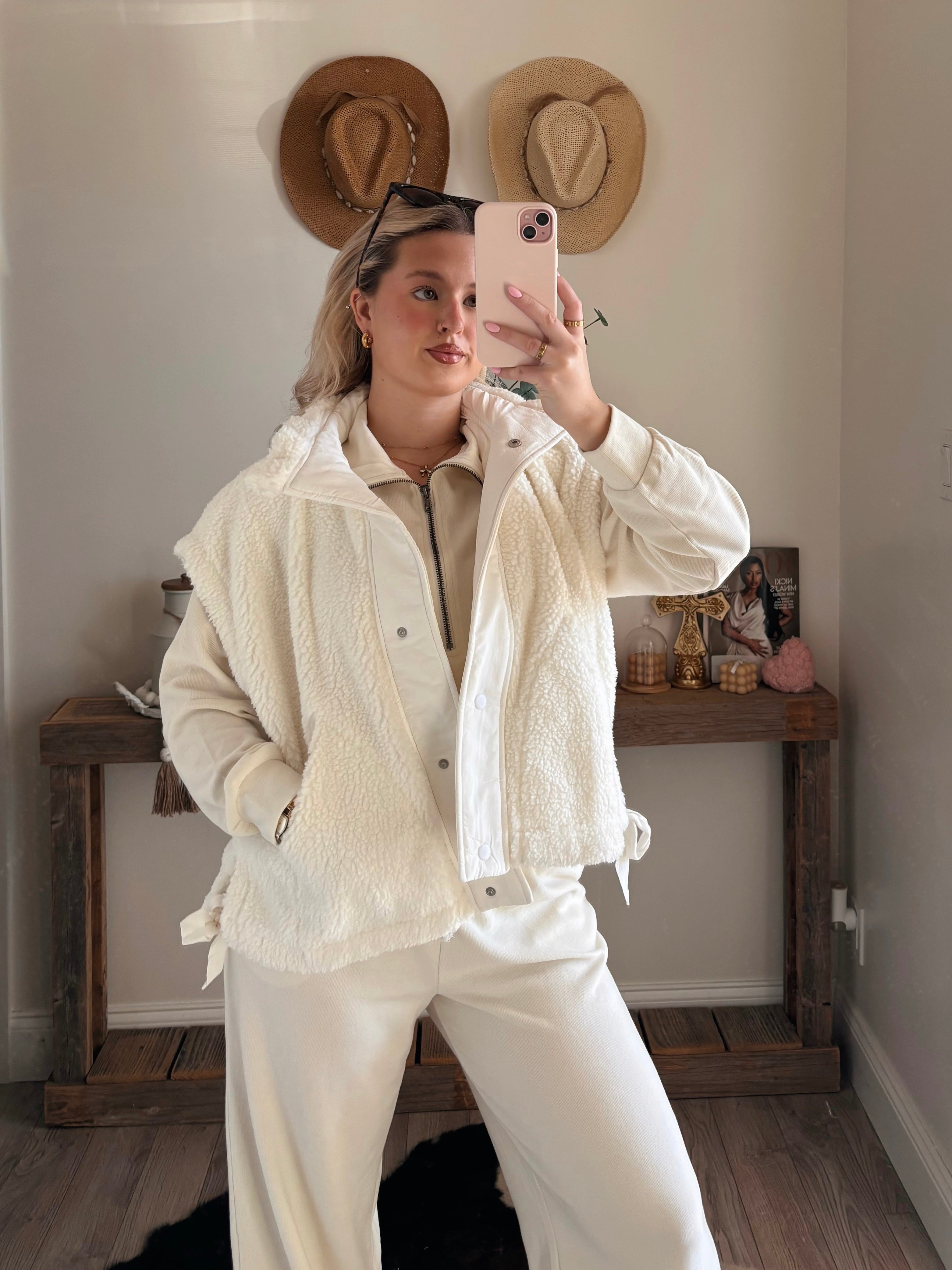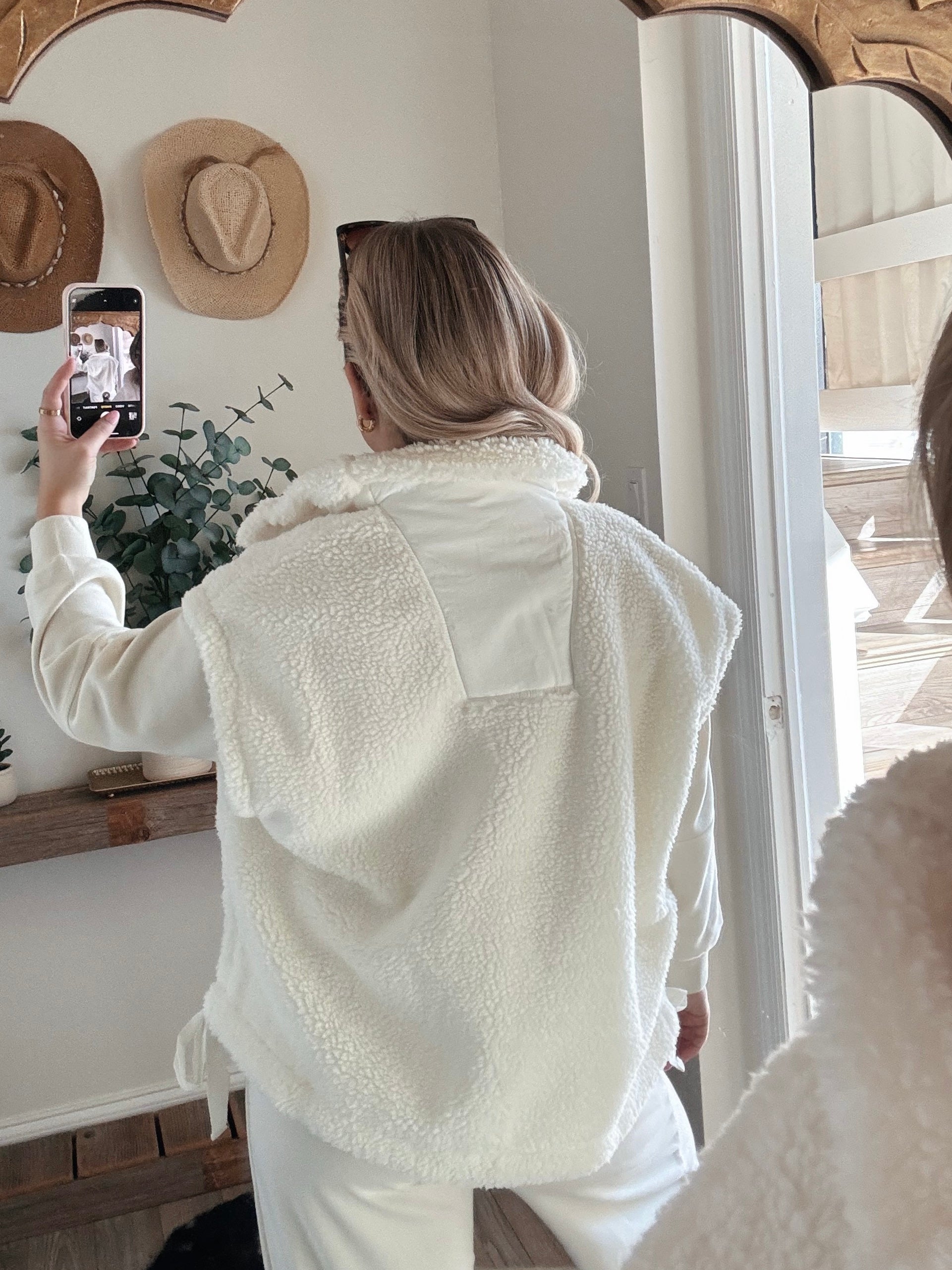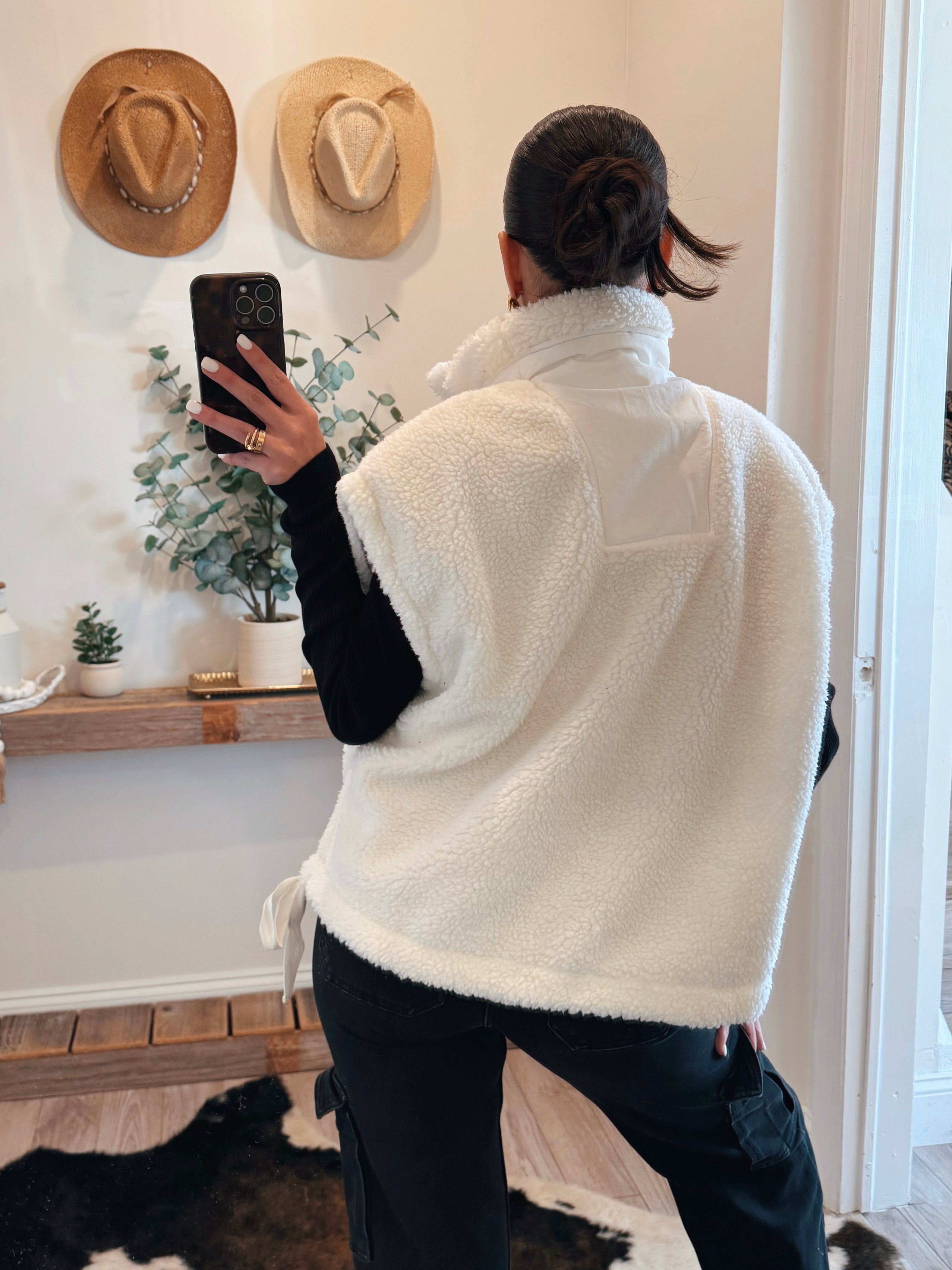 Product Features: Experience warmth and versatility with this sherpa vest, ideal for layering. It includes distinctive side tie-ups for a customizable, secure fit. Designed with a cozy mock neck and button-front closure for effortless wear.